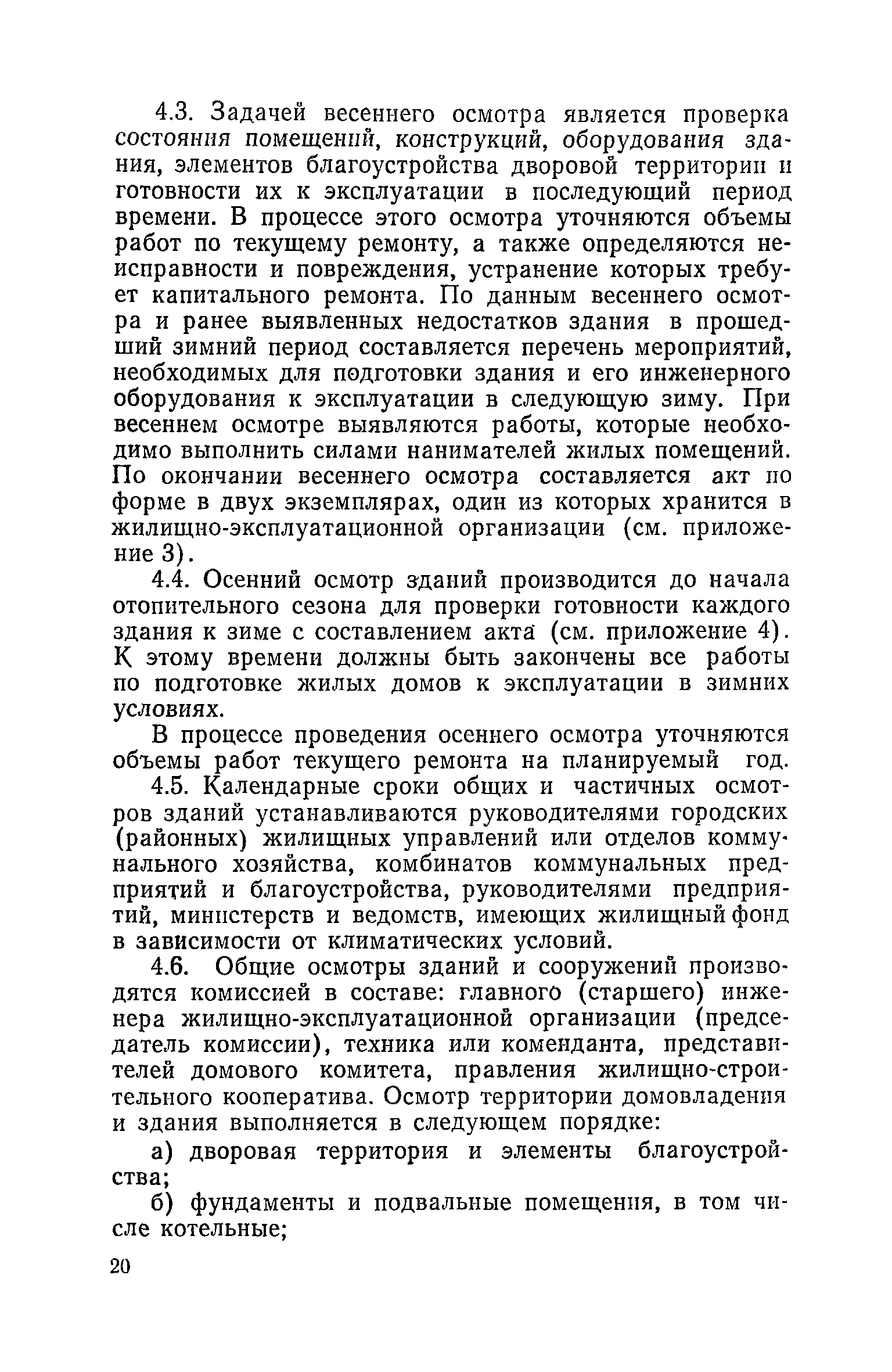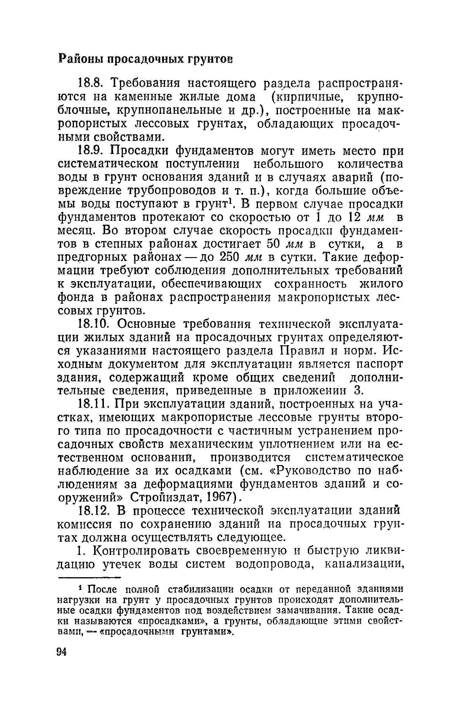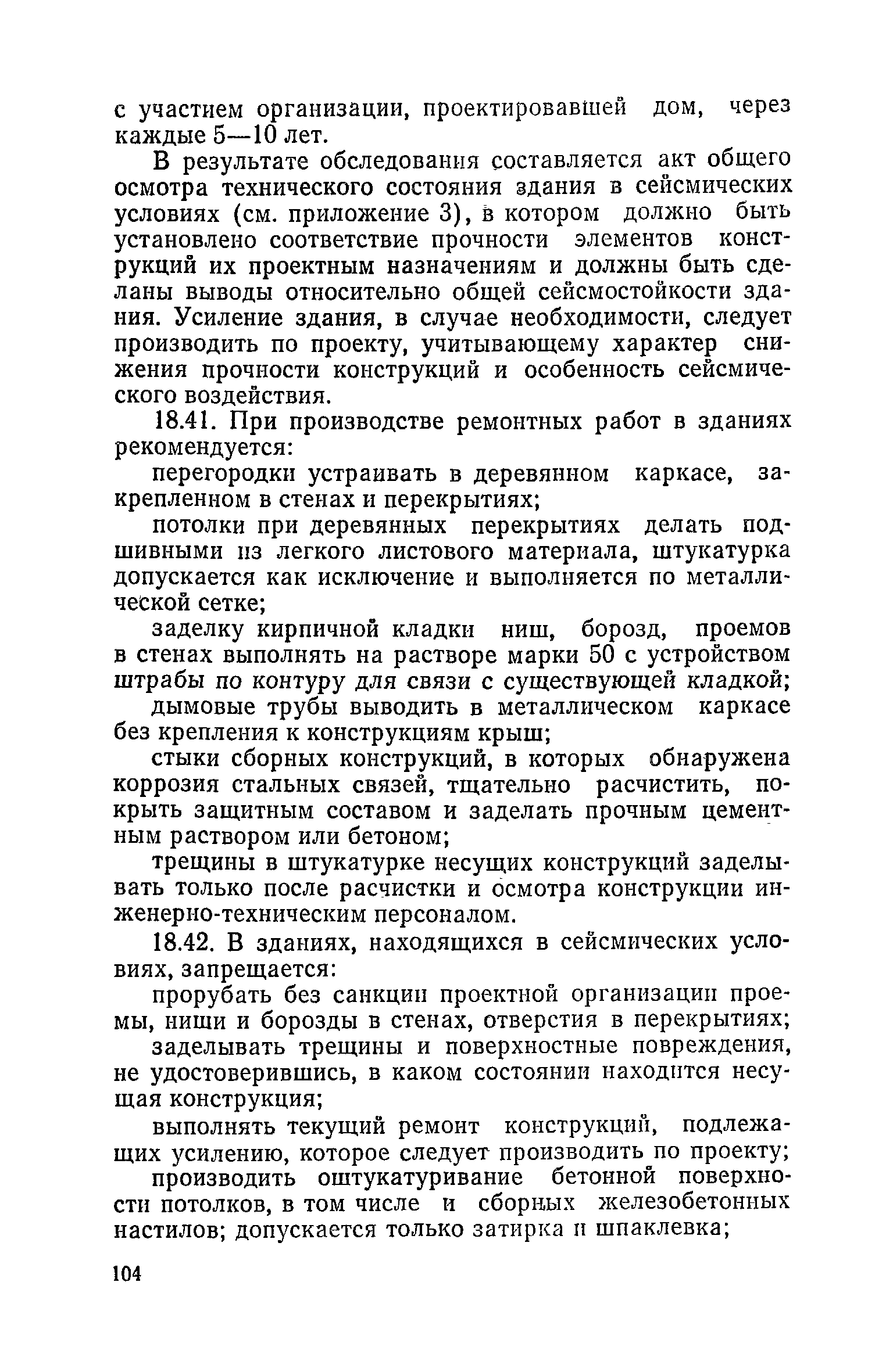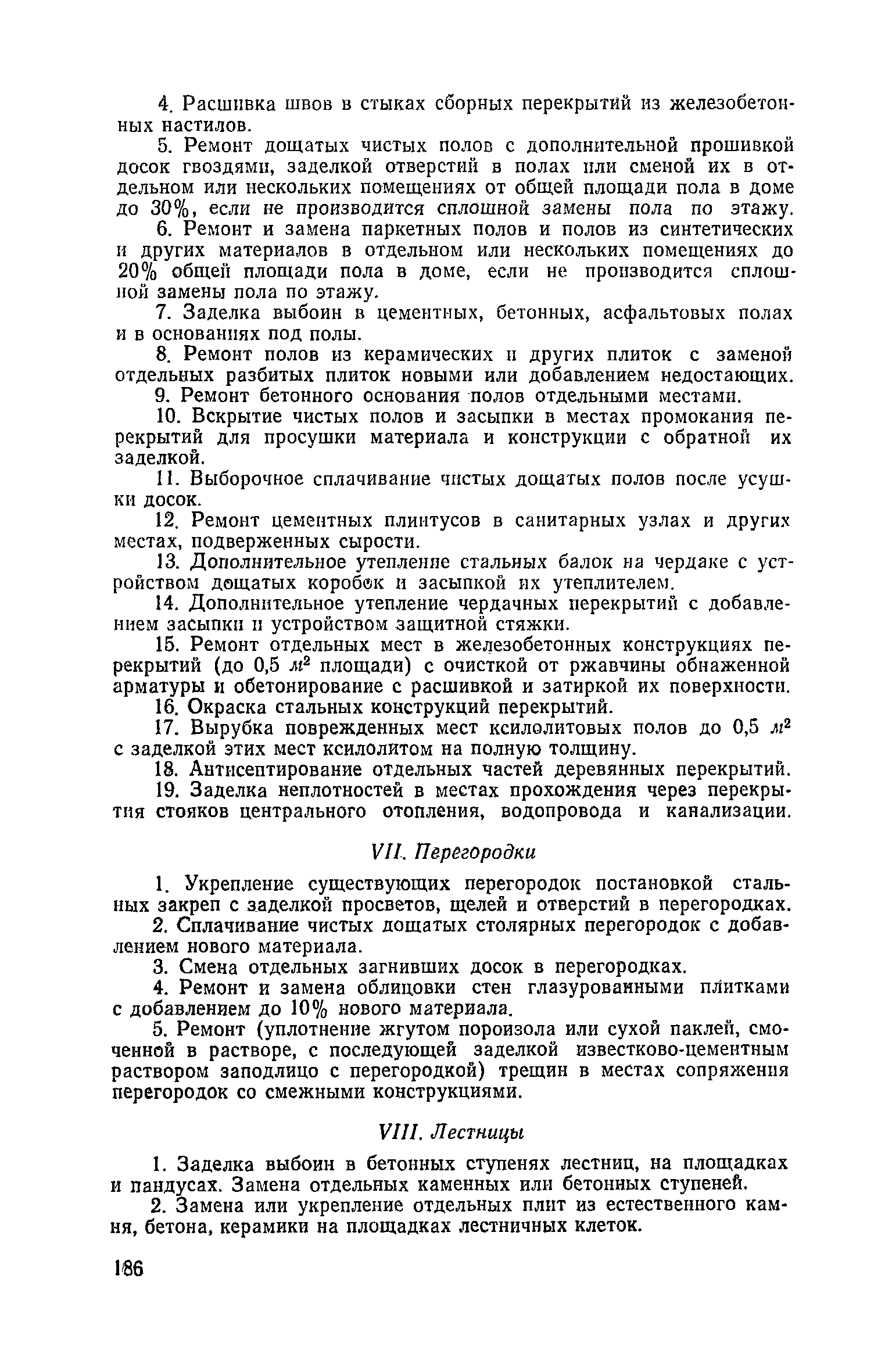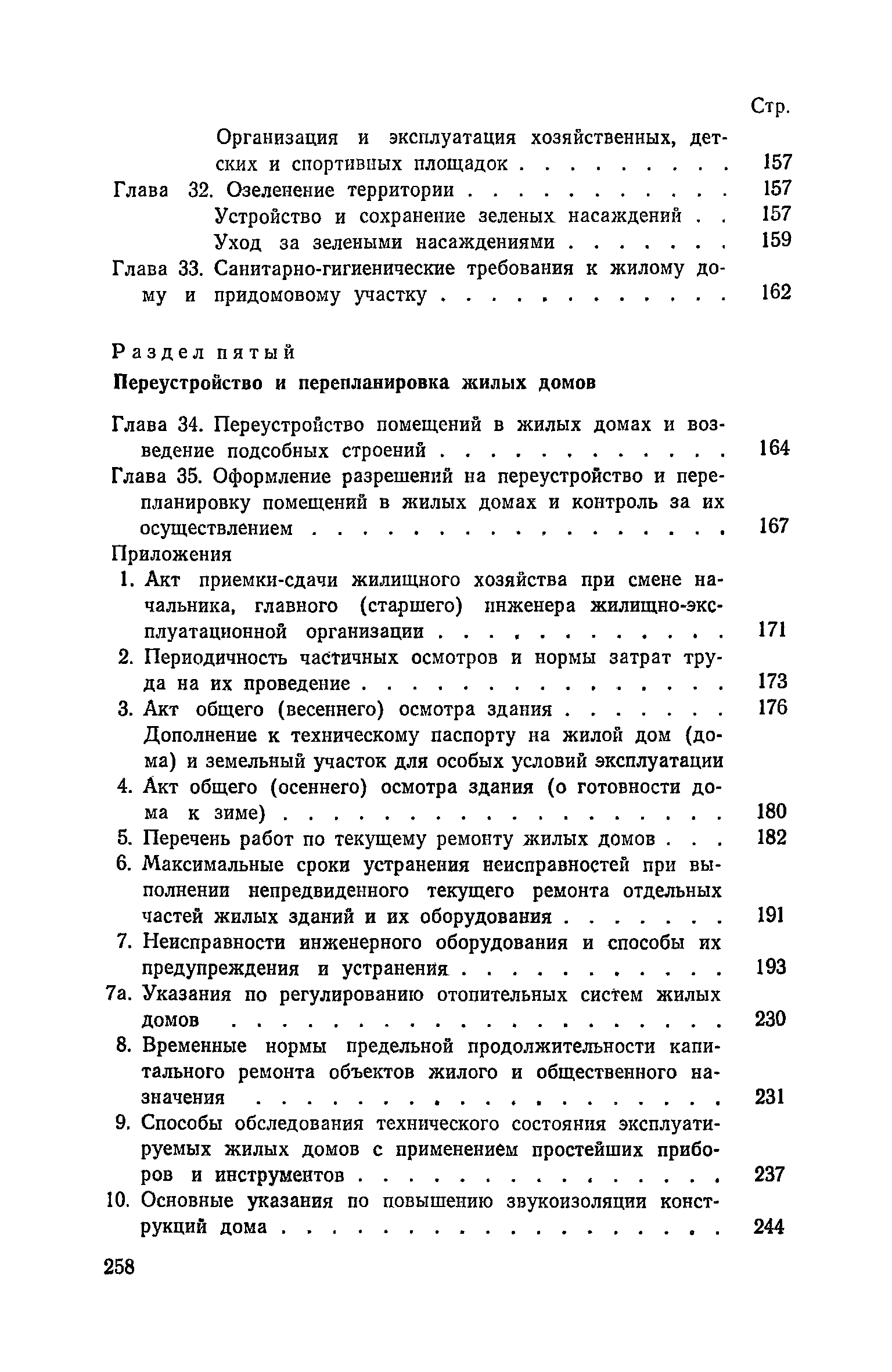Правила и нормы технической эксплуатации жилищного фонда| Статус: | заменен | | Название рус.: | Правила и нормы технической эксплуатации жилищного фонда | | Дата добавления в базу: | 01.09.2013 | | Дата актуализации: | 01.01.2021 | | Область применения: | В документе приведены основные положения по технической эксплуатации жилищного фонда, содержанию помещений, инженерного оборудования, территорий домовладений, а также указания по переустройству и благоустройству домой старой застройки. | | Оглавление: | Введение Раздел первый. Основные положения Глава 1. Общие положения Глава 2. Управление жилищным хозяйством Глава 3. Порядок приемки жилищного хозяйства Приемка в эксплуатацию вновь выстроенных домов Приемка в эксплуатацию капитально отремонтированных жилых домов Приемка жилищного хозяйства при смене руководства Передача ведомственного жилищного фонда исполкомам местных Советов и инженерных сетей коммунальным предприятиям Глава 4. Система осмотра жилых домов Глава 5. Организация ремонта жилищного фонда и работ по его благоустройству Классификация работ по ремонту жилищного фонда Перечень работ по повышению благоустройства жилых домов, которые могут выполняться за счет средств, выделяемых на капитальный ремонт жилищного фонда Планирование и организация текущего ремонта Планирование и организация капитального ремонта и повышение уровня благоустройства жилых домов Раздел второй. Правила эксплуатации строительных конструкций и помещений Глава 6. Придомовая территория, фундаменты и стены подвальных помещений Придомовая территория Фундаменты и стены подвальных помещений Глава 7. Стены Каменные и крупнопанельные стены Деревянные стены Глава 8. Фасады Отделка фасадов Балконы, козырьки, лоджии и эркеры Глава 9. Перекрытия Железобетонные перекрытия (сборные и монолитные) Деревянные перекрытия (по деревянным и металлическим балкам) Сводчатые перекрытия Глава 10. Полы Деревянные полы Полы из линолеумов и синтетических материалов Ксилолитовые полы Полы керамические, мозаичные и цементные Глава 11. Перегородки Перегородки из неорганических материалов Деревянные перегородки Глава 12. Крыши Чердачные крыши Бесчердачные (совмещенные) крыши Водоотводящие устройства Очистка кровель от снега Глава 13. Окна, двери и световые фонари Окна и двери Световые фонари Глава 14. Лестницы Каменные и железобетонные лестницы Деревянные лестницы Глава 15. Печи Комнатные печи и кухонные очаги на твердом топливе Комнатные печи и кухонные очаги на газовом топливе Глава 16. Специальные мероприятия по технической эксплуатации жилого дома Защита деревянных конструкций от разрушений домовыми грибками и дереворазрушающими насекомыми Устранение сырости в эксплуатируемых зданиях Устранение шумов в жилых домах Противопожарная профилактика Подготовка жилых домов к зиме Глава 17. Эксплуатация жилых и вспомогательных помещений жилого дома Квартиры Лестничные клетки Чердачные помещения Подвалы и технические подполья Глава 18. Техническая эксплуатация жилых зданий в особых условиях Общие положения Районы просадочных грунтов Районы подрабатываемых территорий Сейсмические районы (сейсмичность более 6 баллов) Районы вечной мерзлоты Раздел третий. Правила эксплуатации инженерного оборудования в жилом доме Глава 19. Центральное отопление Глава 20. Горячее водосн