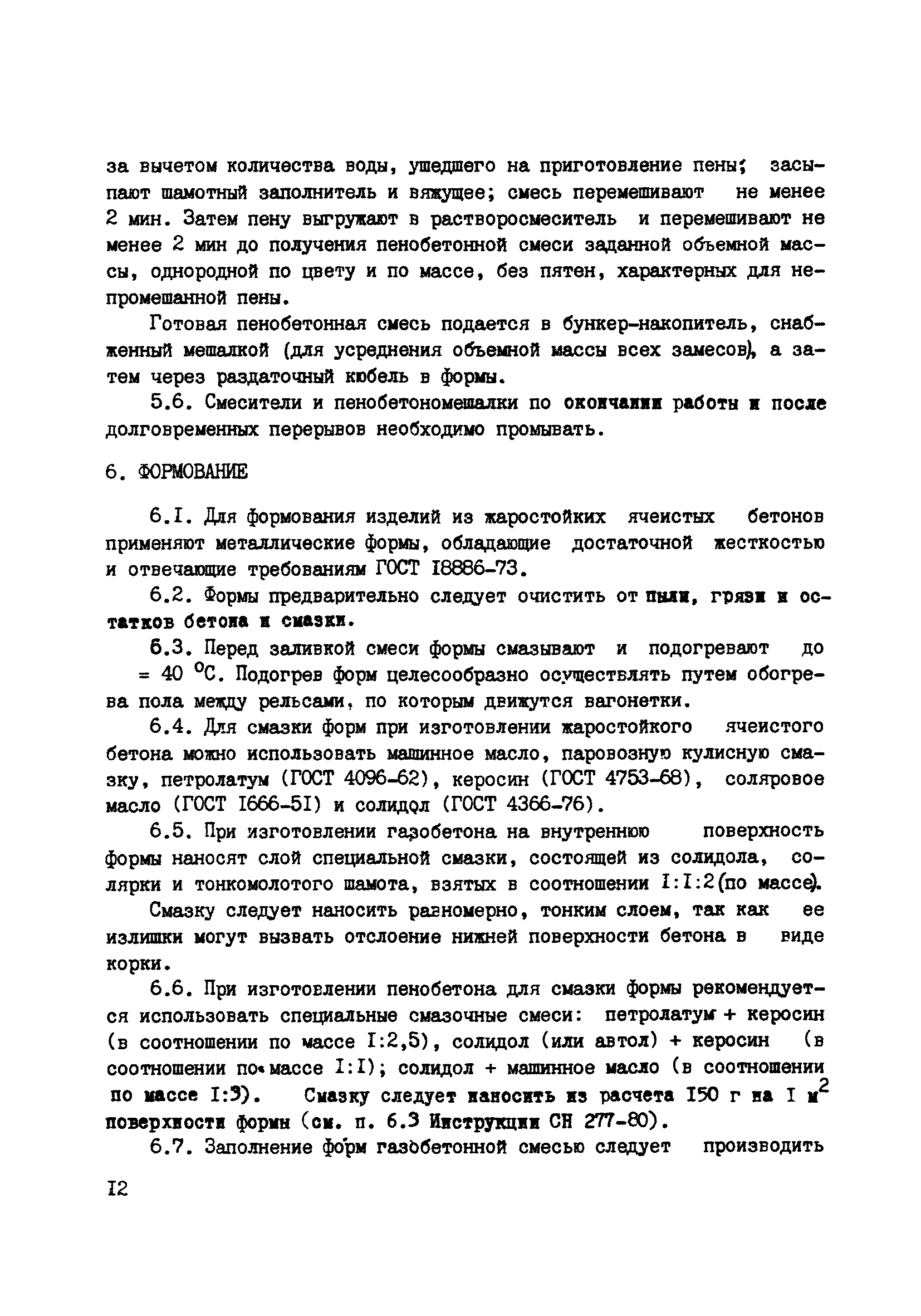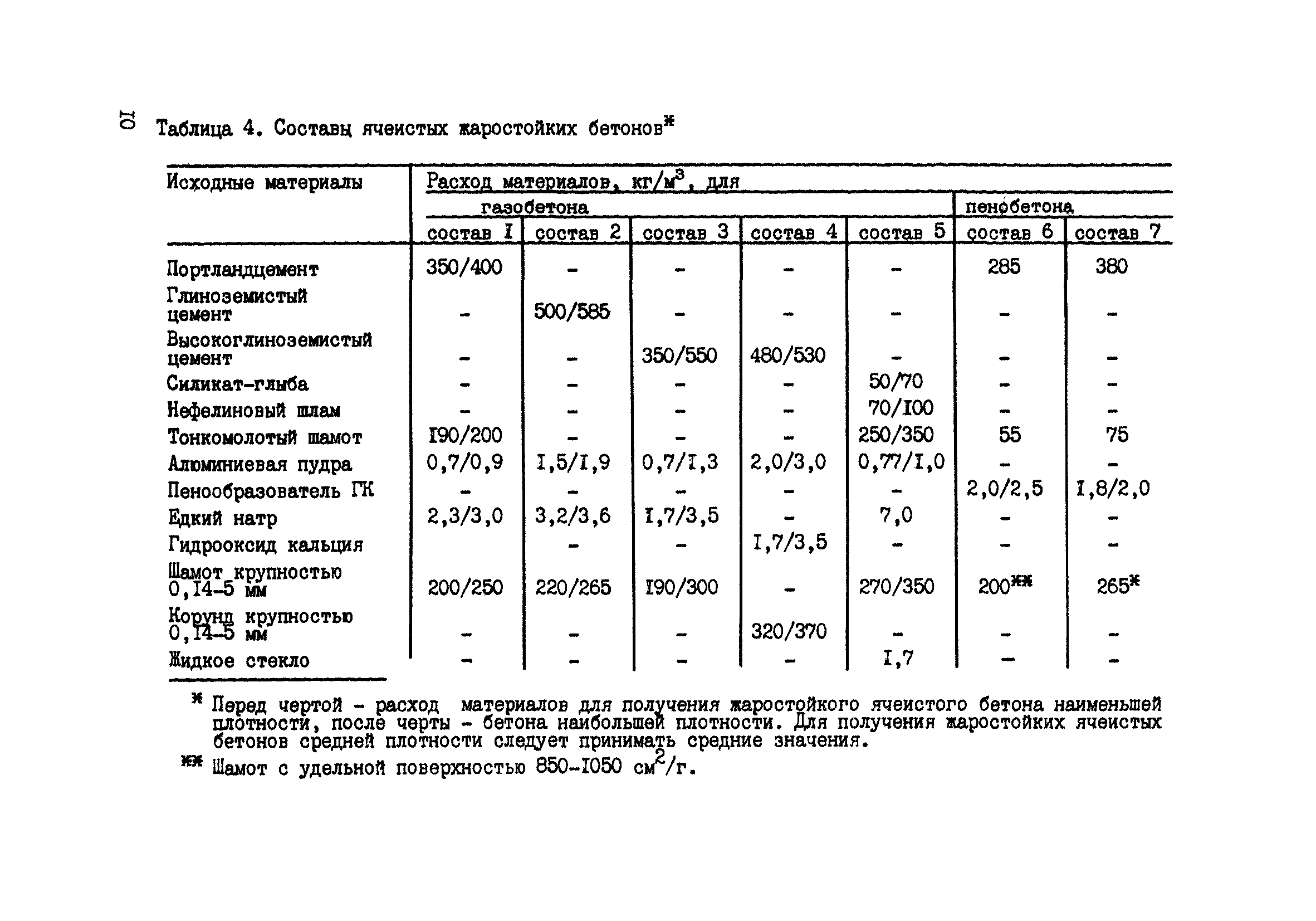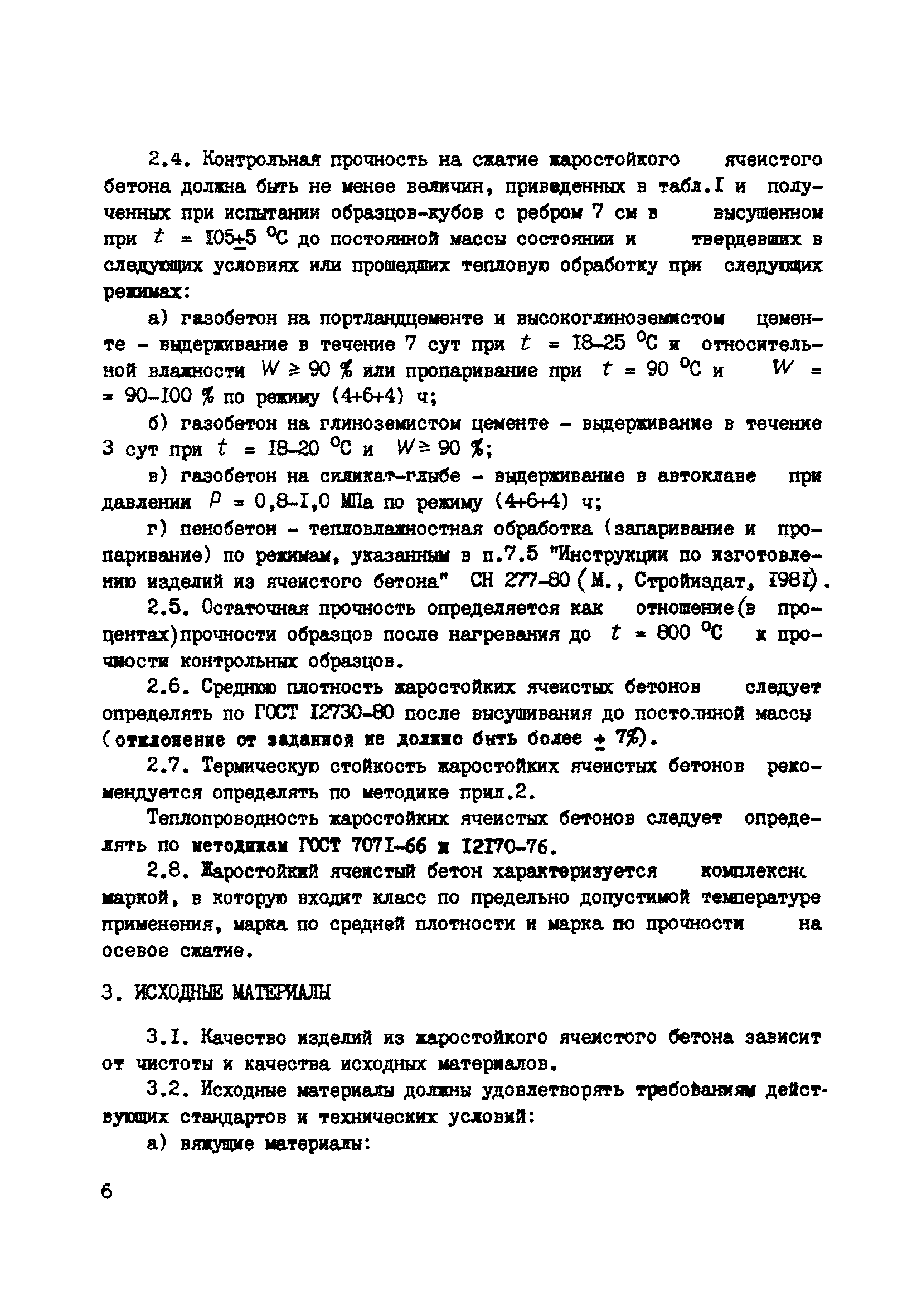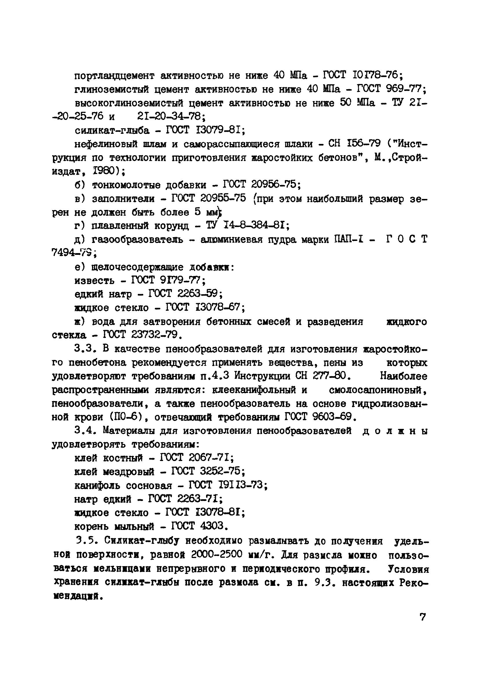 | | Нормативные ссылки: |   СН 277-80 «Инструкция по изготовлению изделий из ячеистого бетона»  ГОСТ 969-91 «Цементы глиноземистые и высокоглиноземистые. Технические условия»  ГОСТ 9179-77 «Известь строительная. Технические условия»  ГОСТ 10180-90 «Бетоны. Методы определения прочности по контрольным образцам»  ГОСТ 12730.1-78 «Бетоны. Методы определения плотности»  ГОСТ 20910-90 «Бетоны жаростойкие. Технические условия»  ГОСТ 23732-79 «Вода для бетонов и растворов. Технические условия»  ГОСТ 13078-81 «Стекло натриевое жидкое. Технические условия»  ГОСТ 2642.3-97 «Огнеупоры и огнеупорное сырье. Методы определения оксида кремния (IV)»  ГОСТ 2642.1-86 «Огнеупоры и огнеупорное сырье. Метод определения гигроскопической влаги»  ГОСТ 2642.2-86 «Огнеупоры и огнеупорное сырье. Методы определения изменения массы при прокаливании»  ГОСТ 2263-79 «Натр едкий технический. Технические условия» ГОСТ 13079-81 «Силикат натрия растворимый. Технические условия» ГОСТ 19113-84 «Канифоль сосновая. Технические условия» ГОСТ 2067-93 «Клей костный. Технические условия» ГОСТ 3252-80 «Клей мездровый. Технические условия»  ГОСТ 4366-76 «Смазка солидол синтетический. Технические условия» ГОСТ 10178-76 «Портландцемент и шлакопортландцемент. Технические условия» ГОСТ 18886-73 «Формы стальные для изготовления железобетонных и бетонных изделий. Общие технические требования» СН 156-79 «Инструкция по технологии приготовления жаростойких бетонов» ГОСТ 4753-49 «Керосин осветительный. Технические условия» СНиП II-2-80 «Противопожарные нормы проектирования зданий и сооружений» ГОСТ 12170-66 «Изделия огнеупорные. Метод определения коэффициента теплопроводности» ГОСТ 2642.1-71 «Материалы и изделия огнеупорные. Методы химического анализа огнеупорных глин, каолинов, шамотных, графитошамотных и полукислых изделий, кварцитов и динасовых изделий» ГОСТ 2642.2-71 «Материалы и изделия огнеупорные. Методы химического анализа корундовых, высокоглиноземистых огнеупорных материалов и изделий из них» ГОСТ 2642.3-71 «Материалы и изделия огнеупорные. Методы химического анализа доломитов, магнезитов и изделий из них, талько-магнезитов, дунитов, форстеритовых огнеупоров»  ГОСТ 13076-86 «Масло синтетическое ВНИИ НП 50-1-4ф. Технические условия» ГОСТ 7494-87 «Угли Сахалина для бытовых нужд населения. Технические условия»  ПБ 11-555-03 «Правила безопасности при производстве порошков и пудр из алюминия, магния и сплавов на их основе»
