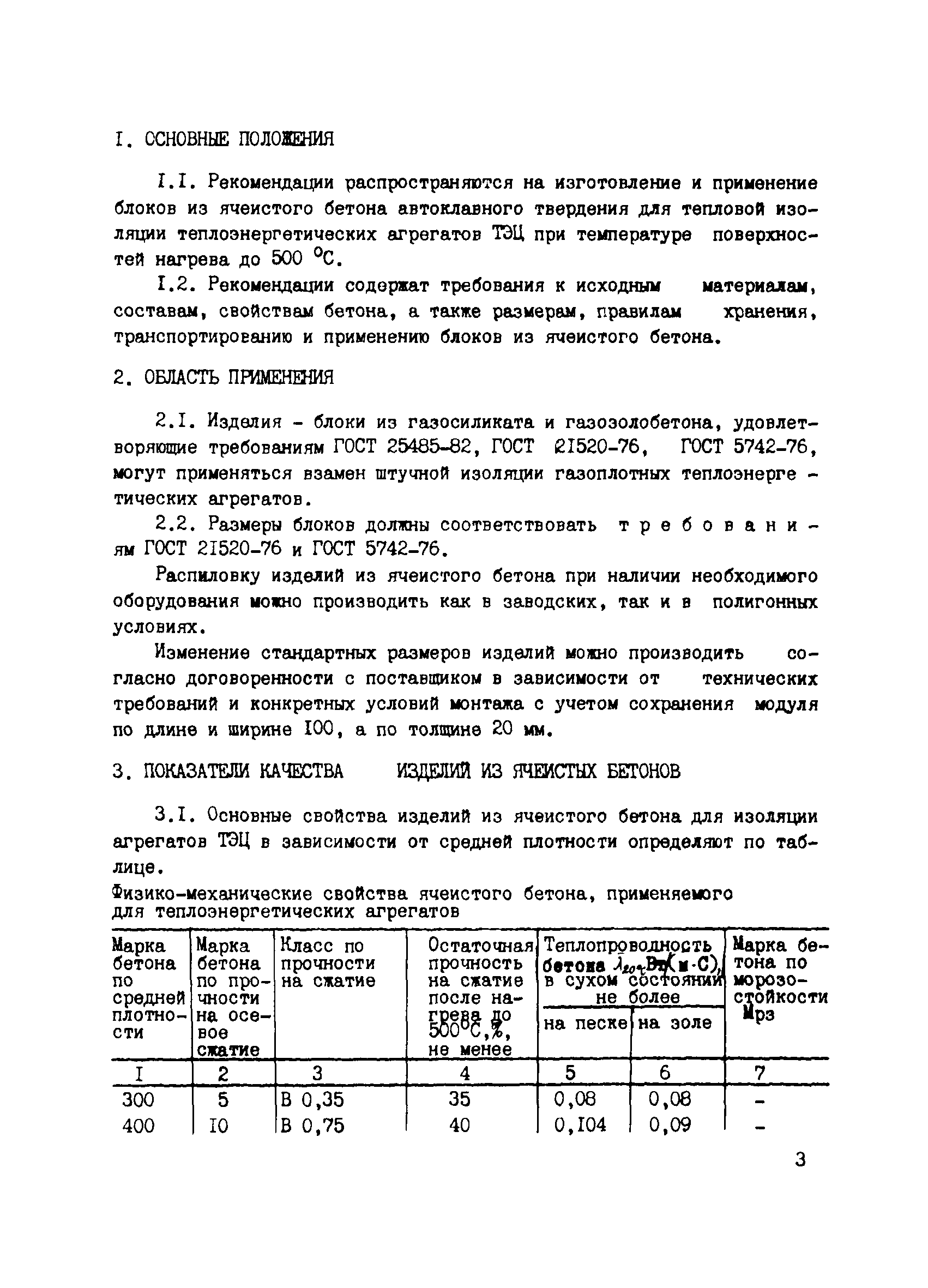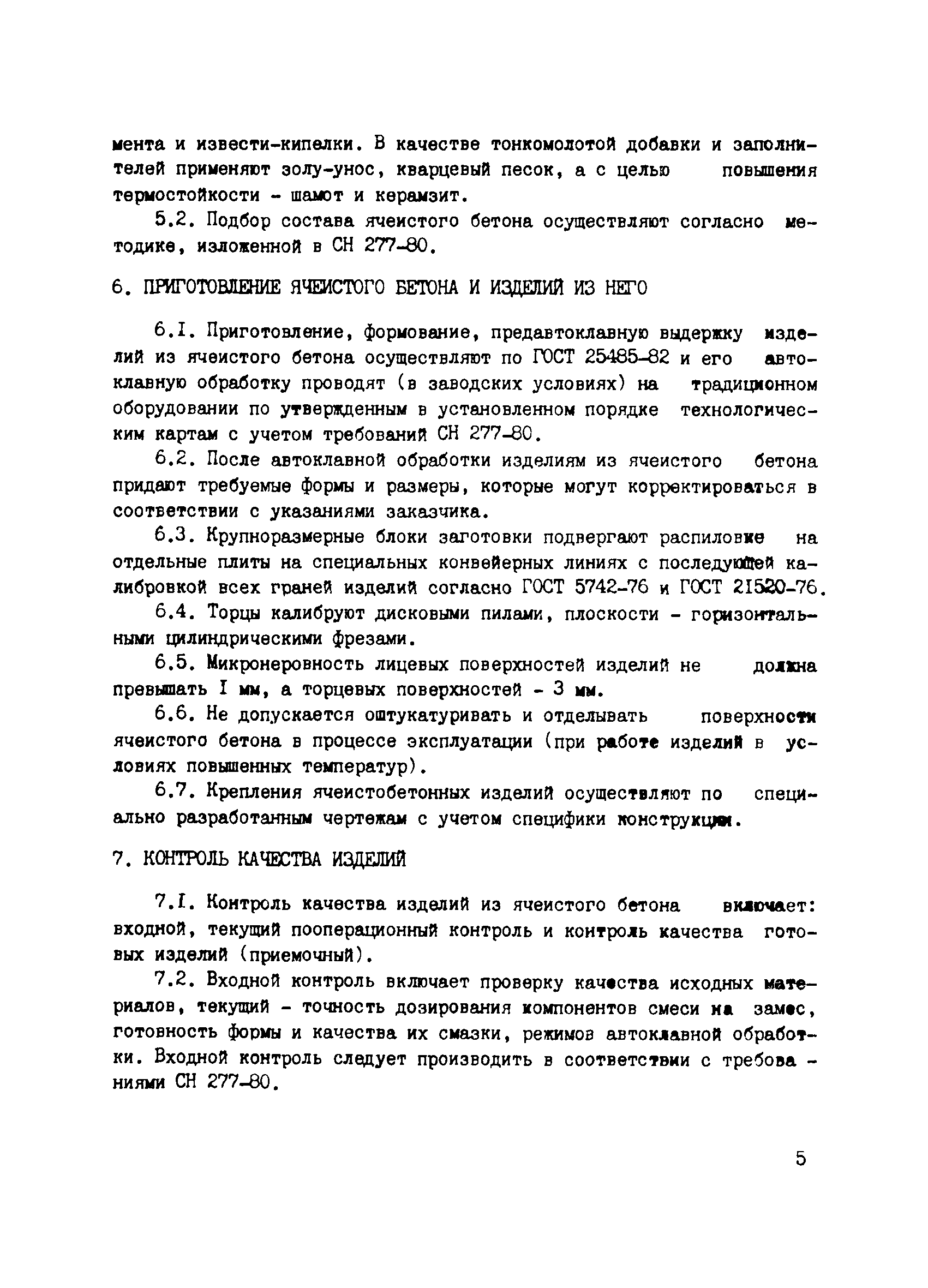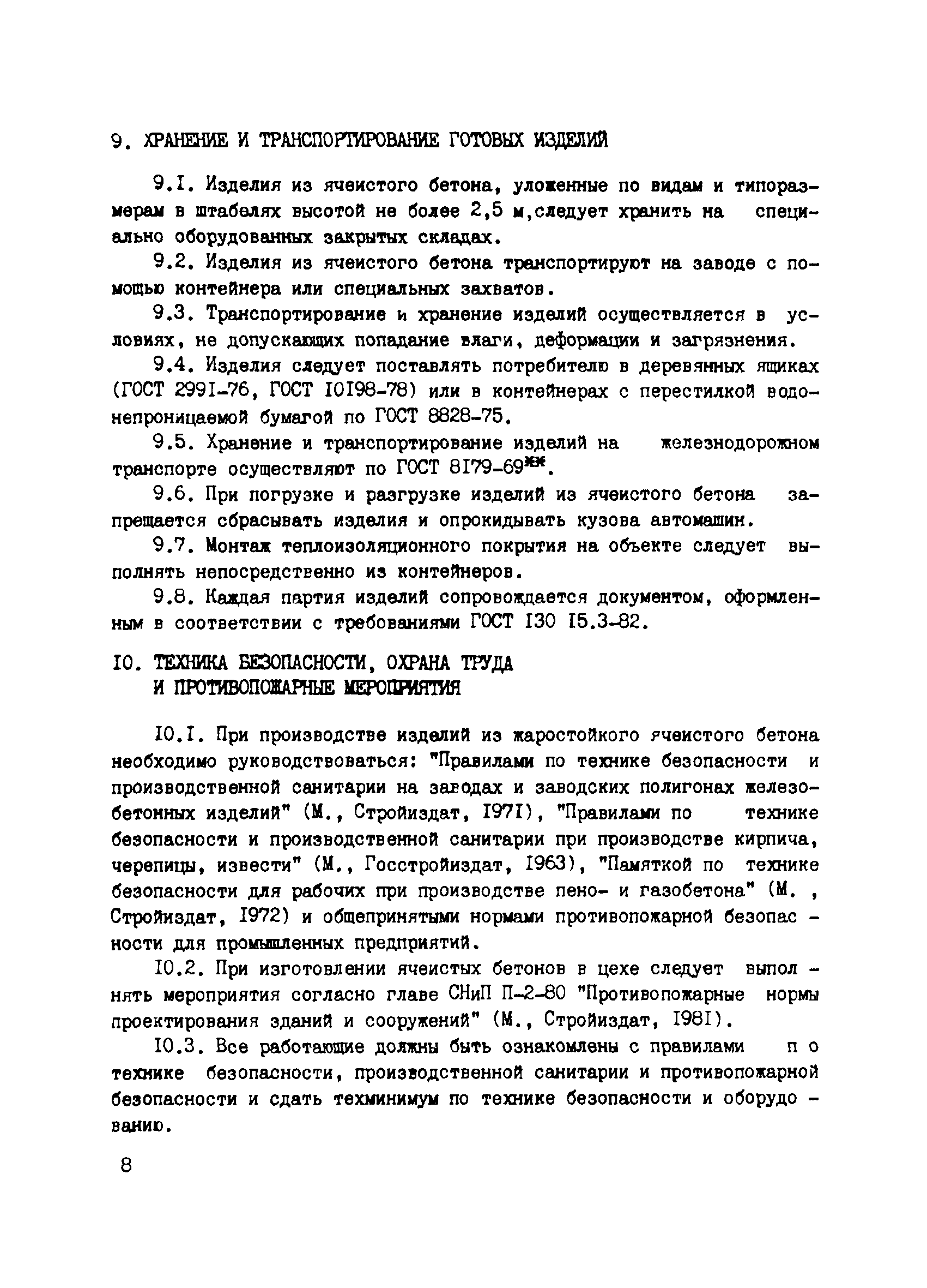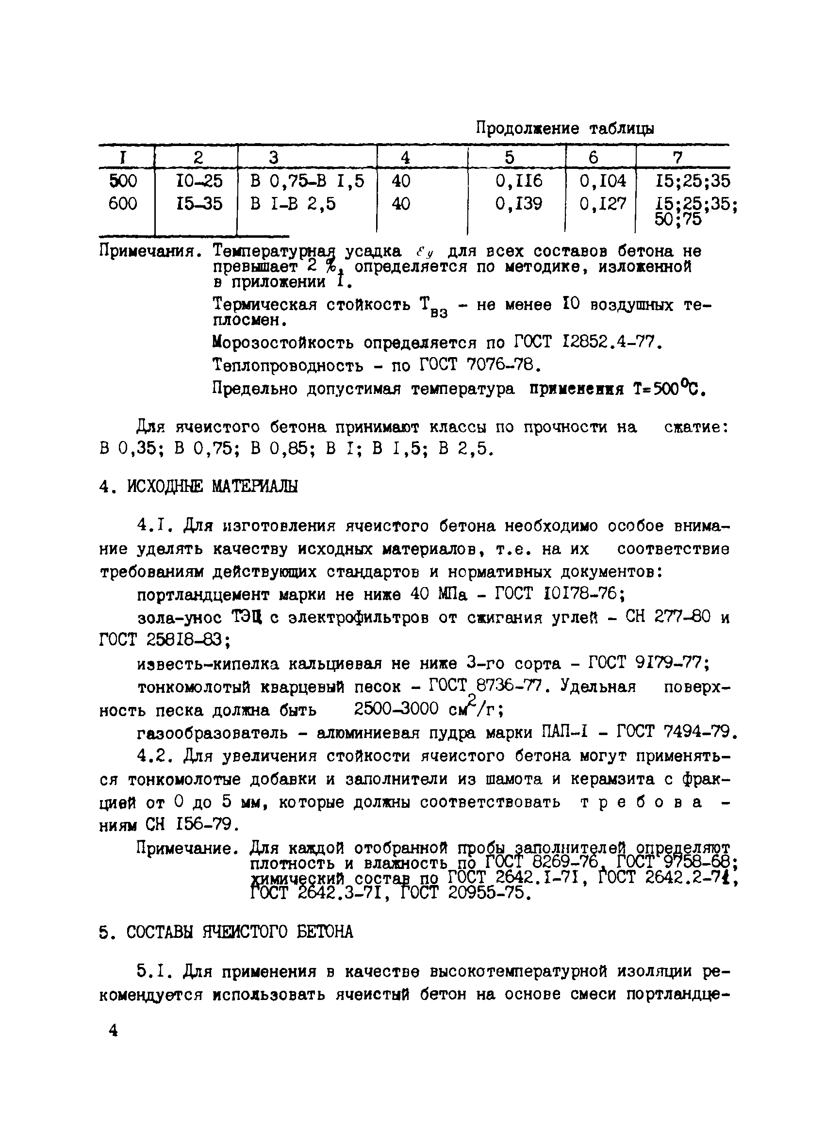 | | Нормативные ссылки: |   СН 277-80 «Инструкция по изготовлению изделий из ячеистого бетона» ГОСТ 13015.1-81 «Конструкции и изделия бетонные и железобетонные сборные. Приемка» ГОСТ 13015.2-81 «Конструкции и изделия бетонные и железобетонные сборные. Маркировка»  ГОСТ 13015.3-81 «Конструкции и изделия бетонные и железобетонные сборные. Документ о качестве»  ГОСТ 21520-89 «Блоки из ячеистых бетонов стеновые мелкие. Технические условия»  ГОСТ 9179-77 «Известь строительная. Технические условия»  ГОСТ 25818-91 «Золы-уноса тепловых электростанций для бетонов. Технические условия»  ГОСТ 10180-90 «Бетоны. Методы определения прочности по контрольным образцам»  ГОСТ 18105-86 «Бетоны. Правила контроля прочности»  ГОСТ 20910-90 «Бетоны жаростойкие. Технические условия»  ГОСТ 25485-89 «Бетоны ячеистые. Технические условия»  ГОСТ 8736-93 «Песок для строительных работ. Технические условия»  ГОСТ 9758-86 «Заполнители пористые неорганические для строительных работ. Методы испытаний»  ГОСТ 5742-76 «Изделия из ячеистых бетонов теплоизоляционные» ГОСТ 10198-91 «Ящики деревянные для грузов массой св. 200 до 20000 кг. Общие технические условия»  ГОСТ 8828-89 «Бумага-основа и бумага двухслойная водонепроницаемая упаковочная. Технические условия»  ГОСТ 2642.3-97 «Огнеупоры и огнеупорное сырье. Методы определения оксида кремния (IV)»  ГОСТ 2642.1-86 «Огнеупоры и огнеупорное сырье. Метод определения гигроскопической влаги»  ГОСТ 2642.2-86 «Огнеупоры и огнеупорное сырье. Методы определения изменения массы при прокаливании» ГОСТ 12170-85 «Огнеупоры. Стационарный метод измерения теплопроводности»  ГОСТ 2991-85 «Ящики дощатые неразборные для грузов массой до 500 кг. Общие технические условия» ГОСТ 7494-87 «Угли Сахалина для бытовых нужд населения. Технические условия» ГОСТ 10178-76 «Портландцемент и шлакопортландцемент. Технические условия» ГОСТ 12852.1-77 «Бетон ячеистый. Метод определения прочности на сжатие» ГОСТ 12852.2-77 «Бетон ячеистый. Метод определения влажности и объемной массы» СНиП II-2-80 «Противопожарные нормы проектирования зданий и сооружений» ГОСТ 8179-69 «Изделия огнеупорные. Правила укладки, приемки, хранения и транспортирования» СН 156-79 «Инструкция по технологии приготовления жаростойких бетонов» ГОСТ 12852.4-77 «Бетон ячеистый. Методы определения морозостойкости» ГОСТ 2642.1-71 «Материалы и изделия огнеупорные. Методы химического анализа огнеупорных глин, каолинов, шамотных, графитошамотных и полукислых изделий, кварцитов и динасовых изделий» ГОСТ 2642.2-71 «Материалы и изделия огнеупорные. Методы химического анализа корундовых, высокоглиноземистых огнеупорных материалов и изделий из них» ГОСТ 2642.3-71 «Материалы и изделия огнеупорные. Методы химического анализа доломитов, магнезитов и изделий из них, талько-магнезитов, дунитов, форстеритовых огнеупоров»  «Рекомендации по изготовлению изделий из жаростойкого ячеистого бетона» ГОСТ 8269-87 «Щебень из природного камня, гравий и щебень из гравия для строительных работ. Методы испытаний»