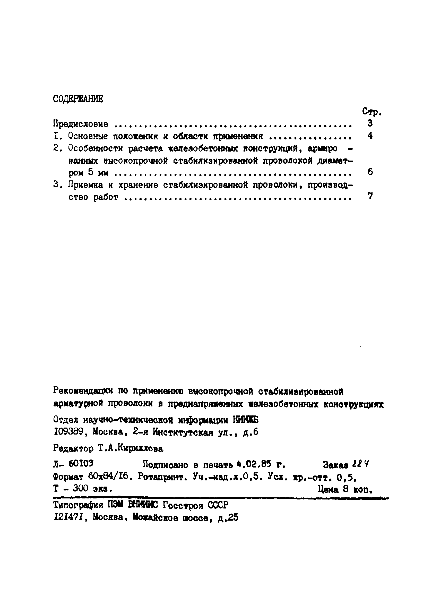 | Оглавление: | Предисловие 1. Основные положения и области применения 2. Особенности расчета железобетонныхх конструкций, армированных высокопрочной стабилизированной проволокой диаметром 5 мм 3. Приемка и хранение стабилизированной проволоки, производство работ |