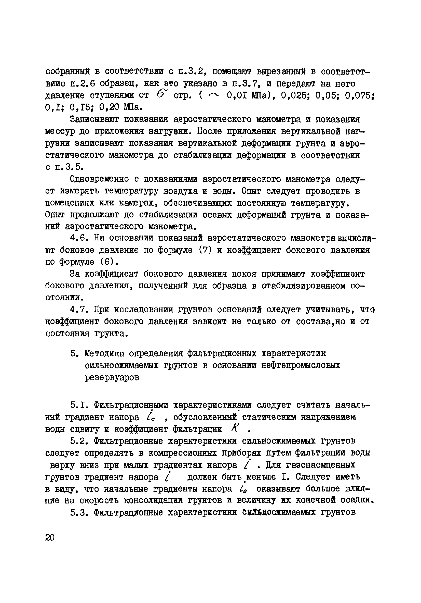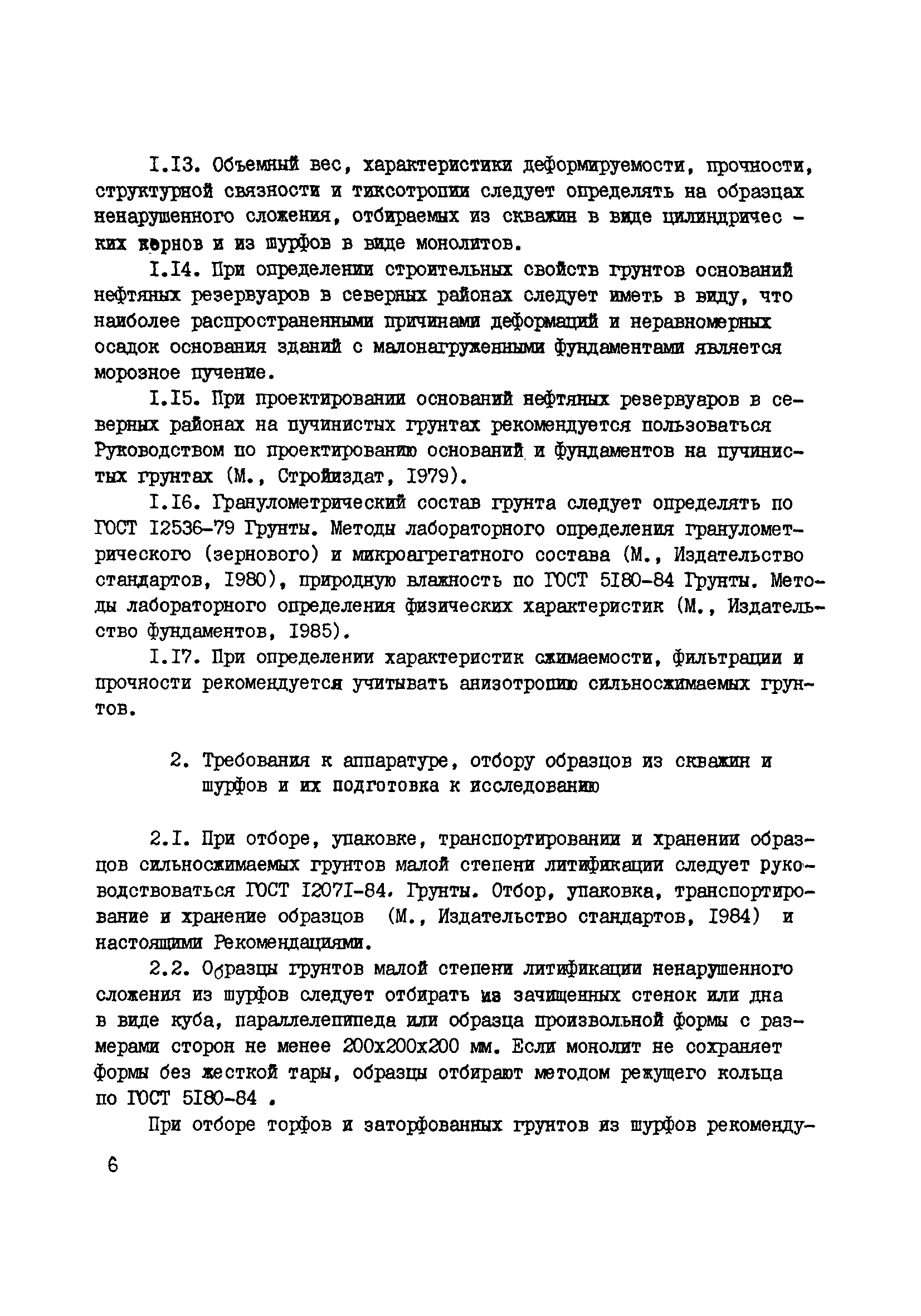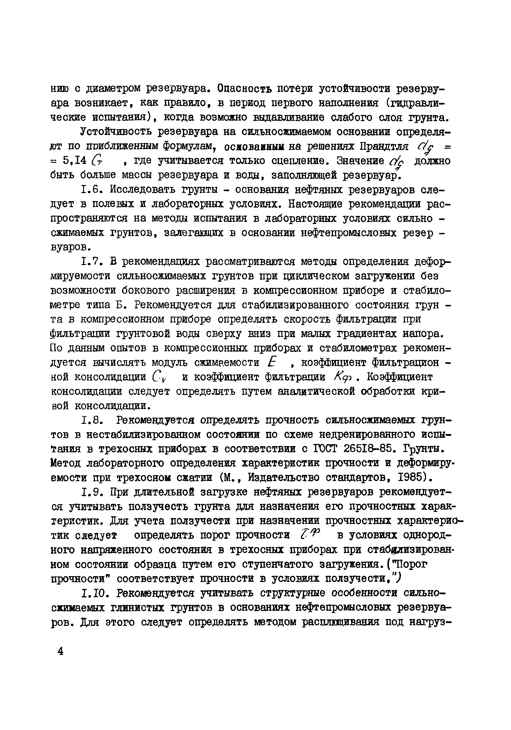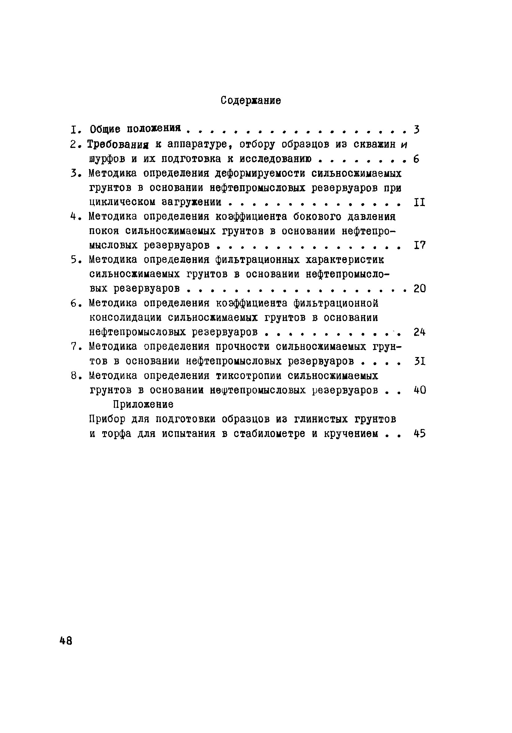 | Оглавление: | 1. Общие положения 2. Требования к аппаратуре, отбору образцов из скважин и шурфов и их подготовка к исследованию 3. Методика определения деформируемости сильносжимаемых грунтов в основании нефтепромысловых резервуаров при циклическом нагружении 4. Методика определения коэффициента бокового давления покоя сильносжимаемых грунтов в основании нефтепромысловых резервуаров 5. Методика определения фильтрационных характеристик сильносжимаемых грунтов в основании нефтепромысловых резервуаров 6. Методика определения коэффициента фильтрационной консолидации сильносжимаемых грунтов в основании нефтепромысловых резервуаров 7. Методика определения прочности сильносжимаемых грунтов в основании нефтепромысловых резервуаров 8. Методика определения тиксотропии сильносжимаемых грунтов в основании нефтепромысловых резервуаров Приложение Прибор для подготовки образцов из глинистых грунтов и торфа для испытания в стабилометре и кручением |