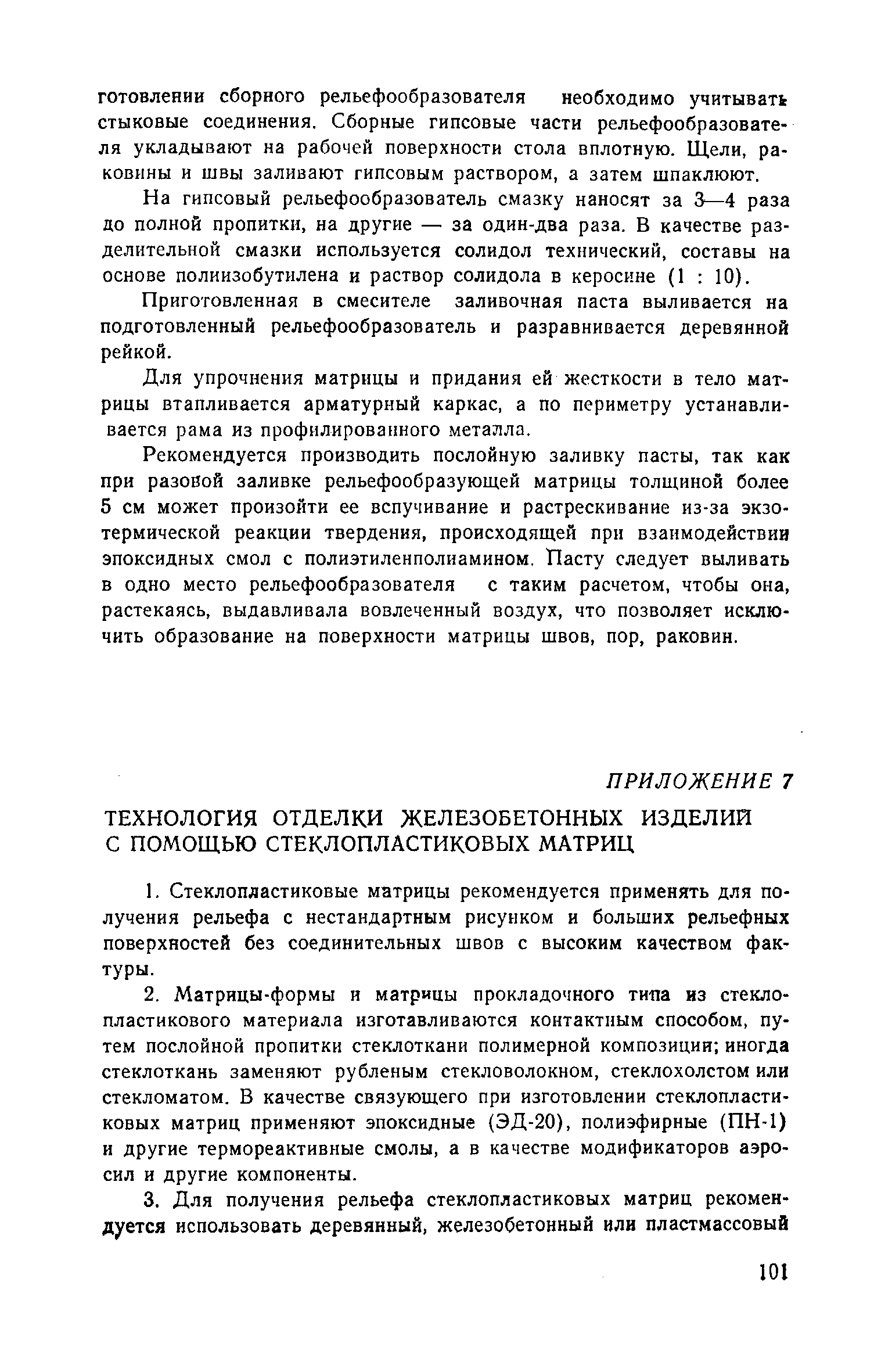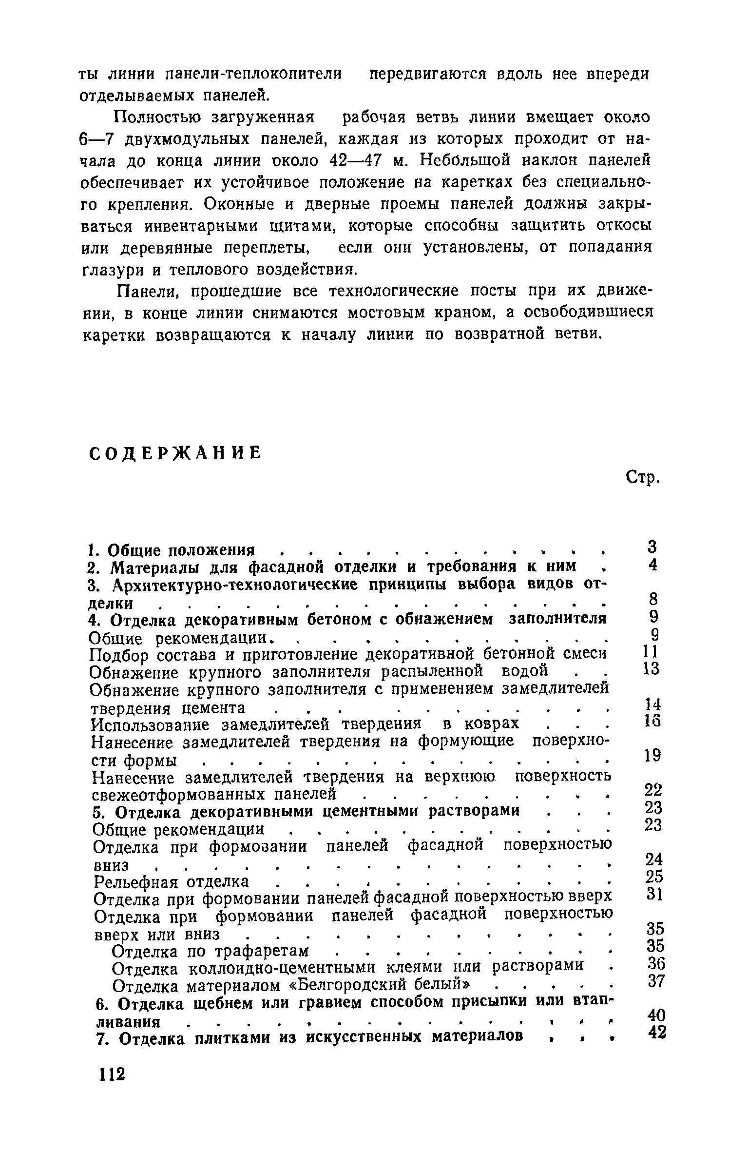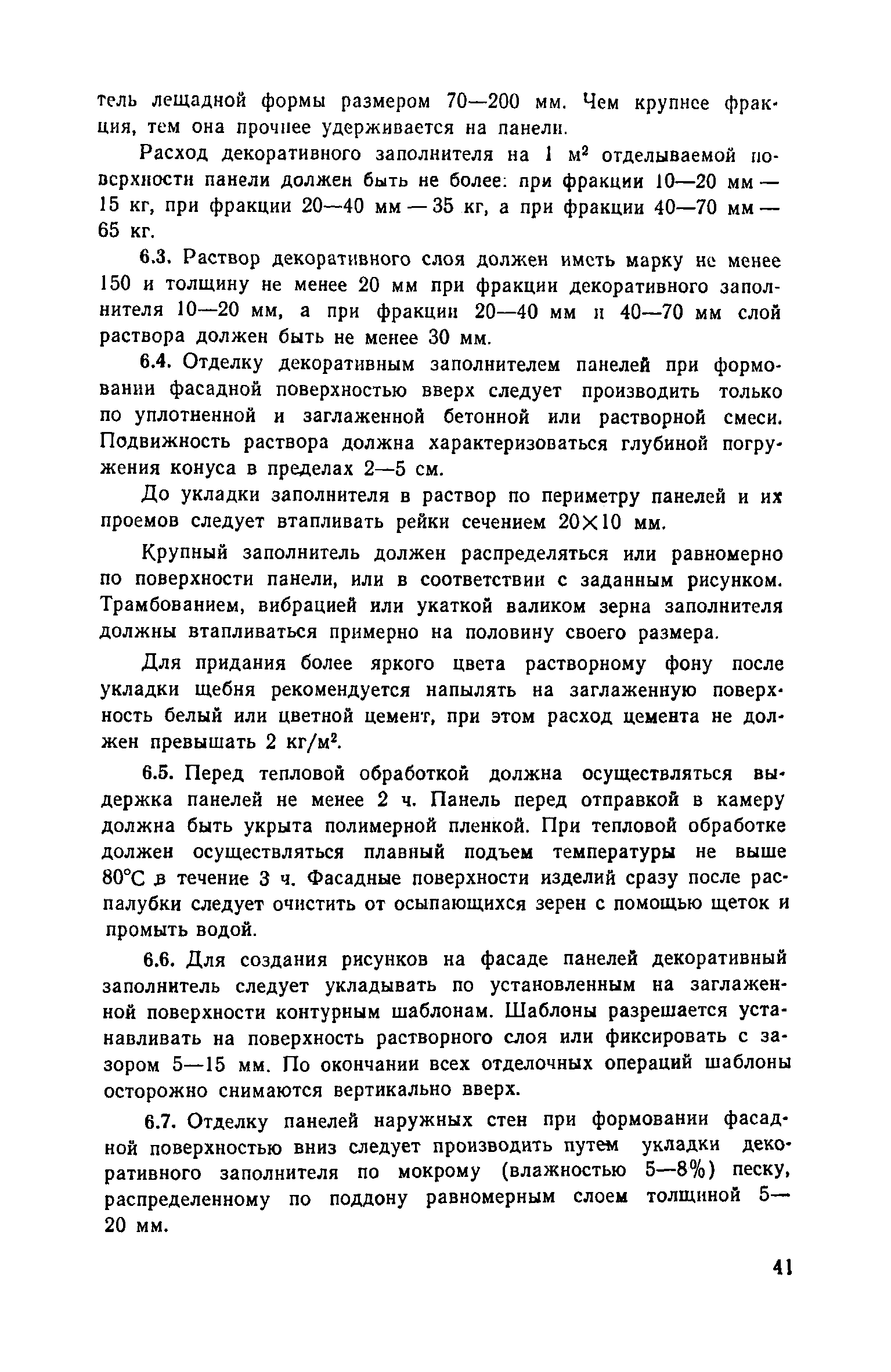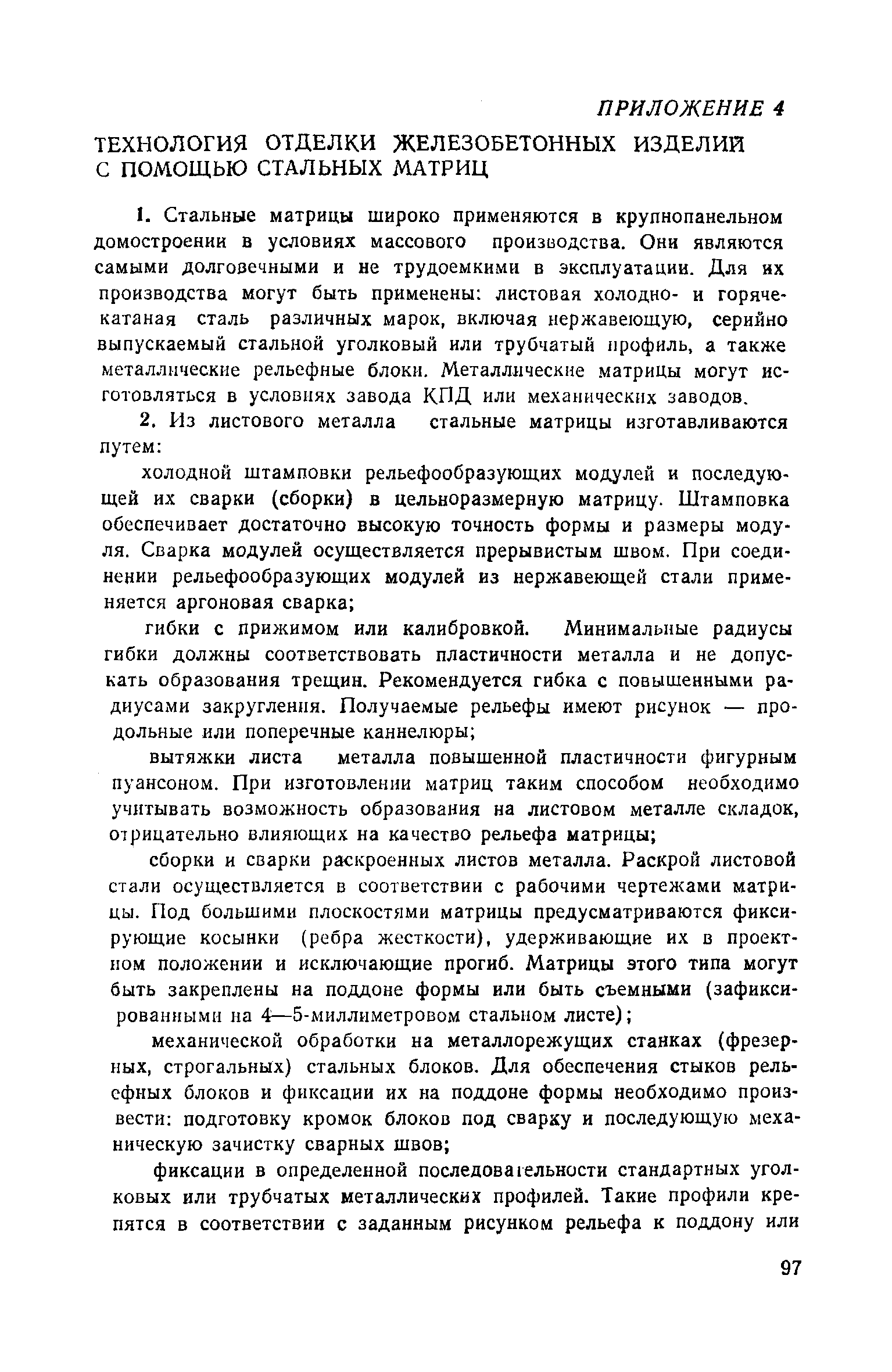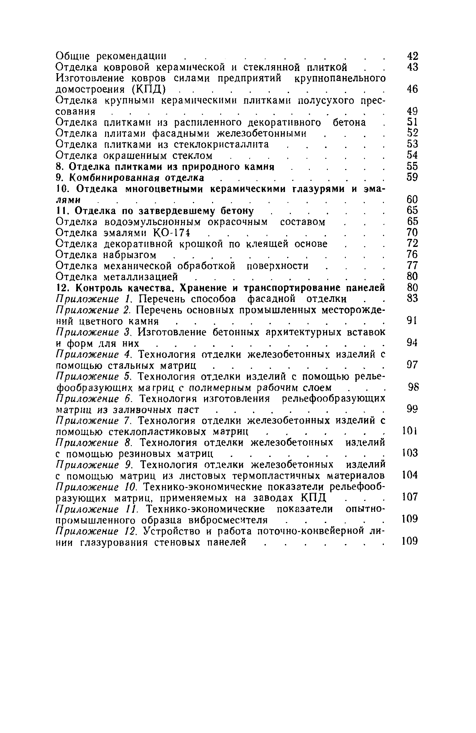 | Оглавление: | 1. Общие положения 2. Материалы для фасадной отделки и требования к ним 3. Архитектурно-технологические принципы выбора видов отделки 4. Отделка декоративным бетоном с обнажением заполнителя Общие рекомендации Подбор состава и приготовление декоративной бетонной смеси Обнажение крупного заполнителя распыленной водой Обнажение крупного заполнителя с применением замедлителей твердения цемента Использование замедлителей твердения в коврах Нанесение замедлителей твердения на формующие поверхности формы Нанесение замедлителей твердения на верхнюю поверхность свежеотформованных панелей 5. Отделка декоративными цементными растворами Общие рекомендации Отделка при формовании панелей фасадной поверхностью вниз Рельефная отделка Отделка при формовании панелей фасадной поверхностью вверх Отделка при формовании панелей фасадной поверхностью вверх или вниз Отделка по трафаретам Отделка коллоидно-цементными клеями или растворами Отделка материалом "Белгородский белый" 6. Отделка щебнем или гравием способом присыпки или втапливания 7. Отделка плитками из искусственных материалов Общие рекомендации Отделка ковровой керамiiческой и стеклянной плиткой Изготовление ковров силами предприятий крупнопанельного домостроения (КПД) Отделка крупными керамическими плитками полусухого прессования Отделка плитками из распиленного декоративного бетона Отделка плитами фасадными железобетонными Отделка плитками из стеклокристаллита Отделка окрашенным стеклом 8. Отделка плитками из природного камня 9. Комбинированная отделка 10. Отделка многоцветными керамическими глазурями и эмалями 11. Отделка по затвердевшему бетону Отделка водоэмульсионным окрасочным составом Отделка эмалями КО-174 Отделка декоративной крошкой по клеящей основе Отделка набрызгом Отделка механической обработкой поверхности Отделка металлизацией 12. Контроль качества. Хранение и транспортирование панелей Приложение 1. Перечень способов фасадной отделки Приложение 2. Перечень основных промышленных месторождений цветного камня Приложение 3. Изготовление бетонных архитектурных вставок и форм для них Приложение 4. Технология отделки железобетонных изделий с помощью стальных матриц Приложение 5. Технология отделки изделий с помощью рельефообразующих матриц с полимерным рабочим слоем Приложение 6. Технология изготовления рельефообразующих матриц заливочных паст Приложение 7. Технология отделки железобетонных изделий с помощью стеклопластиковых матриц Приложение 8. Технология отделки железобетонных изделий с помощью резиновых матриц Приложение 9. Технология отделки железобетонных изделий с помощью матриц из листовых термопластичных материалов Приложение 10. Технико-экономические показатели рельефообразующих матриц, применяемых на заводах КПД Приложение 11. Технико-экономические показатели опытно-промышленного образца вибросмесителя Приложение 12. Устройство и работа поточно-конвейерной линии глазурования стеновых панелей |
