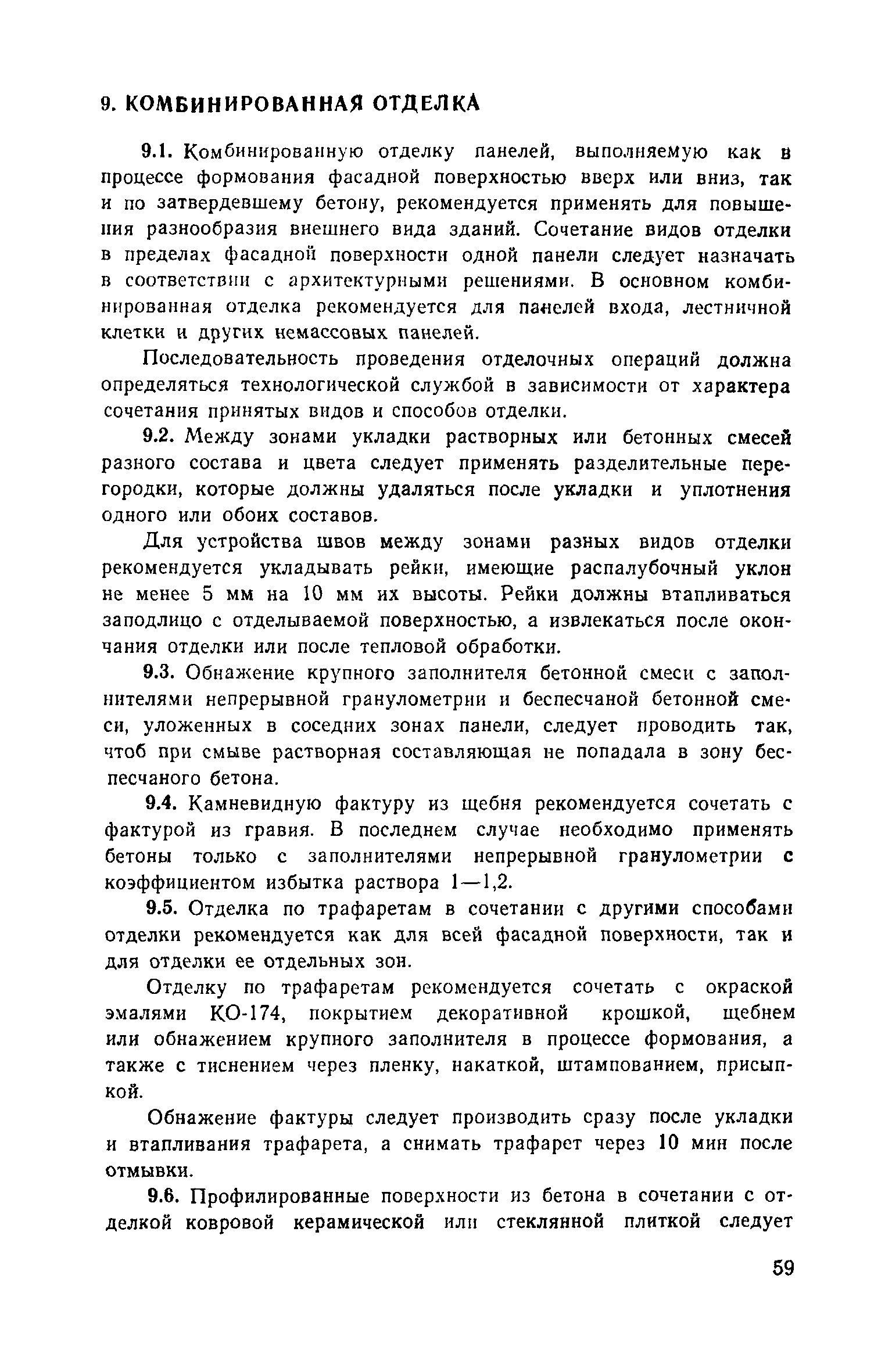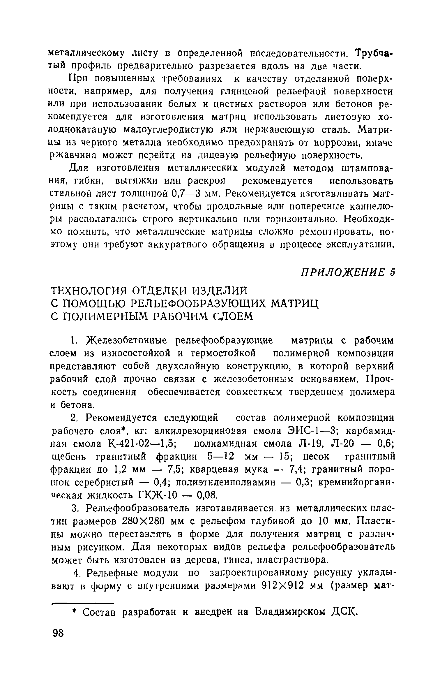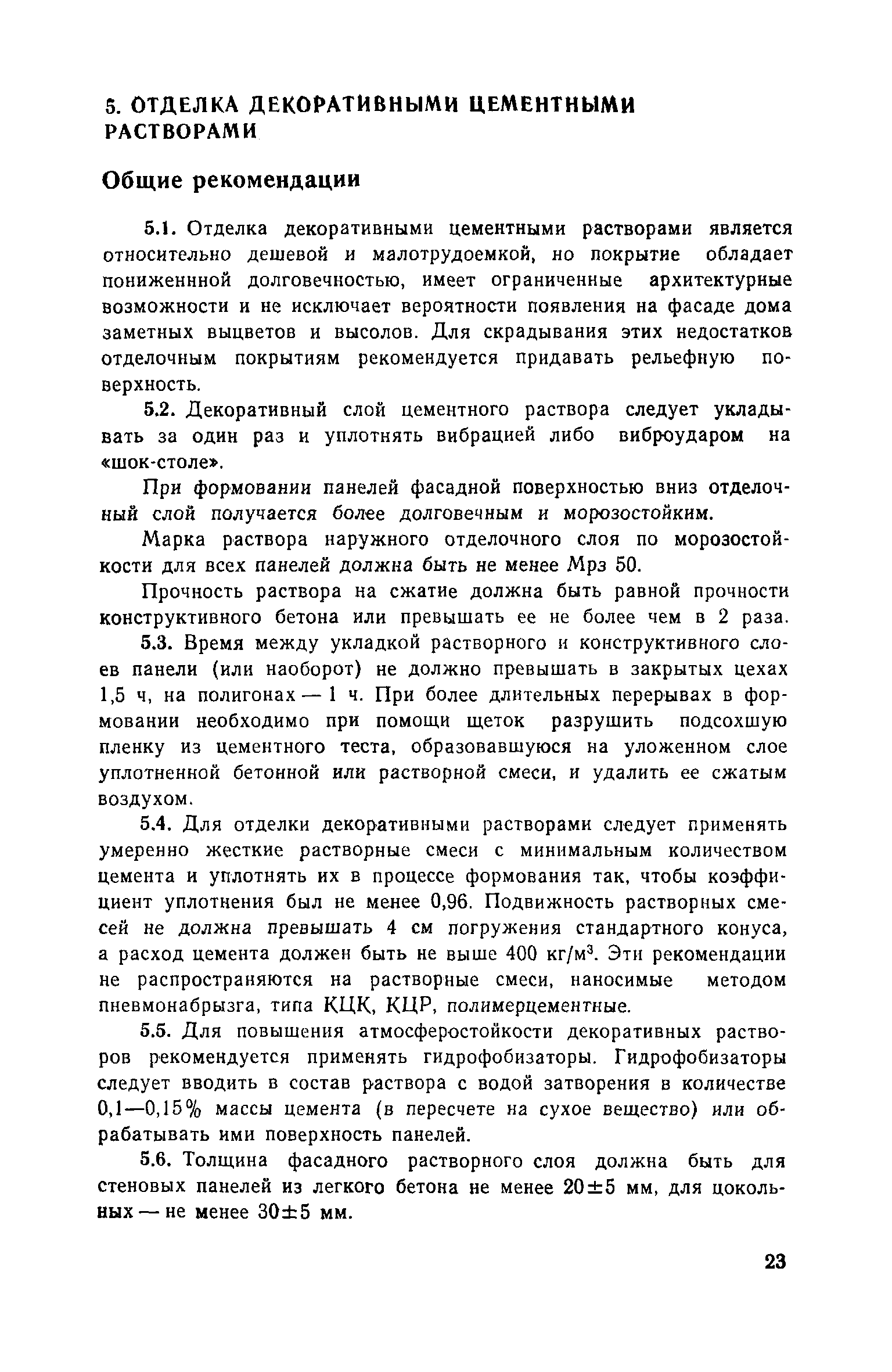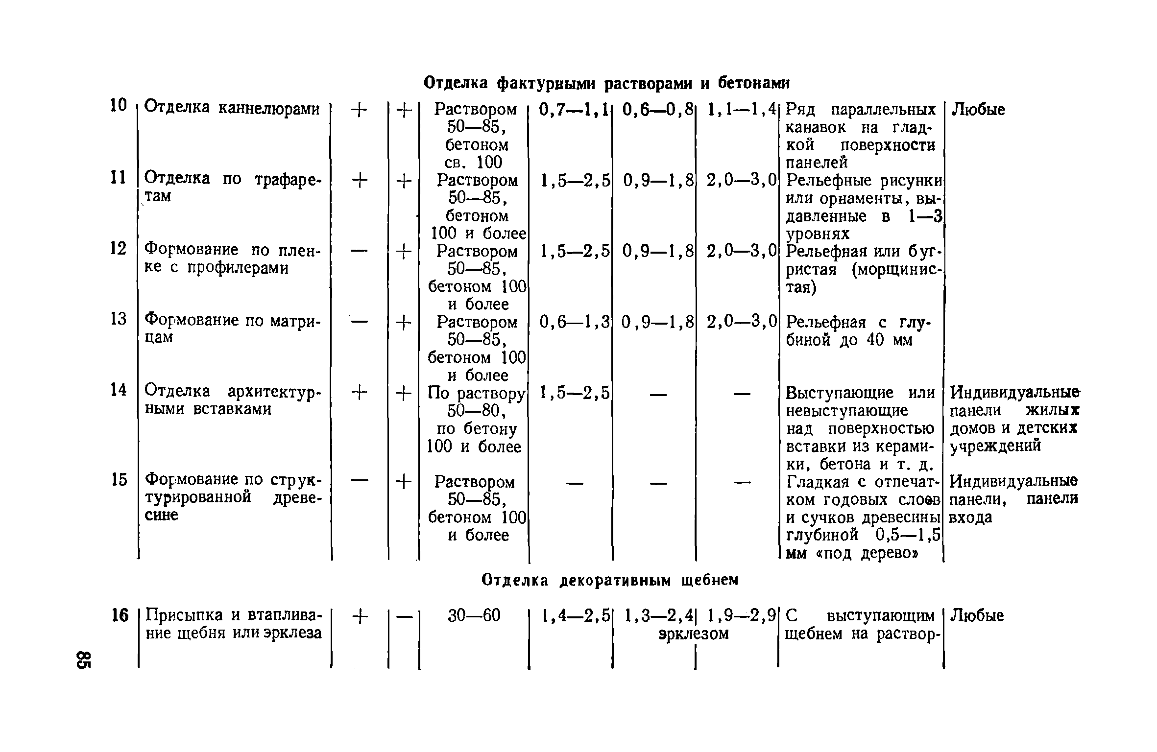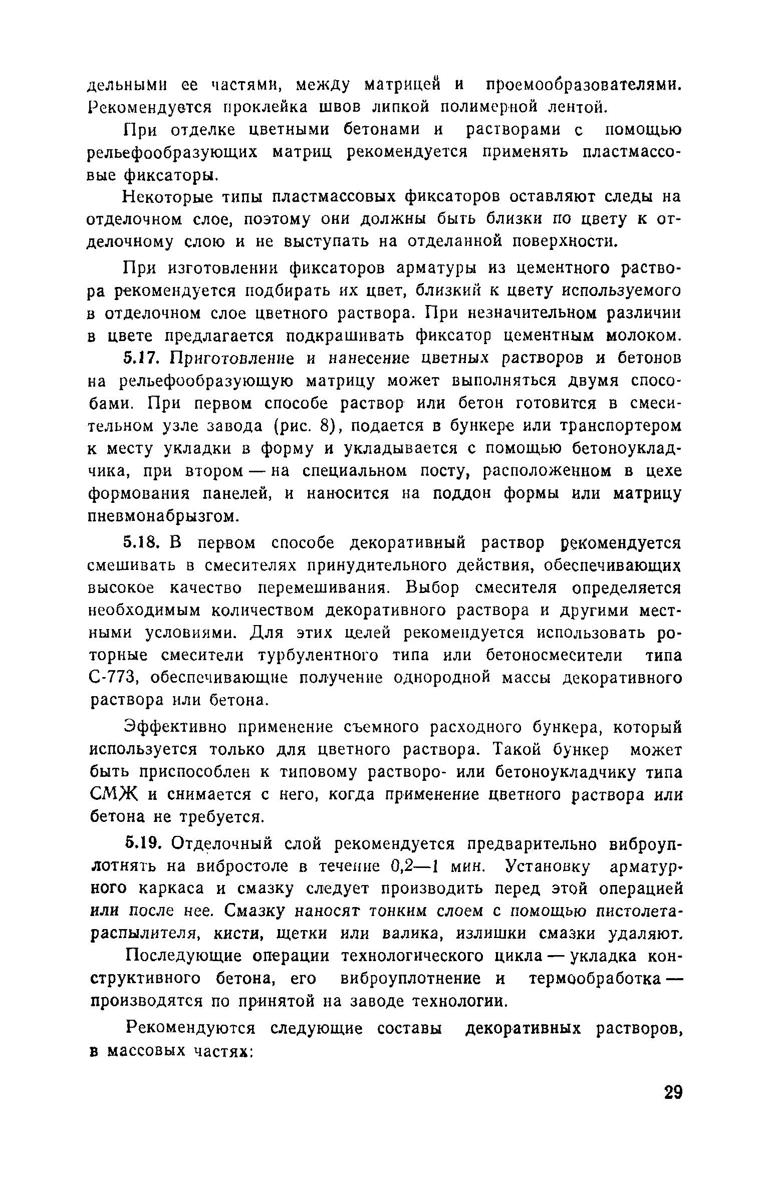 | Оглавление: | 1. Общие положения 2. Материалы для фасадной отделки и требования к ним 3. Архитектурно-технологические принципы выбора видов отделки 4. Отделка декоративным бетоном с обнажением заполнителя Общие рекомендации Подбор состава и приготовление декоративной бетонной смеси Обнажение крупного заполнителя распыленной водой Обнажение крупного заполнителя с применением замедлителей твердения цемента Использование замедлителей твердения в коврах Нанесение замедлителей твердения на формующие поверхности формы Нанесение замедлителей твердения на верхнюю поверхность свежеотформованных панелей 5. Отделка декоративными цементными растворами Общие рекомендации Отделка при формовании панелей фасадной поверхностью вниз Рельефная отделка Отделка при формовании панелей фасадной поверхностью вверх Отделка при формовании панелей фасадной поверхностью вверх или вниз Отделка по трафаретам Отделка коллоидно-цементными клеями или растворами Отделка материалом "Белгородский белый" 6. Отделка щебнем или гравием способом присыпки или втапливания 7. Отделка плитками из искусственных материалов Общие рекомендации Отделка ковровой керамiiческой и стеклянной плиткой Изготовление ковров силами предприятий крупнопанельного домостроения (КПД) Отделка крупными керамическими плитками полусухого прессования Отделка плитками из распиленного декоративного бетона Отделка плитами фасадными железобетонными Отделка плитками из стеклокристаллита Отделка окрашенным стеклом 8. Отделка плитками из природного камня 9. Комбинированная отделка 10. Отделка многоцветными керамическими глазурями и эмалями 11. Отделка по затвердевшему бетону Отделка водоэмульсионным окрасочным составом Отделка эмалями КО-174 Отделка декоративной крошкой по клеящей основе Отделка набрызгом Отделка механической обработкой поверхности Отделка металлизацией 12. Контроль качества. Хранение и транспортирование панелей Приложение 1. Перечень способов фасадной отделки Приложение 2. Перечень основных промышленных месторождений цветного камня Приложение 3. Изготовление бетонных архитектурных вставок и форм для них Приложение 4. Технология отделки железобетонных изделий с помощью стальных матриц Приложение 5. Технология отделки изделий с помощью рельефообразующих матриц с полимерным рабочим слоем Приложение 6. Технология изготовления рельефообразующих матриц заливочных паст Приложение 7. Технология отделки железобетонных изделий с помощью стеклопластиковых матриц Приложение 8. Технология отделки железобетонных изделий с помощью резиновых матриц Приложение 9. Технология отделки железобетонных изделий с помощью матриц из листовых термопластичных материалов Приложение 10. Технико-экономические показатели рельефообразующих матриц, применяемых на заводах КПД Приложение 11. Технико-экономические показатели опытно-промышленного образца вибросмесителя Приложение 12. Устройство и работа поточно-конвейерной линии глазурования стеновых панелей |