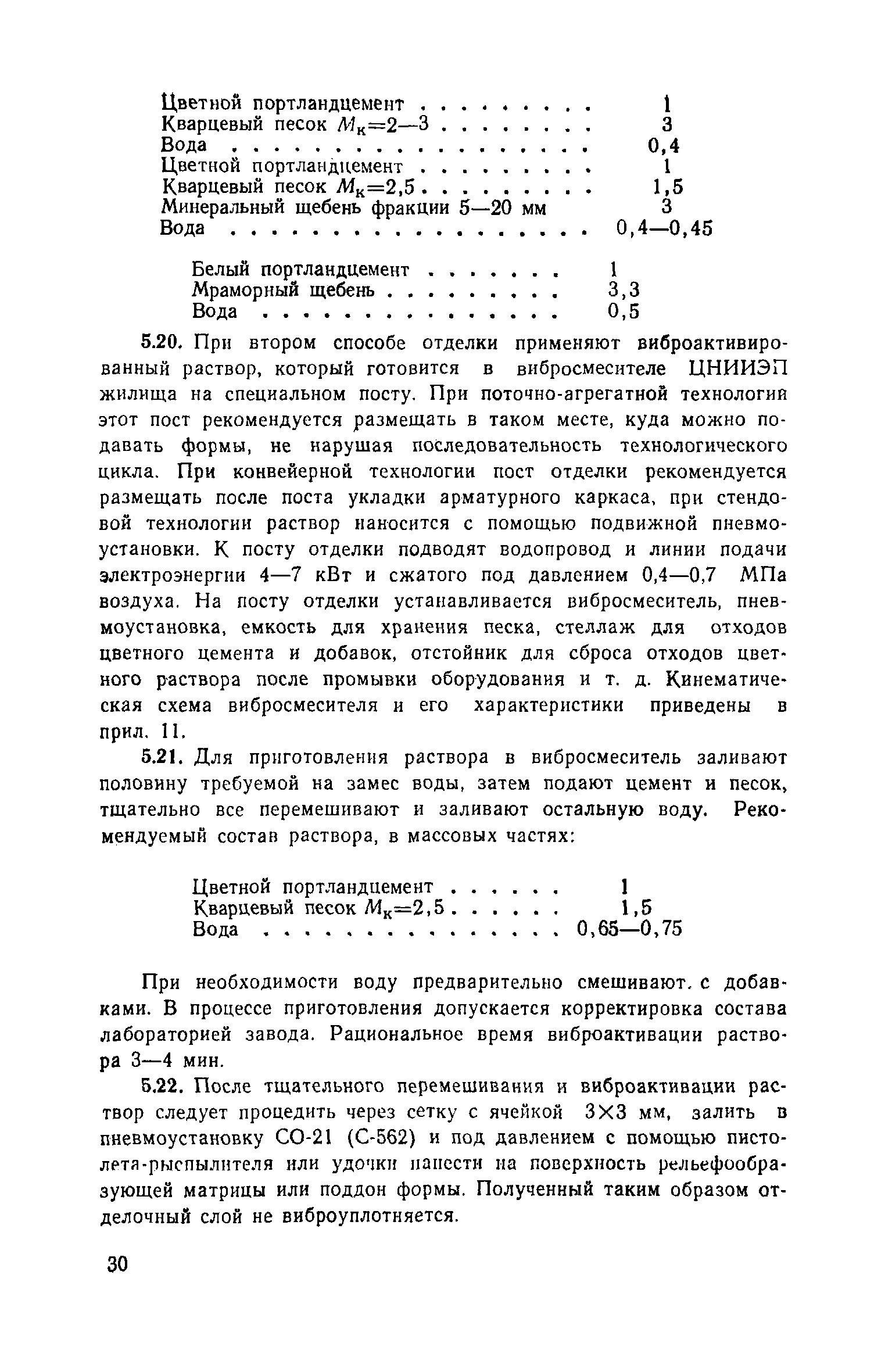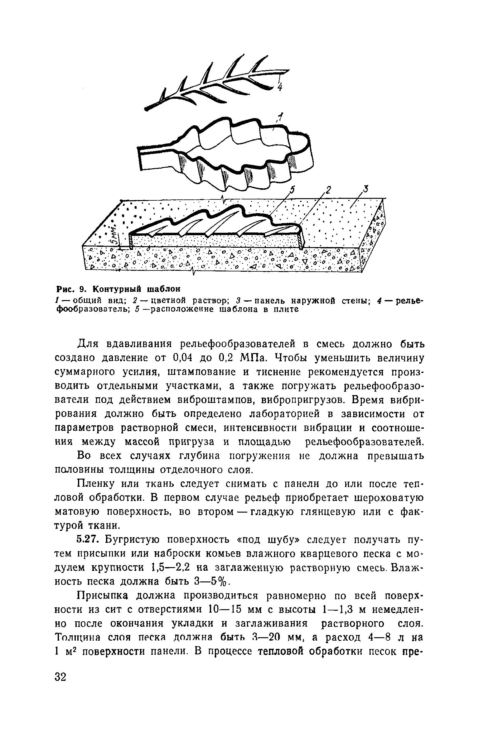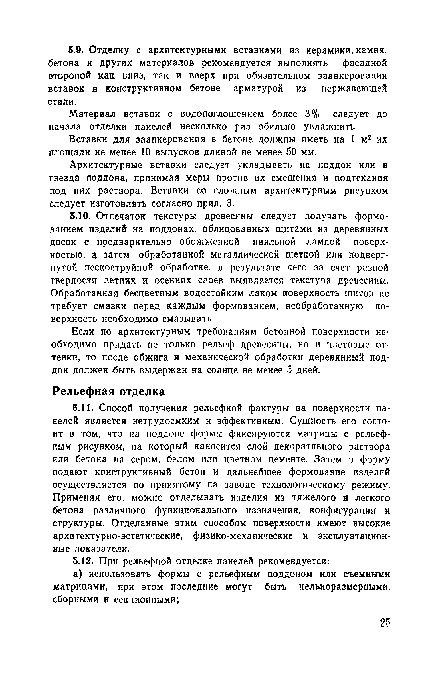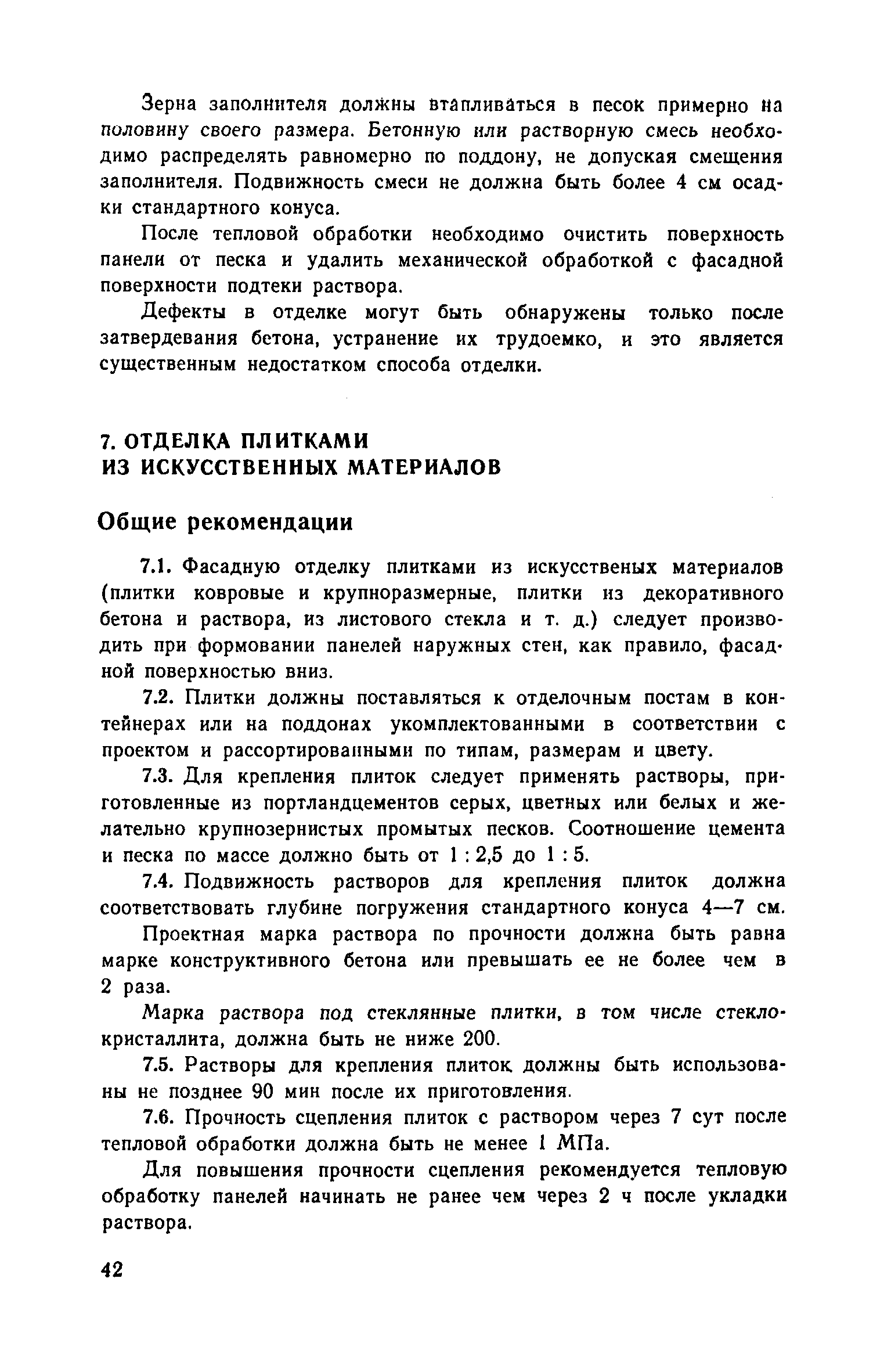 | Оглавление: | 1. Общие положения 2. Материалы для фасадной отделки и требования к ним 3. Архитектурно-технологические принципы выбора видов отделки 4. Отделка декоративным бетоном с обнажением заполнителя Общие рекомендации Подбор состава и приготовление декоративной бетонной смеси Обнажение крупного заполнителя распыленной водой Обнажение крупного заполнителя с применением замедлителей твердения цемента Использование замедлителей твердения в коврах Нанесение замедлителей твердения на формующие поверхности формы Нанесение замедлителей твердения на верхнюю поверхность свежеотформованных панелей 5. Отделка декоративными цементными растворами Общие рекомендации Отделка при формовании панелей фасадной поверхностью вниз Рельефная отделка Отделка при формовании панелей фасадной поверхностью вверх Отделка при формовании панелей фасадной поверхностью вверх или вниз Отделка по трафаретам Отделка коллоидно-цементными клеями или растворами Отделка материалом "Белгородский белый" 6. Отделка щебнем или гравием способом присыпки или втапливания 7. Отделка плитками из искусственных материалов Общие рекомендации Отделка ковровой керамiiческой и стеклянной плиткой Изготовление ковров силами предприятий крупнопанельного домостроения (КПД) Отделка крупными керамическими плитками полусухого прессования Отделка плитками из распиленного декоративного бетона Отделка плитами фасадными железобетонными Отделка плитками из стеклокристаллита Отделка окрашенным стеклом 8. Отделка плитками из природного камня 9. Комбинированная отделка 10. Отделка многоцветными керамическими глазурями и эмалями 11. Отделка по затвердевшему бетону Отделка водоэмульсионным окрасочным составом Отделка эмалями КО-174 Отделка декоративной крошкой по клеящей основе Отделка набрызгом Отделка механической обработкой поверхности Отделка металлизацией 12. Контроль качества. Хранение и транспортирование панелей Приложение 1. Перечень способов фасадной отделки Приложение 2. Перечень основных промышленных месторождений цветного камня Приложение 3. Изготовление бетонных архитектурных вставок и форм для них Приложение 4. Технология отделки железобетонных изделий с помощью стальных матриц Приложение 5. Технология отделки изделий с помощью рельефообразующих матриц с полимерным рабочим слоем Приложение 6. Технология изготовления рельефообразующих матриц заливочных паст Приложение 7. Технология отделки железобетонных изделий с помощью стеклопластиковых матриц Приложение 8. Технология отделки железобетонных изделий с помощью резиновых матриц Приложение 9. Технология отделки железобетонных изделий с помощью матриц из листовых термопластичных материалов Приложение 10. Технико-экономические показатели рельефообразующих матриц, применяемых на заводах КПД Приложение 11. Технико-экономические показатели опытно-промышленного образца вибросмесителя Приложение 12. Устройство и работа поточно-конвейерной линии глазурования стеновых панелей |