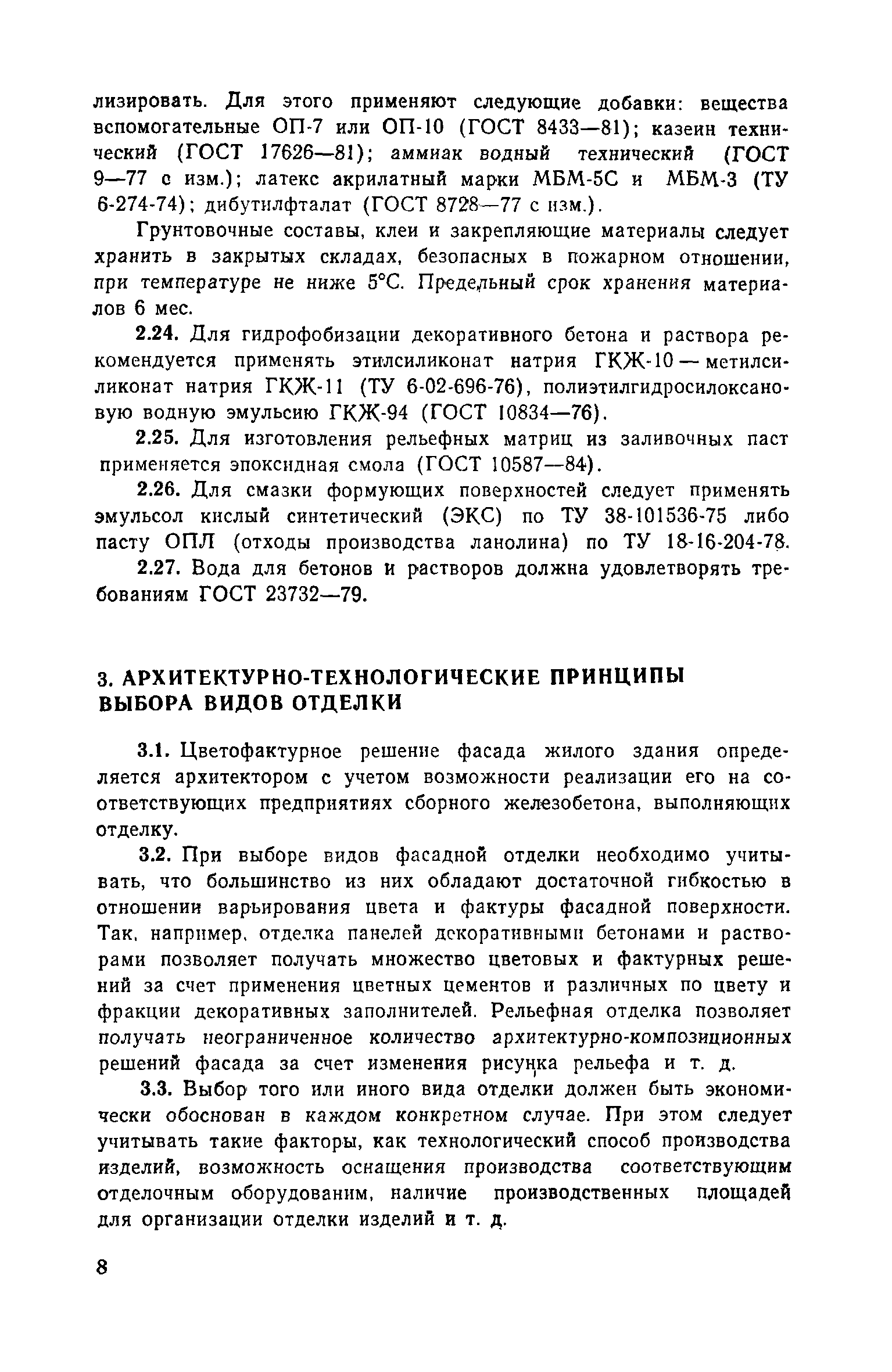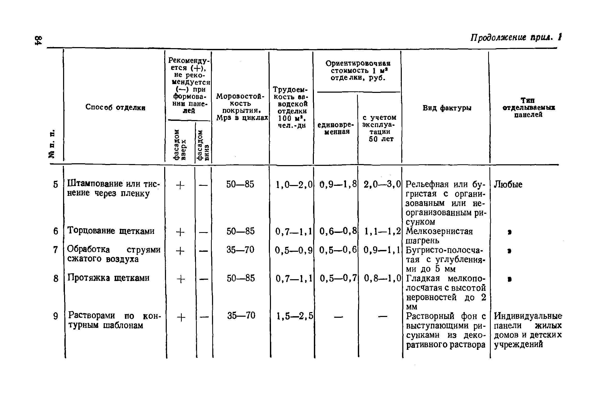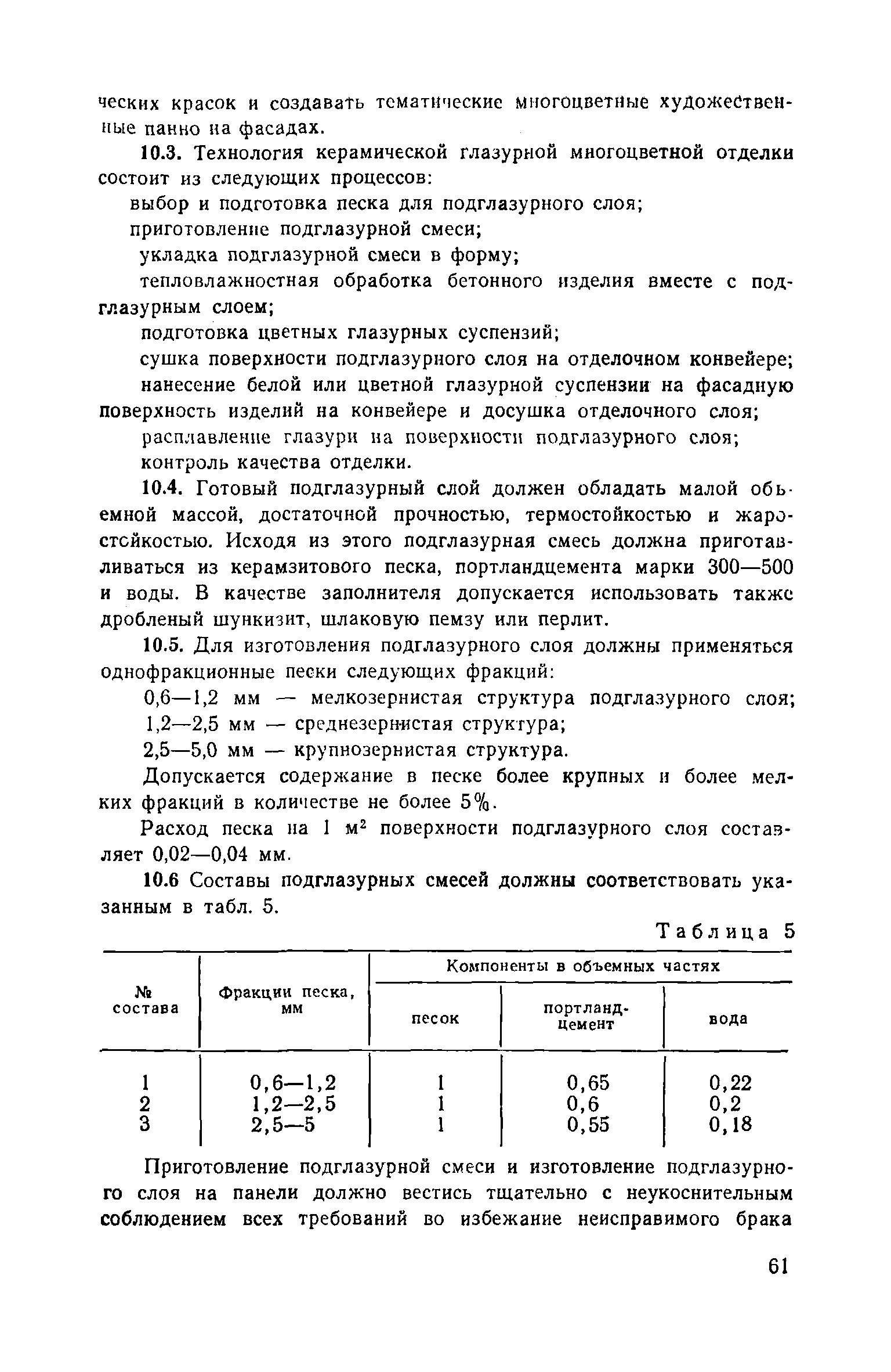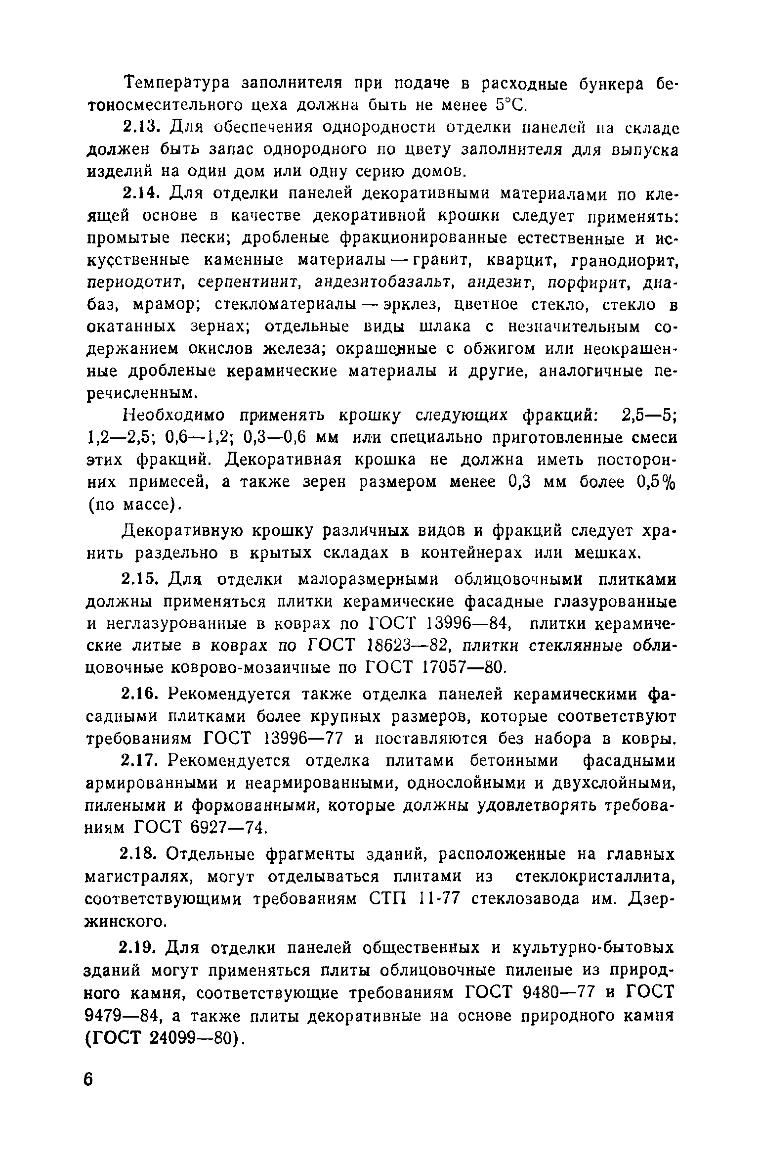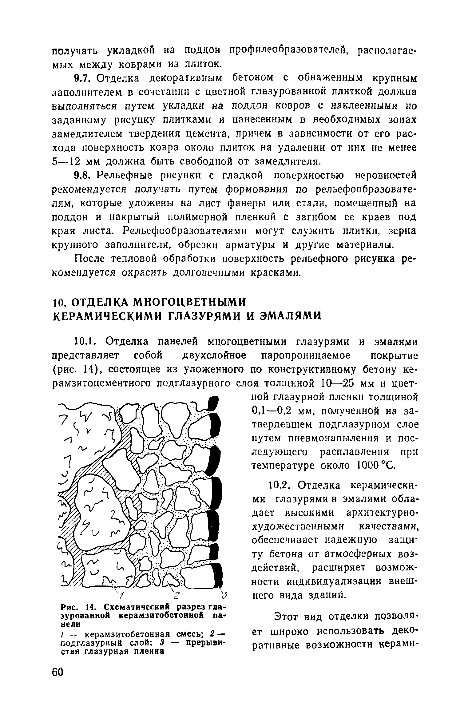 | Оглавление: | 1. Общие положения 2. Материалы для фасадной отделки и требования к ним 3. Архитектурно-технологические принципы выбора видов отделки 4. Отделка декоративным бетоном с обнажением заполнителя Общие рекомендации Подбор состава и приготовление декоративной бетонной смеси Обнажение крупного заполнителя распыленной водой Обнажение крупного заполнителя с применением замедлителей твердения цемента Использование замедлителей твердения в коврах Нанесение замедлителей твердения на формующие поверхности формы Нанесение замедлителей твердения на верхнюю поверхность свежеотформованных панелей 5. Отделка декоративными цементными растворами Общие рекомендации Отделка при формовании панелей фасадной поверхностью вниз Рельефная отделка Отделка при формовании панелей фасадной поверхностью вверх Отделка при формовании панелей фасадной поверхностью вверх или вниз Отделка по трафаретам Отделка коллоидно-цементными клеями или растворами Отделка материалом "Белгородский белый" 6. Отделка щебнем или гравием способом присыпки или втапливания 7. Отделка плитками из искусственных материалов Общие рекомендации Отделка ковровой керамiiческой и стеклянной плиткой Изготовление ковров силами предприятий крупнопанельного домостроения (КПД) Отделка крупными керамическими плитками полусухого прессования Отделка плитками из распиленного декоративного бетона Отделка плитами фасадными железобетонными Отделка плитками из стеклокристаллита Отделка окрашенным стеклом 8. Отделка плитками из природного камня 9. Комбинированная отделка 10. Отделка многоцветными керамическими глазурями и эмалями 11. Отделка по затвердевшему бетону Отделка водоэмульсионным окрасочным составом Отделка эмалями КО-174 Отделка декоративной крошкой по клеящей основе Отделка набрызгом Отделка механической обработкой поверхности Отделка металлизацией 12. Контроль качества. Хранение и транспортирование панелей Приложение 1. Перечень способов фасадной отделки Приложение 2. Перечень основных промышленных месторождений цветного камня Приложение 3. Изготовление бетонных архитектурных вставок и форм для них Приложение 4. Технология отделки железобетонных изделий с помощью стальных матриц Приложение 5. Технология отделки изделий с помощью рельефообразующих матриц с полимерным рабочим слоем Приложение 6. Технология изготовления рельефообразующих матриц заливочных паст Приложение 7. Технология отделки железобетонных изделий с помощью стеклопластиковых матриц Приложение 8. Технология отделки железобетонных изделий с помощью резиновых матриц Приложение 9. Технология отделки железобетонных изделий с помощью матриц из листовых термопластичных материалов Приложение 10. Технико-экономические показатели рельефообразующих матриц, применяемых на заводах КПД Приложение 11. Технико-экономические показатели опытно-промышленного образца вибросмесителя Приложение 12. Устройство и работа поточно-конвейерной линии глазурования стеновых панелей |