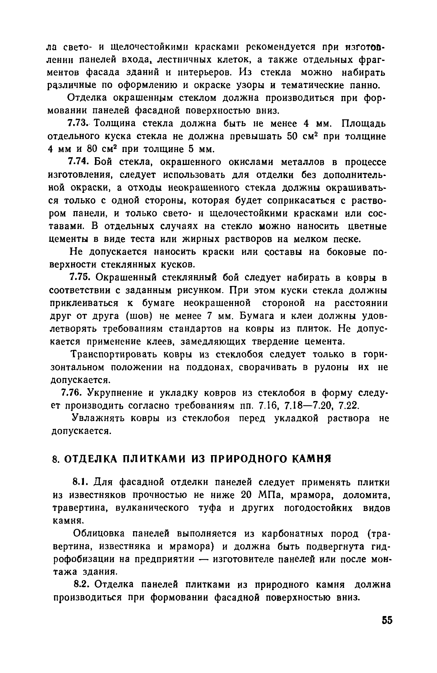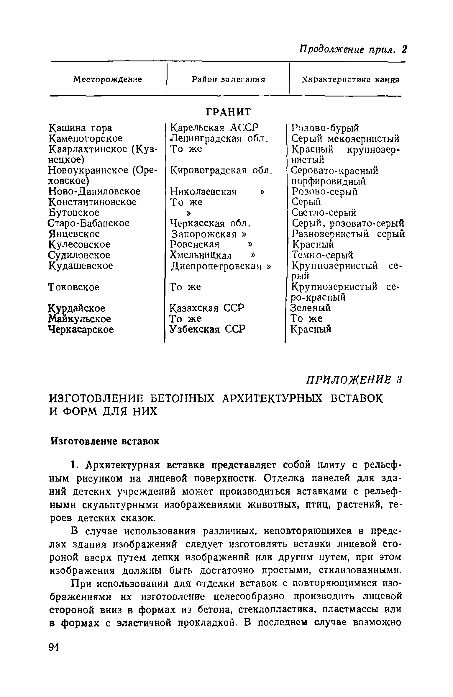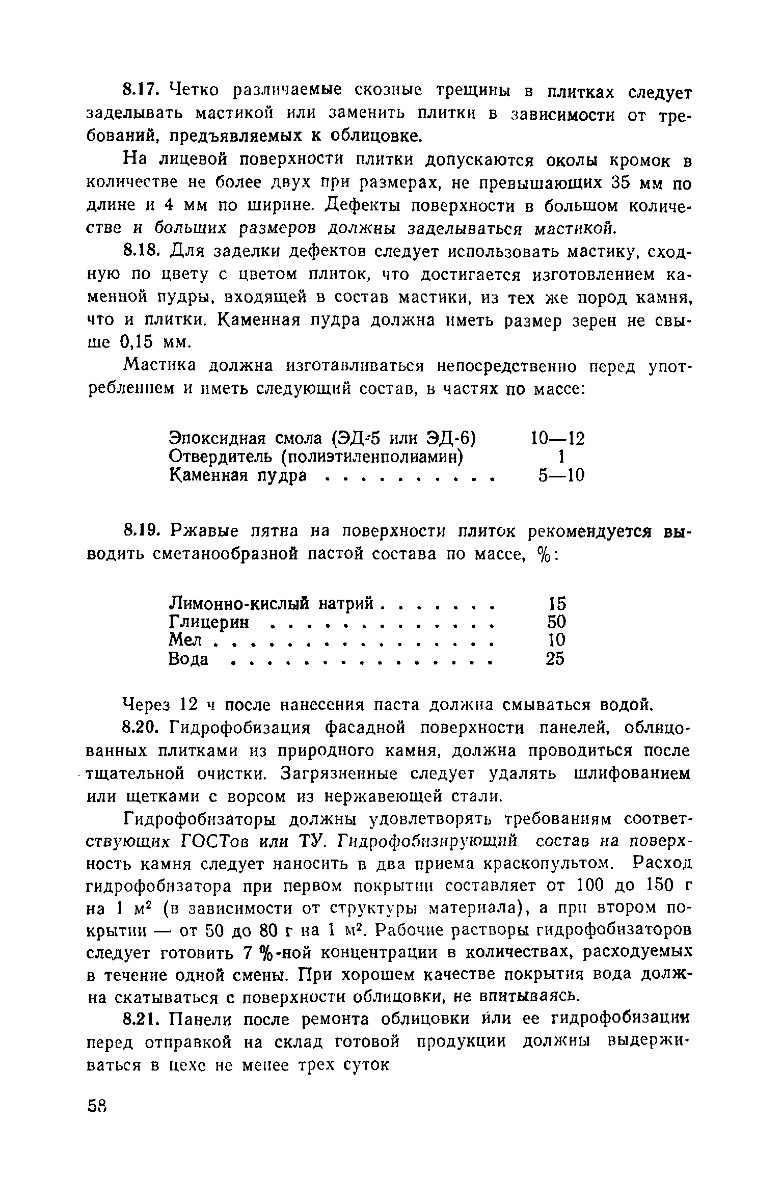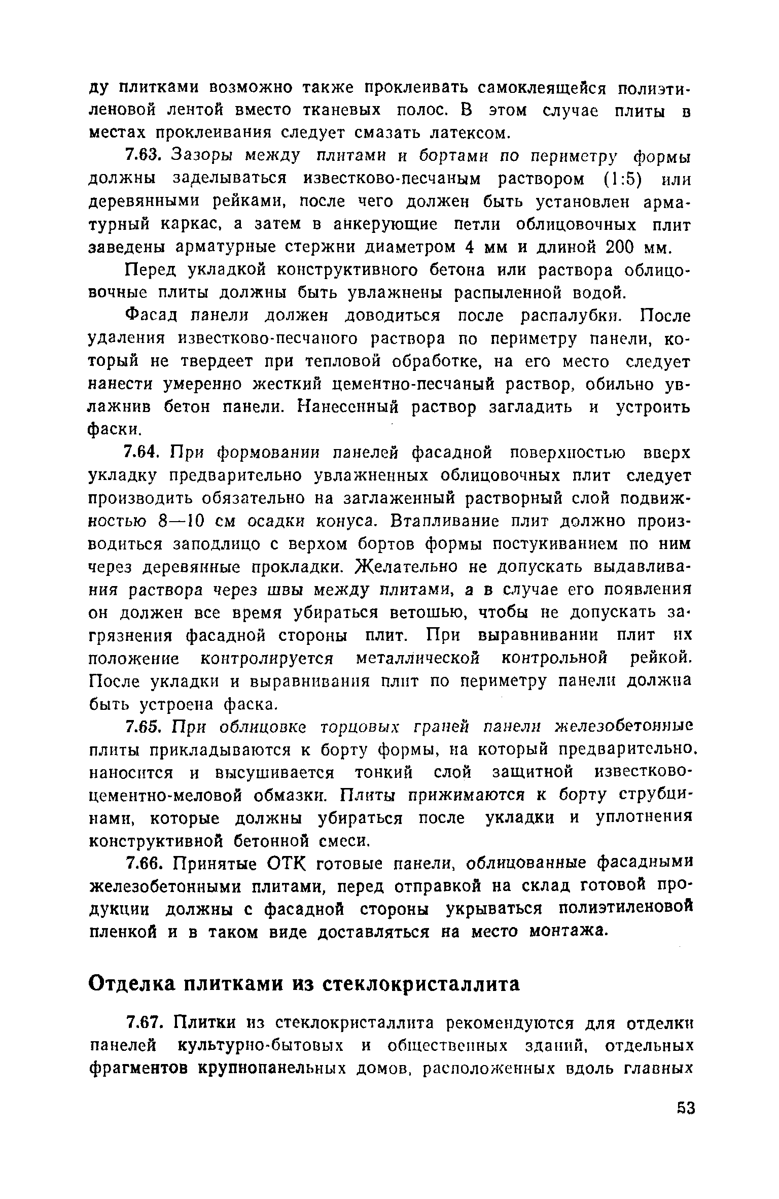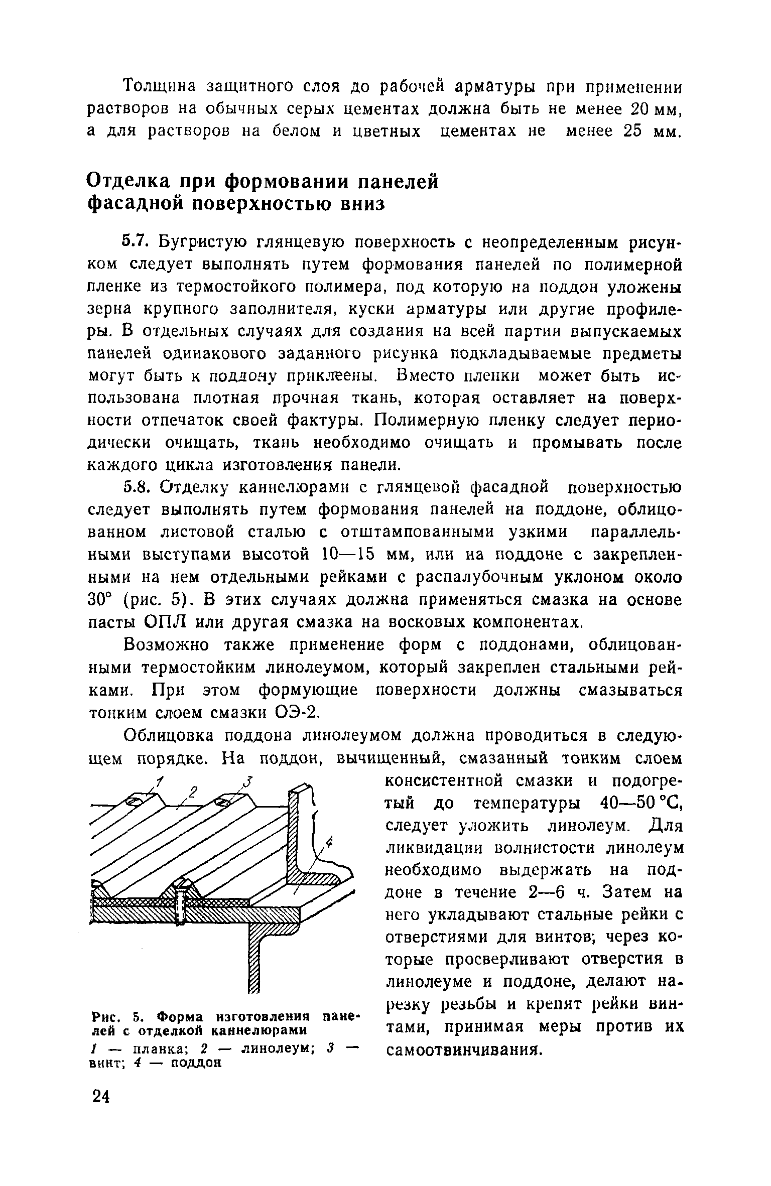 | Оглавление: | 1. Общие положения 2. Материалы для фасадной отделки и требования к ним 3. Архитектурно-технологические принципы выбора видов отделки 4. Отделка декоративным бетоном с обнажением заполнителя Общие рекомендации Подбор состава и приготовление декоративной бетонной смеси Обнажение крупного заполнителя распыленной водой Обнажение крупного заполнителя с применением замедлителей твердения цемента Использование замедлителей твердения в коврах Нанесение замедлителей твердения на формующие поверхности формы Нанесение замедлителей твердения на верхнюю поверхность свежеотформованных панелей 5. Отделка декоративными цементными растворами Общие рекомендации Отделка при формовании панелей фасадной поверхностью вниз Рельефная отделка Отделка при формовании панелей фасадной поверхностью вверх Отделка при формовании панелей фасадной поверхностью вверх или вниз Отделка по трафаретам Отделка коллоидно-цементными клеями или растворами Отделка материалом "Белгородский белый" 6. Отделка щебнем или гравием способом присыпки или втапливания 7. Отделка плитками из искусственных материалов Общие рекомендации Отделка ковровой керамiiческой и стеклянной плиткой Изготовление ковров силами предприятий крупнопанельного домостроения (КПД) Отделка крупными керамическими плитками полусухого прессования Отделка плитками из распиленного декоративного бетона Отделка плитами фасадными железобетонными Отделка плитками из стеклокристаллита Отделка окрашенным стеклом 8. Отделка плитками из природного камня 9. Комбинированная отделка 10. Отделка многоцветными керамическими глазурями и эмалями 11. Отделка по затвердевшему бетону Отделка водоэмульсионным окрасочным составом Отделка эмалями КО-174 Отделка декоративной крошкой по клеящей основе Отделка набрызгом Отделка механической обработкой поверхности Отделка металлизацией 12. Контроль качества. Хранение и транспортирование панелей Приложение 1. Перечень способов фасадной отделки Приложение 2. Перечень основных промышленных месторождений цветного камня Приложение 3. Изготовление бетонных архитектурных вставок и форм для них Приложение 4. Технология отделки железобетонных изделий с помощью стальных матриц Приложение 5. Технология отделки изделий с помощью рельефообразующих матриц с полимерным рабочим слоем Приложение 6. Технология изготовления рельефообразующих матриц заливочных паст Приложение 7. Технология отделки железобетонных изделий с помощью стеклопластиковых матриц Приложение 8. Технология отделки железобетонных изделий с помощью резиновых матриц Приложение 9. Технология отделки железобетонных изделий с помощью матриц из листовых термопластичных материалов Приложение 10. Технико-экономические показатели рельефообразующих матриц, применяемых на заводах КПД Приложение 11. Технико-экономические показатели опытно-промышленного образца вибросмесителя Приложение 12. Устройство и работа поточно-конвейерной линии глазурования стеновых панелей |