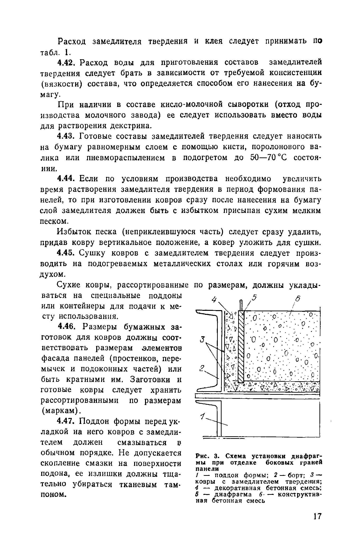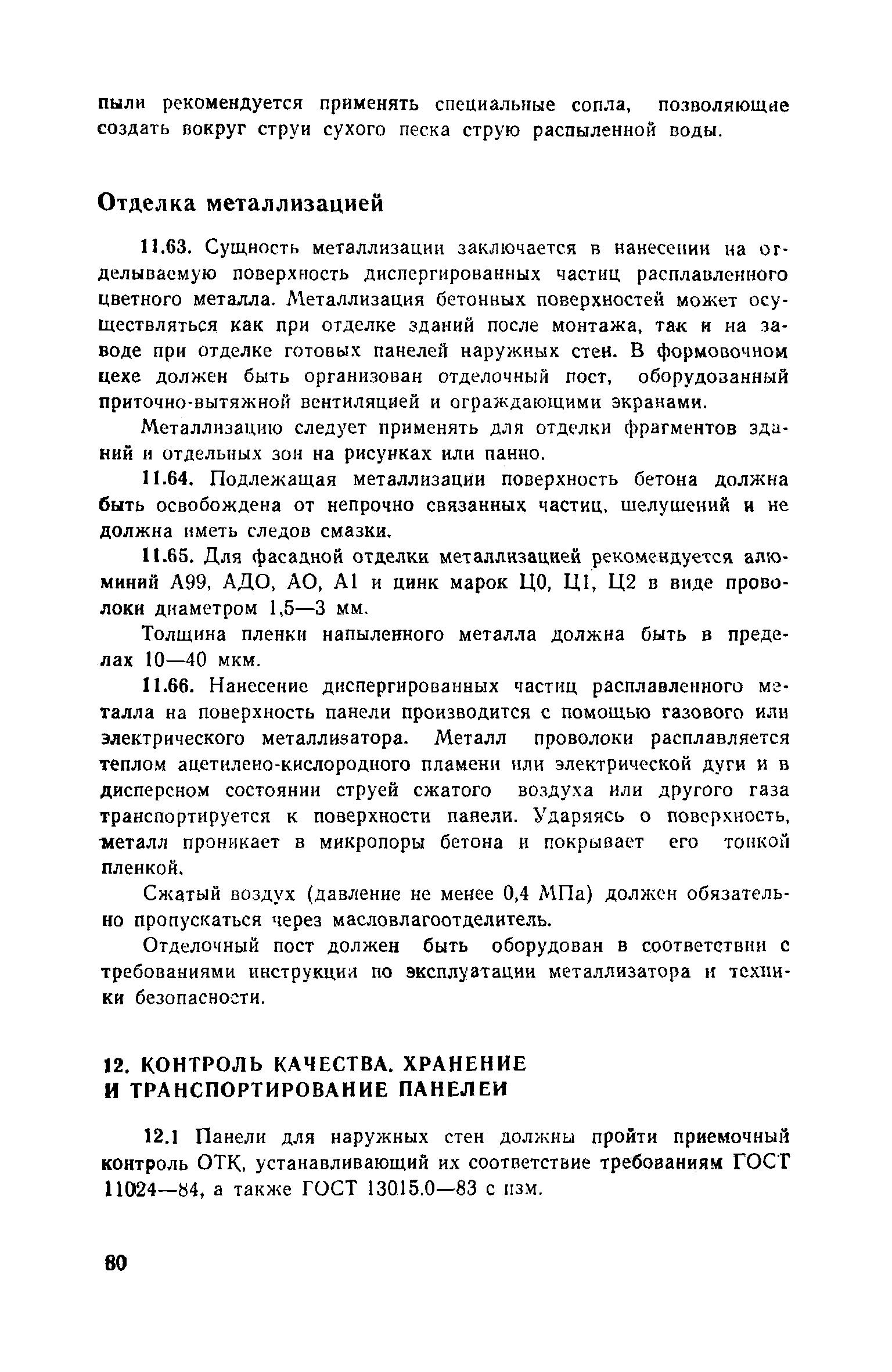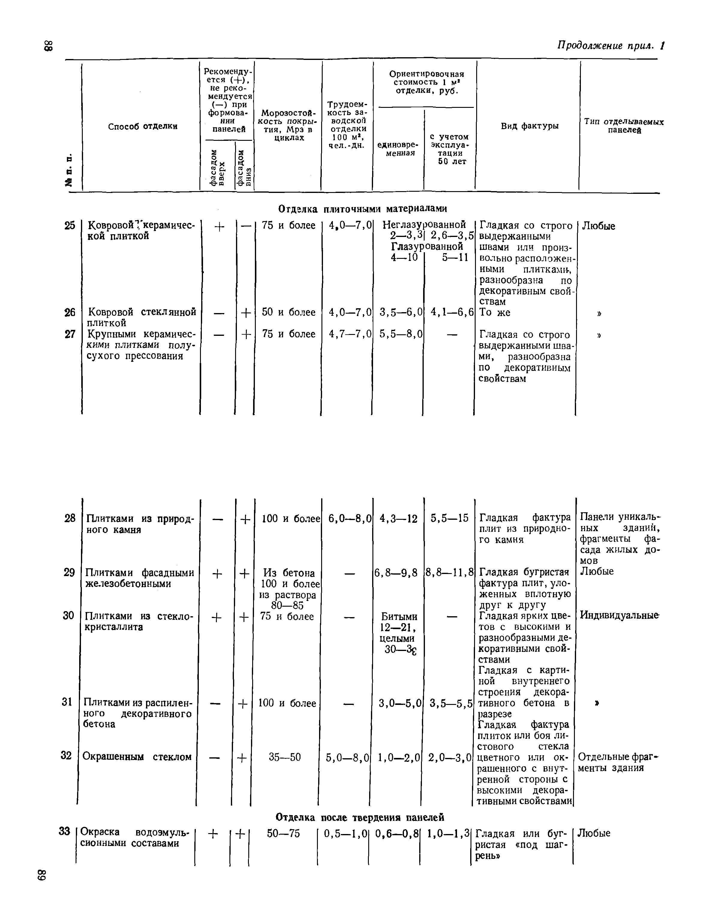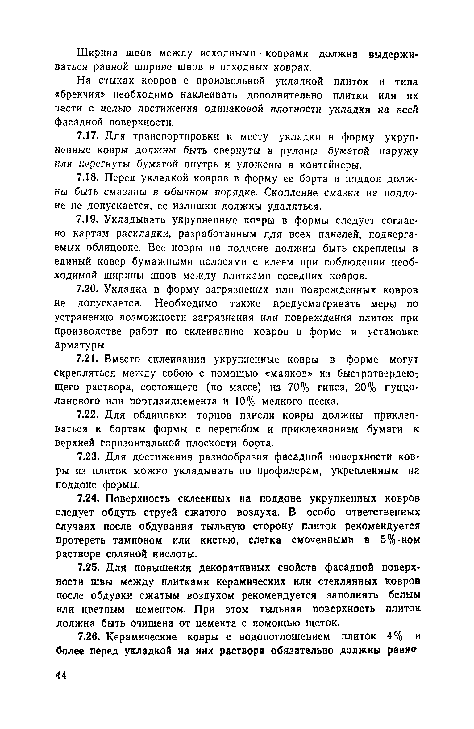 | Оглавление: | 1. Общие положения 2. Материалы для фасадной отделки и требования к ним 3. Архитектурно-технологические принципы выбора видов отделки 4. Отделка декоративным бетоном с обнажением заполнителя Общие рекомендации Подбор состава и приготовление декоративной бетонной смеси Обнажение крупного заполнителя распыленной водой Обнажение крупного заполнителя с применением замедлителей твердения цемента Использование замедлителей твердения в коврах Нанесение замедлителей твердения на формующие поверхности формы Нанесение замедлителей твердения на верхнюю поверхность свежеотформованных панелей 5. Отделка декоративными цементными растворами Общие рекомендации Отделка при формовании панелей фасадной поверхностью вниз Рельефная отделка Отделка при формовании панелей фасадной поверхностью вверх Отделка при формовании панелей фасадной поверхностью вверх или вниз Отделка по трафаретам Отделка коллоидно-цементными клеями или растворами Отделка материалом "Белгородский белый" 6. Отделка щебнем или гравием способом присыпки или втапливания 7. Отделка плитками из искусственных материалов Общие рекомендации Отделка ковровой керамiiческой и стеклянной плиткой Изготовление ковров силами предприятий крупнопанельного домостроения (КПД) Отделка крупными керамическими плитками полусухого прессования Отделка плитками из распиленного декоративного бетона Отделка плитами фасадными железобетонными Отделка плитками из стеклокристаллита Отделка окрашенным стеклом 8. Отделка плитками из природного камня 9. Комбинированная отделка 10. Отделка многоцветными керамическими глазурями и эмалями 11. Отделка по затвердевшему бетону Отделка водоэмульсионным окрасочным составом Отделка эмалями КО-174 Отделка декоративной крошкой по клеящей основе Отделка набрызгом Отделка механической обработкой поверхности Отделка металлизацией 12. Контроль качества. Хранение и транспортирование панелей Приложение 1. Перечень способов фасадной отделки Приложение 2. Перечень основных промышленных месторождений цветного камня Приложение 3. Изготовление бетонных архитектурных вставок и форм для них Приложение 4. Технология отделки железобетонных изделий с помощью стальных матриц Приложение 5. Технология отделки изделий с помощью рельефообразующих матриц с полимерным рабочим слоем Приложение 6. Технология изготовления рельефообразующих матриц заливочных паст Приложение 7. Технология отделки железобетонных изделий с помощью стеклопластиковых матриц Приложение 8. Технология отделки железобетонных изделий с помощью резиновых матриц Приложение 9. Технология отделки железобетонных изделий с помощью матриц из листовых термопластичных материалов Приложение 10. Технико-экономические показатели рельефообразующих матриц, применяемых на заводах КПД Приложение 11. Технико-экономические показатели опытно-промышленного образца вибросмесителя Приложение 12. Устройство и работа поточно-конвейерной линии глазурования стеновых панелей |
