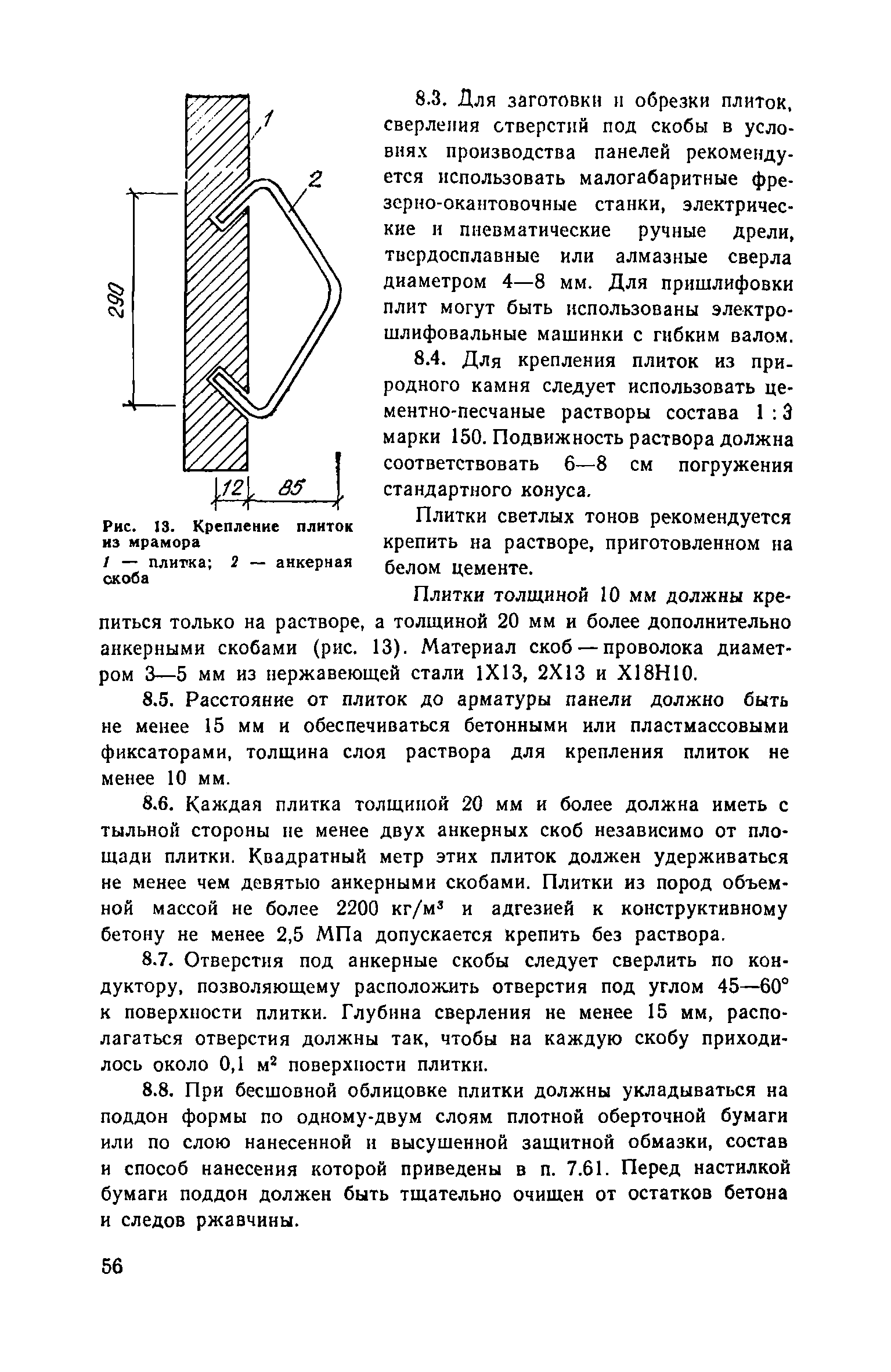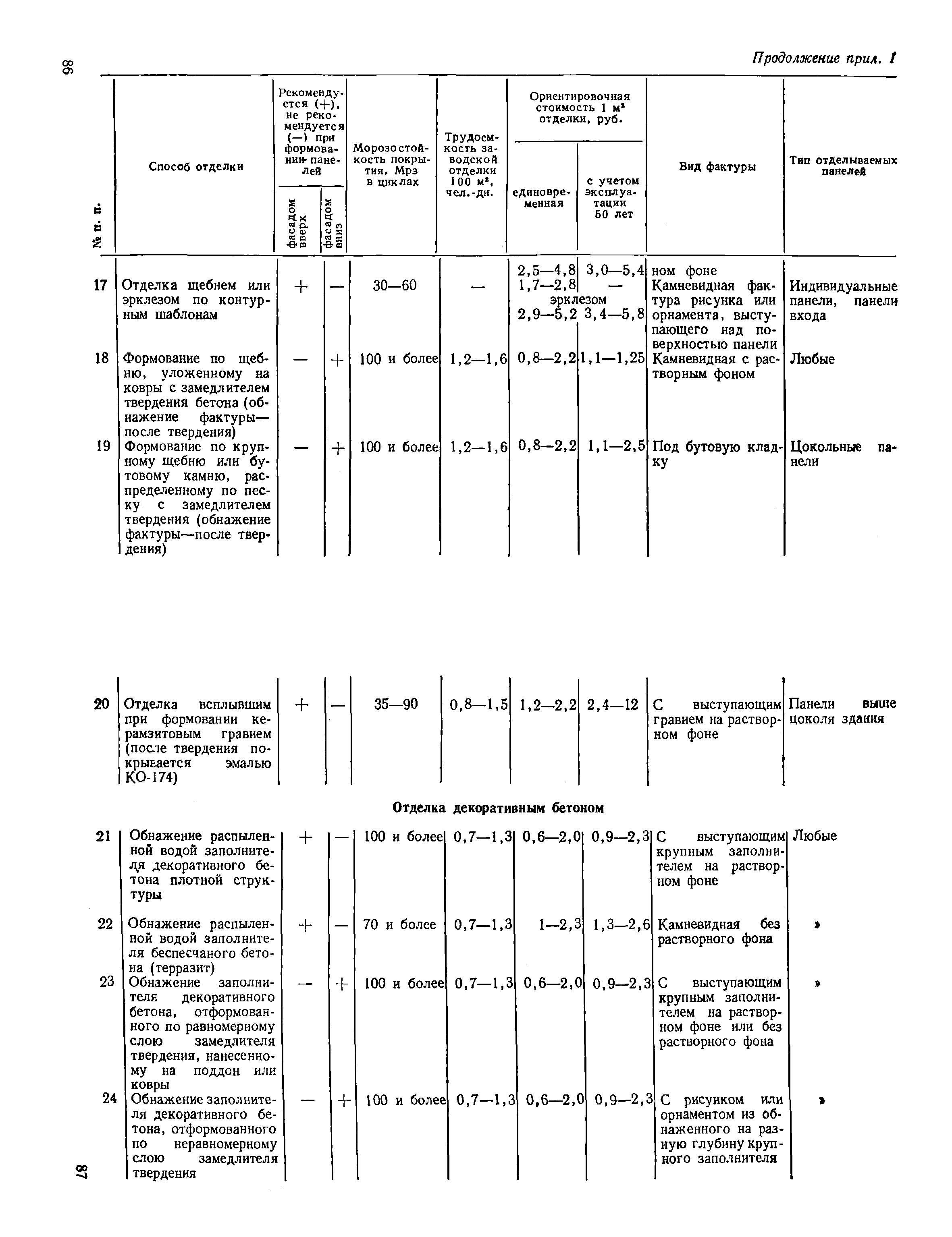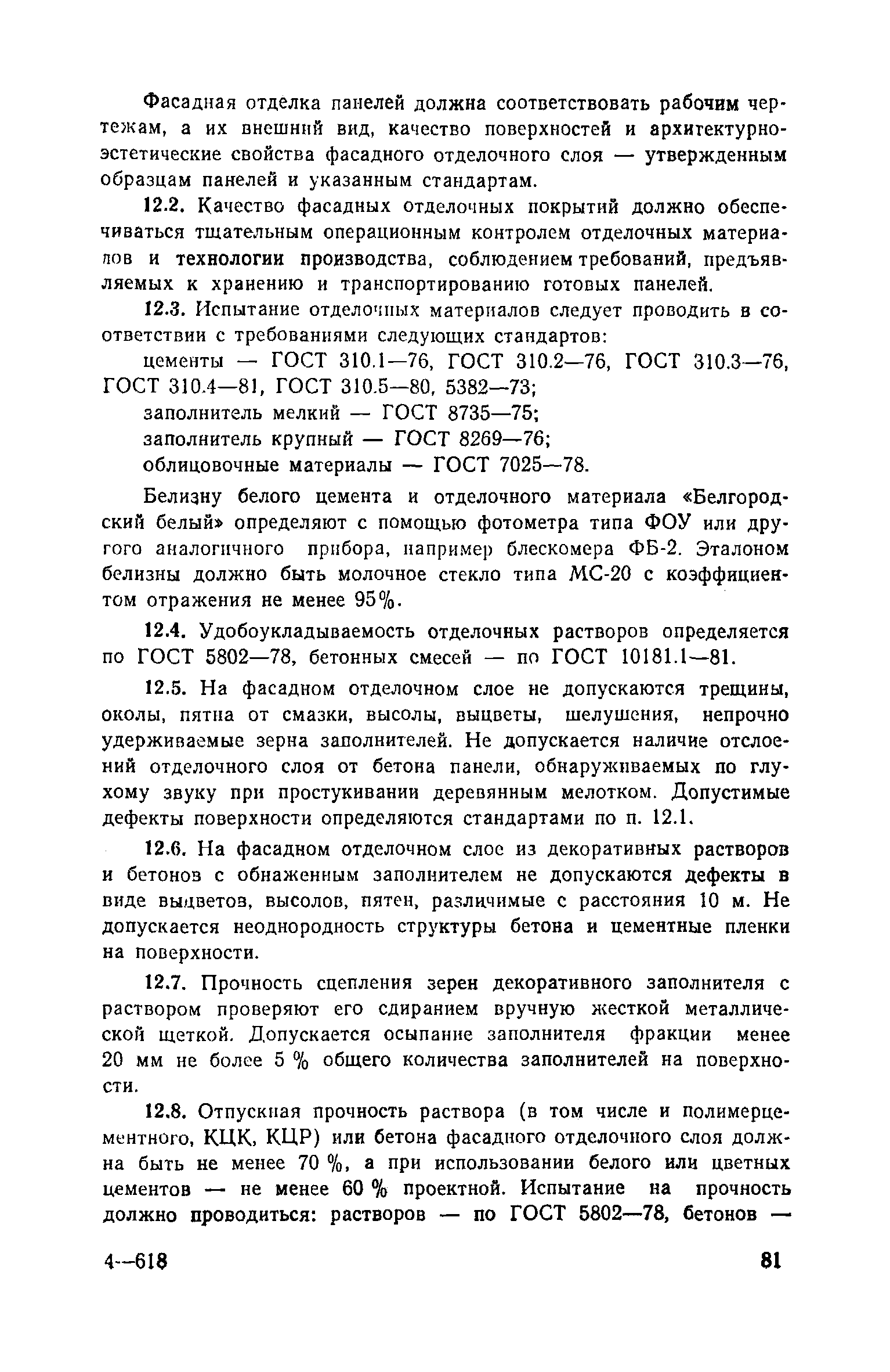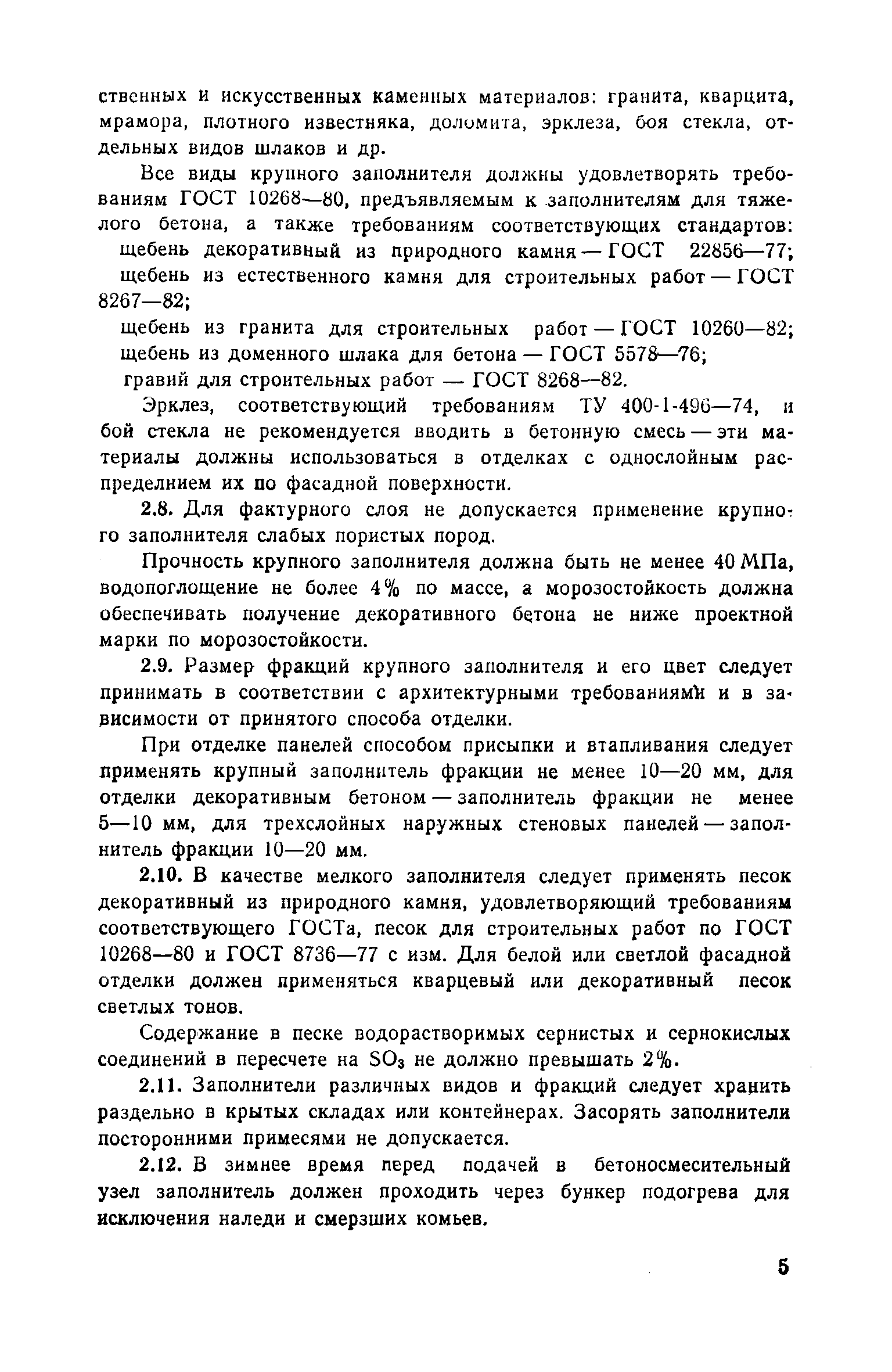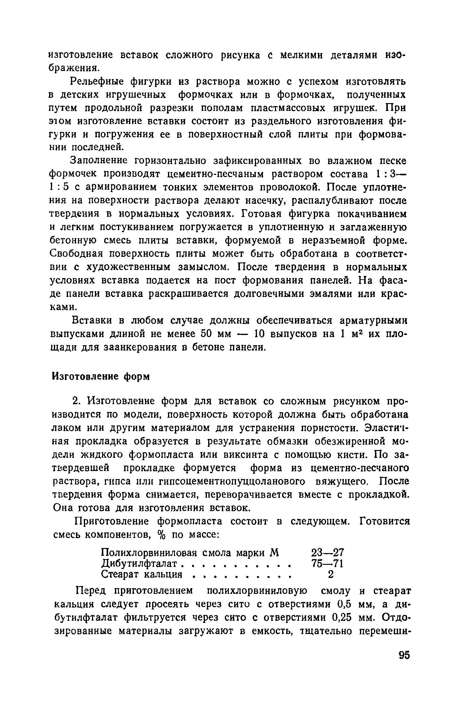 | Оглавление: | 1. Общие положения 2. Материалы для фасадной отделки и требования к ним 3. Архитектурно-технологические принципы выбора видов отделки 4. Отделка декоративным бетоном с обнажением заполнителя Общие рекомендации Подбор состава и приготовление декоративной бетонной смеси Обнажение крупного заполнителя распыленной водой Обнажение крупного заполнителя с применением замедлителей твердения цемента Использование замедлителей твердения в коврах Нанесение замедлителей твердения на формующие поверхности формы Нанесение замедлителей твердения на верхнюю поверхность свежеотформованных панелей 5. Отделка декоративными цементными растворами Общие рекомендации Отделка при формовании панелей фасадной поверхностью вниз Рельефная отделка Отделка при формовании панелей фасадной поверхностью вверх Отделка при формовании панелей фасадной поверхностью вверх или вниз Отделка по трафаретам Отделка коллоидно-цементными клеями или растворами Отделка материалом "Белгородский белый" 6. Отделка щебнем или гравием способом присыпки или втапливания 7. Отделка плитками из искусственных материалов Общие рекомендации Отделка ковровой керамiiческой и стеклянной плиткой Изготовление ковров силами предприятий крупнопанельного домостроения (КПД) Отделка крупными керамическими плитками полусухого прессования Отделка плитками из распиленного декоративного бетона Отделка плитами фасадными железобетонными Отделка плитками из стеклокристаллита Отделка окрашенным стеклом 8. Отделка плитками из природного камня 9. Комбинированная отделка 10. Отделка многоцветными керамическими глазурями и эмалями 11. Отделка по затвердевшему бетону Отделка водоэмульсионным окрасочным составом Отделка эмалями КО-174 Отделка декоративной крошкой по клеящей основе Отделка набрызгом Отделка механической обработкой поверхности Отделка металлизацией 12. Контроль качества. Хранение и транспортирование панелей Приложение 1. Перечень способов фасадной отделки Приложение 2. Перечень основных промышленных месторождений цветного камня Приложение 3. Изготовление бетонных архитектурных вставок и форм для них Приложение 4. Технология отделки железобетонных изделий с помощью стальных матриц Приложение 5. Технология отделки изделий с помощью рельефообразующих матриц с полимерным рабочим слоем Приложение 6. Технология изготовления рельефообразующих матриц заливочных паст Приложение 7. Технология отделки железобетонных изделий с помощью стеклопластиковых матриц Приложение 8. Технология отделки железобетонных изделий с помощью резиновых матриц Приложение 9. Технология отделки железобетонных изделий с помощью матриц из листовых термопластичных материалов Приложение 10. Технико-экономические показатели рельефообразующих матриц, применяемых на заводах КПД Приложение 11. Технико-экономические показатели опытно-промышленного образца вибросмесителя Приложение 12. Устройство и работа поточно-конвейерной линии глазурования стеновых панелей |