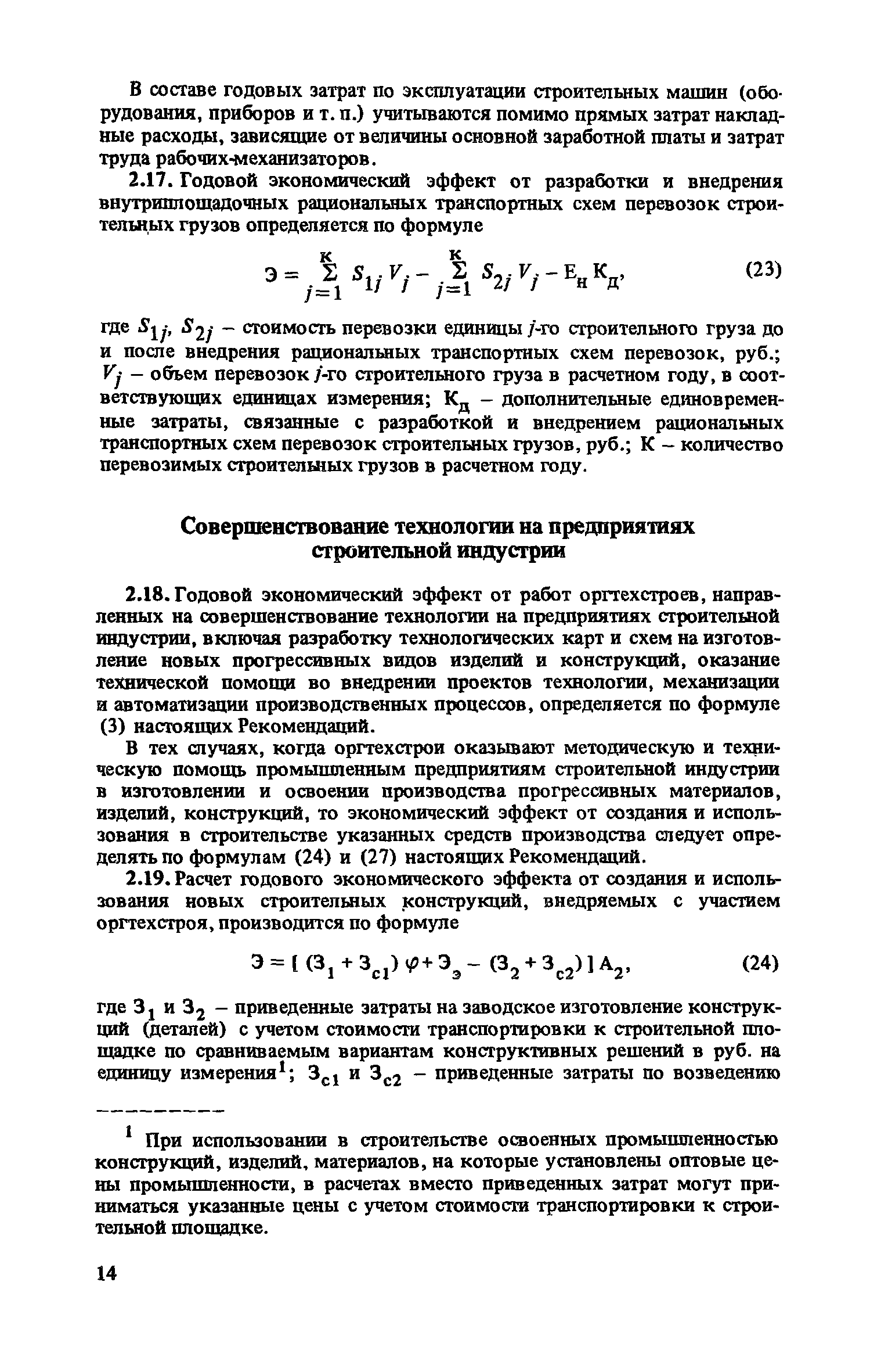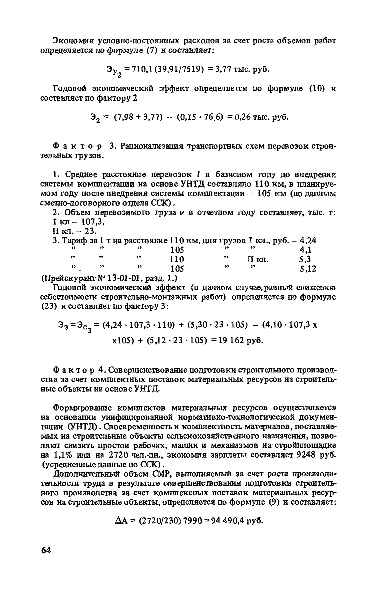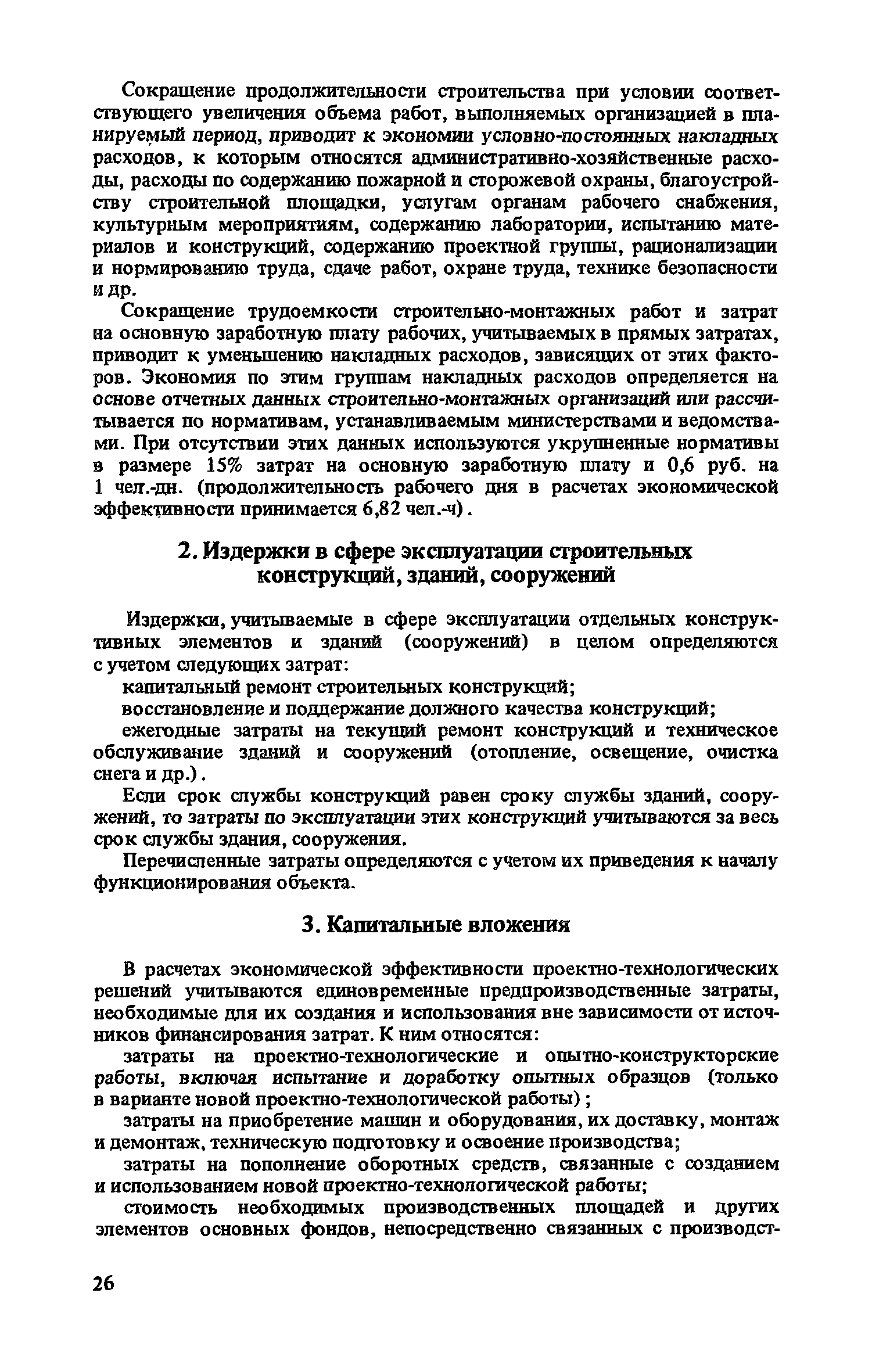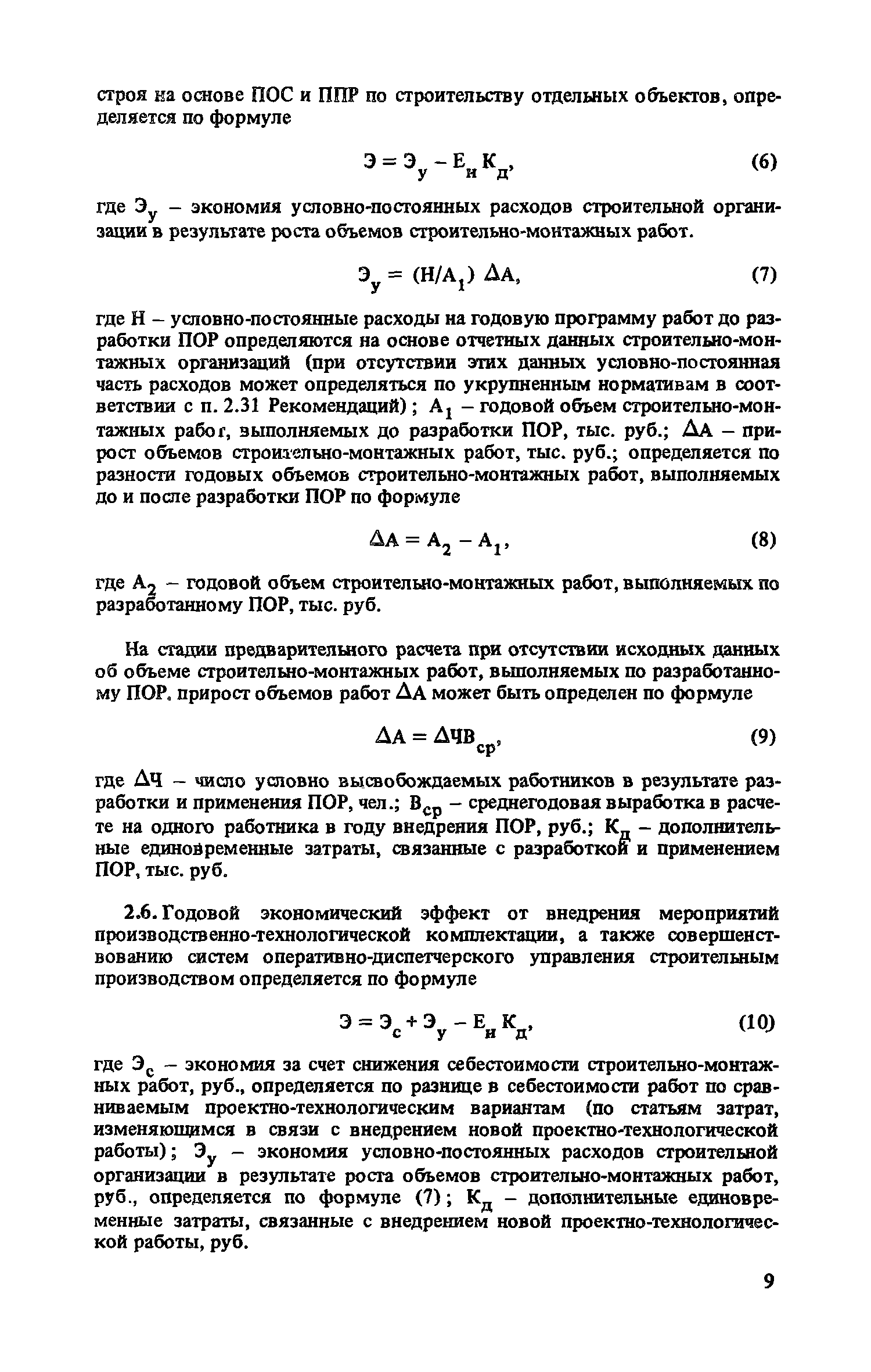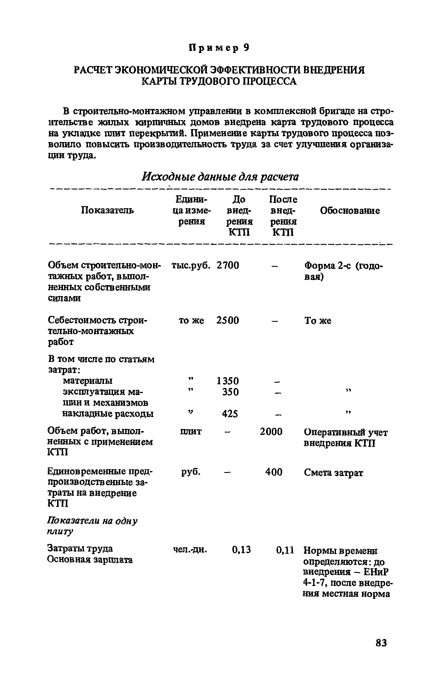 Рекомендации по определению экономической эффективности работ, выполняемых проектно-технологическими трестами (институтами) "Оргтехстрой" ("Оргстрой")| Статус: | не действует | | Название рус.: | Рекомендации по определению экономической эффективности работ, выполняемых проектно-технологическими трестами (институтами) "Оргтехстрой" ("Оргстрой") | | Дата добавления в базу: | 01.09.2013 | | Дата актуализации: | 01.01.2021 | | Область применения: | Документ содержит методы и порядок расчета показателей для оценки экономической эффективности разработок оргтехстроев, внедряемых в строительных организациях и на промышленных предприятиях строительной индустрии с их участием. Изложена методика определения показателей: экономии от снижения себестоимости строительно-монтажных работ (продукции промышленных предприятий стройиндустрии), экономии материальных затрат и относительного высвобождения работников в обслуживаемых организациях и предприятиях в результате внедрения разработок оргстроев. Приводятся примеры расчетов экономической эффективности от внедрения отдельных проектно-технологических работ | | Оглавление: | Раздел 1. Общие положения Раздел 2. Методы определения годового экономического эффекта по отдельным направлениям работы оргтехстроев Раздел 3. Определение показателей экономии от снижения себестоимости строительно-монтажных работ (продукции промышленных предприятий стройиндустрии), экономии материальных затрат и относительного высвобождения работников в обслуживаемых организациях и на предприятиях в результате внедрения разработок оргтехстроев Приложение 1. Коэффициенты приведения по фактору времени Приложение 2. Коэффициенты реновации Приложение 3. Определение основных показателей, используемых в расчетах экономической эффективности Приложение 4. Примеры расчетов Пример 1. Расчет экономической эффективности внедрения ПНР на строительство жилого дома серии “Мобиль” Пример 2. Расчет экономической эффективности применения ПНР, предусматривающего внедрение поточно-совмещенного метода при монтаже технологического оборудования Пример 3. Расчет экономической эффективности разработки НОС с применением узлового метода проектирования, подготовки, организации и управления строительством Пример 4. Расчет экономической эффективности внедрения нового технологического процесса - электротермообработки бетона стыков сборных железобетонных конструкций Пример 5. Расчет экономической эффективности применения технологии возведения монолитных ядер жесткости с применением циклично-переставной опалубки Пример 6. Расчет экономической эффективности внедрения новой технологии сварочных работ Пример 7. Расчет экономического эффекта применения прогрессивного метода организации строительного производства - контейнерной доставки раскроенного оконного стекла с базы комплектации к объекту строительства Пример 8. Расчет экономической эффективности комплектных поставок основных строительных материалов на основе УНТД при строительстве объектов сельскохозяйственного назначения Пример 9. Расчет экономической эффективности внедрения карты трудового процесса Пример 10. Расчет экономической эффективности применения бригадного подряда в строительной организации Пример 11. Расчет экономической эффективности примене