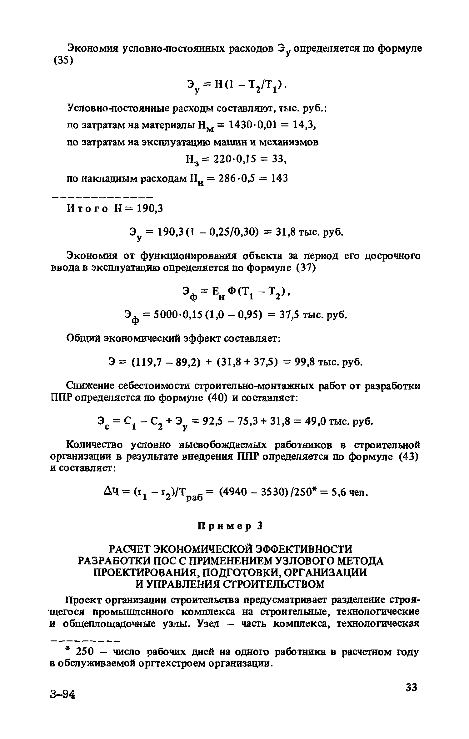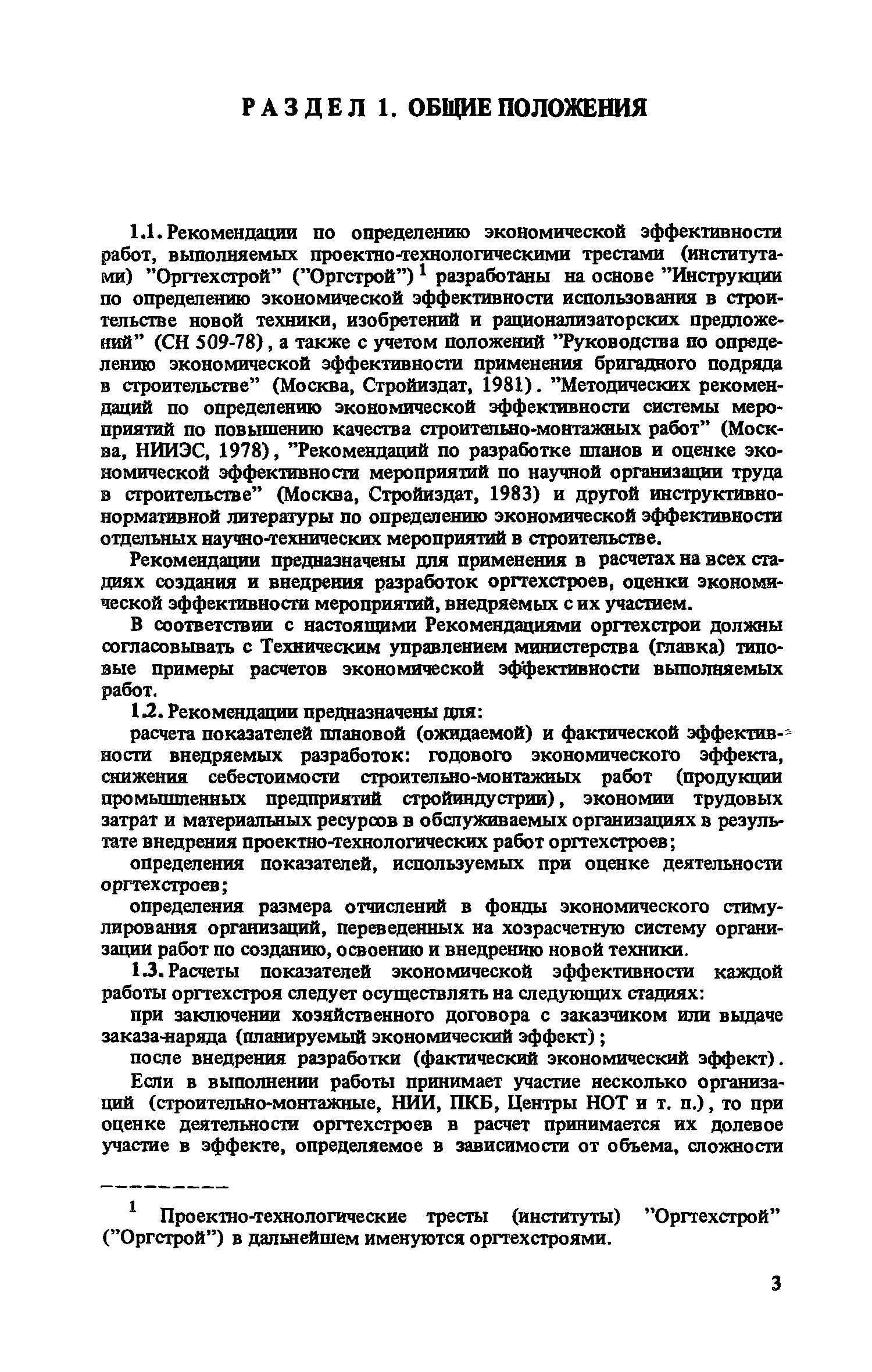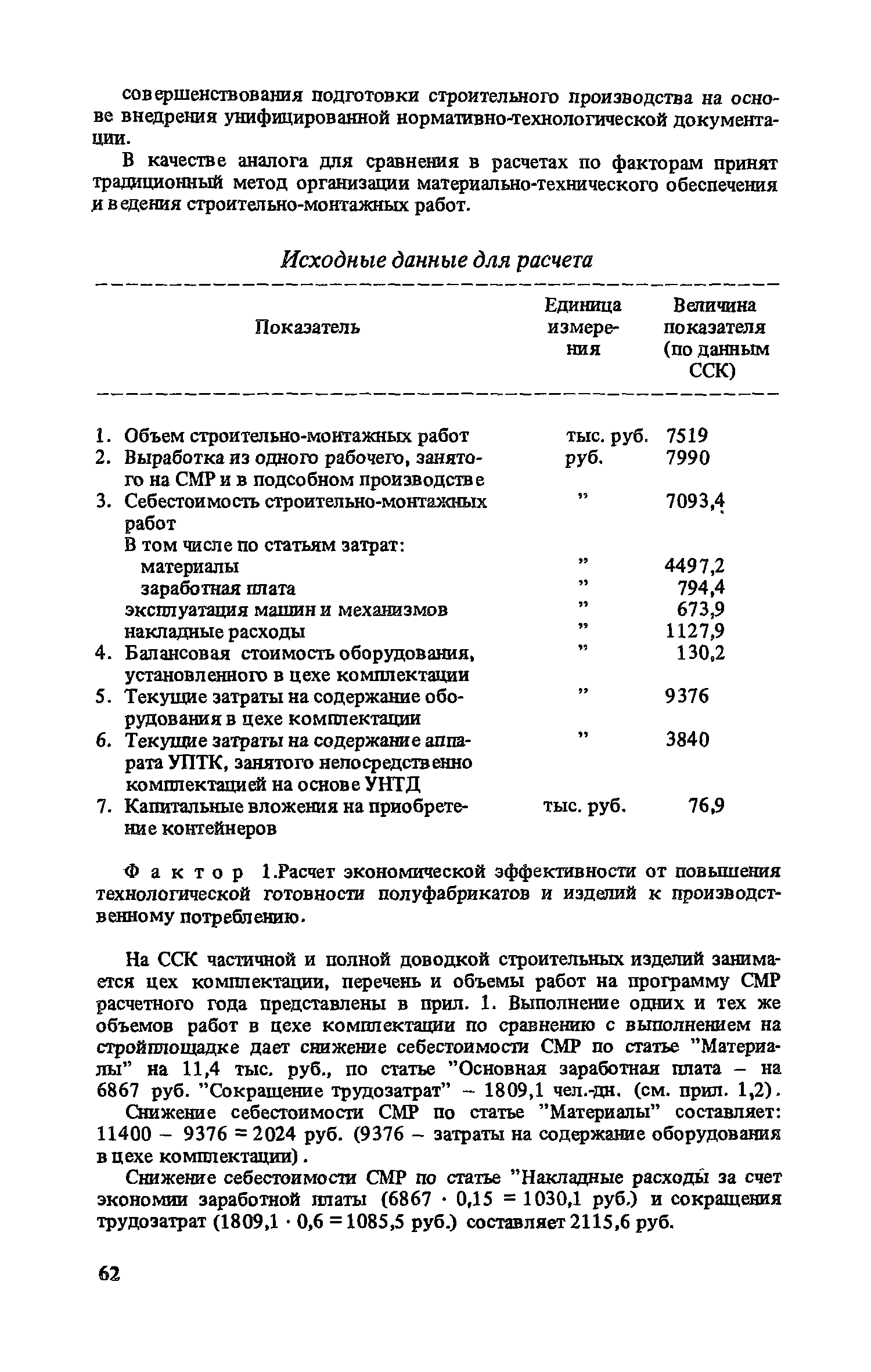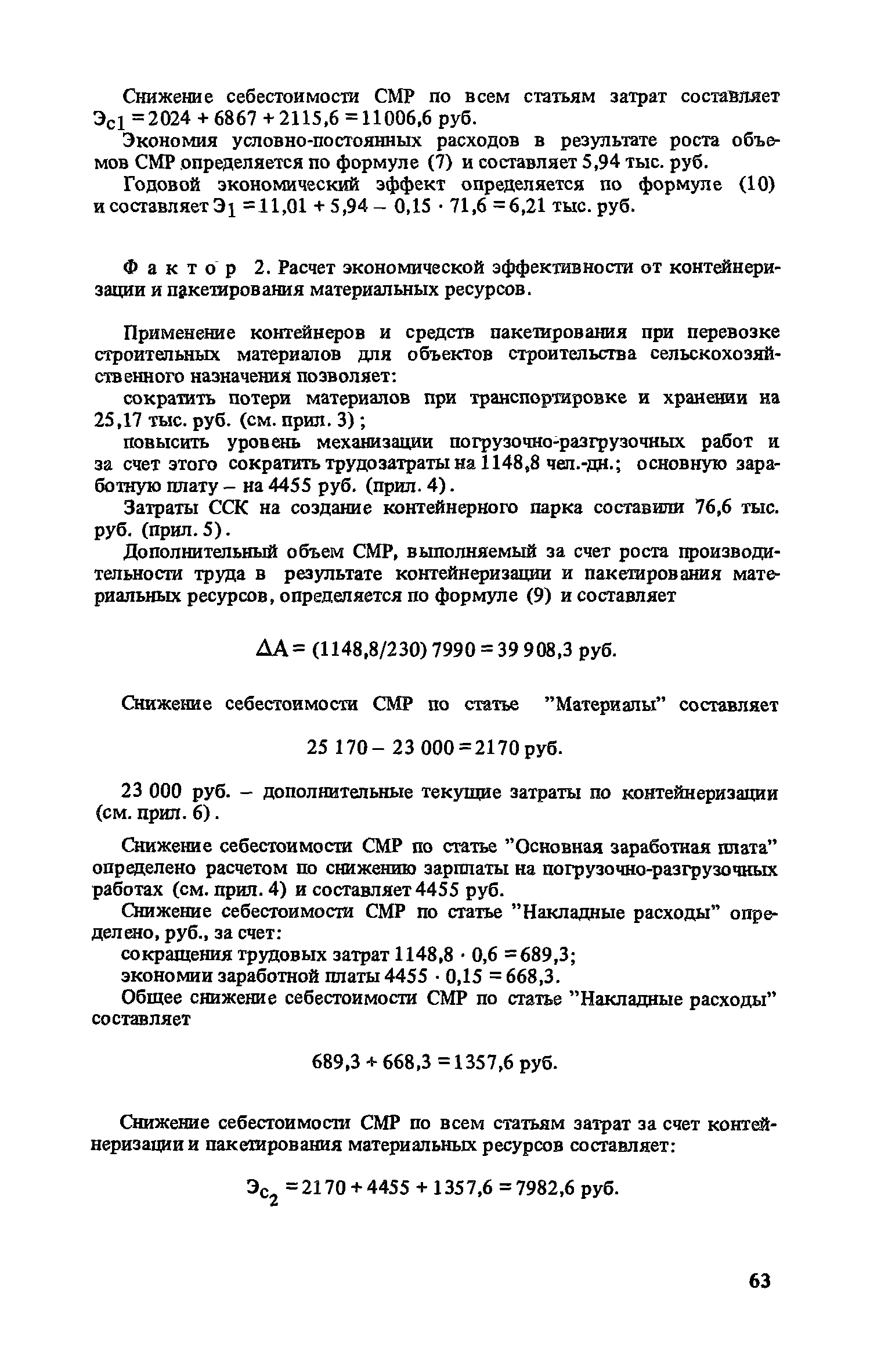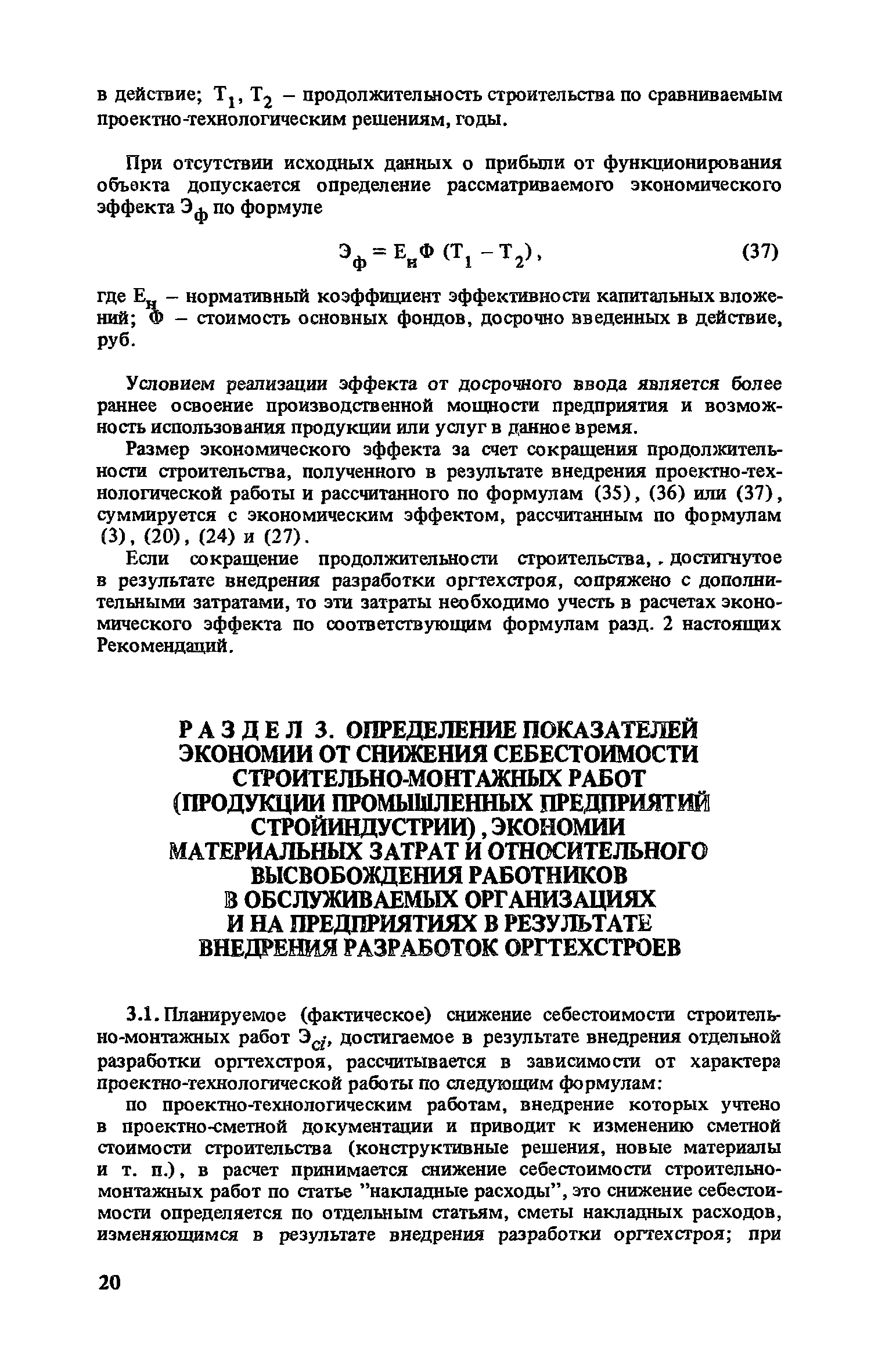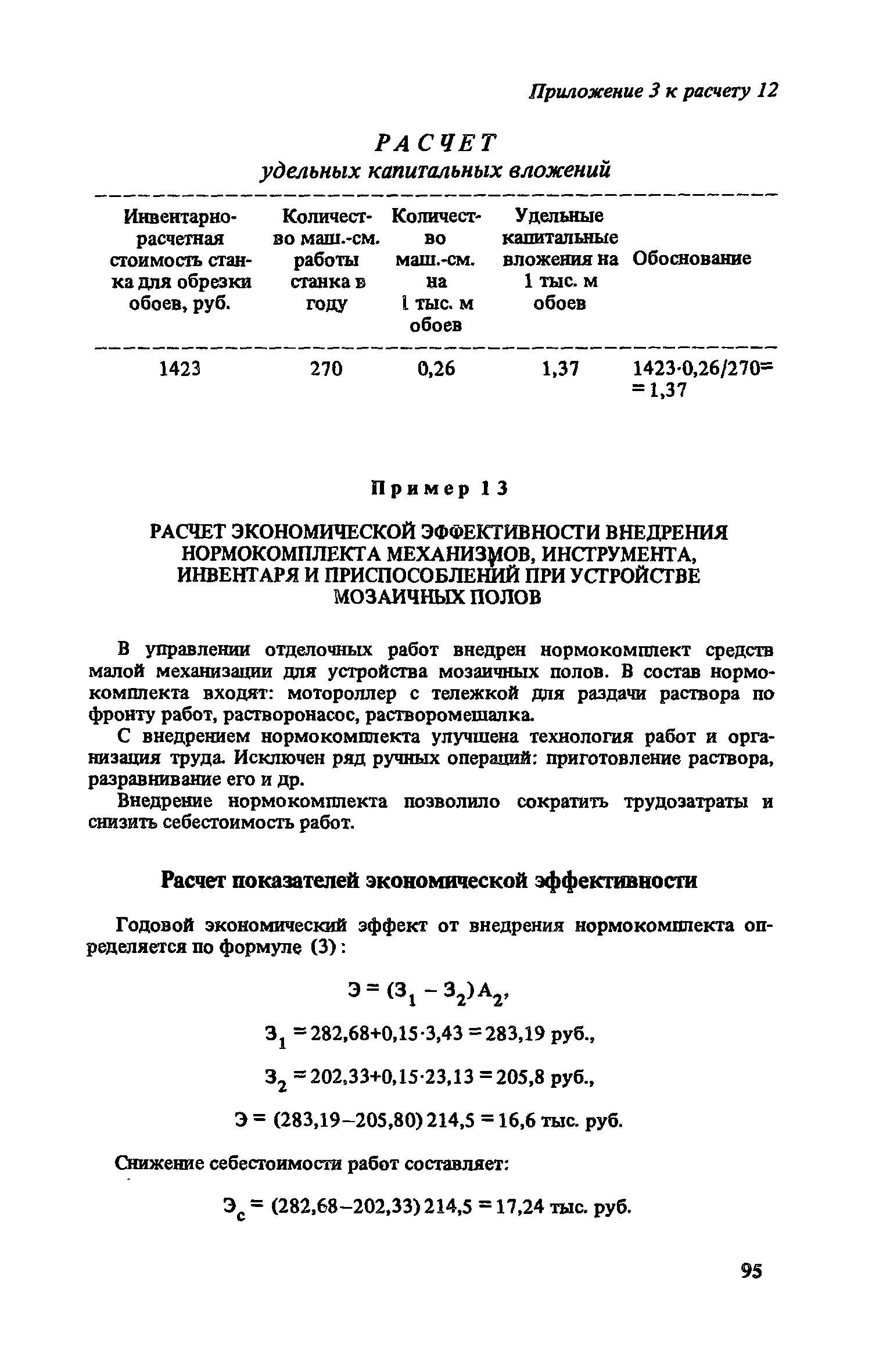 Рекомендации по определению экономической эффективности работ, выполняемых проектно-технологическими трестами (институтами) "Оргтехстрой" ("Оргстрой")| Статус: | не действует | | Название рус.: | Рекомендации по определению экономической эффективности работ, выполняемых проектно-технологическими трестами (институтами) "Оргтехстрой" ("Оргстрой") | | Дата добавления в базу: | 01.09.2013 | | Дата актуализации: | 01.01.2021 | | Область применения: | Документ содержит методы и порядок расчета показателей для оценки экономической эффективности разработок оргтехстроев, внедряемых в строительных организациях и на промышленных предприятиях строительной индустрии с их участием. Изложена методика определения показателей: экономии от снижения себестоимости строительно-монтажных работ (продукции промышленных предприятий стройиндустрии), экономии материальных затрат и относительного высвобождения работников в обслуживаемых организациях и предприятиях в результате внедрения разработок оргстроев. Приводятся примеры расчетов экономической эффективности от внедрения отдельных проектно-технологических работ | | Оглавление: | Раздел 1. Общие положения Раздел 2. Методы определения годового экономического эффекта по отдельным направлениям работы оргтехстроев Раздел 3. Определение показателей экономии от снижения себестоимости строительно-монтажных работ (продукции промышленных предприятий стройиндустрии), экономии материальных затрат и относительного высвобождения работников в обслуживаемых организациях и на предприятиях в результате внедрения разработок оргтехстроев Приложение 1. Коэффициенты приведения по фактору времени Приложение 2. Коэффициенты реновации Приложение 3. Определение основных показателей, используемых в расчетах экономической эффективности Приложение 4. Примеры расчетов Пример 1. Расчет экономической эффективности внедрения ПНР на строительство жилого дома серии “Мобиль” Пример 2. Расчет экономической эффективности применения ПНР, предусматривающего внедрение поточно-совмещенного метода при монтаже технологического оборудования Пример 3. Расчет экономической эффективности разработки НОС с применением узлового метода проектирования, подготовки, организации и управления строительством Пример 4. Расчет экономической эффективности внедрения нового технологического процесса - электротермообработки бетона стыков сборных железобетонных конструкций Пример 5. Расчет экономической эффективности применения технологии возведения монолитных ядер жесткости с применением циклично-переставной опалубки Пример 6. Расчет экономической эффективности внедрения новой технологии сварочных работ Пример 7. Расчет экономического эффекта применения прогрессивного метода организации строительного производства - контейнерной доставки раскроенного оконного стекла с базы комплектации к объекту строительства Пример 8. Расчет экономической эффективности комплектных поставок основных строительных материалов на основе УНТД при строительстве объектов сельскохозяйственного назначения Пример 9. Расчет экономической эффективности внедрения карты трудового процесса Пример 10. Расчет экономической эффективности применения бригадного подряда в строительной организации Пример 11. Расчет экономической эффективности примене