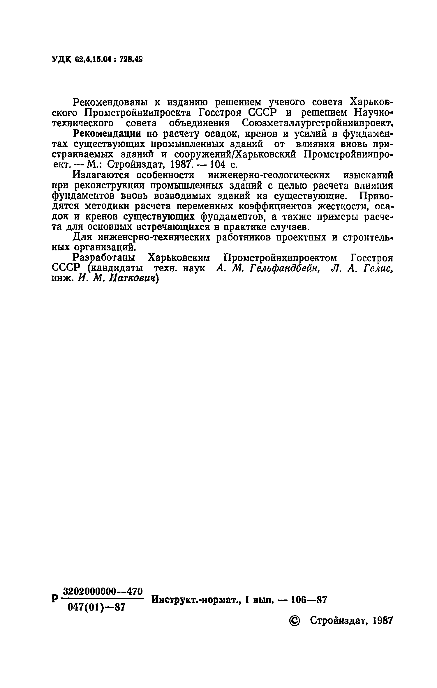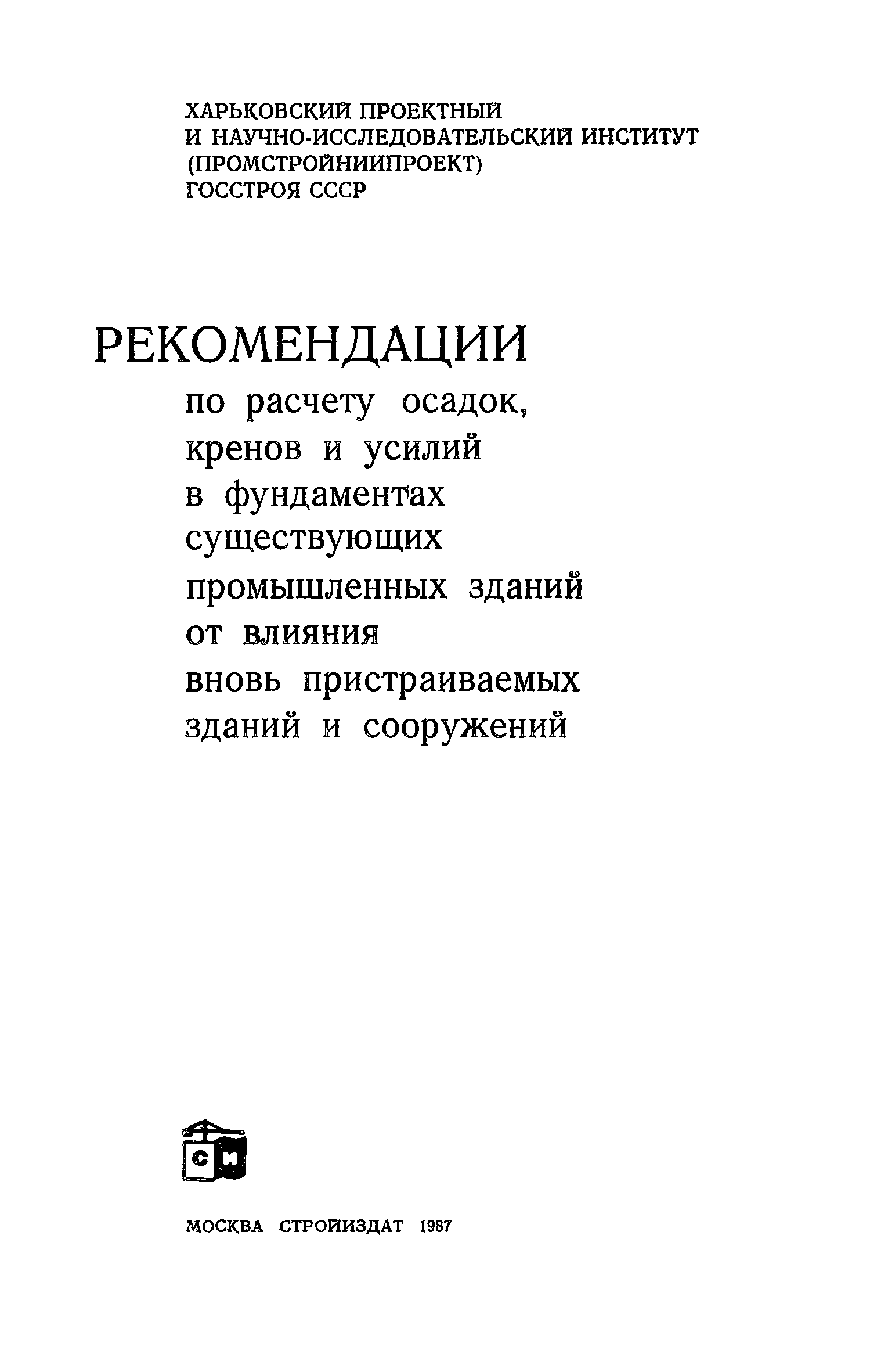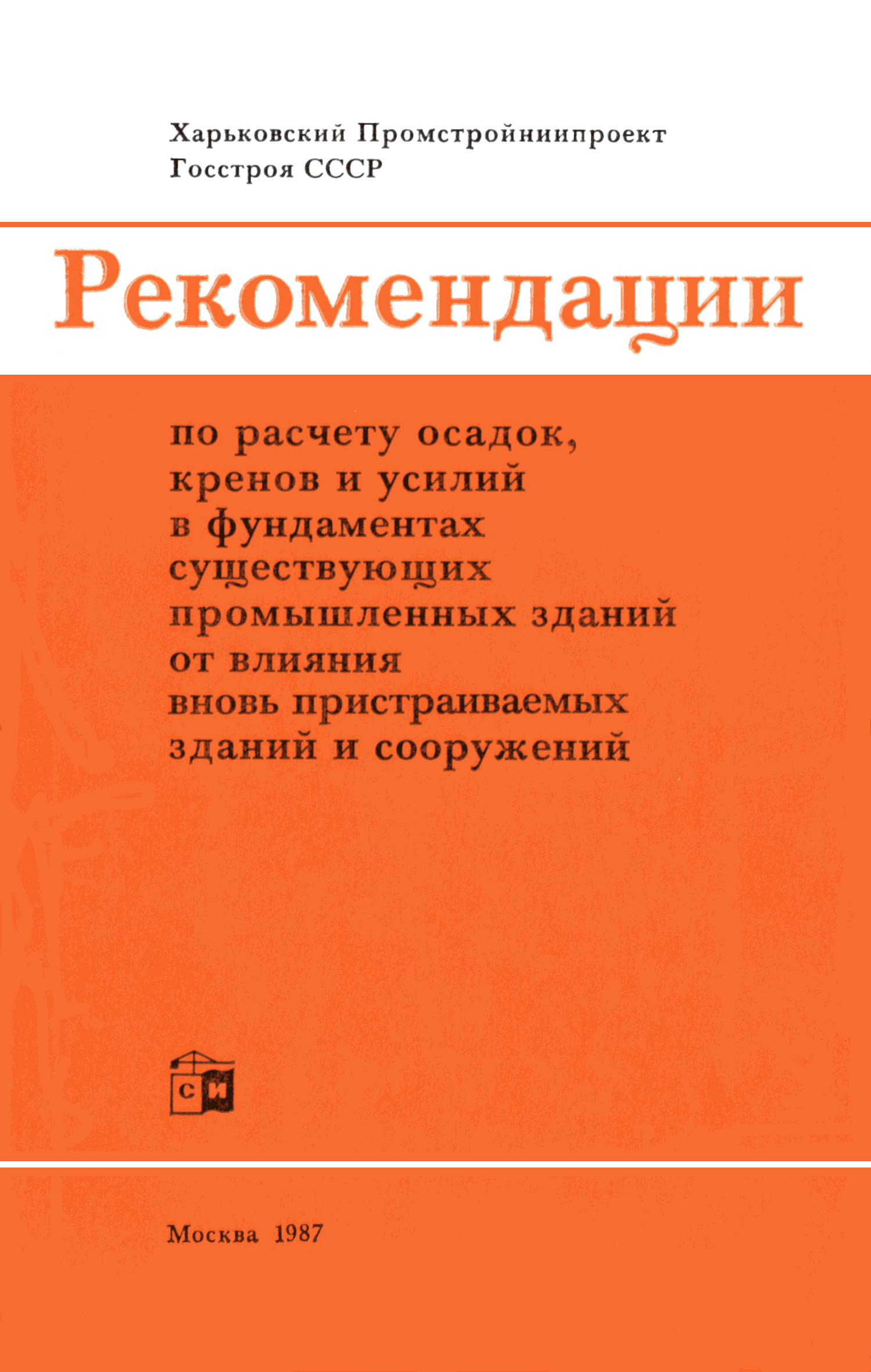 | Название рус.: | Рекомендации по расчету осадок, кренов и усилий в фундаментах существующих промышленных зданий от влияния вновь пристраиваемых зданий и сооружений |
