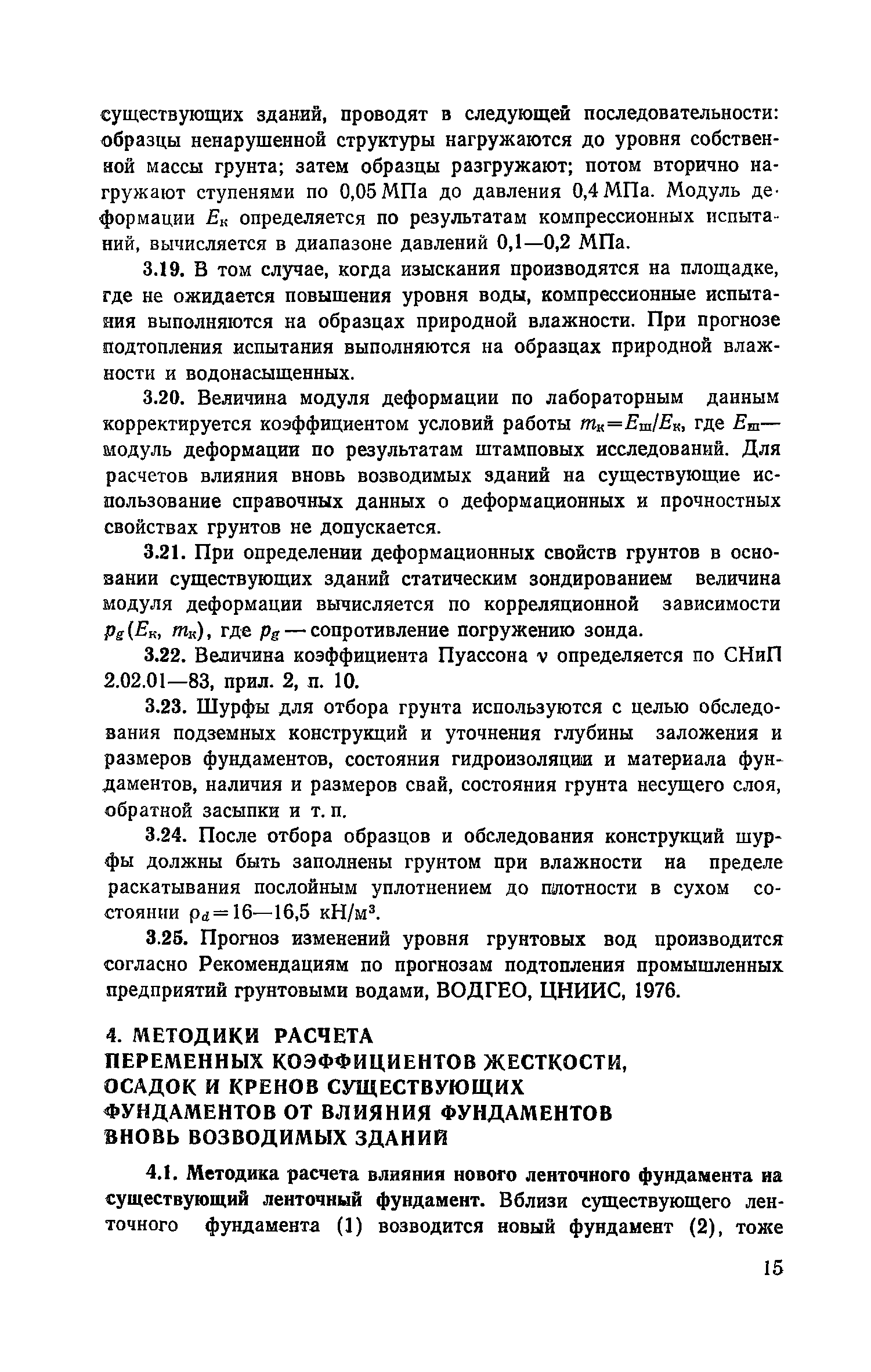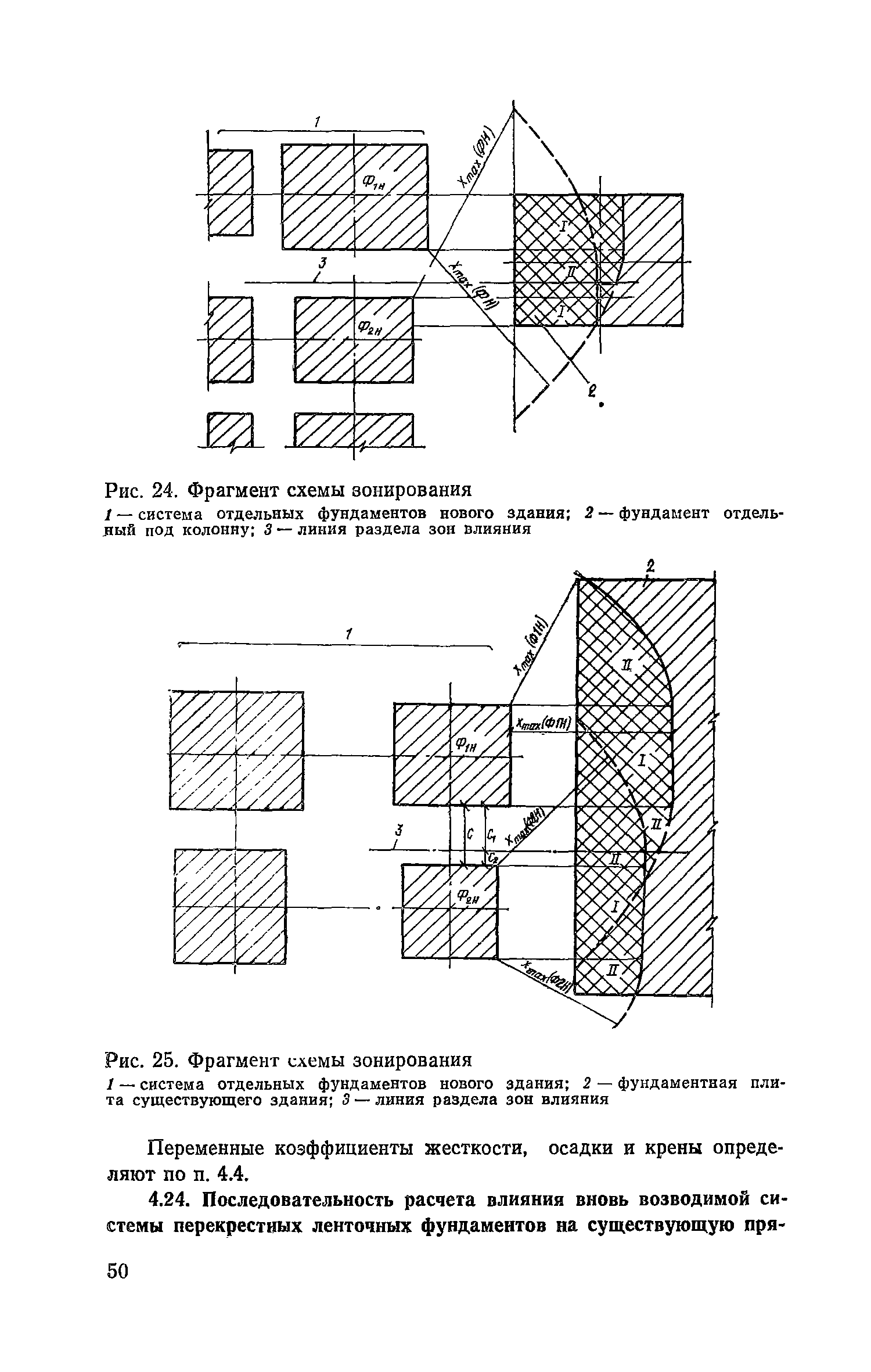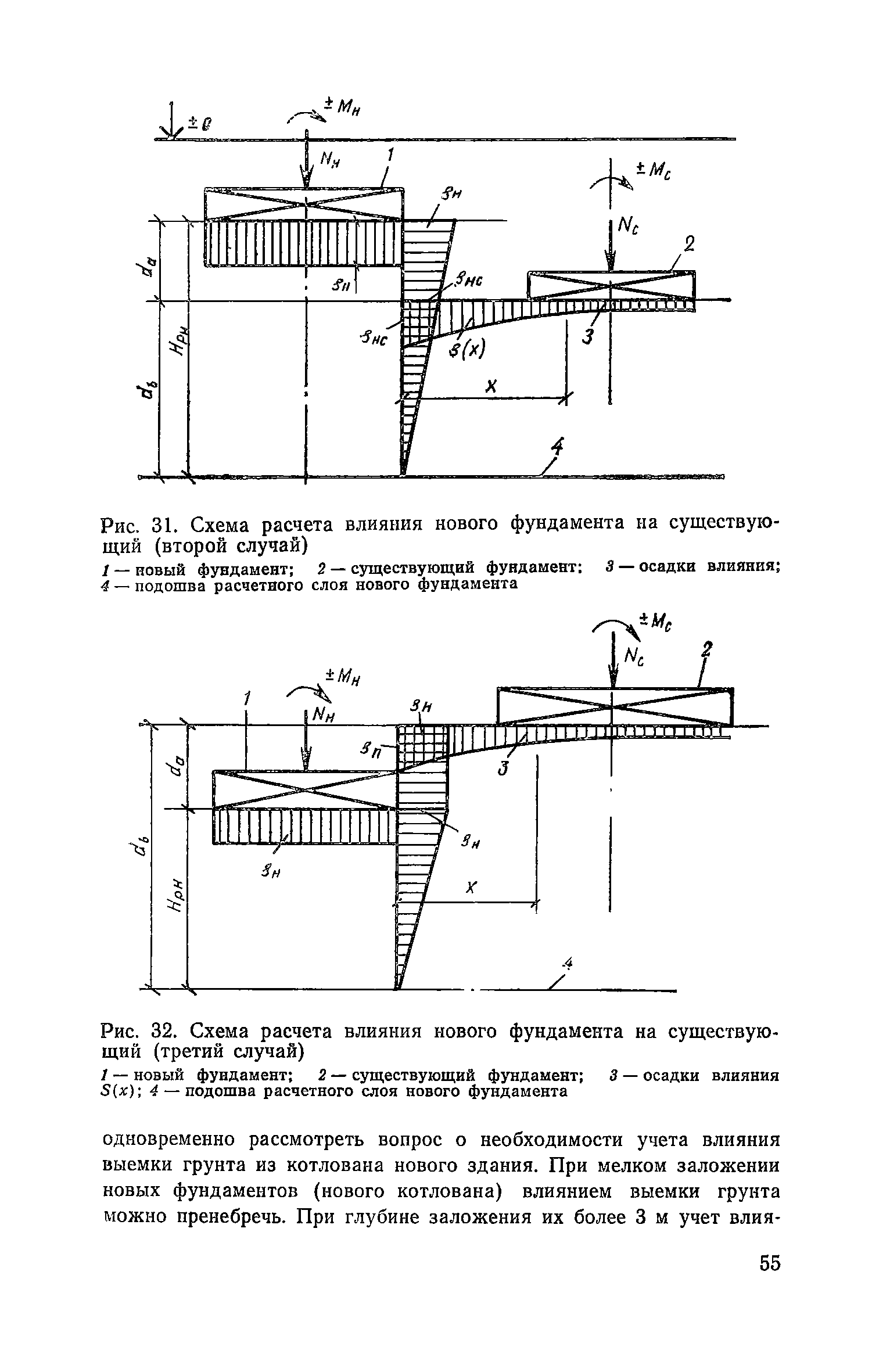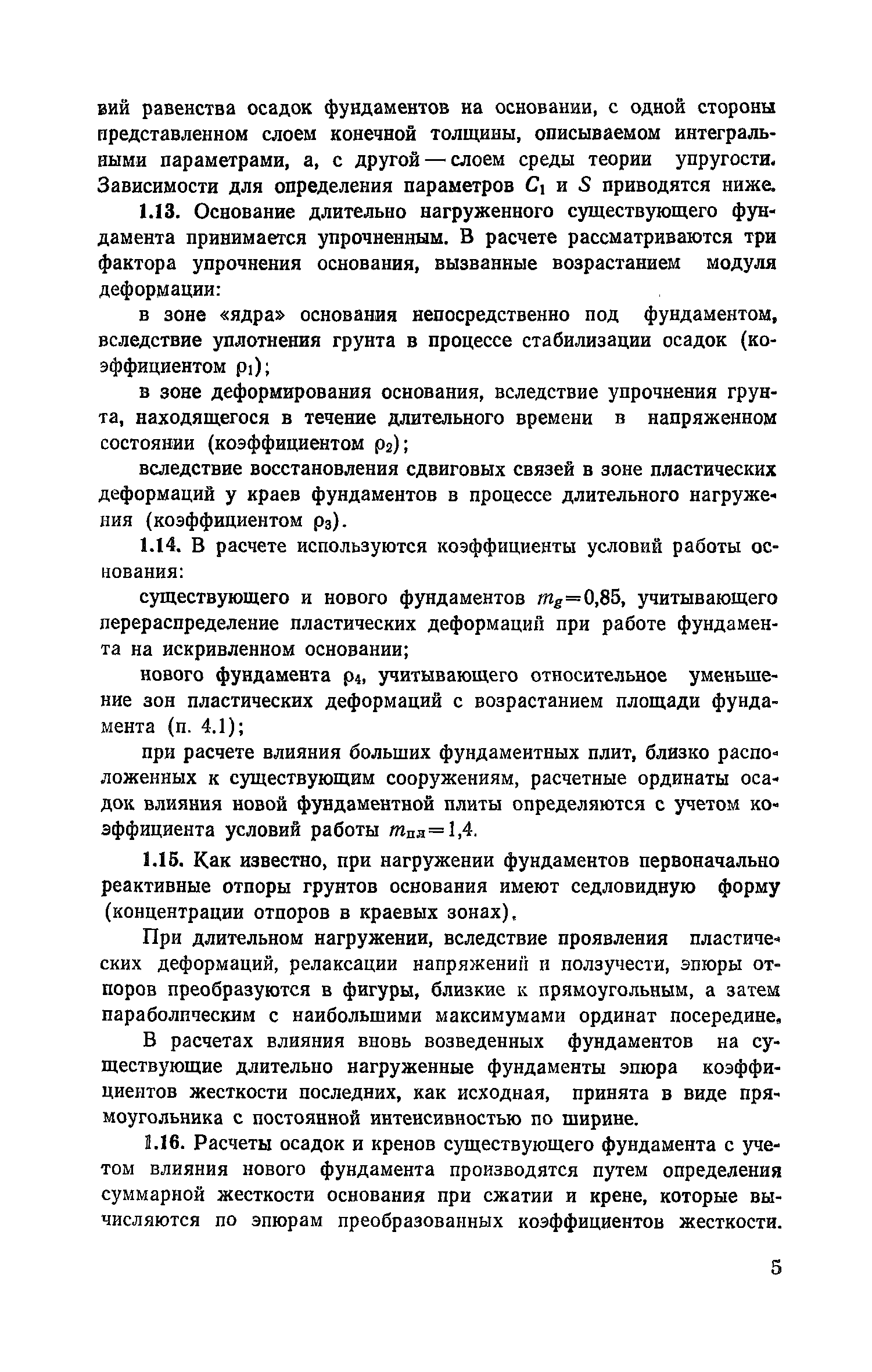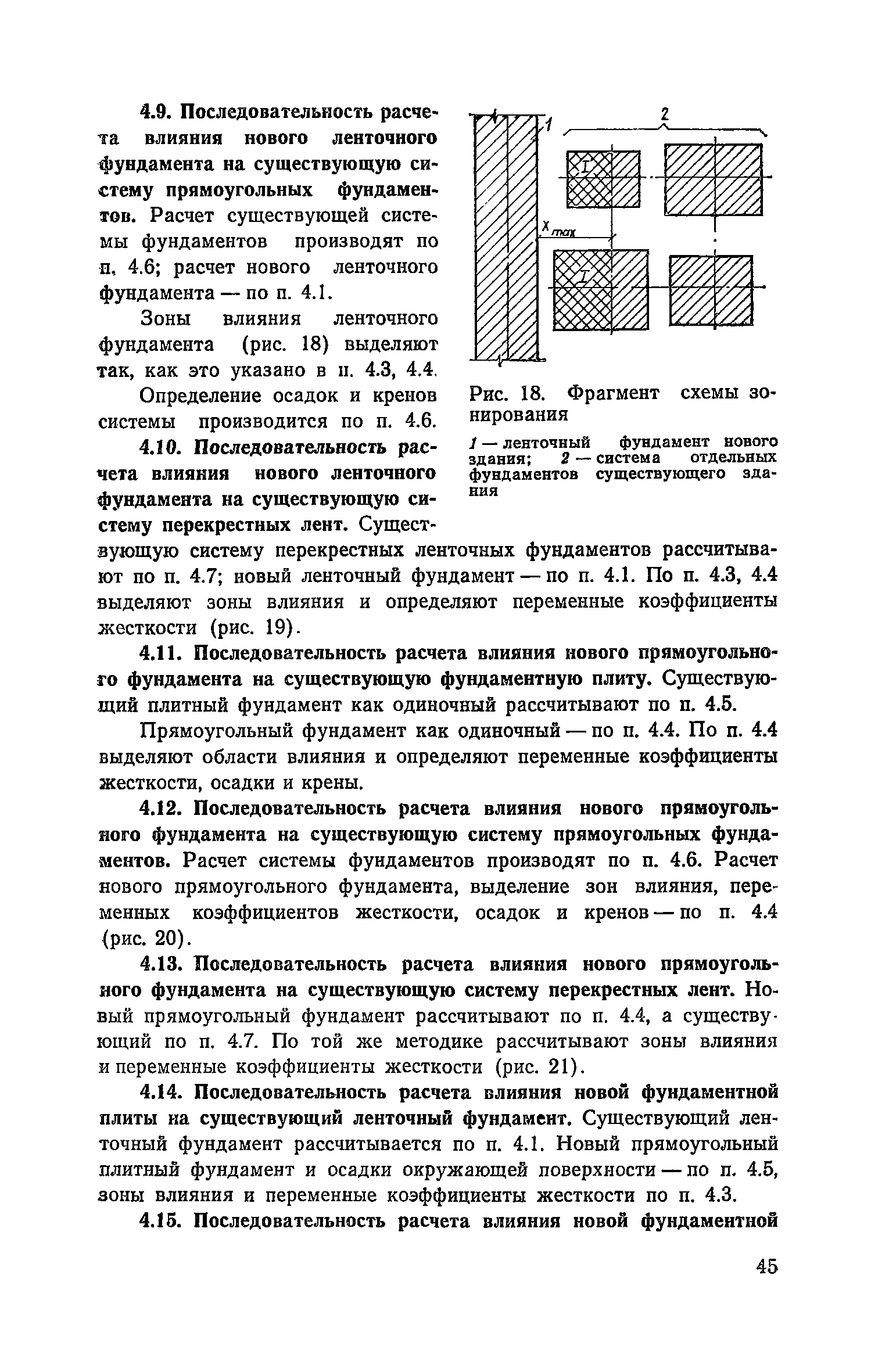| Оглавление: | 1. Основные положения рекомендаций по методике расчета 2. Типы существующих и новых фундаментов и их сочетания 3. Особенности инженерно-геологических изысканий при проектировании реконструкций промышленных зданий с целью расчета влияния фундаментов вновь возводимых зданий на существующие 4. Методики расчета переменных коэффициентов жесткости, осадок и кренов существующих фундаментов от влияния фундаментов вновь возводимых зданий 5. Учет различной глубины заложения при расчете влияния нового на существующий фундамент 6. Методика учета влияния выемки грунта котлована вновь возводимых сооружений на фундаменты существующих сооружений 7. Методика определения расчетных давлений на упрочненное основание при взаимном влиянии существующих и новых фундаментов зданий и сооружений Приложение 1. Примеры расчета Пример 1. Расчет влияния нового ленточного фундамента на существующий ленточный фундамент Пример 2. Расчет влияния нового прямоугольного фундамента на существующий прямоугольный; несоосное расположение Пример 3. Расчет влияния новой фундаментной плиты на существующую систему прямоугольных фундаментов каркасного здания Пример 4. Расчет влияния нового ленточного фундамента на существующий заглубленный ленточный фундамент Приложение 2. Таблицы коэффициента Кт для расчета осадок поверхности дискретного элемента основания от распределенной трапециевидной нагрузки Приложение 3. Величины структурной прочности глинистых грунтов в зависимости от коэффициента пористости и консистенции Приложение 4. Рекомендации по определению величин коэффициентов |
