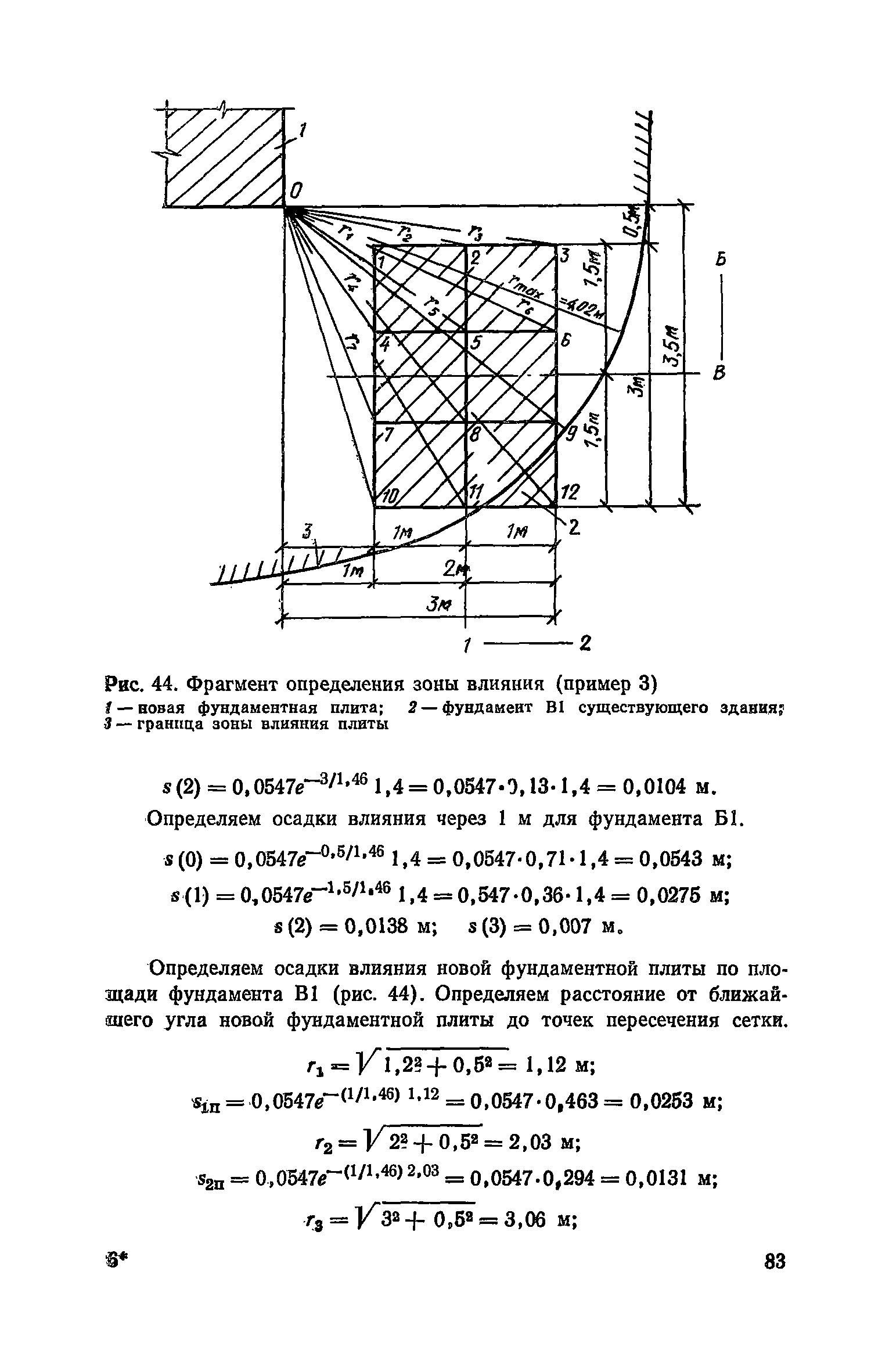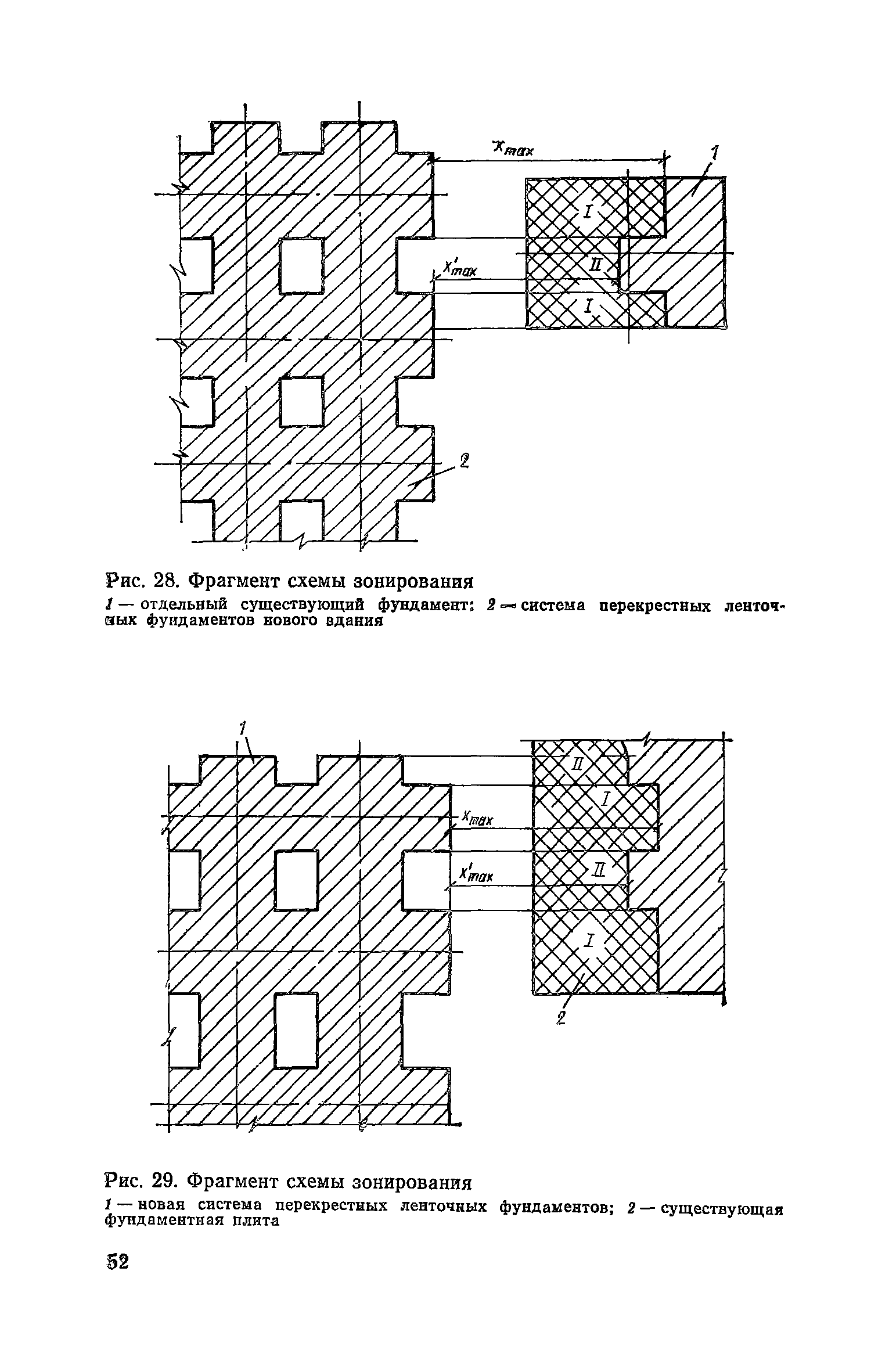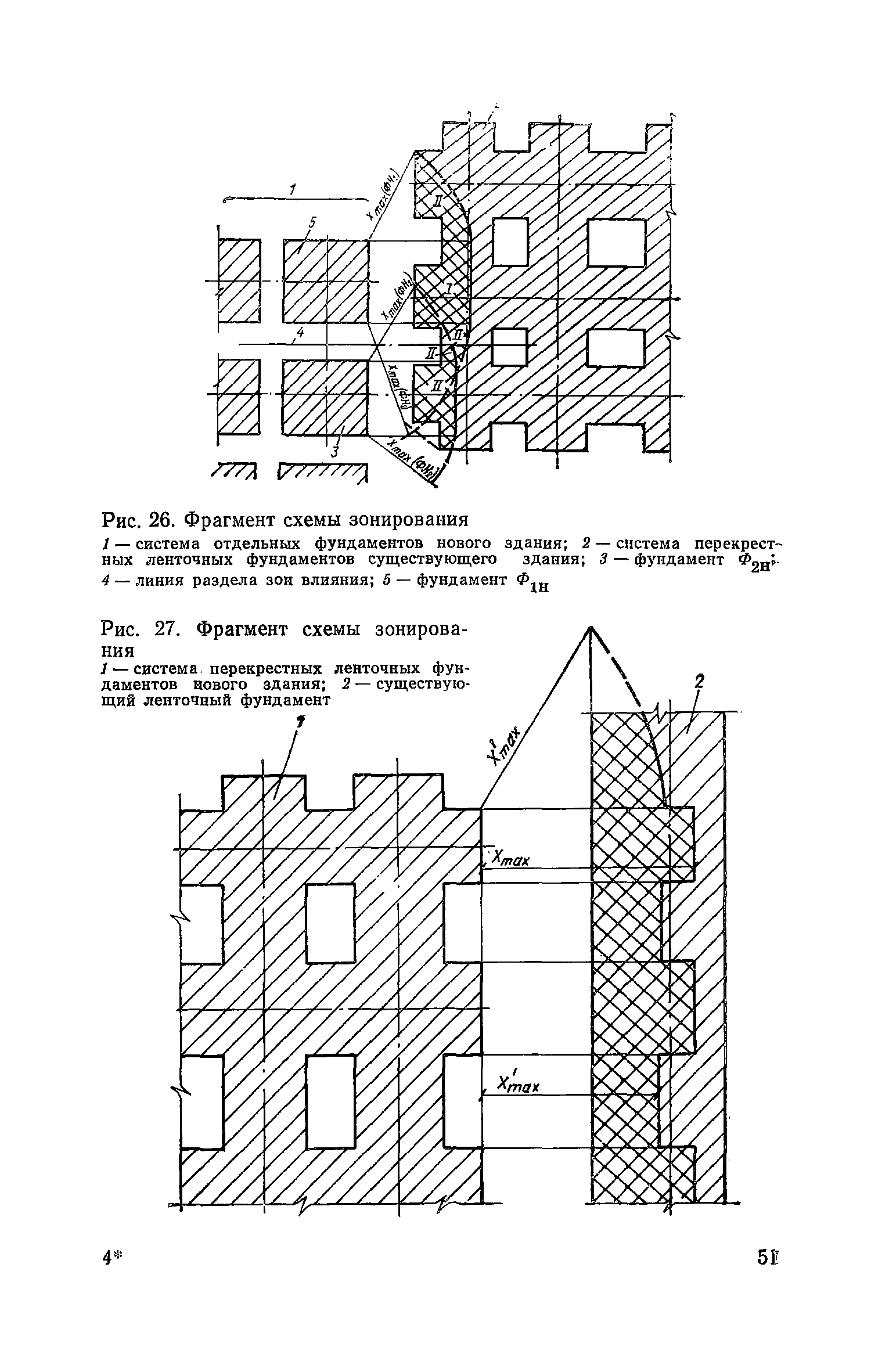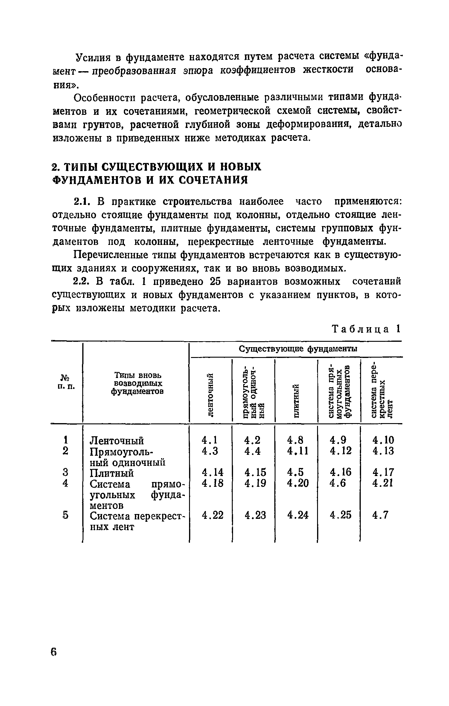 | Оглавление: | 1. Основные положения рекомендаций по методике расчета 2. Типы существующих и новых фундаментов и их сочетания 3. Особенности инженерно-геологических изысканий при проектировании реконструкций промышленных зданий с целью расчета влияния фундаментов вновь возводимых зданий на существующие 4. Методики расчета переменных коэффициентов жесткости, осадок и кренов существующих фундаментов от влияния фундаментов вновь возводимых зданий 5. Учет различной глубины заложения при расчете влияния нового на существующий фундамент 6. Методика учета влияния выемки грунта котлована вновь возводимых сооружений на фундаменты существующих сооружений 7. Методика определения расчетных давлений на упрочненное основание при взаимном влиянии существующих и новых фундаментов зданий и сооружений Приложение 1. Примеры расчета Пример 1. Расчет влияния нового ленточного фундамента на существующий ленточный фундамент Пример 2. Расчет влияния нового прямоугольного фундамента на существующий прямоугольный; несоосное расположение Пример 3. Расчет влияния новой фундаментной плиты на существующую систему прямоугольных фундаментов каркасного здания Пример 4. Расчет влияния нового ленточного фундамента на существующий заглубленный ленточный фундамент Приложение 2. Таблицы коэффициента Кт для расчета осадок поверхности дискретного элемента основания от распределенной трапециевидной нагрузки Приложение 3. Величины структурной прочности глинистых грунтов в зависимости от коэффициента пористости и консистенции Приложение 4. Рекомендации по определению величин коэффициентов |