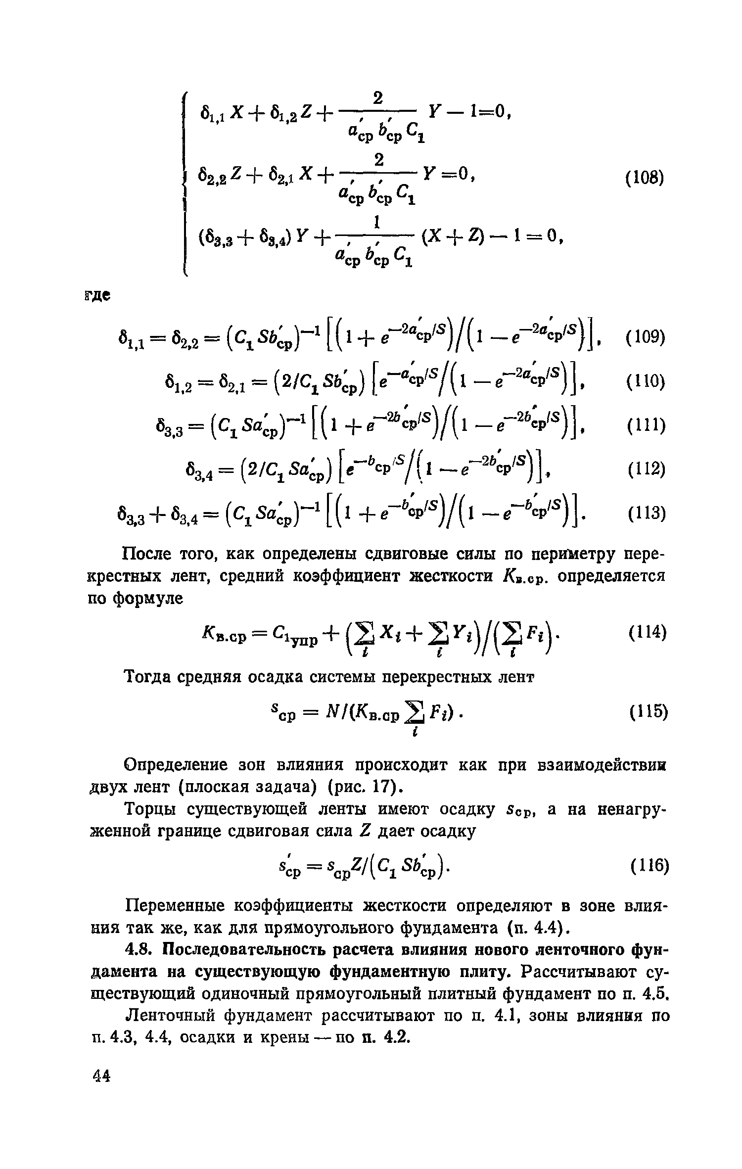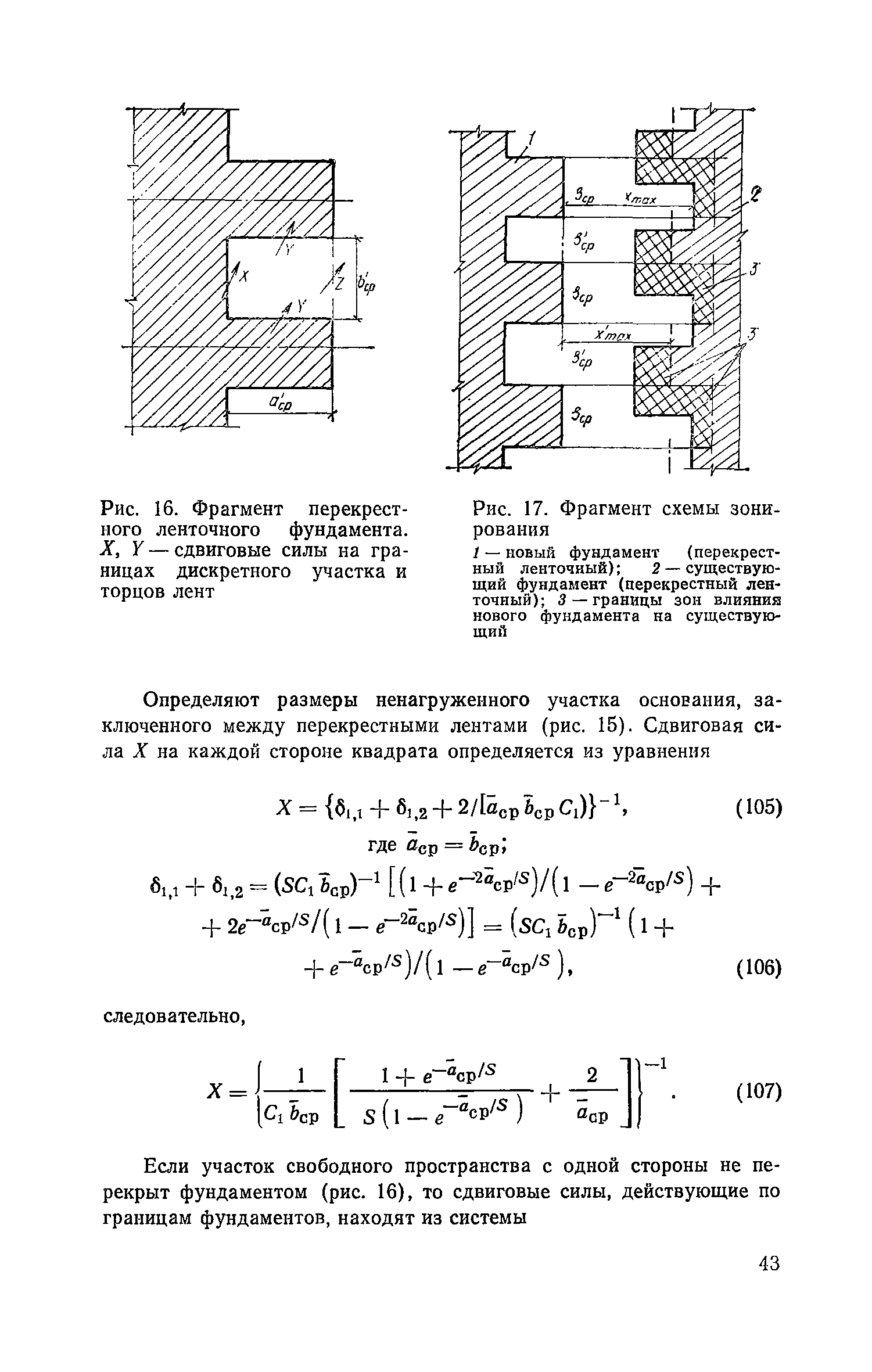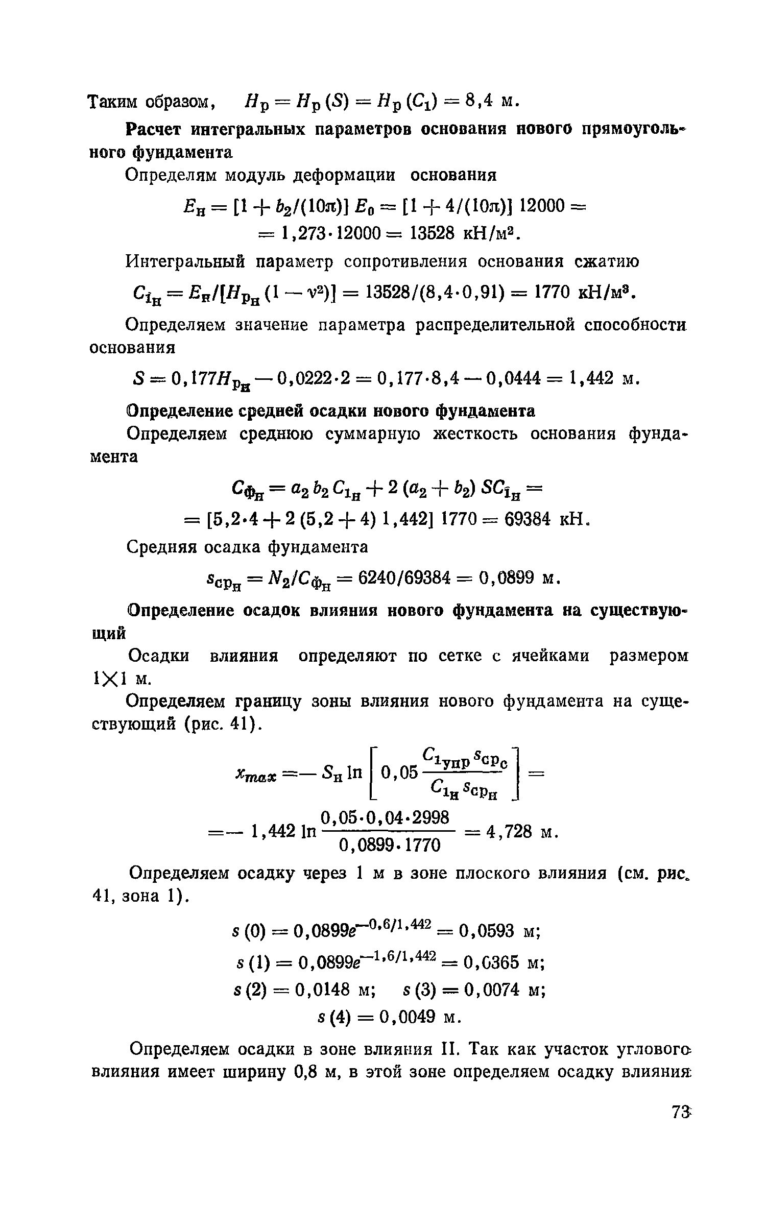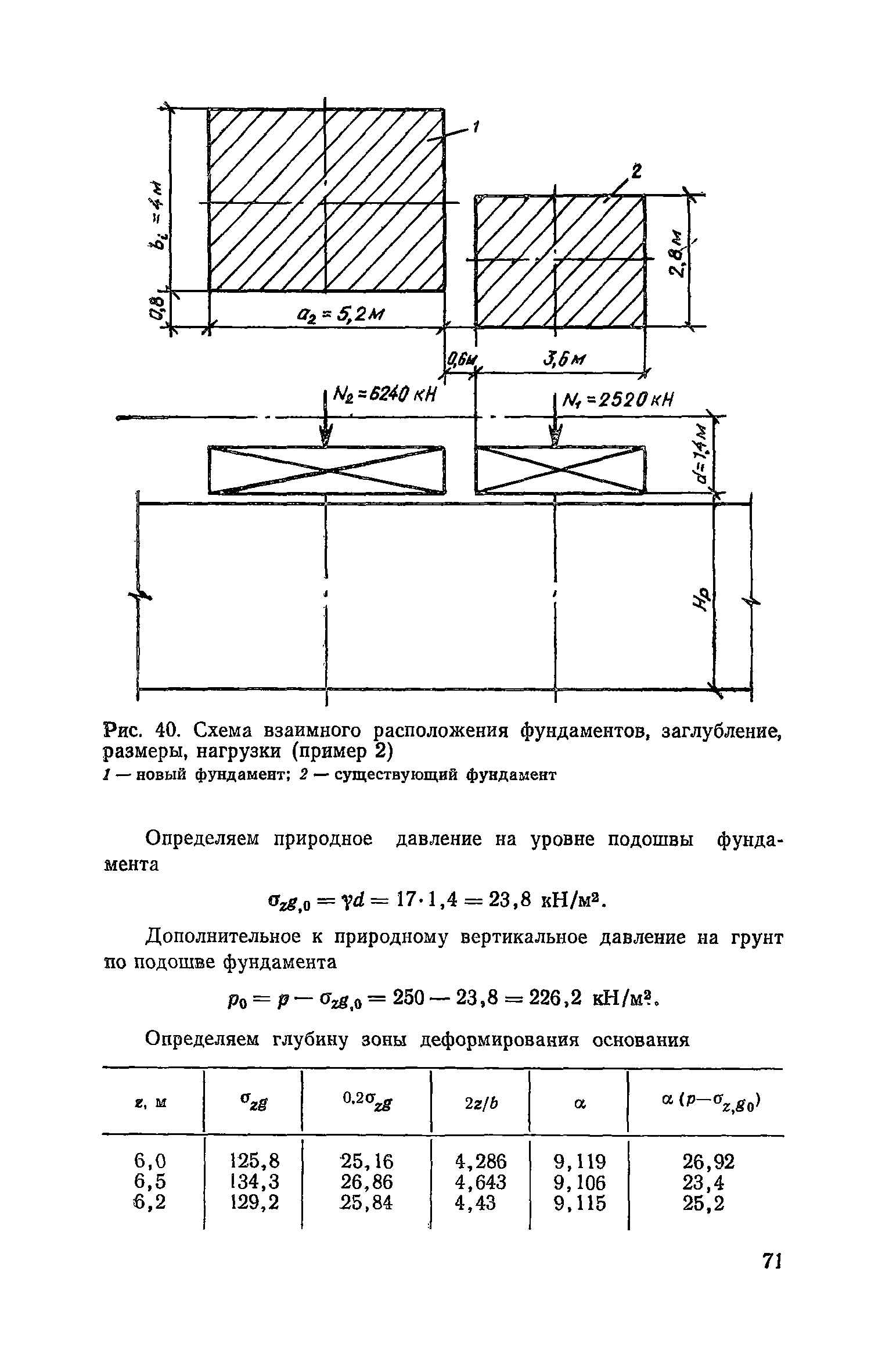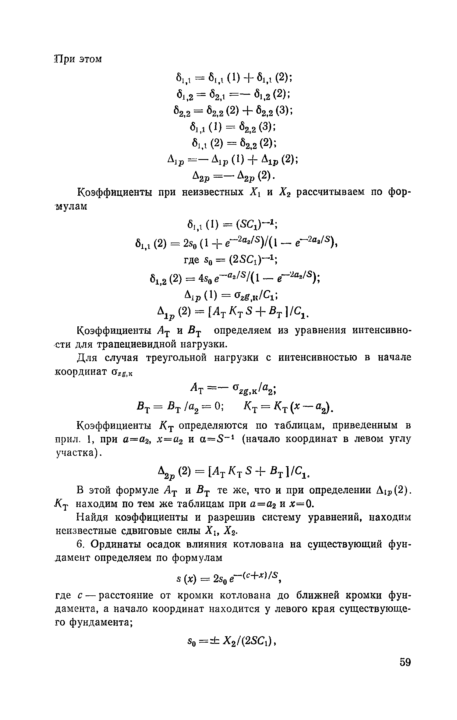 | Оглавление: | 1. Основные положения рекомендаций по методике расчета 2. Типы существующих и новых фундаментов и их сочетания 3. Особенности инженерно-геологических изысканий при проектировании реконструкций промышленных зданий с целью расчета влияния фундаментов вновь возводимых зданий на существующие 4. Методики расчета переменных коэффициентов жесткости, осадок и кренов существующих фундаментов от влияния фундаментов вновь возводимых зданий 5. Учет различной глубины заложения при расчете влияния нового на существующий фундамент 6. Методика учета влияния выемки грунта котлована вновь возводимых сооружений на фундаменты существующих сооружений 7. Методика определения расчетных давлений на упрочненное основание при взаимном влиянии существующих и новых фундаментов зданий и сооружений Приложение 1. Примеры расчета Пример 1. Расчет влияния нового ленточного фундамента на существующий ленточный фундамент Пример 2. Расчет влияния нового прямоугольного фундамента на существующий прямоугольный; несоосное расположение Пример 3. Расчет влияния новой фундаментной плиты на существующую систему прямоугольных фундаментов каркасного здания Пример 4. Расчет влияния нового ленточного фундамента на существующий заглубленный ленточный фундамент Приложение 2. Таблицы коэффициента Кт для расчета осадок поверхности дискретного элемента основания от распределенной трапециевидной нагрузки Приложение 3. Величины структурной прочности глинистых грунтов в зависимости от коэффициента пористости и консистенции Приложение 4. Рекомендации по определению величин коэффициентов |