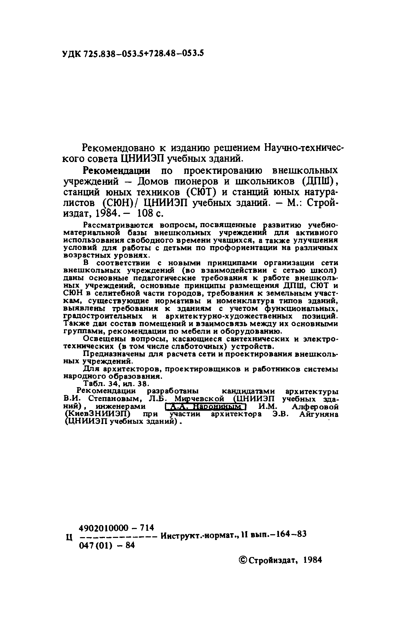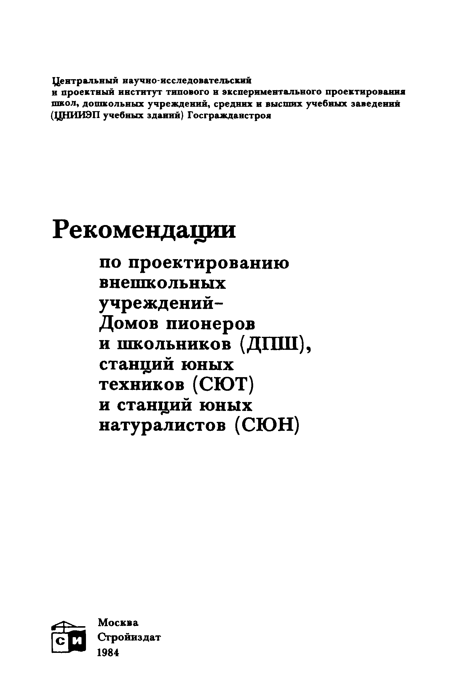 | Название рус.: | Рекомендации по проектированию внешкольных учреждений - Домов пионеров и школьников (ДПШ), станций юных техников (СЮТ) и станций юных натуралистов (СЮН) |