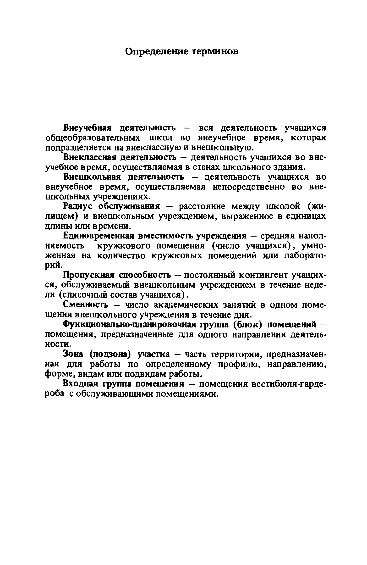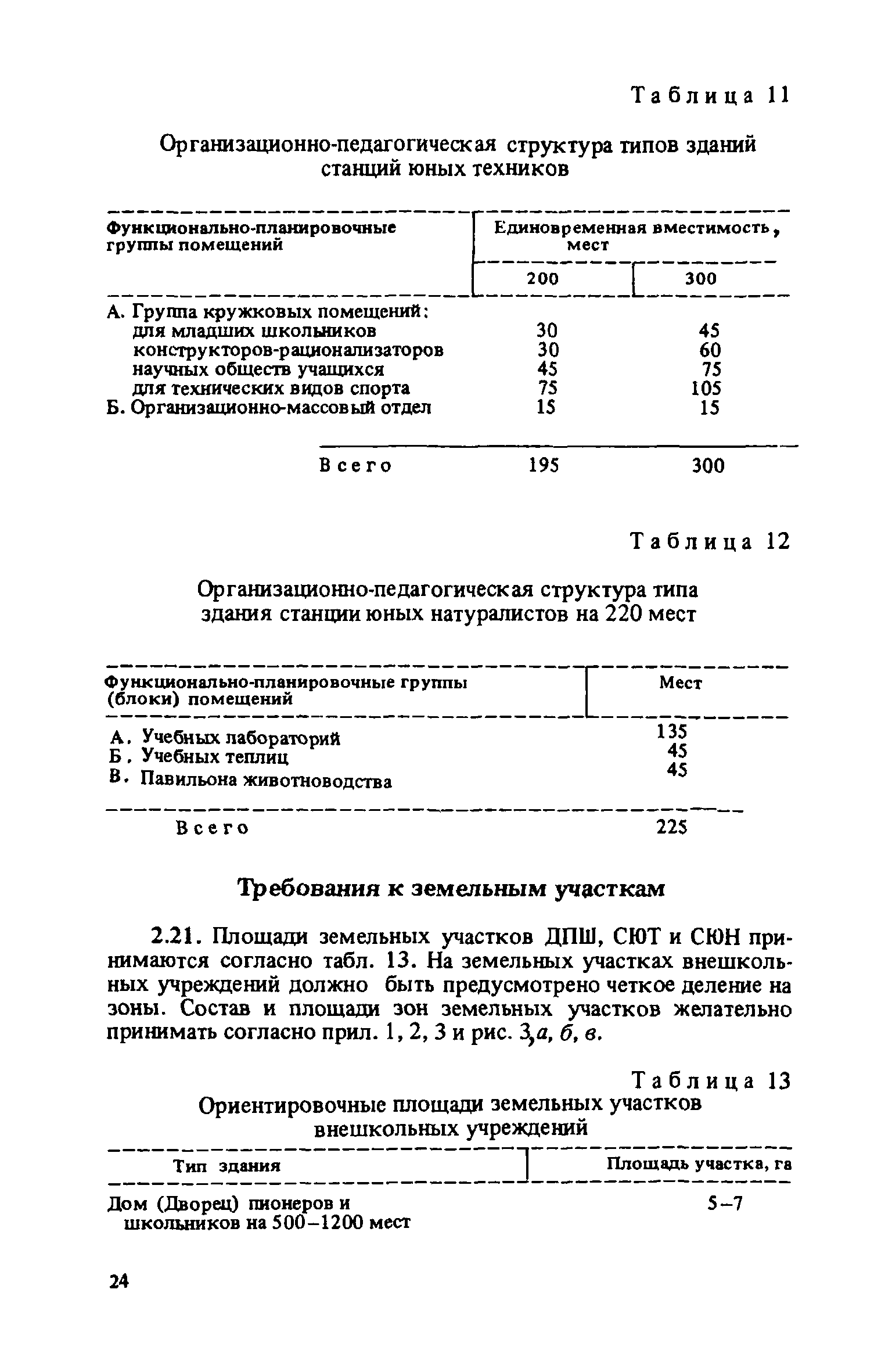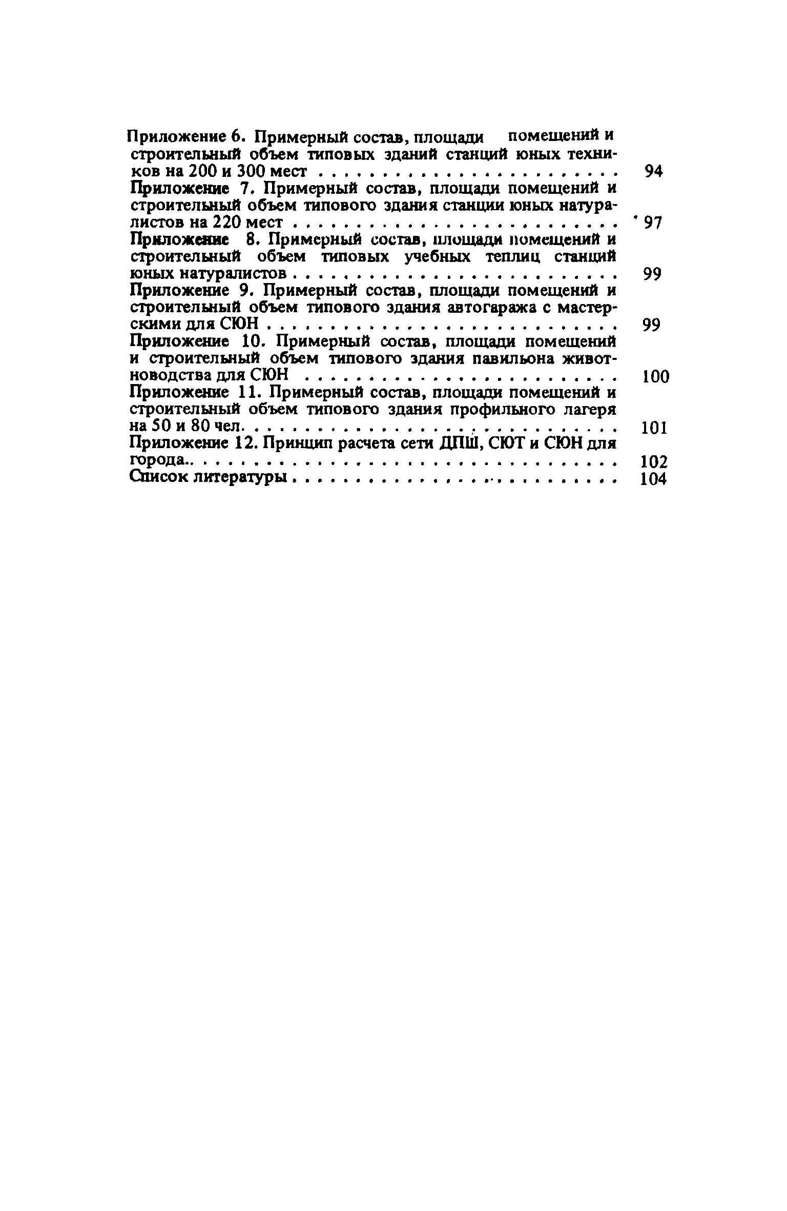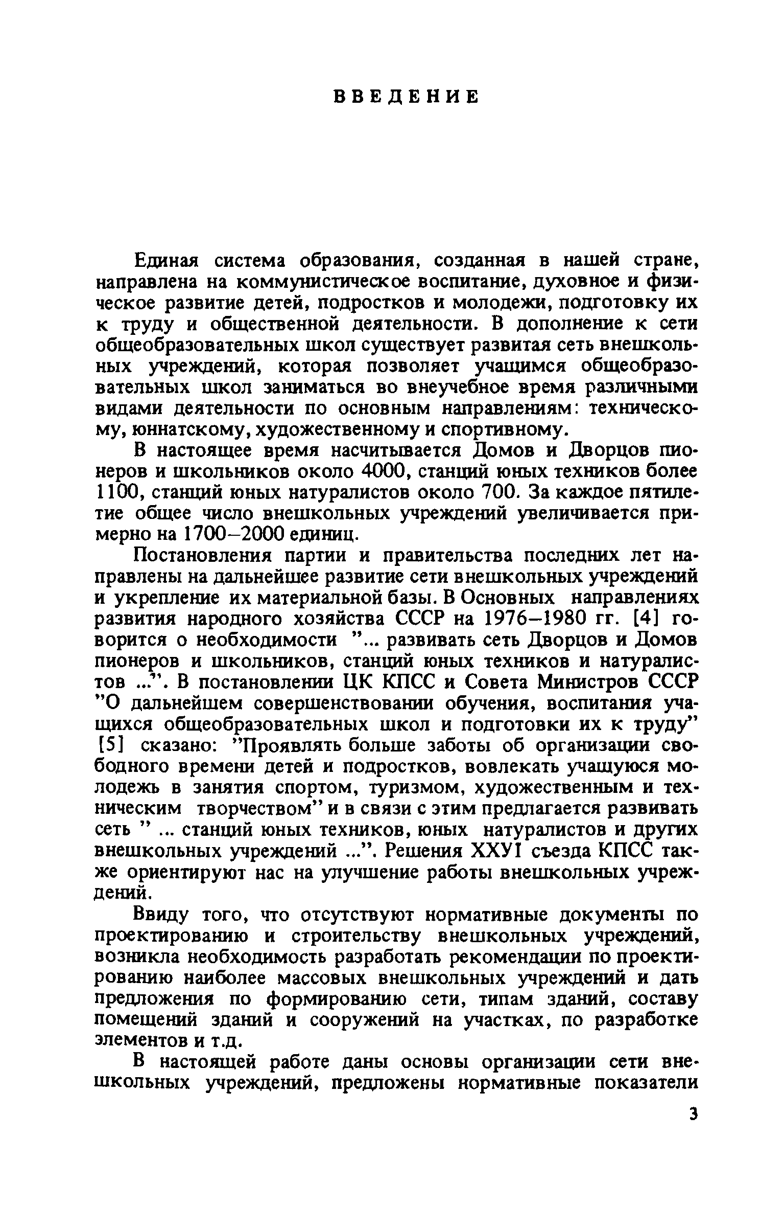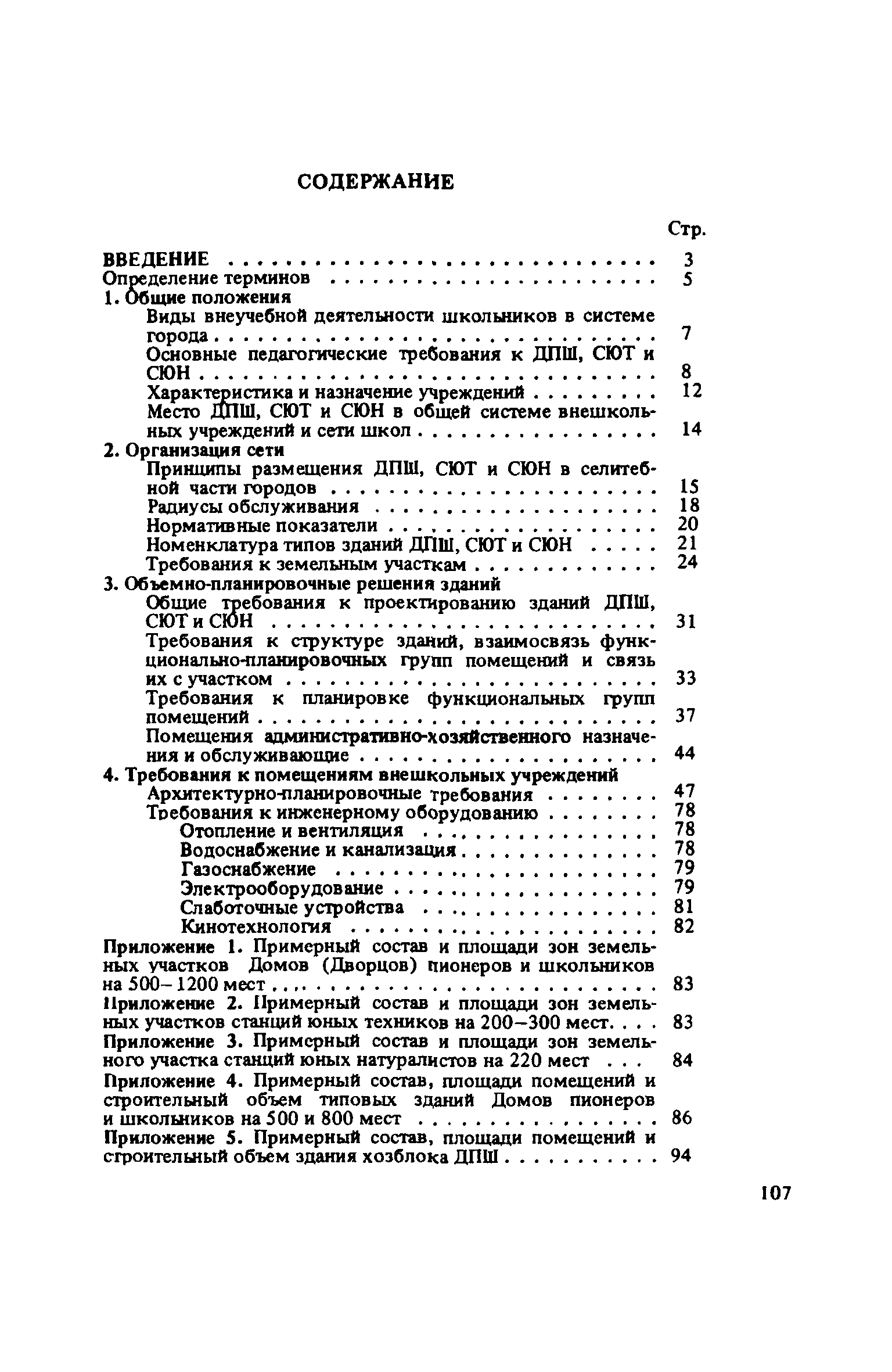 | Оглавление: | Введение Определение терминов 1. Общие положения Виды внеучебной деятельности школьников в системе города Основные педагогические требования к ДПШ, СЮТ и СЮН Характеристика и назначение учреждений Место ДПШ, СЮТ и СЮН в общей системе внешкольных учреждений и сети школ 2. Организация сети Принципы размещения ДПШ, СЮТ и СЮН в селитебной части городов Радиусы обслуживания Нормативные показатели Номенклатура типов зданий ДПШ, СЮТ и СЮН Требования к земельным участкам 3. Объемно-планировочные решения зданий Общие требования к проектированию зданий ДПШ, СЮТ и СЮН Требования к структуре зданий, взаимосвязь функционально-планировочных групп помещений и связь их с участком Требования к планировке функциональных групп помещений Помещения административно-хозяйственного назначения и обслуживающие 4. Требования к помещениям внешкольных учреждений Архитектурно-планировочные требования Требования к инженерному оборудованию Отопление и вентиляция Водоснабжение и канализация Газоснабжение Электрооборудование Слаботочные устройства Кинотехнология Приложение 1. Примерный состав и площади зон земельных участков домов (дворцов) пионеров и школьников на 500- 1200 мест Приложение 2. Примерный состав и площади зон земельных участков станций юных техников на 200-300 мест Приложение 3. Примерный состав и площади зон земельного участка станций юных натуралистов на 220 мест Приложение 4. Примерный состав, площади помещений и строительный объем типовых зданий домов пионеров и школьников на 500 и 800 мест Приложение 5. Примерный состав, площади помещений и строительный объем здания хозблока ДПШ Приложение 6. Примерный состав, площади помещений и строительный объем типовых зданий станций юных техников на 200 и 300 мест Приложение 7. Примерный состав, площади помещений и строительный объем типового здания станции юных натуралистов на 220 мест Приложение 8. Примерный состав, площади помещений и строительный объем типовых учебных теплиц станций юных натуралистов Приложение 9. Примерный состав, площади помещений и строительный объем типового здания автогаража с мастерскими для СЮН Приложение 10. Примерный состав, площади помещений и строительный объем типового здания павильона животноводства для СЮН Приложение 11. Примерный состав, площади помещений и строительный объем типового здания профильного лагеря на 50 и 80 чел Приложение 12. Принцип расчета сети ДПШ, СЮТ и СЮН для города Список литературы |