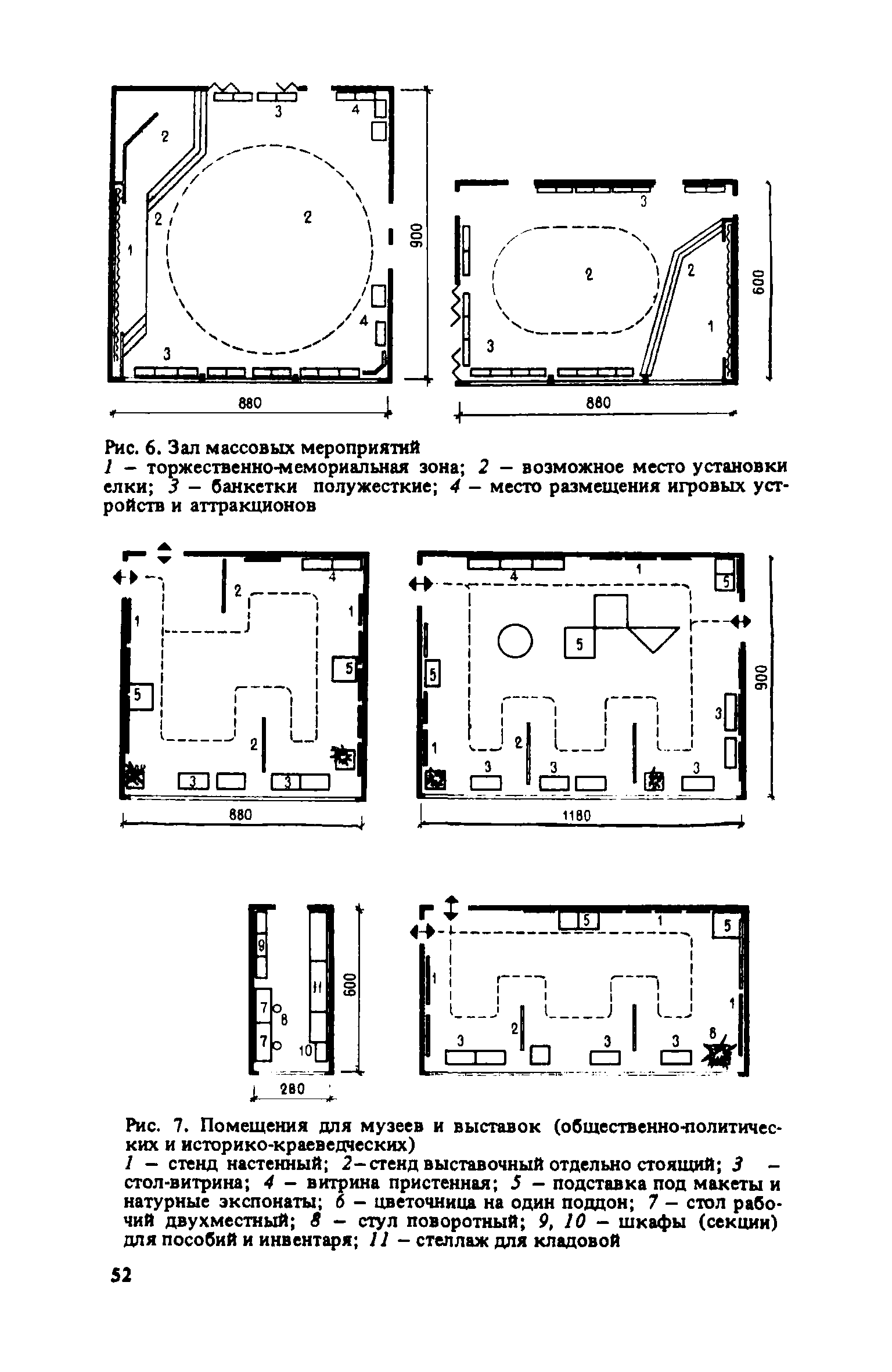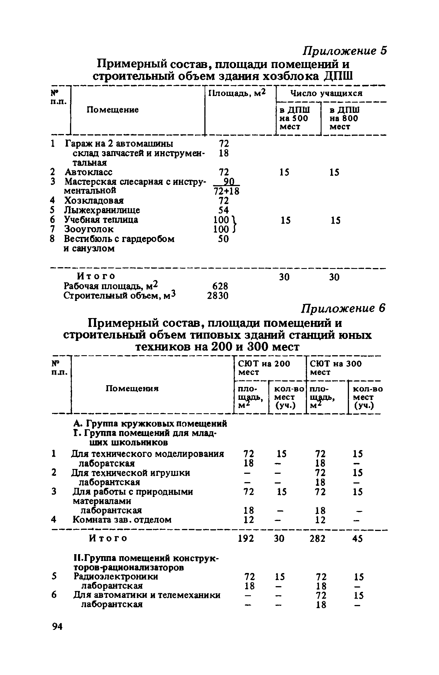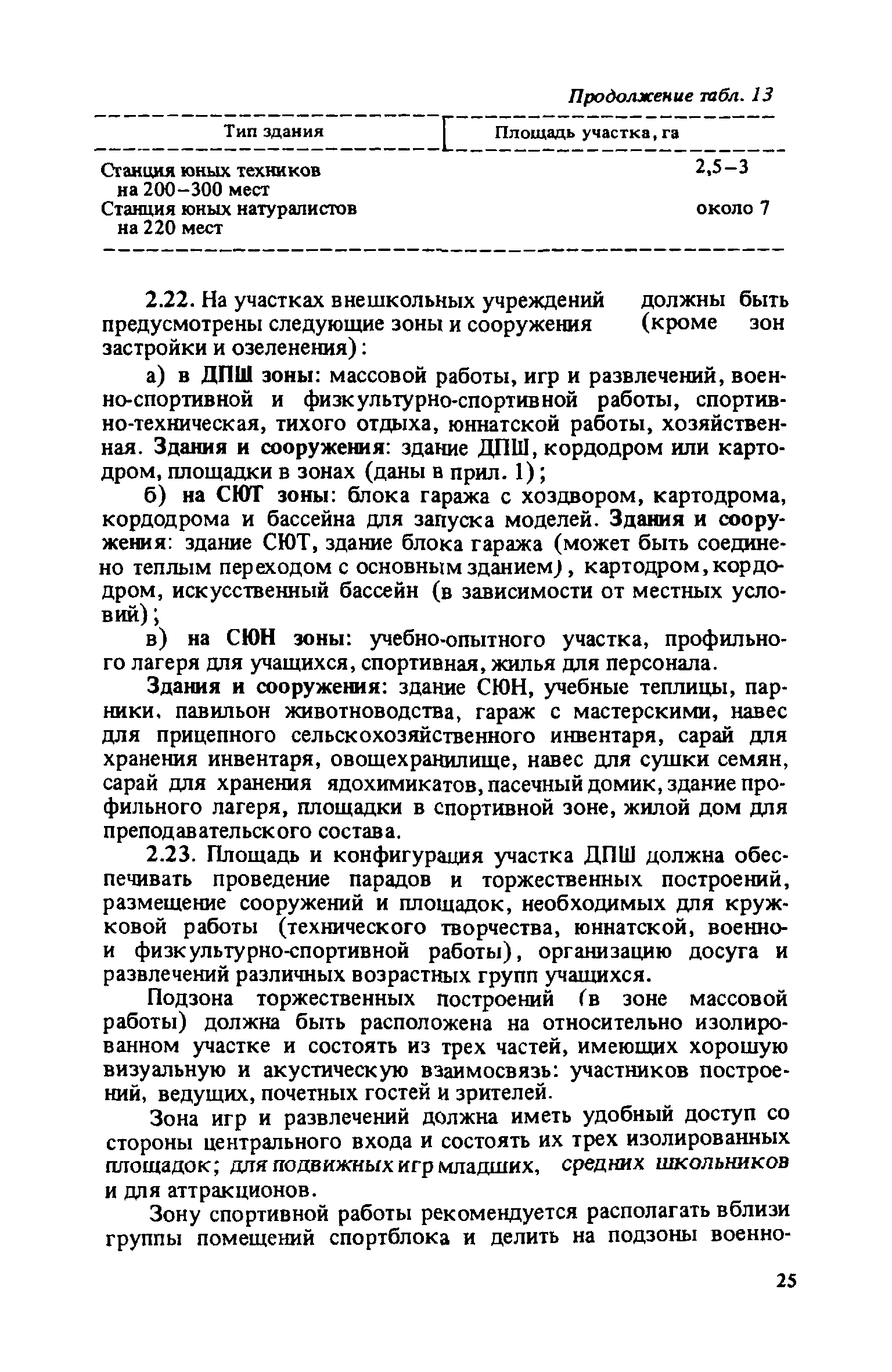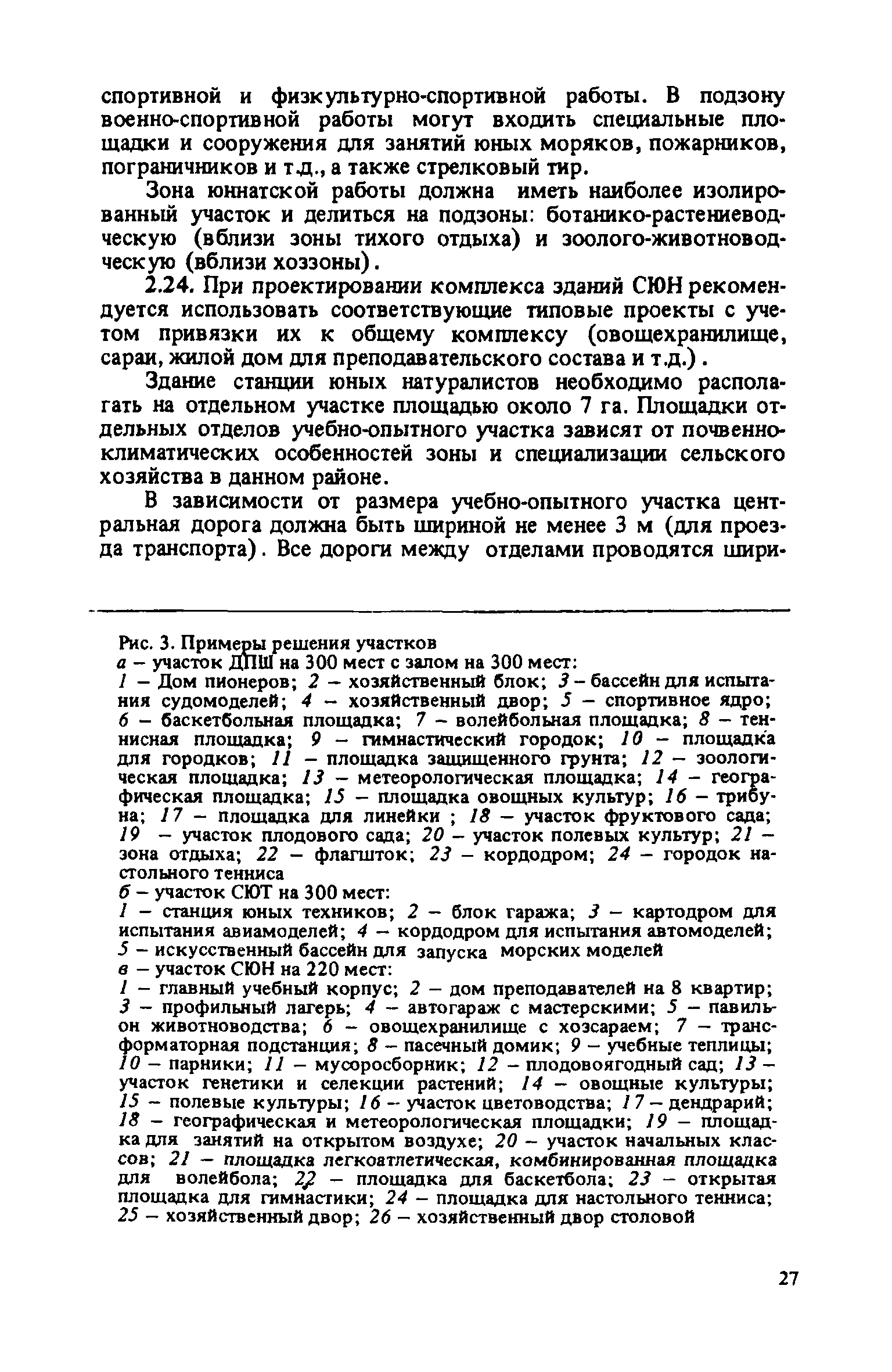 | Оглавление: | Введение Определение терминов 1. Общие положения Виды внеучебной деятельности школьников в системе города Основные педагогические требования к ДПШ, СЮТ и СЮН Характеристика и назначение учреждений Место ДПШ, СЮТ и СЮН в общей системе внешкольных учреждений и сети школ 2. Организация сети Принципы размещения ДПШ, СЮТ и СЮН в селитебной части городов Радиусы обслуживания Нормативные показатели Номенклатура типов зданий ДПШ, СЮТ и СЮН Требования к земельным участкам 3. Объемно-планировочные решения зданий Общие требования к проектированию зданий ДПШ, СЮТ и СЮН Требования к структуре зданий, взаимосвязь функционально-планировочных групп помещений и связь их с участком Требования к планировке функциональных групп помещений Помещения административно-хозяйственного назначения и обслуживающие 4. Требования к помещениям внешкольных учреждений Архитектурно-планировочные требования Требования к инженерному оборудованию Отопление и вентиляция Водоснабжение и канализация Газоснабжение Электрооборудование Слаботочные устройства Кинотехнология Приложение 1. Примерный состав и площади зон земельных участков домов (дворцов) пионеров и школьников на 500- 1200 мест Приложение 2. Примерный состав и площади зон земельных участков станций юных техников на 200-300 мест Приложение 3. Примерный состав и площади зон земельного участка станций юных натуралистов на 220 мест Приложение 4. Примерный состав, площади помещений и строительный объем типовых зданий домов пионеров и школьников на 500 и 800 мест Приложение 5. Примерный состав, площади помещений и строительный объем здания хозблока ДПШ Приложение 6. Примерный состав, площади помещений и строительный объем типовых зданий станций юных техников на 200 и 300 мест Приложение 7. Примерный состав, площади помещений и строительный объем типового здания станции юных натуралистов на 220 мест Приложение 8. Примерный состав, площади помещений и строительный объем типовых учебных теплиц станций юных натуралистов Приложение 9. Примерный состав, площади помещений и строительный объем типового здания автогаража с мастерскими для СЮН Приложение 10. Примерный состав, площади помещений и строительный объем типового здания павильона животноводства для СЮН Приложение 11. Примерный состав, площади помещений и строительный объем типового здания профильного лагеря на 50 и 80 чел Приложение 12. Принцип расчета сети ДПШ, СЮТ и СЮН для города Список литературы |
