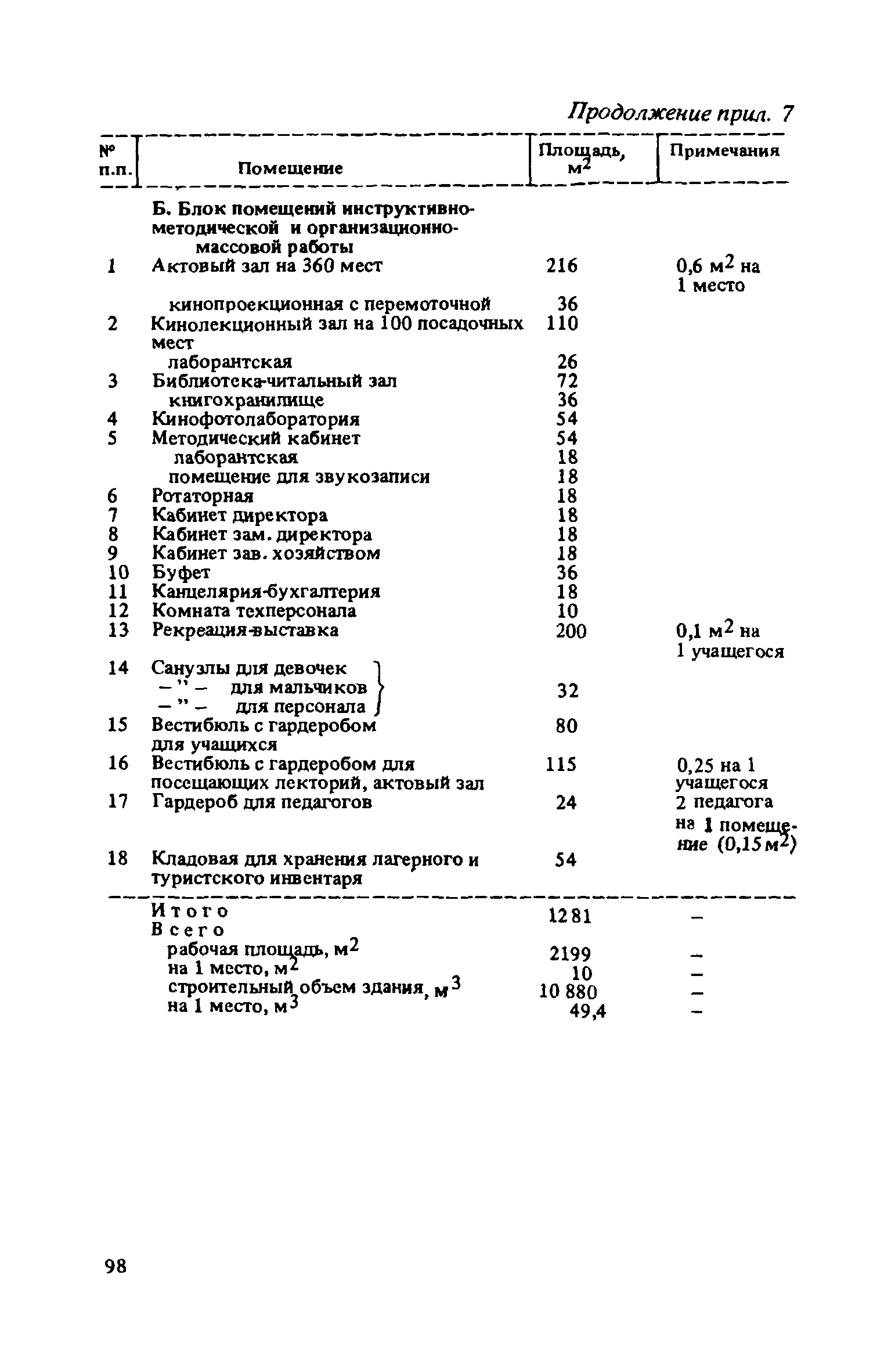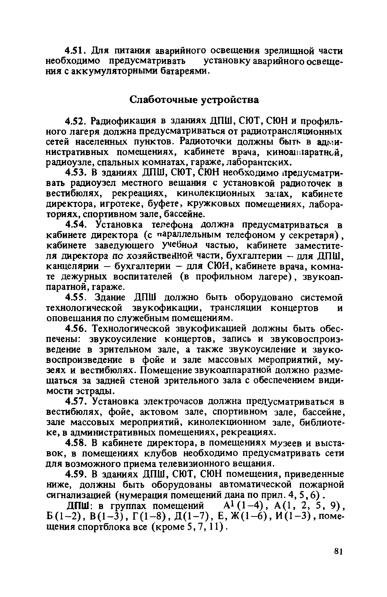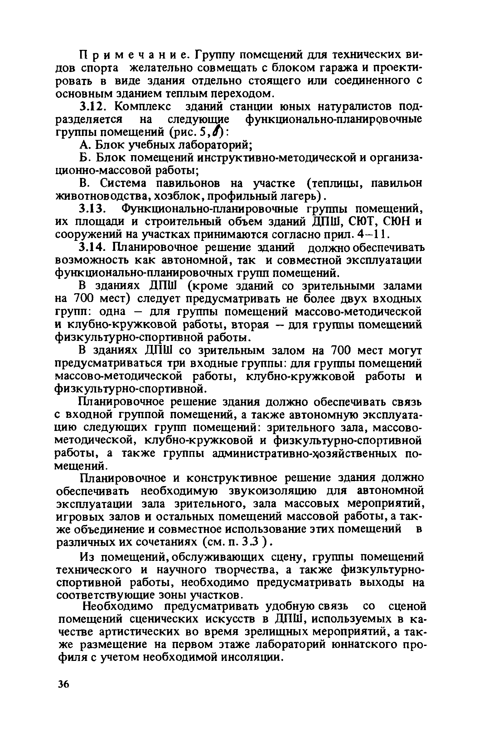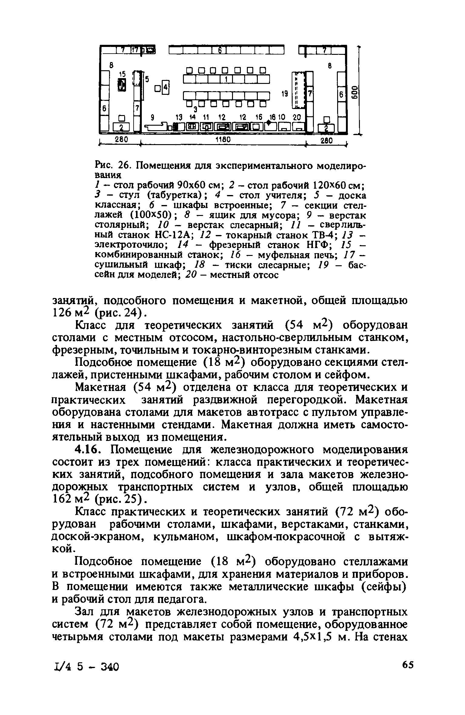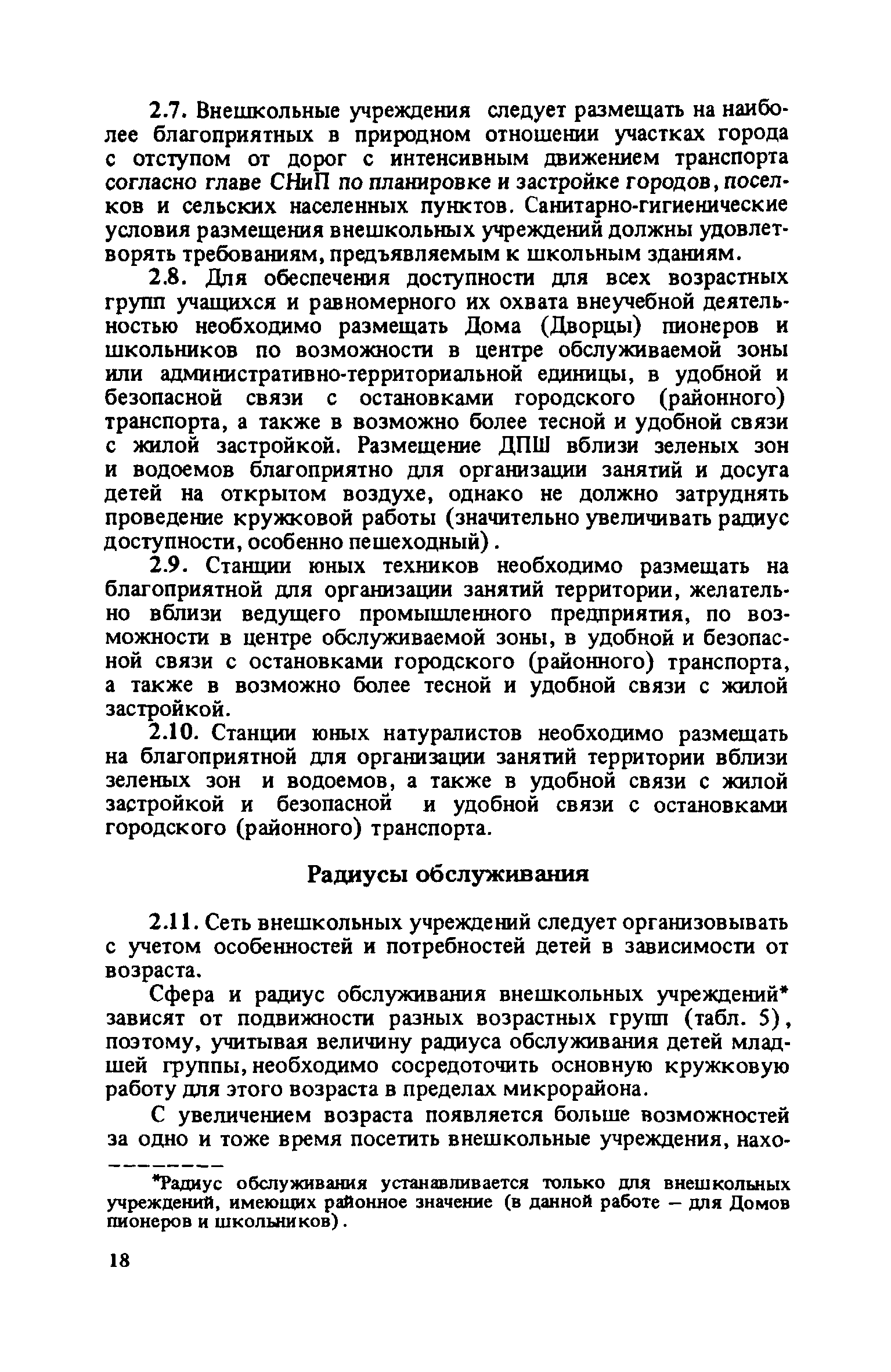 | Оглавление: | Введение Определение терминов 1. Общие положения Виды внеучебной деятельности школьников в системе города Основные педагогические требования к ДПШ, СЮТ и СЮН Характеристика и назначение учреждений Место ДПШ, СЮТ и СЮН в общей системе внешкольных учреждений и сети школ 2. Организация сети Принципы размещения ДПШ, СЮТ и СЮН в селитебной части городов Радиусы обслуживания Нормативные показатели Номенклатура типов зданий ДПШ, СЮТ и СЮН Требования к земельным участкам 3. Объемно-планировочные решения зданий Общие требования к проектированию зданий ДПШ, СЮТ и СЮН Требования к структуре зданий, взаимосвязь функционально-планировочных групп помещений и связь их с участком Требования к планировке функциональных групп помещений Помещения административно-хозяйственного назначения и обслуживающие 4. Требования к помещениям внешкольных учреждений Архитектурно-планировочные требования Требования к инженерному оборудованию Отопление и вентиляция Водоснабжение и канализация Газоснабжение Электрооборудование Слаботочные устройства Кинотехнология Приложение 1. Примерный состав и площади зон земельных участков домов (дворцов) пионеров и школьников на 500- 1200 мест Приложение 2. Примерный состав и площади зон земельных участков станций юных техников на 200-300 мест Приложение 3. Примерный состав и площади зон земельного участка станций юных натуралистов на 220 мест Приложение 4. Примерный состав, площади помещений и строительный объем типовых зданий домов пионеров и школьников на 500 и 800 мест Приложение 5. Примерный состав, площади помещений и строительный объем здания хозблока ДПШ Приложение 6. Примерный состав, площади помещений и строительный объем типовых зданий станций юных техников на 200 и 300 мест Приложение 7. Примерный состав, площади помещений и строительный объем типового здания станции юных натуралистов на 220 мест Приложение 8. Примерный состав, площади помещений и строительный объем типовых учебных теплиц станций юных натуралистов Приложение 9. Примерный состав, площади помещений и строительный объем типового здания автогаража с мастерскими для СЮН Приложение 10. Примерный состав, площади помещений и строительный объем типового здания павильона животноводства для СЮН Приложение 11. Примерный состав, площади помещений и строительный объем типового здания профильного лагеря на 50 и 80 чел Приложение 12. Принцип расчета сети ДПШ, СЮТ и СЮН для города Список литературы |