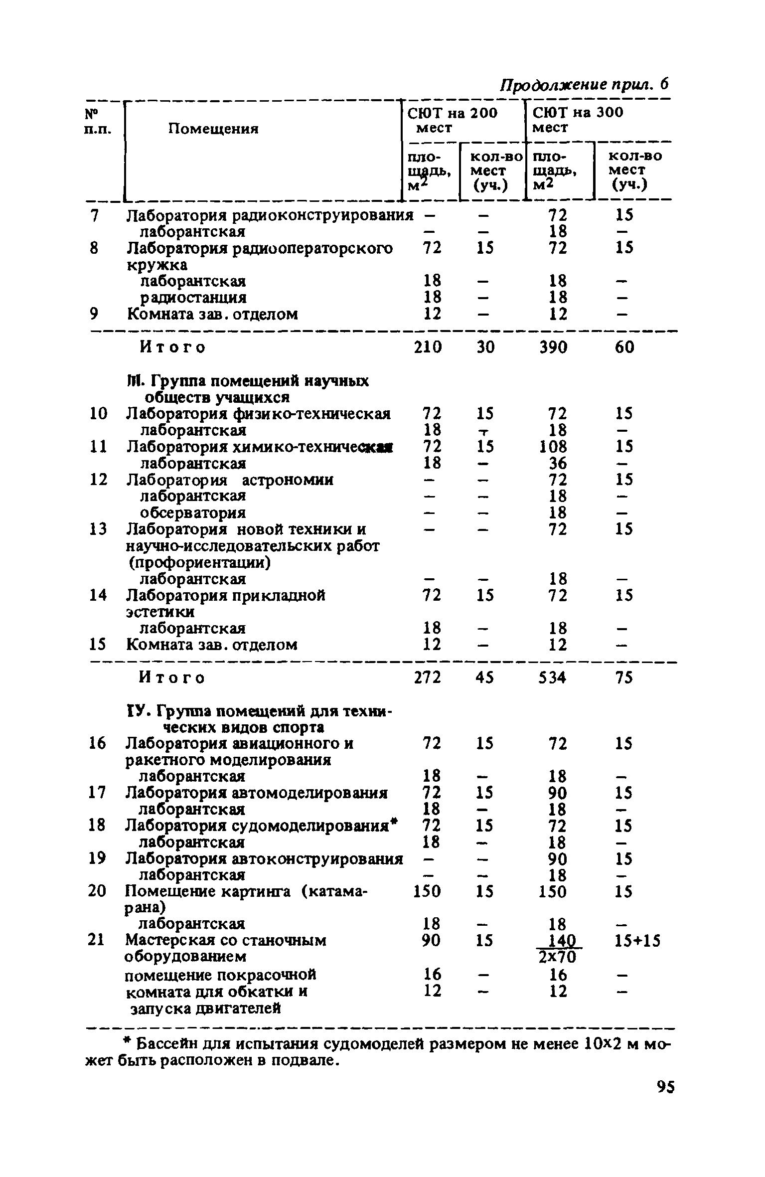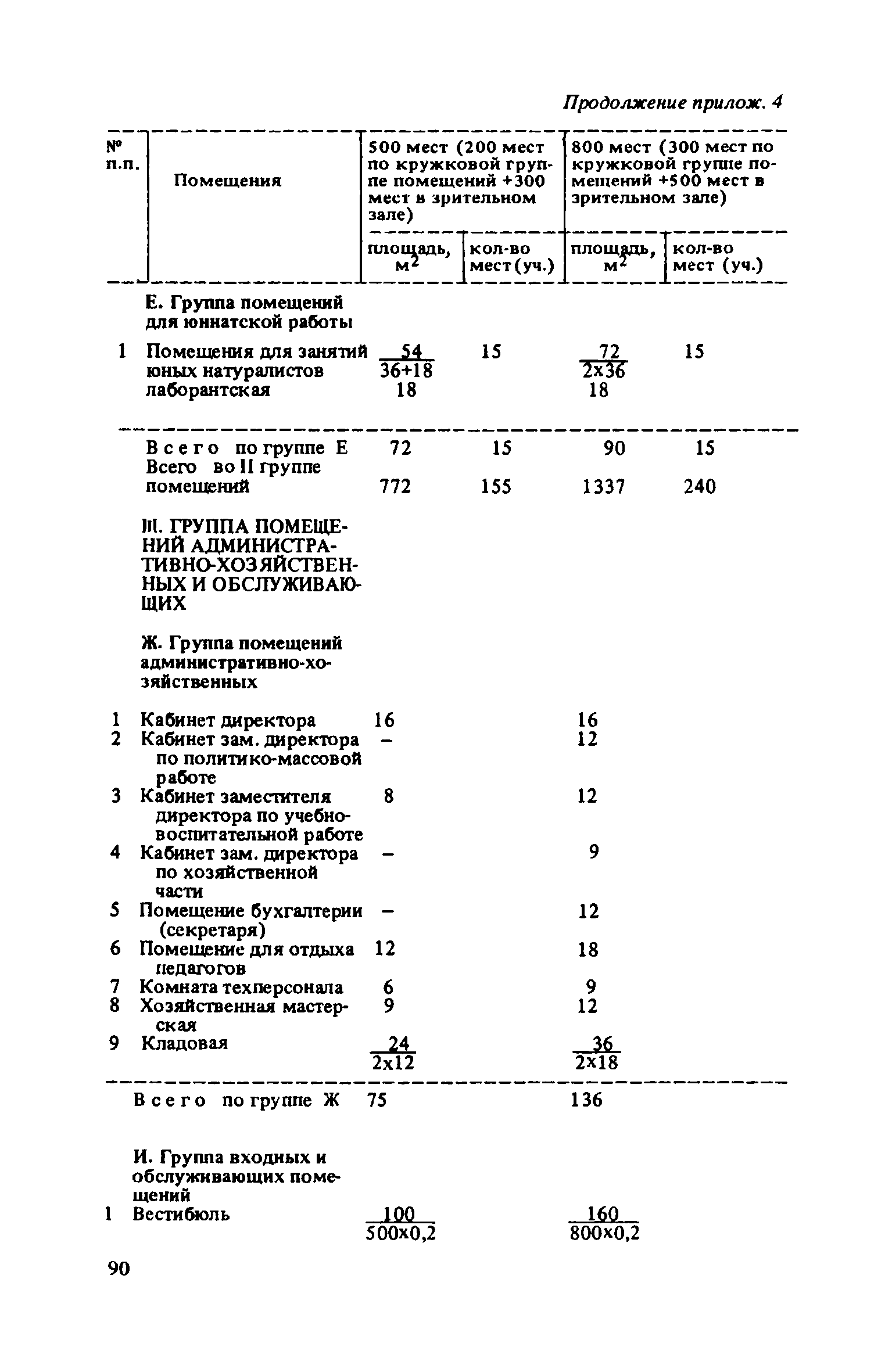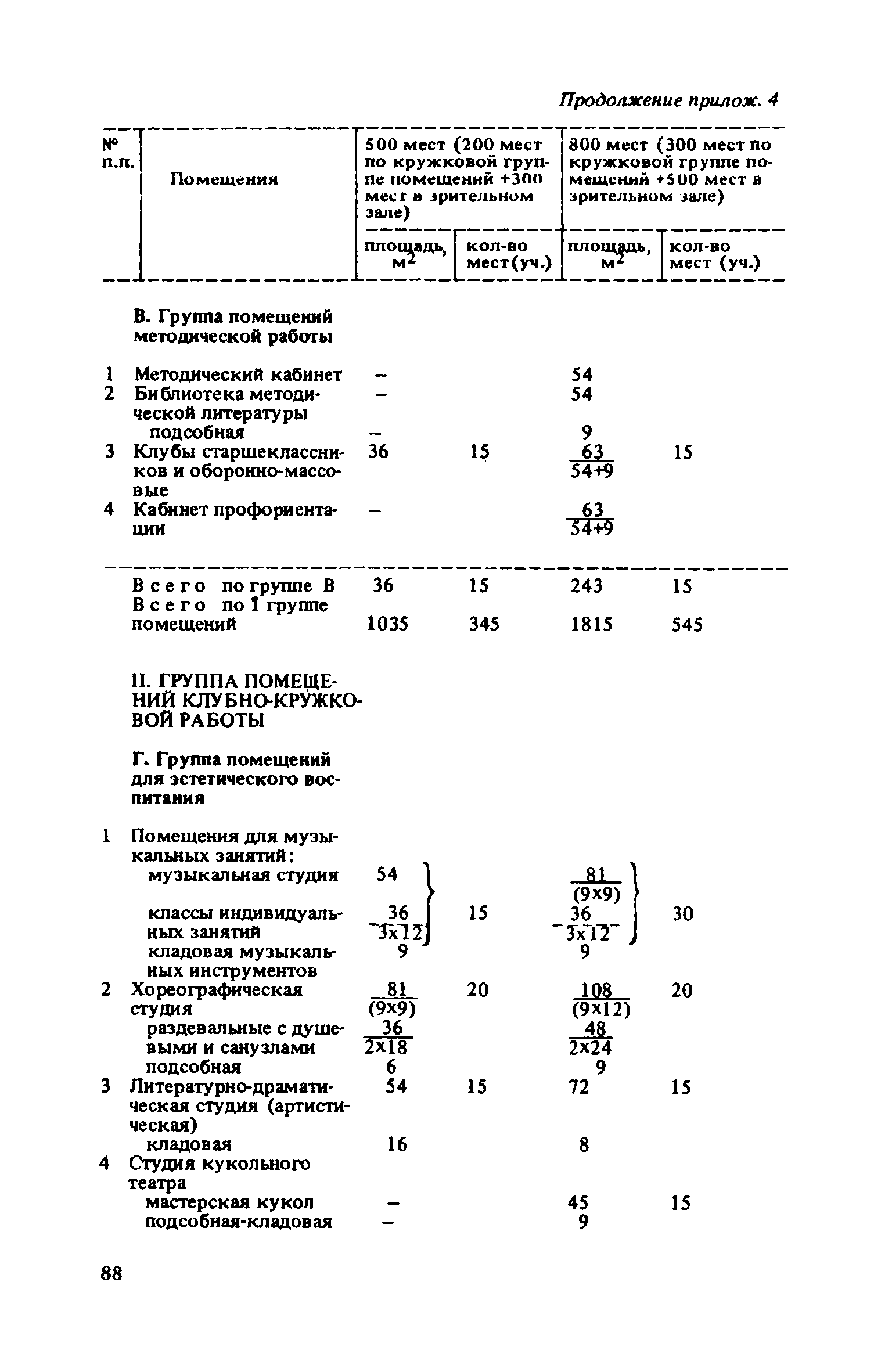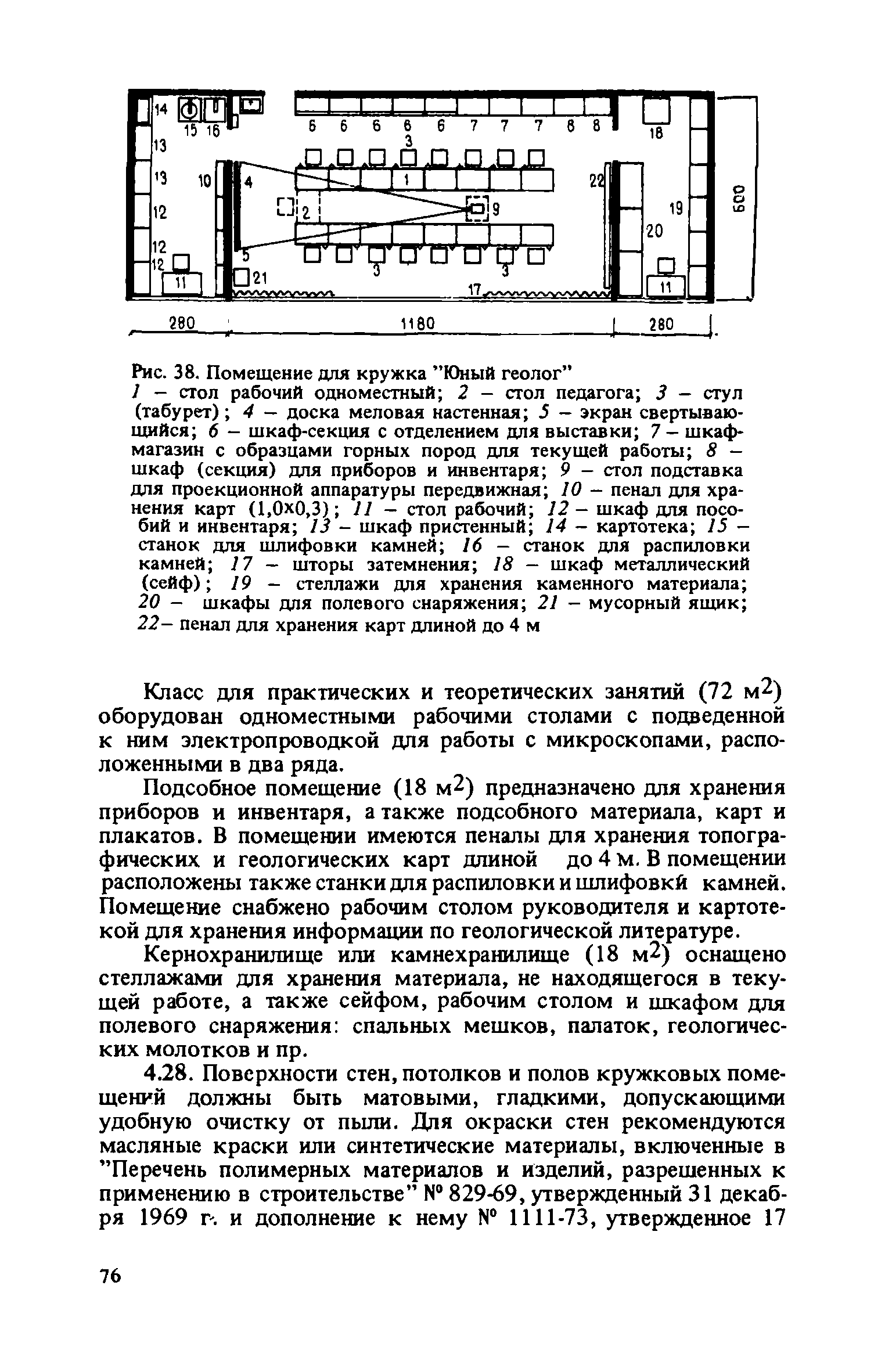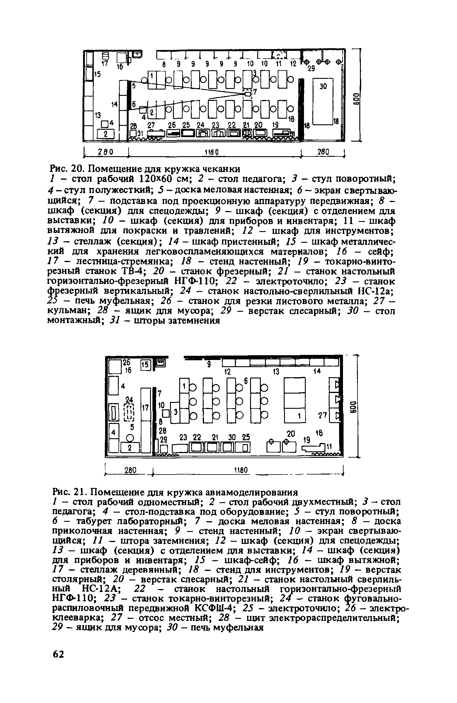 | Оглавление: | Введение Определение терминов 1. Общие положения Виды внеучебной деятельности школьников в системе города Основные педагогические требования к ДПШ, СЮТ и СЮН Характеристика и назначение учреждений Место ДПШ, СЮТ и СЮН в общей системе внешкольных учреждений и сети школ 2. Организация сети Принципы размещения ДПШ, СЮТ и СЮН в селитебной части городов Радиусы обслуживания Нормативные показатели Номенклатура типов зданий ДПШ, СЮТ и СЮН Требования к земельным участкам 3. Объемно-планировочные решения зданий Общие требования к проектированию зданий ДПШ, СЮТ и СЮН Требования к структуре зданий, взаимосвязь функционально-планировочных групп помещений и связь их с участком Требования к планировке функциональных групп помещений Помещения административно-хозяйственного назначения и обслуживающие 4. Требования к помещениям внешкольных учреждений Архитектурно-планировочные требования Требования к инженерному оборудованию Отопление и вентиляция Водоснабжение и канализация Газоснабжение Электрооборудование Слаботочные устройства Кинотехнология Приложение 1. Примерный состав и площади зон земельных участков домов (дворцов) пионеров и школьников на 500- 1200 мест Приложение 2. Примерный состав и площади зон земельных участков станций юных техников на 200-300 мест Приложение 3. Примерный состав и площади зон земельного участка станций юных натуралистов на 220 мест Приложение 4. Примерный состав, площади помещений и строительный объем типовых зданий домов пионеров и школьников на 500 и 800 мест Приложение 5. Примерный состав, площади помещений и строительный объем здания хозблока ДПШ Приложение 6. Примерный состав, площади помещений и строительный объем типовых зданий станций юных техников на 200 и 300 мест Приложение 7. Примерный состав, площади помещений и строительный объем типового здания станции юных натуралистов на 220 мест Приложение 8. Примерный состав, площади помещений и строительный объем типовых учебных теплиц станций юных натуралистов Приложение 9. Примерный состав, площади помещений и строительный объем типового здания автогаража с мастерскими для СЮН Приложение 10. Примерный состав, площади помещений и строительный объем типового здания павильона животноводства для СЮН Приложение 11. Примерный состав, площади помещений и строительный объем типового здания профильного лагеря на 50 и 80 чел Приложение 12. Принцип расчета сети ДПШ, СЮТ и СЮН для города Список литературы |