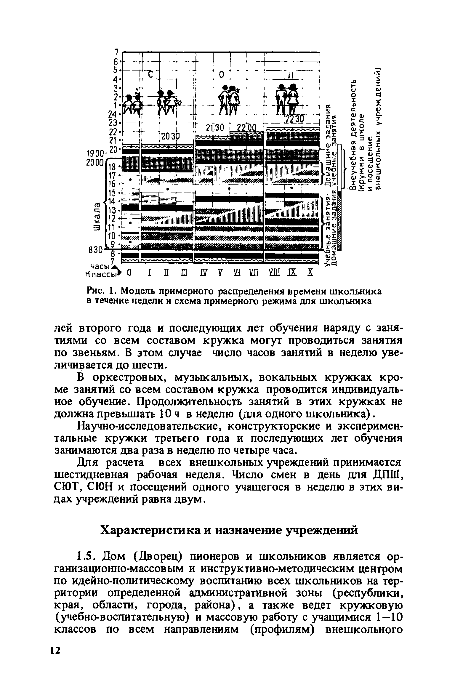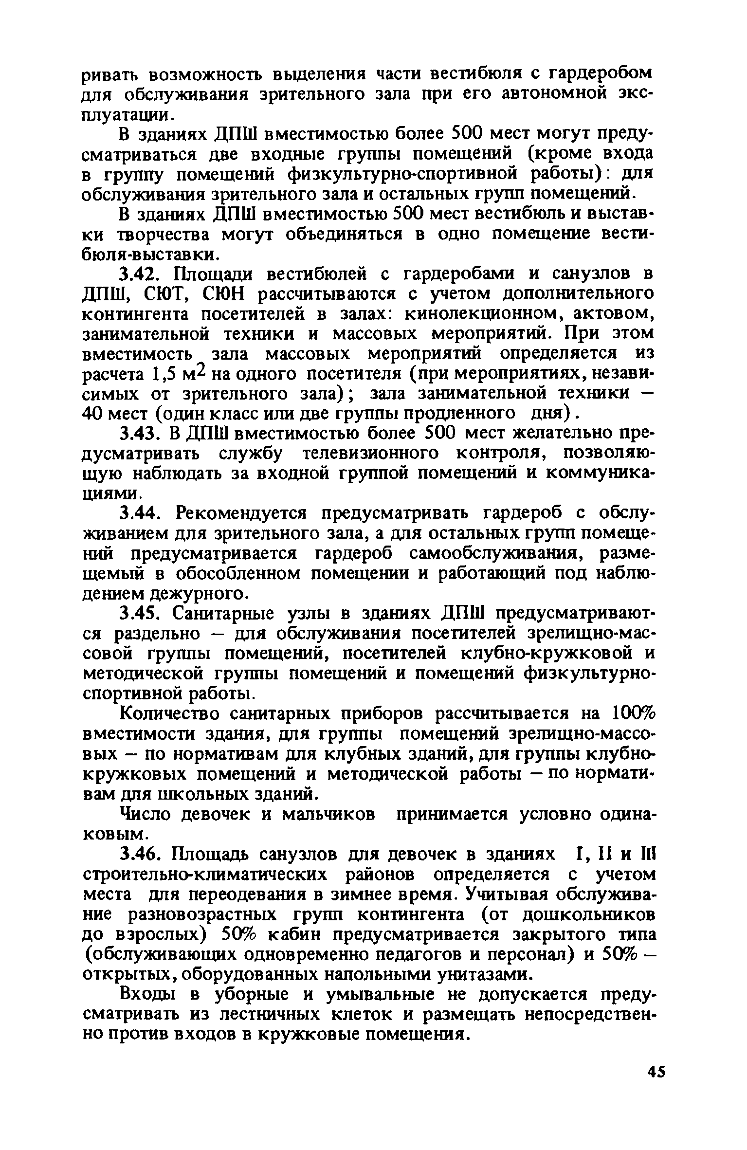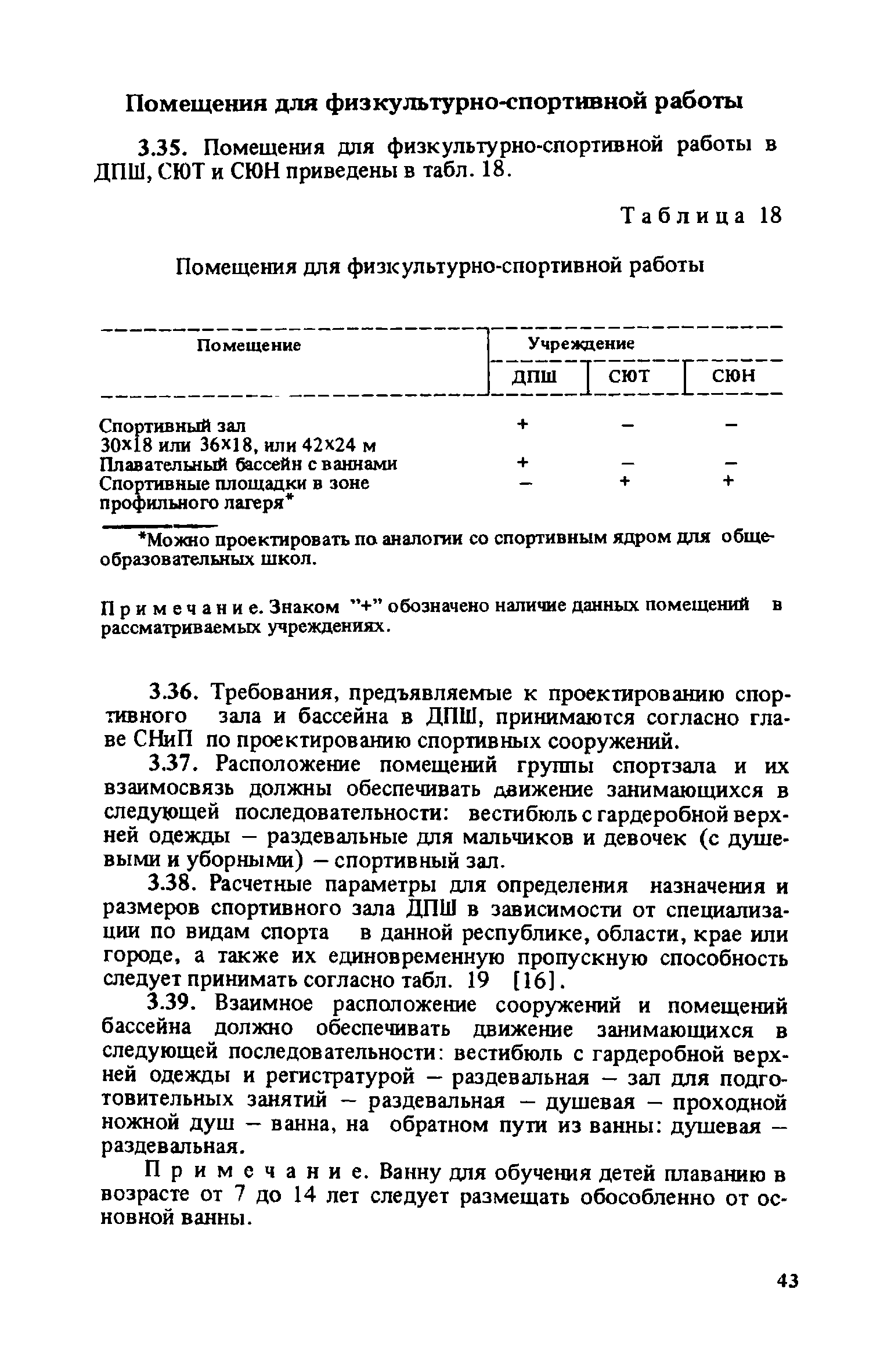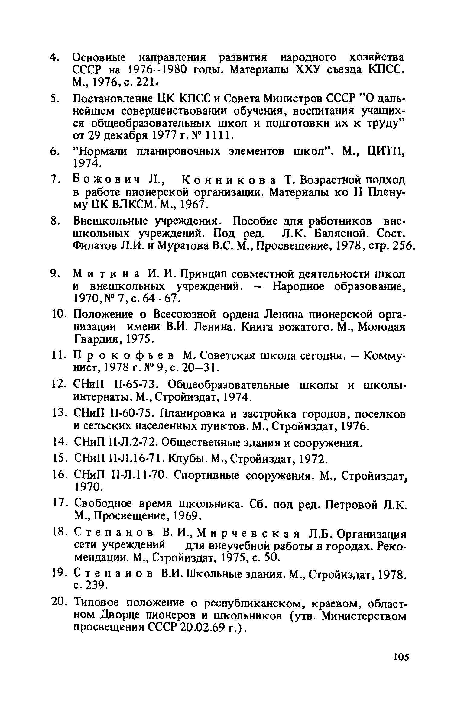 | Оглавление: | Введение Определение терминов 1. Общие положения Виды внеучебной деятельности школьников в системе города Основные педагогические требования к ДПШ, СЮТ и СЮН Характеристика и назначение учреждений Место ДПШ, СЮТ и СЮН в общей системе внешкольных учреждений и сети школ 2. Организация сети Принципы размещения ДПШ, СЮТ и СЮН в селитебной части городов Радиусы обслуживания Нормативные показатели Номенклатура типов зданий ДПШ, СЮТ и СЮН Требования к земельным участкам 3. Объемно-планировочные решения зданий Общие требования к проектированию зданий ДПШ, СЮТ и СЮН Требования к структуре зданий, взаимосвязь функционально-планировочных групп помещений и связь их с участком Требования к планировке функциональных групп помещений Помещения административно-хозяйственного назначения и обслуживающие 4. Требования к помещениям внешкольных учреждений Архитектурно-планировочные требования Требования к инженерному оборудованию Отопление и вентиляция Водоснабжение и канализация Газоснабжение Электрооборудование Слаботочные устройства Кинотехнология Приложение 1. Примерный состав и площади зон земельных участков домов (дворцов) пионеров и школьников на 500- 1200 мест Приложение 2. Примерный состав и площади зон земельных участков станций юных техников на 200-300 мест Приложение 3. Примерный состав и площади зон земельного участка станций юных натуралистов на 220 мест Приложение 4. Примерный состав, площади помещений и строительный объем типовых зданий домов пионеров и школьников на 500 и 800 мест Приложение 5. Примерный состав, площади помещений и строительный объем здания хозблока ДПШ Приложение 6. Примерный состав, площади помещений и строительный объем типовых зданий станций юных техников на 200 и 300 мест Приложение 7. Примерный состав, площади помещений и строительный объем типового здания станции юных натуралистов на 220 мест Приложение 8. Примерный состав, площади помещений и строительный объем типовых учебных теплиц станций юных натуралистов Приложение 9. Примерный состав, площади помещений и строительный объем типового здания автогаража с мастерскими для СЮН Приложение 10. Примерный состав, площади помещений и строительный объем типового здания павильона животноводства для СЮН Приложение 11. Примерный состав, площади помещений и строительный объем типового здания профильного лагеря на 50 и 80 чел Приложение 12. Принцип расчета сети ДПШ, СЮТ и СЮН для города Список литературы |