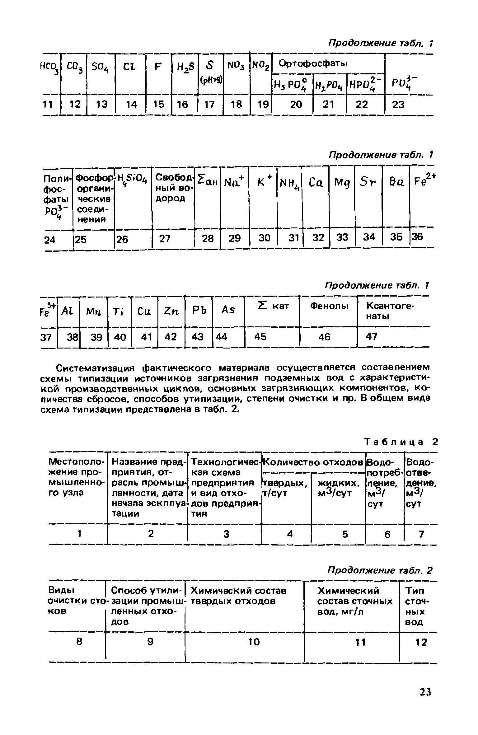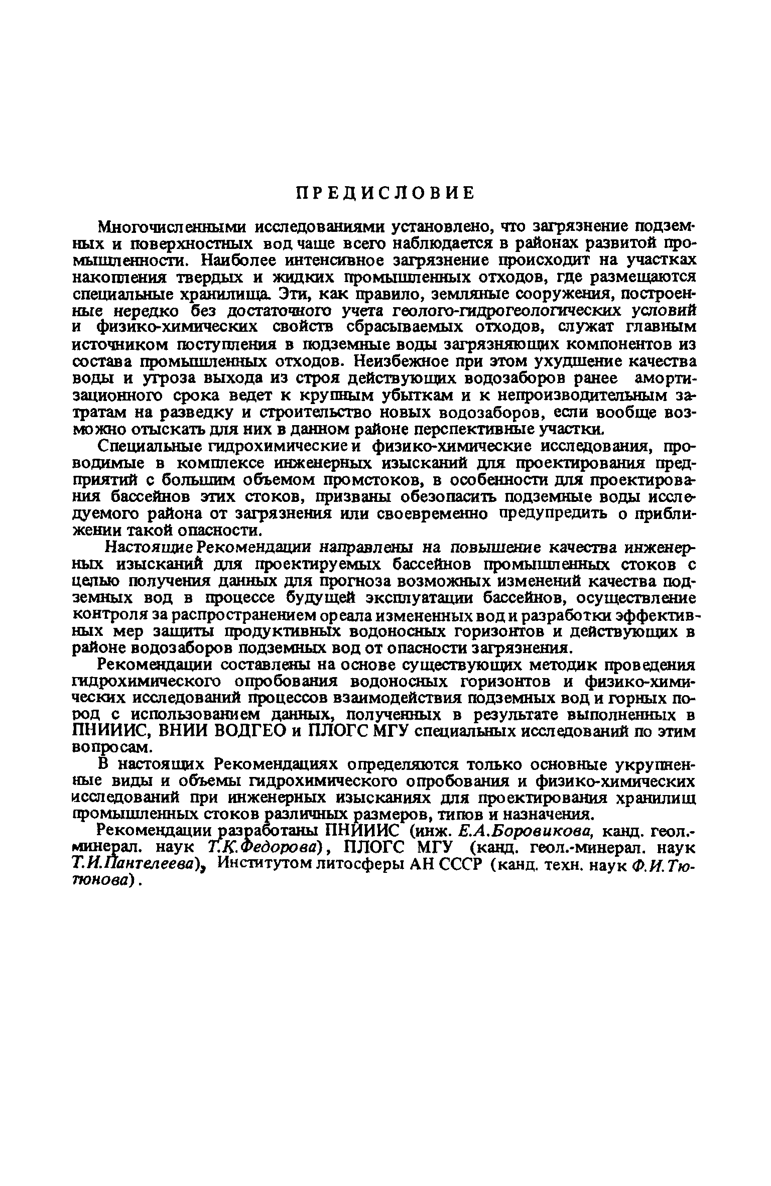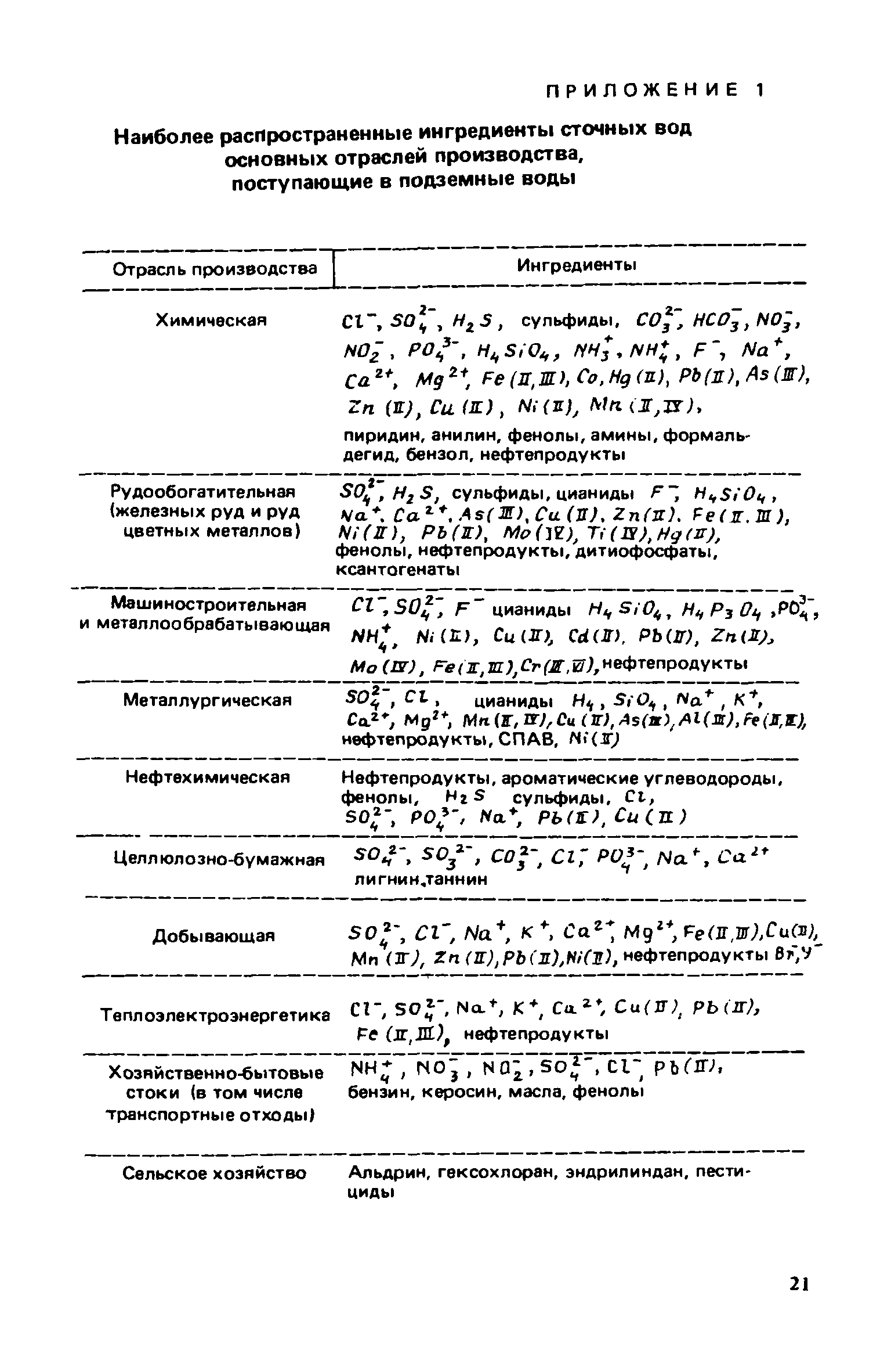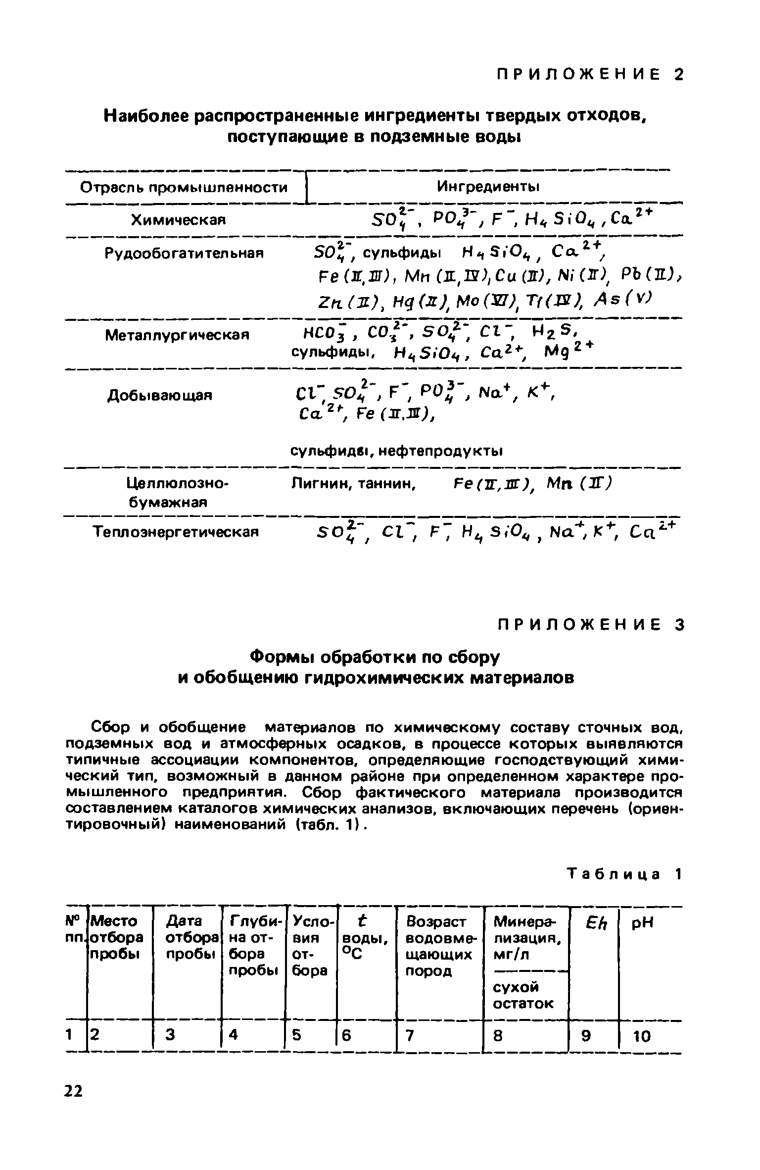 | Оглавление: | Предисловие 1. Общие положения 2. Гидрохимическое опробование 3. Физико-химические исследования Приложение 1. Наиболее распространенные ингредиенты сточных вод основных отраслей производства, поступающие в подземные воды Приложение 2. Наиболее распространенные ингредиенты твердых отходов, поступающие в подземные воды Приложение 3. Формы обработки по сбору и обобщению гидрохимических материалов Приложение 4. Требования к отбору и консервации проб воды Приложение 5. Образец оформления пробы воды Приложение 6. Ведомость проб воды, направляемых на лабораторные исследования Приложение 7. Значения t при данном числе степеней свободы F и данной величине P = 0,05 Приложение 8. Значение F при P = 0,05 Приложение 9. Определение начального удельного объемного содержания растворяемого соединения в породе Rо Приложение 10. Приготовление насыщенного раствора твердого соединения и определение насыщения Cн Приложение 11. Предварительные исследования возможности осаждения компонентов при смешении сточных вод (или их растворов-аналогов) и фоновых подземных вод Приложение 12. Основные уравнения прогноза распространения ингредиентов в одномерном потоке |