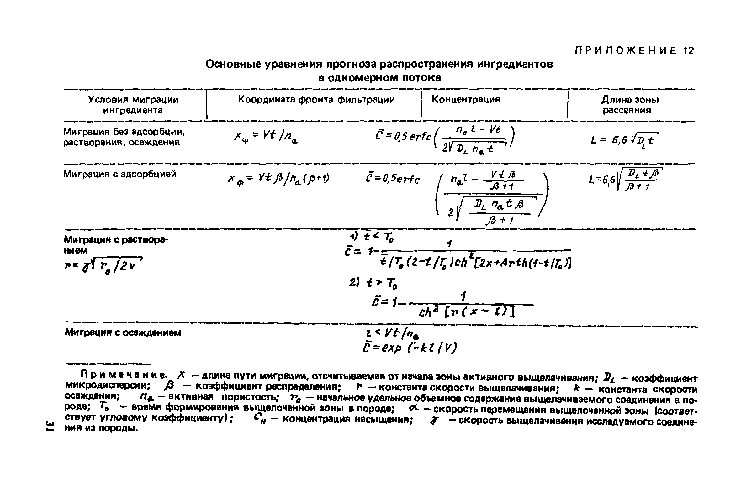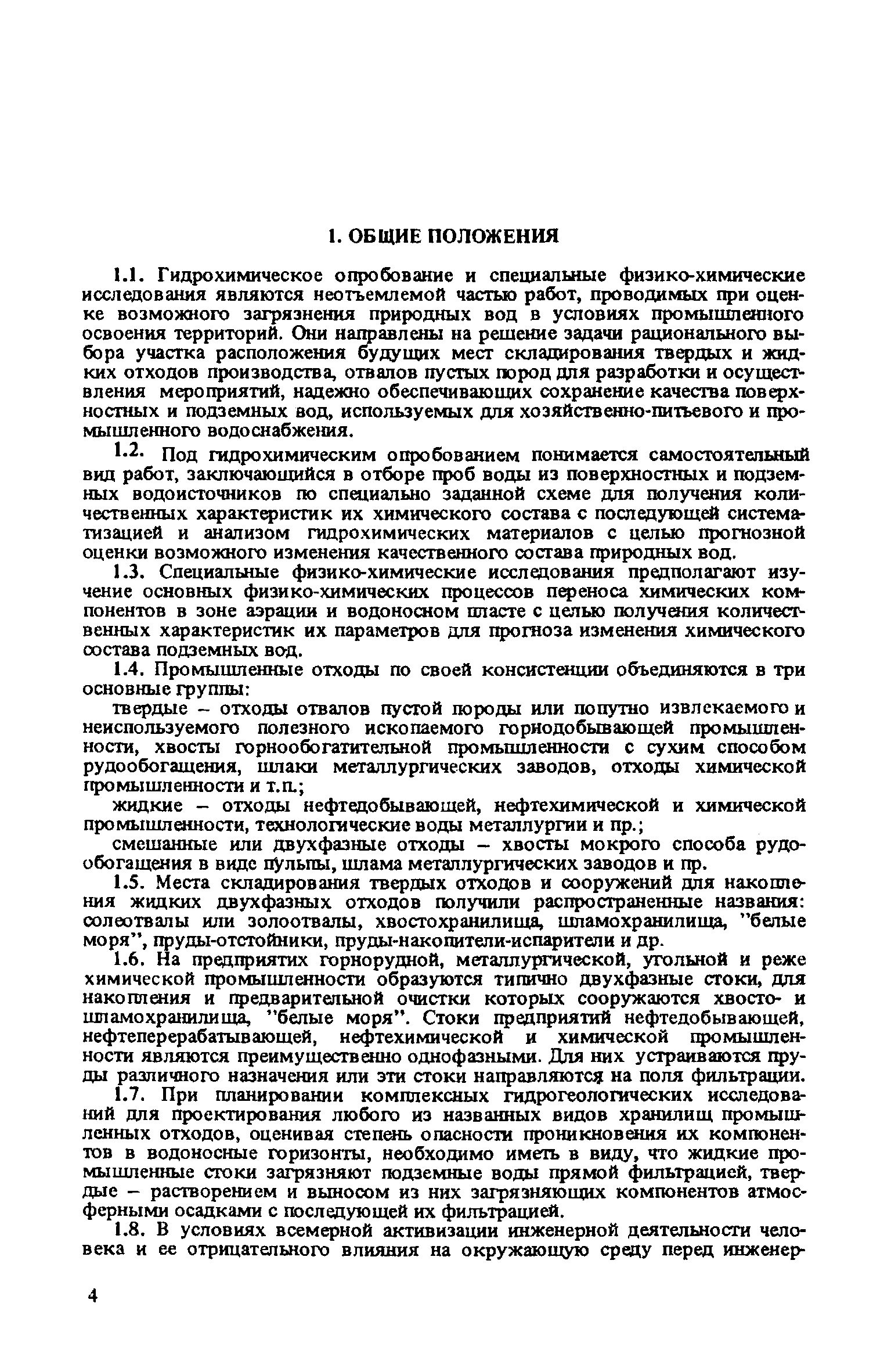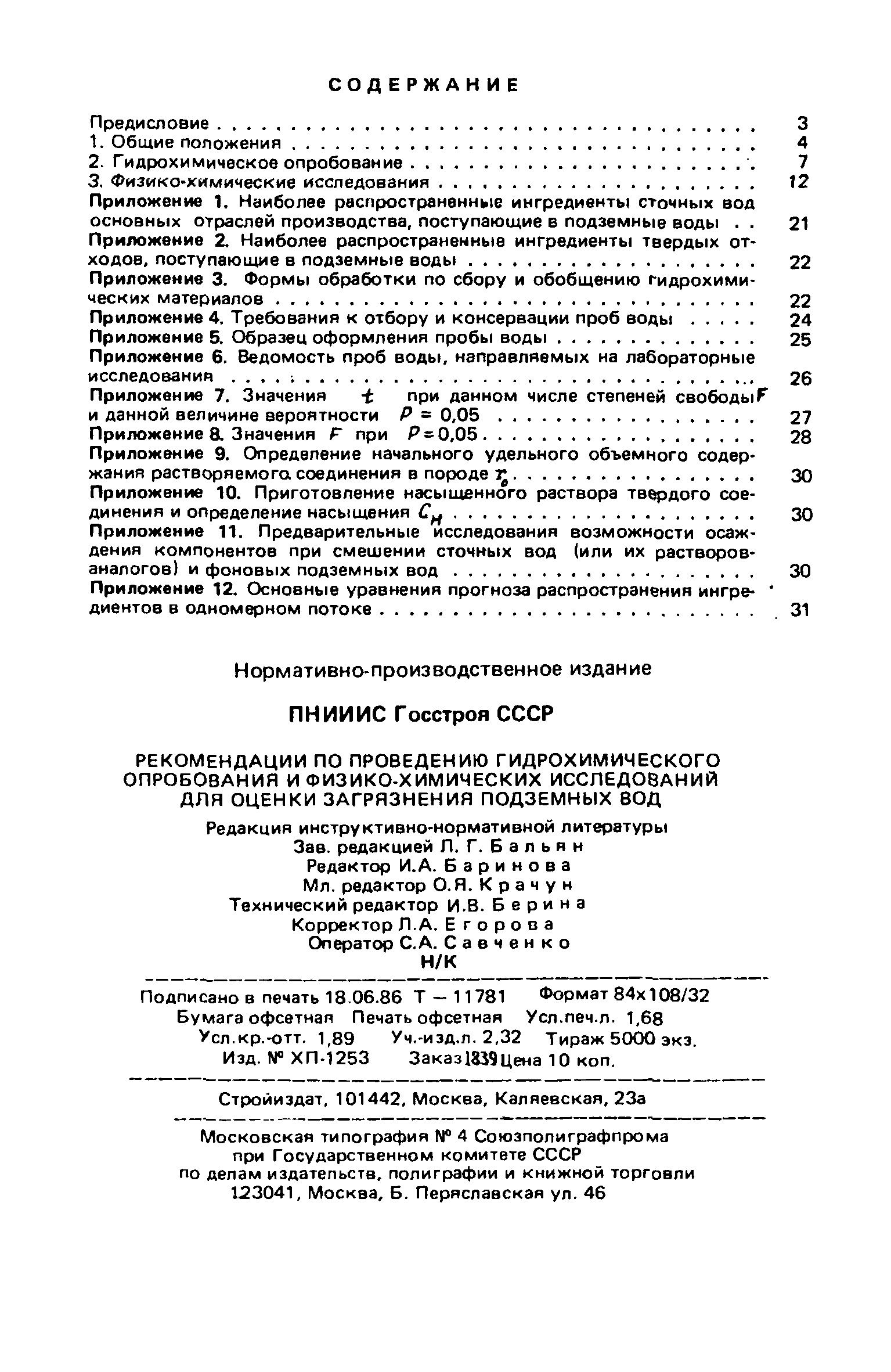 | Оглавление: | Предисловие 1. Общие положения 2. Гидрохимическое опробование 3. Физико-химические исследования Приложение 1. Наиболее распространенные ингредиенты сточных вод основных отраслей производства, поступающие в подземные воды Приложение 2. Наиболее распространенные ингредиенты твердых отходов, поступающие в подземные воды Приложение 3. Формы обработки по сбору и обобщению гидрохимических материалов Приложение 4. Требования к отбору и консервации проб воды Приложение 5. Образец оформления пробы воды Приложение 6. Ведомость проб воды, направляемых на лабораторные исследования Приложение 7. Значения t при данном числе степеней свободы F и данной величине P = 0,05 Приложение 8. Значение F при P = 0,05 Приложение 9. Определение начального удельного объемного содержания растворяемого соединения в породе Rо Приложение 10. Приготовление насыщенного раствора твердого соединения и определение насыщения Cн Приложение 11. Предварительные исследования возможности осаждения компонентов при смешении сточных вод (или их растворов-аналогов) и фоновых подземных вод Приложение 12. Основные уравнения прогноза распространения ингредиентов в одномерном потоке |