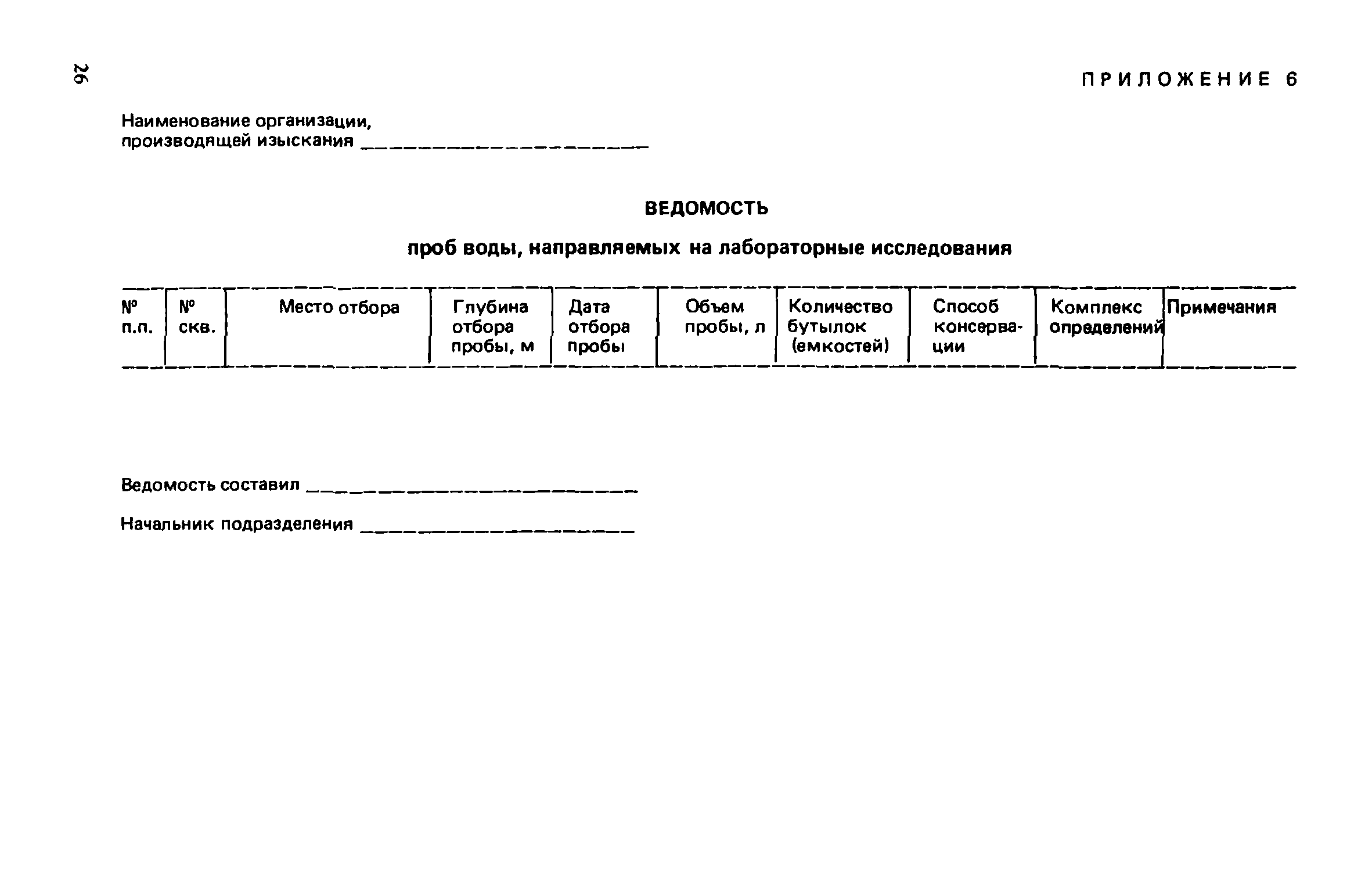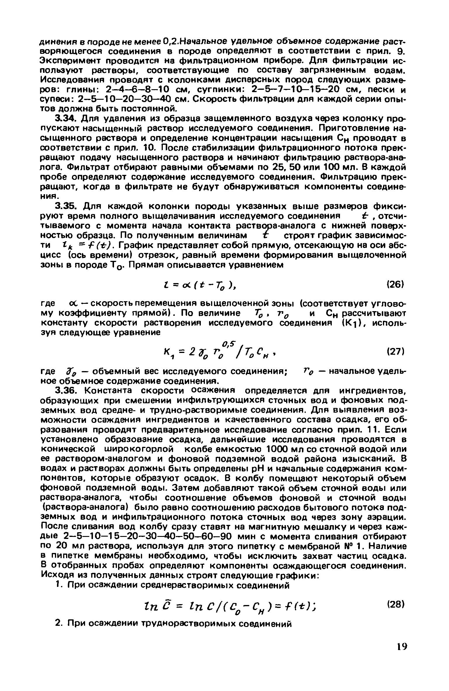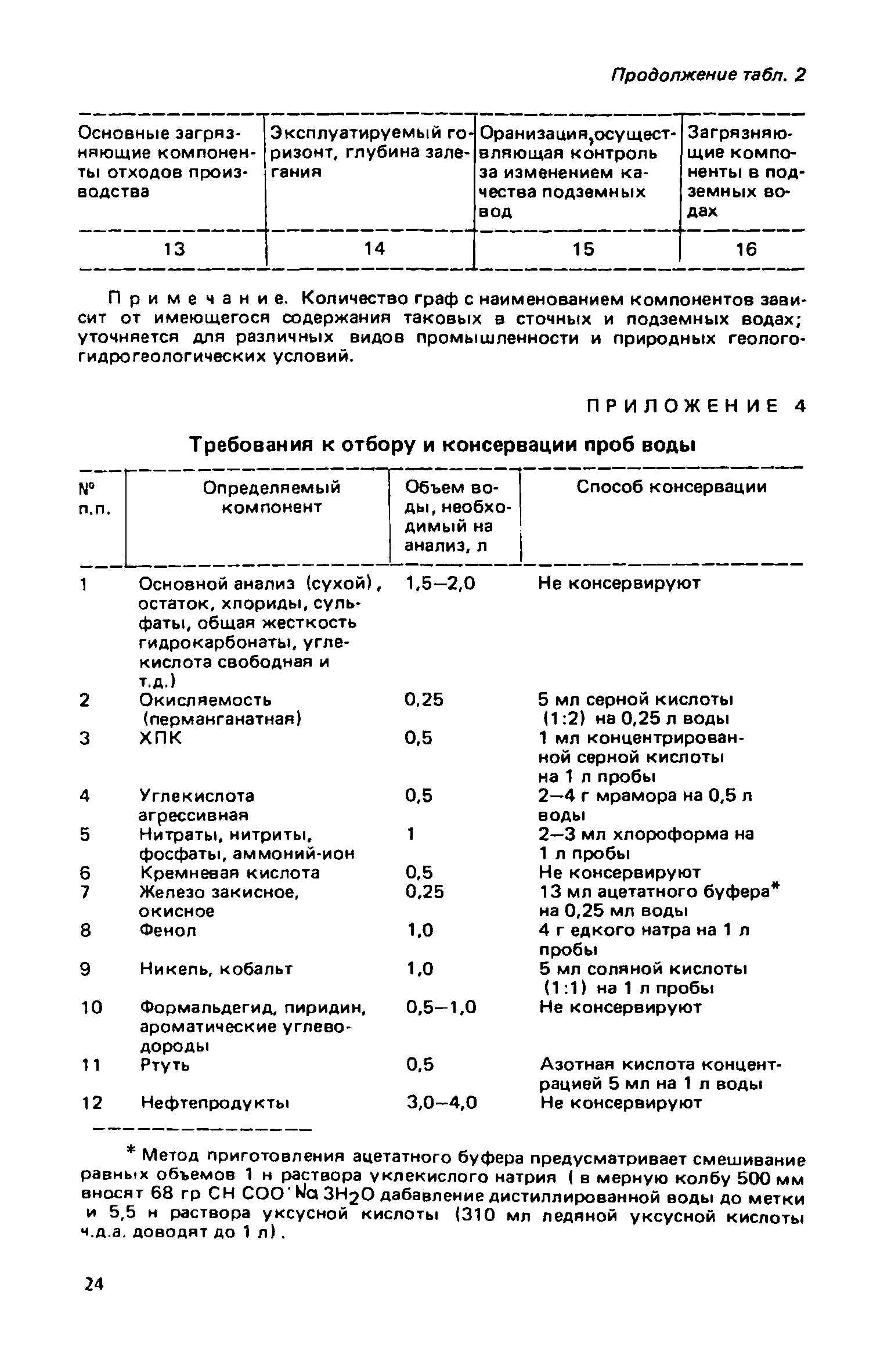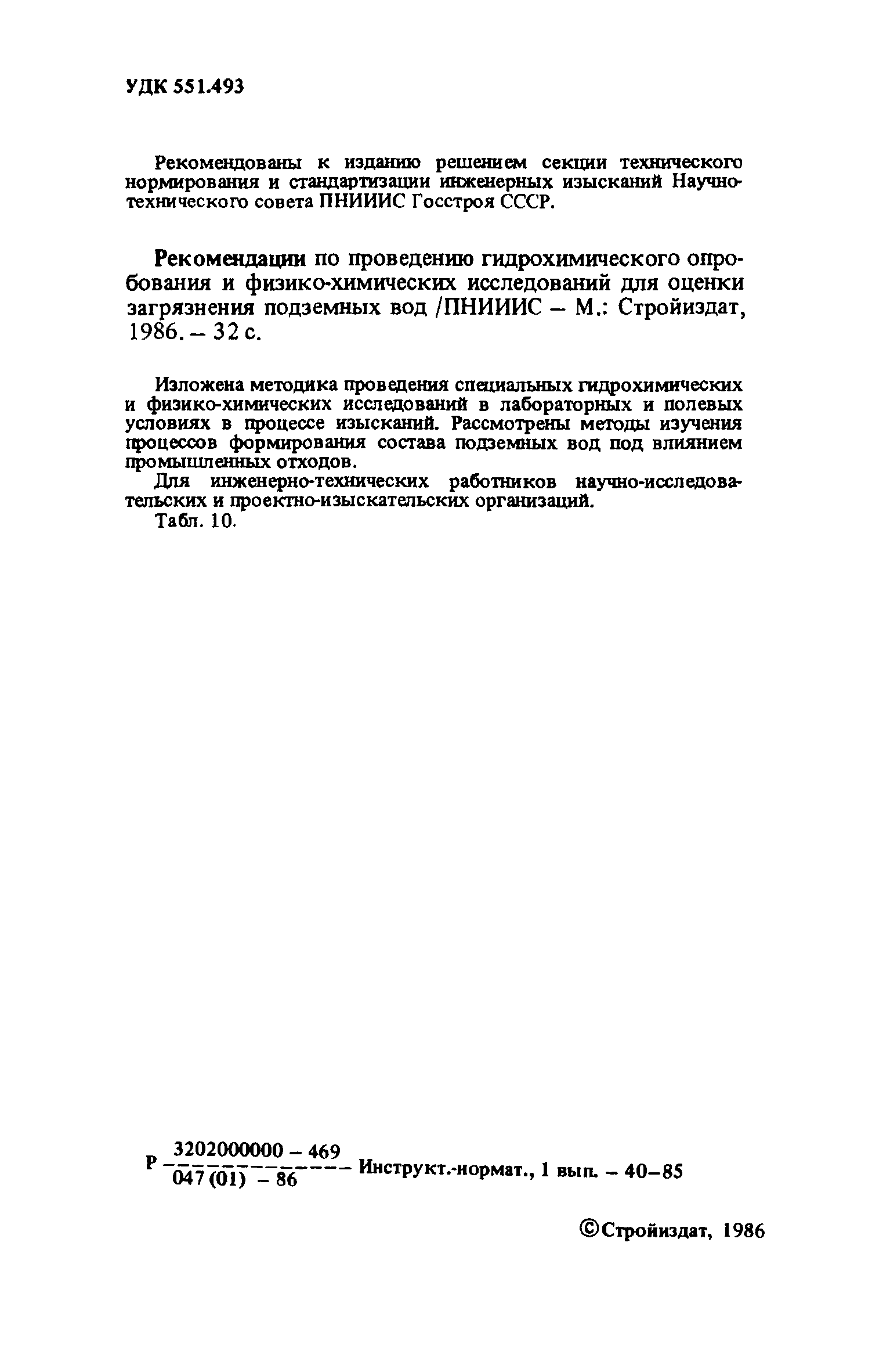 | Оглавление: | Предисловие 1. Общие положения 2. Гидрохимическое опробование 3. Физико-химические исследования Приложение 1. Наиболее распространенные ингредиенты сточных вод основных отраслей производства, поступающие в подземные воды Приложение 2. Наиболее распространенные ингредиенты твердых отходов, поступающие в подземные воды Приложение 3. Формы обработки по сбору и обобщению гидрохимических материалов Приложение 4. Требования к отбору и консервации проб воды Приложение 5. Образец оформления пробы воды Приложение 6. Ведомость проб воды, направляемых на лабораторные исследования Приложение 7. Значения t при данном числе степеней свободы F и данной величине P = 0,05 Приложение 8. Значение F при P = 0,05 Приложение 9. Определение начального удельного объемного содержания растворяемого соединения в породе Rо Приложение 10. Приготовление насыщенного раствора твердого соединения и определение насыщения Cн Приложение 11. Предварительные исследования возможности осаждения компонентов при смешении сточных вод (или их растворов-аналогов) и фоновых подземных вод Приложение 12. Основные уравнения прогноза распространения ингредиентов в одномерном потоке |