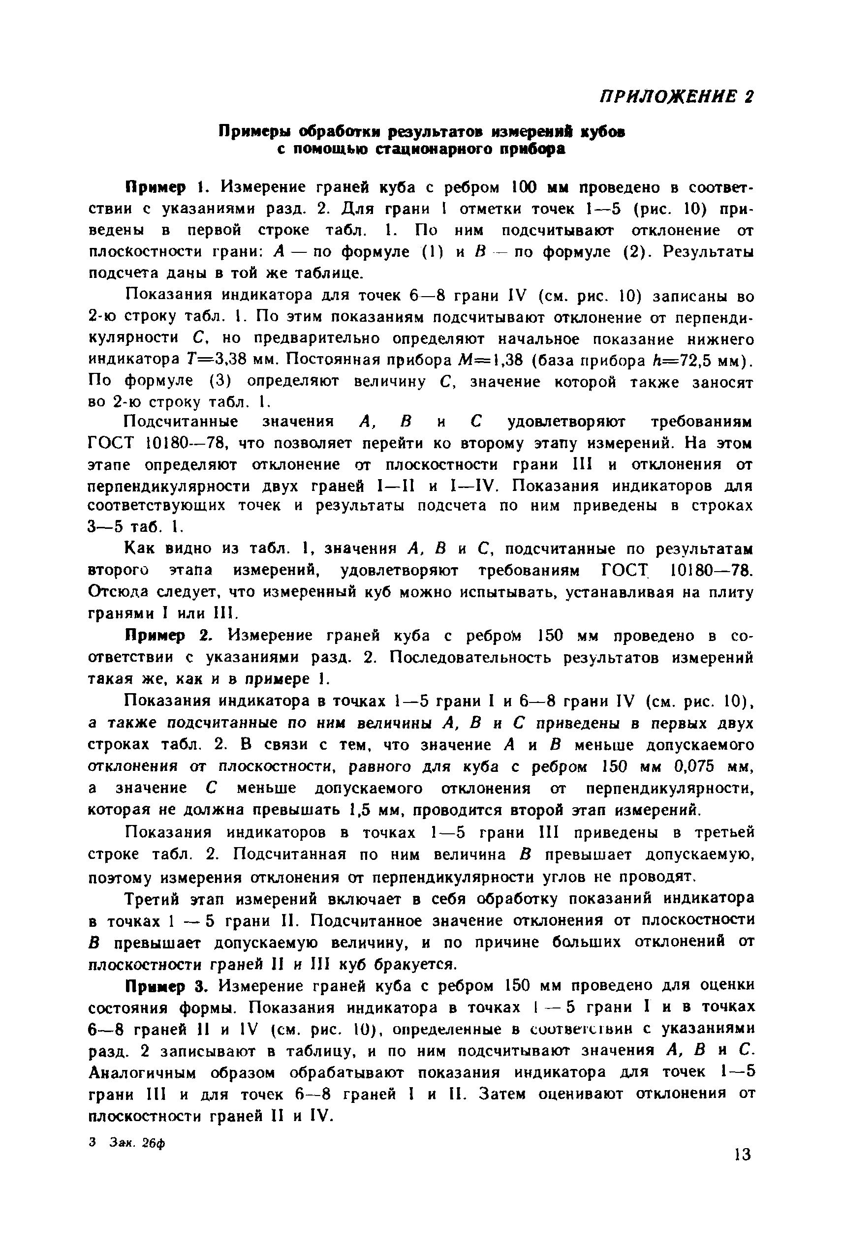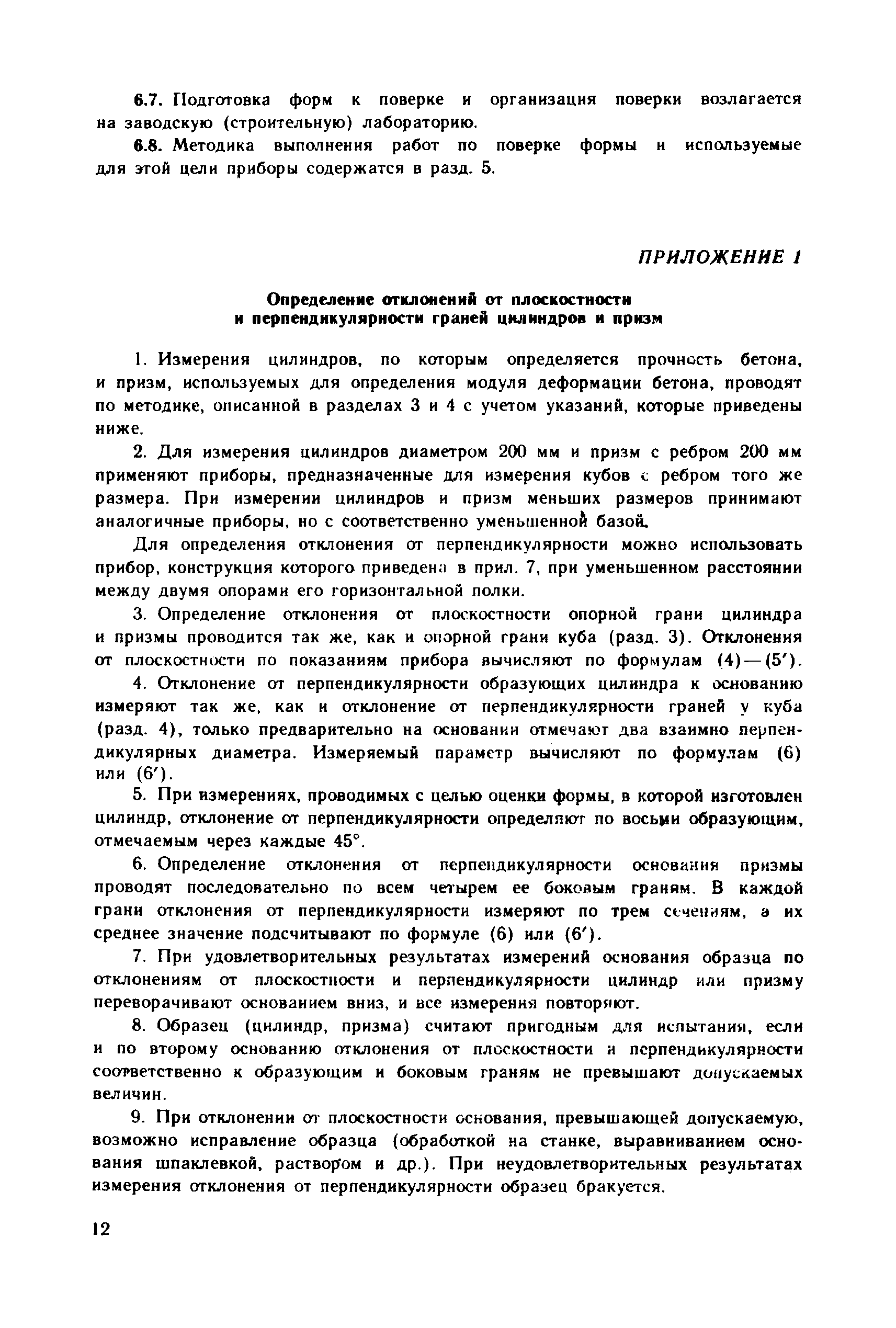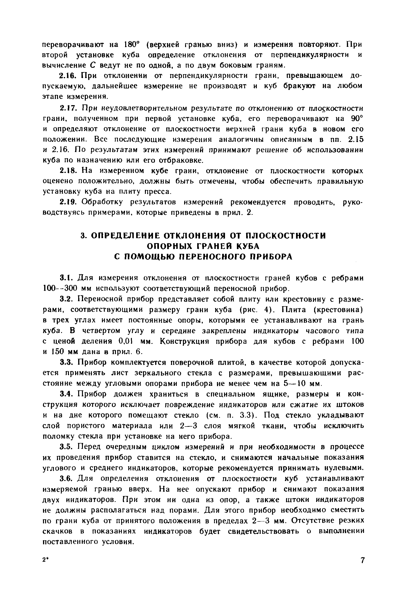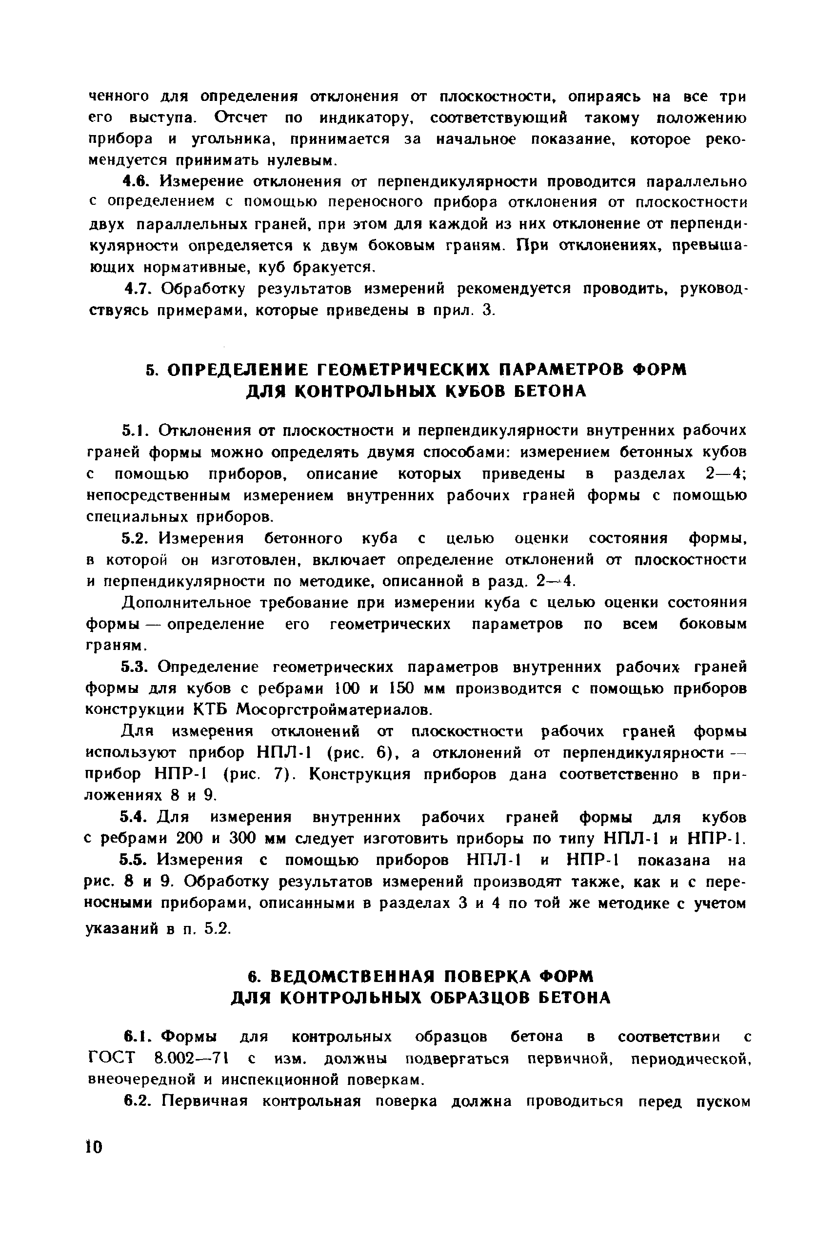 | Оглавление: | 1. Общие положения 2. Определение геометрических параметров опорных граней куба с помощью стационарного прибора 3. Определение отклонения от плоскостности опорных граней куба с помощью переносного прибора 4. Определение отклонения от перпендикулярности граней куба с помощью переносного прибора 5. Определение геометрических параметров форм для контрольных кубов бетона 6. Ведомственная поверка форм для контрольных образцов бетона Приложение 1. Определение отклонений от плоскостности и перпендикулярности граней цилиндров и призм Приложение 2. Примеры обработки результатов измерений кубов с помощью стационарного прибора Приложение 3. Примеры обработки результатов измерений кубов с помощью переносных приборов Приложение 4. Пример обработки результатов измерений формы для кубов Приложение 5. Стационарный прибор для измерения геометрических параметров опорных граней кубов Приложение 6. Переносной прибор для определения отклонений от плоскостности опорных граней куба (НПЛ-4) Приложение 7. Переносной прибор для определения отклонений от перпендикулярности опорных граней куба (НПР-2) Приложение 8. Переносной прибор для определения отклонений от плоскостности граней формы (НПЛ-1) Приложение 9. Переносной прибор для определения отклонения от перпендикулярности граней формы (НПР-1) |