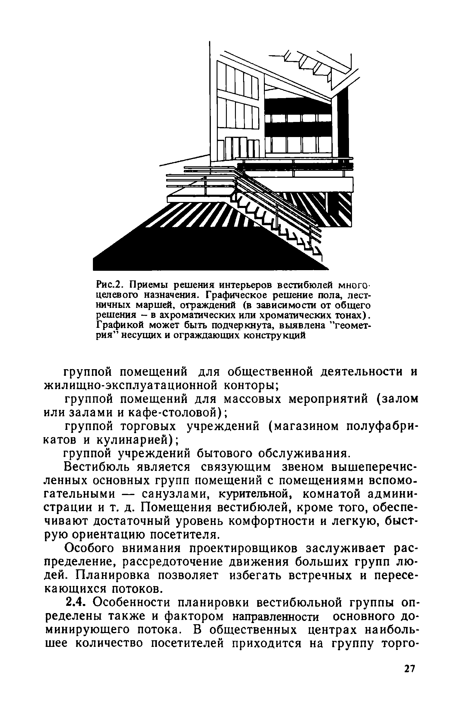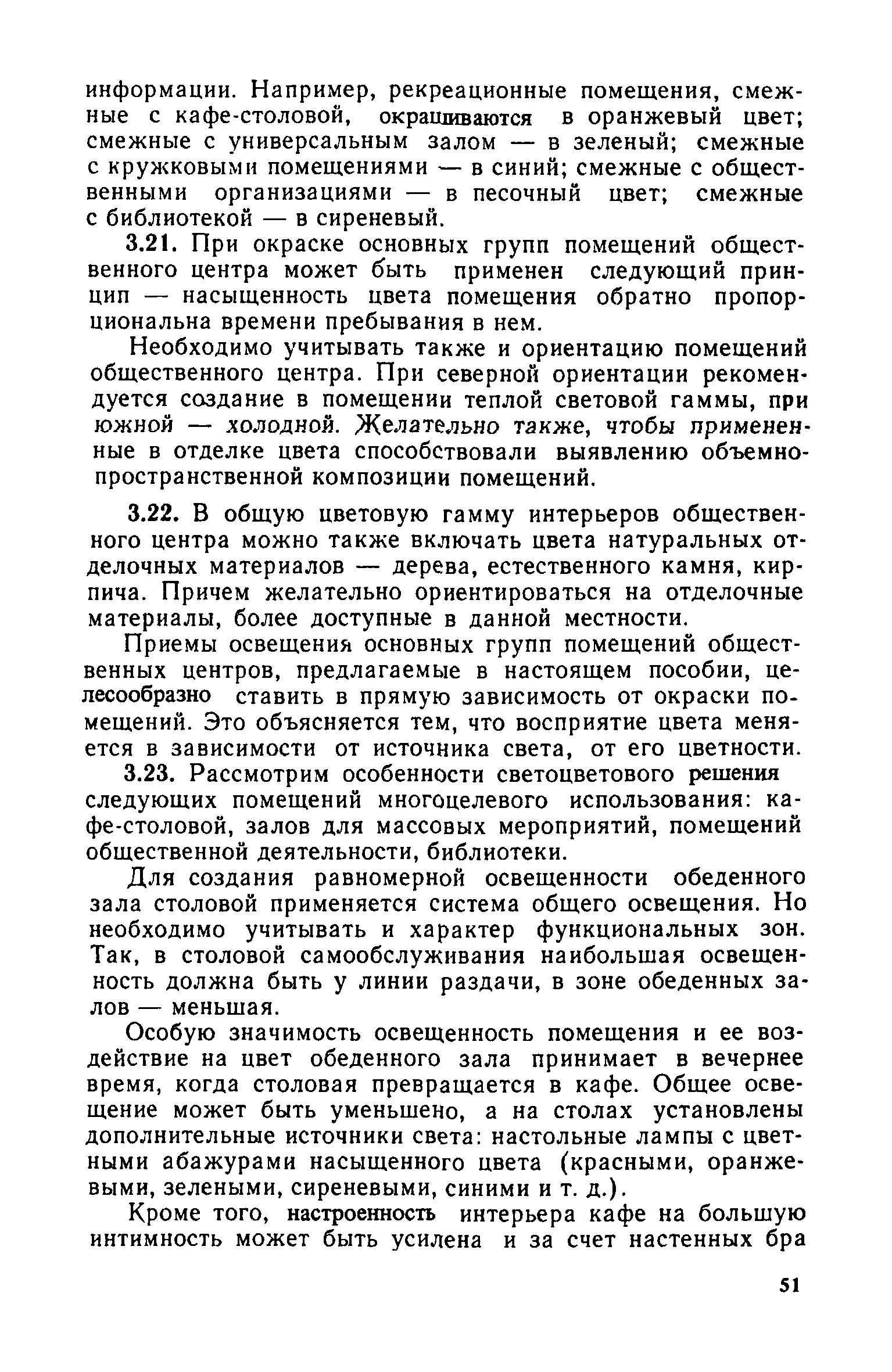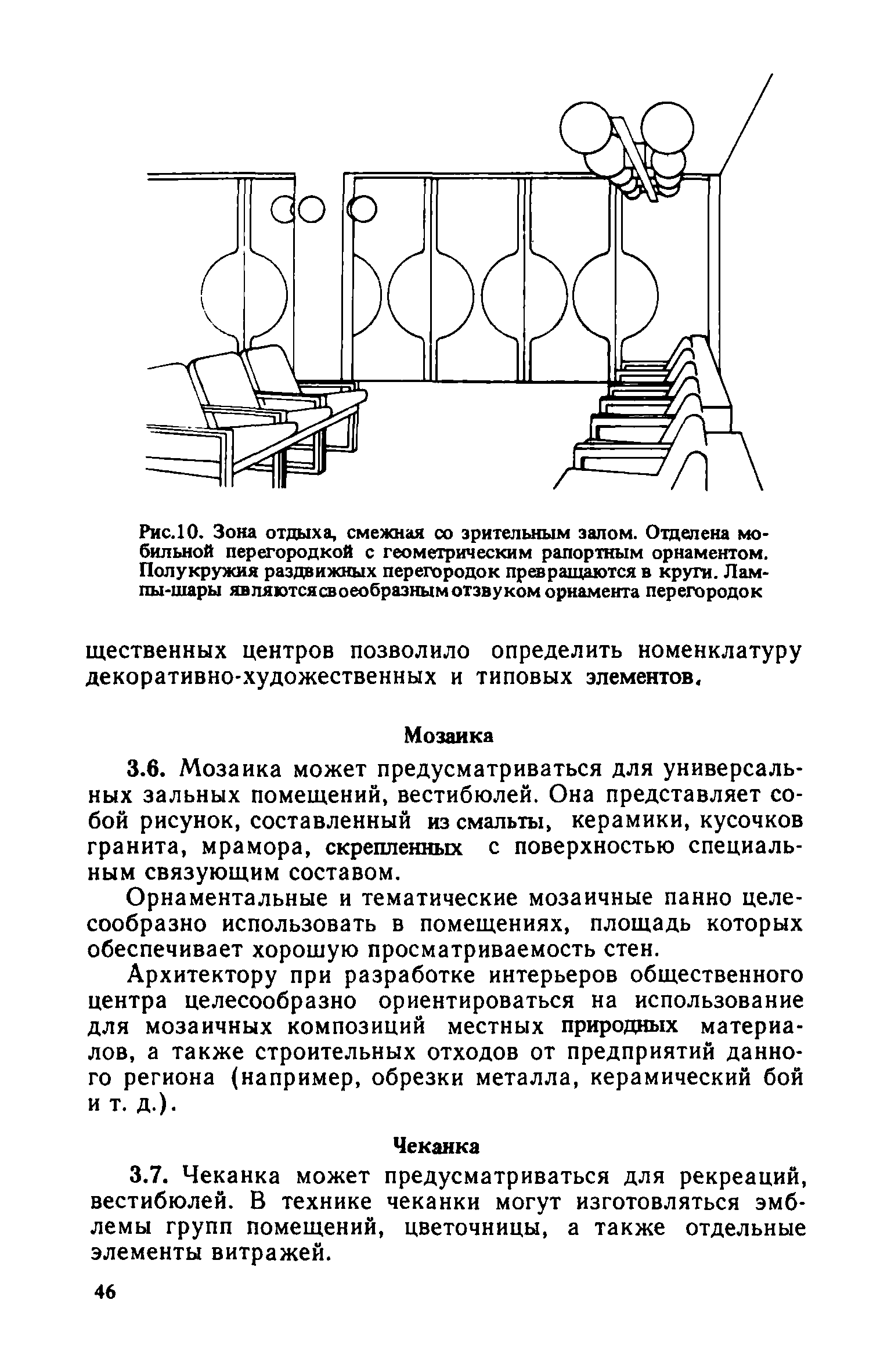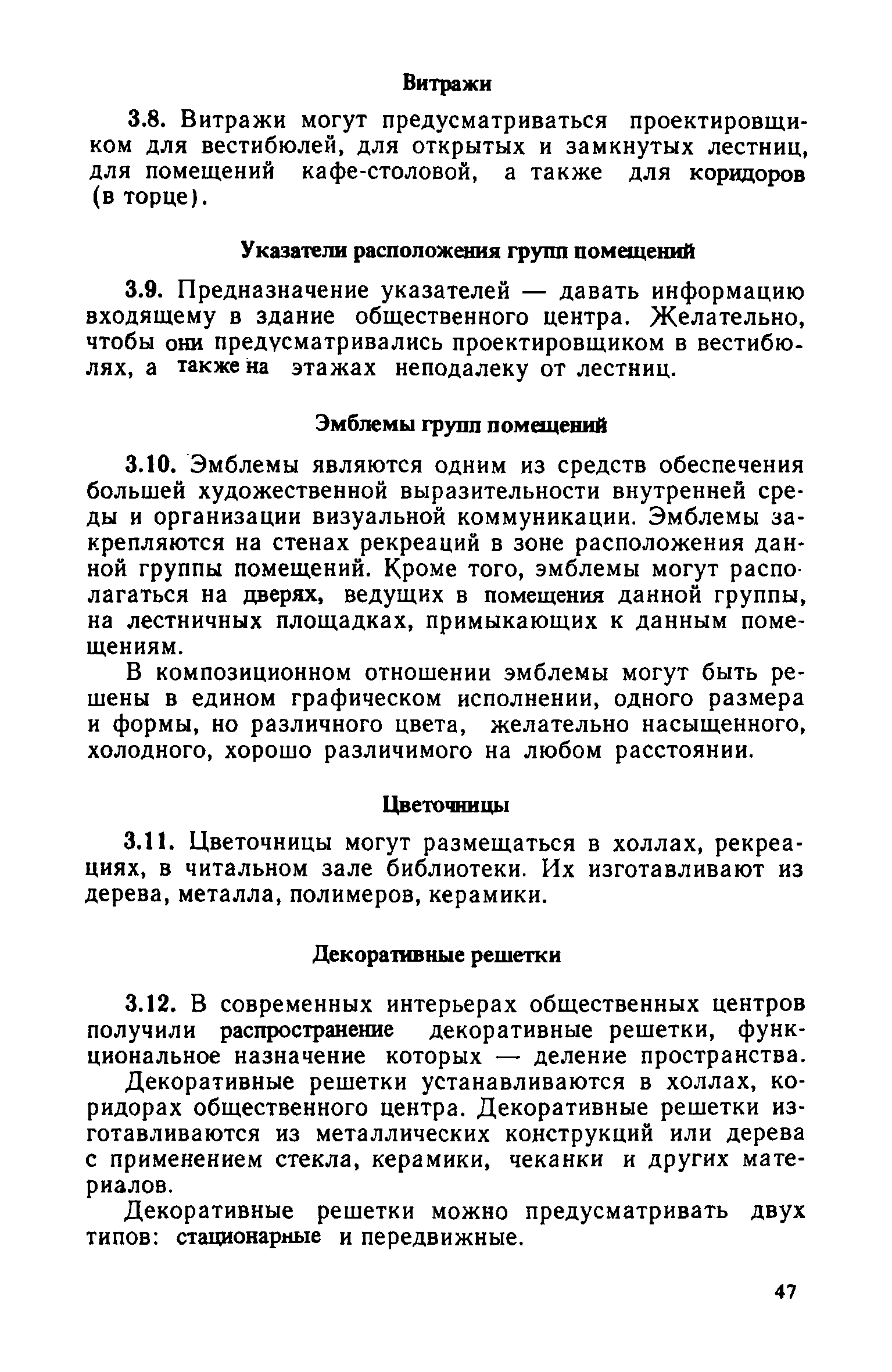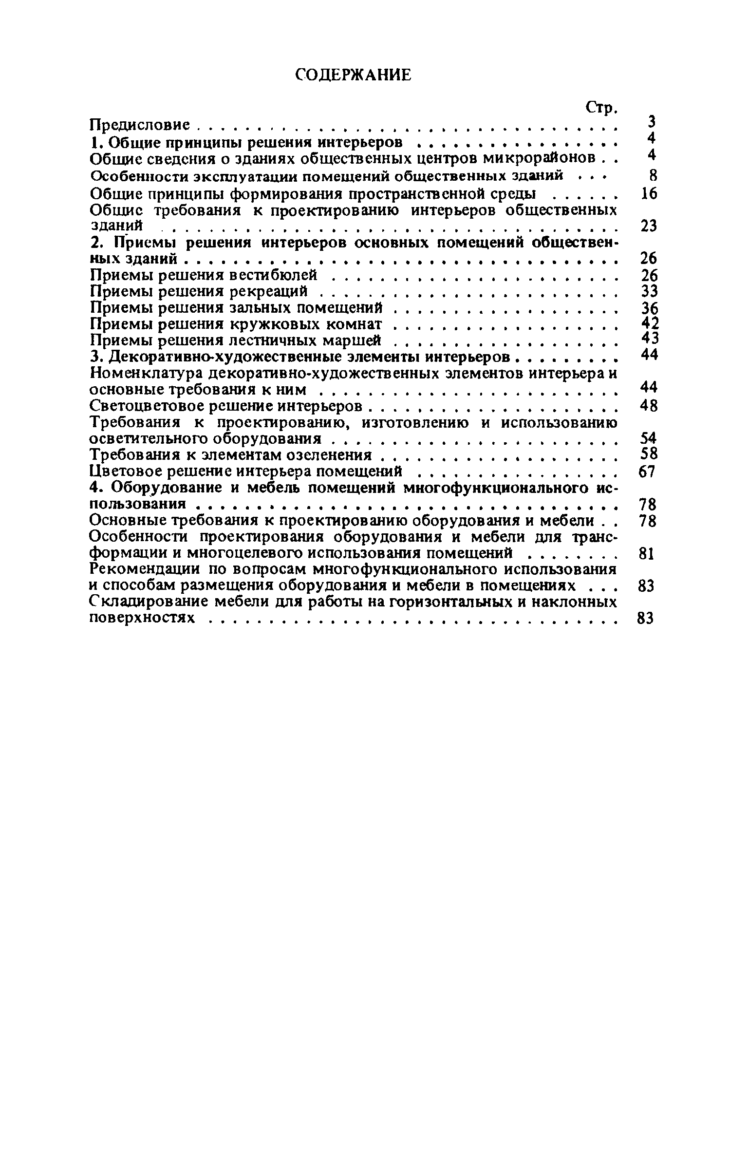 | Оглавление: | Предисловие 1. Общие принципы решения интерьеров Общие сведения о зданиях общественных центров микрорайонов Особенности эксплуатации помещений общественных зданий Общие принципы формирования пространственной среды Общие требования к проектированию интерьеров общественных зданий 2. Приемы решения интерьеров основных помещений общественных зданий Приемы решения вестибюлей Приемы решения рекреаций Приемы решения зальных помещений Приемы решения кружковых комнат Приемы решения лестничных маршей 3. Декоративно-художественные элементы интерьеров Номенклатура декоративно-художественных элементов интерьера и основные требования к ним Светоцветовое решение интерьеров Требования к проектированию, изготовлению и использованию осветительного оборудования Требования к элементам озеленения Цветовое решение интерьера помещений 4. Оборудование и мебель помещений многофункционального пользования Основные требования к проектированию оборудования и мебели Особенности проектирования оборудования и мебели для трансформации и многоцелевого использования помещений Рекомендации по вопросам многофункционального использования и способам размещения оборудования и мебели в помещениях Складирование мебели для работы на горизонтальных и наклонных поверхностях |