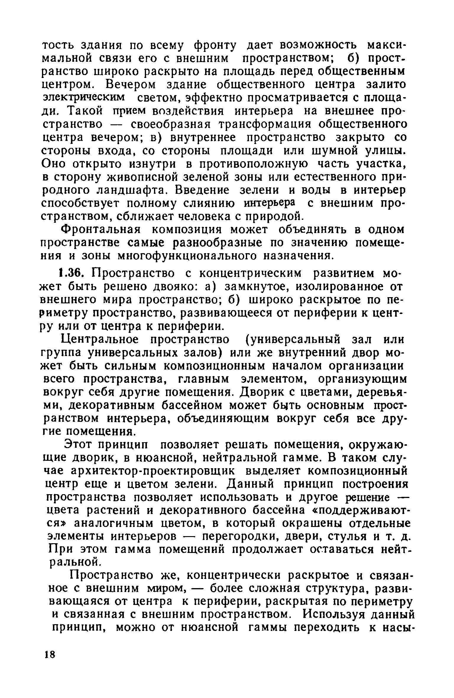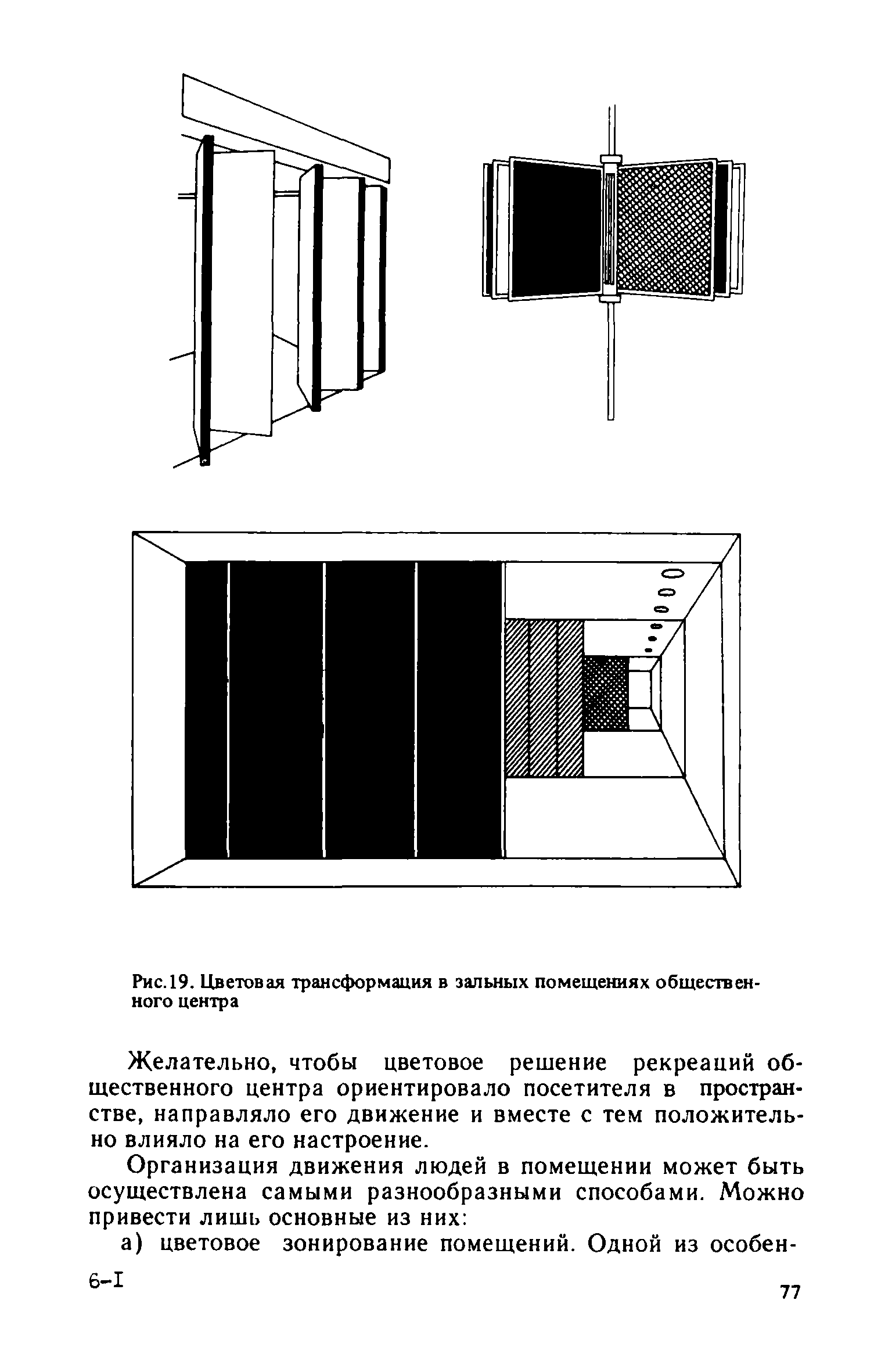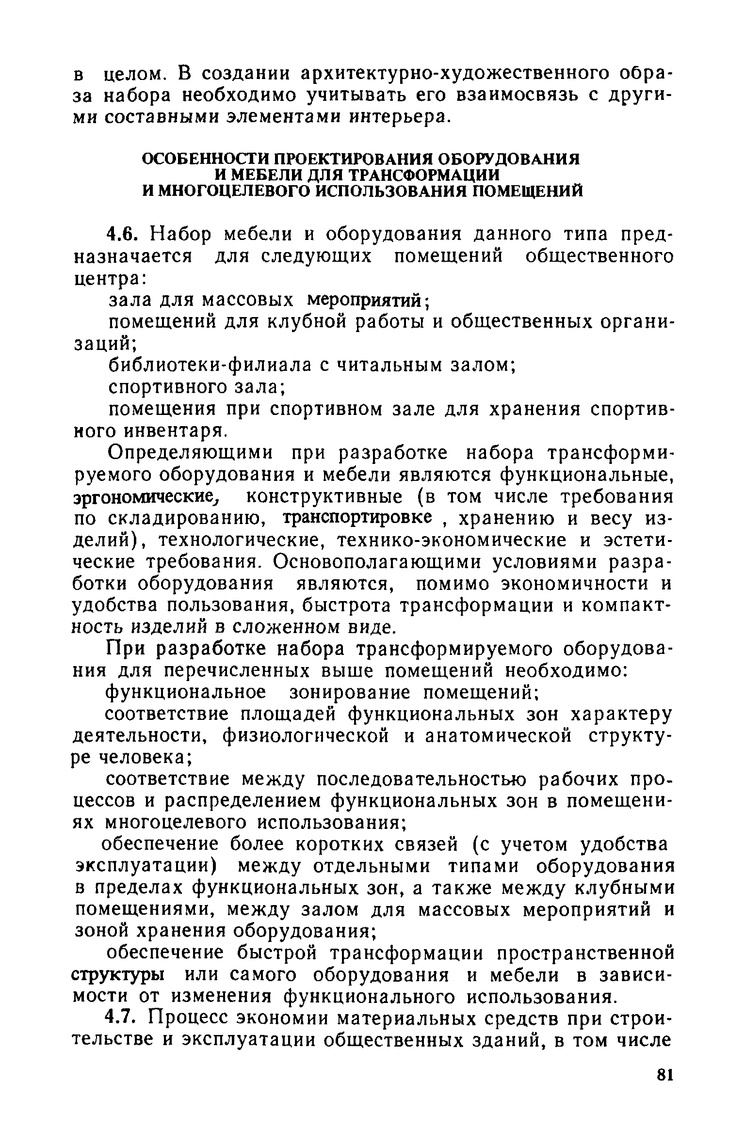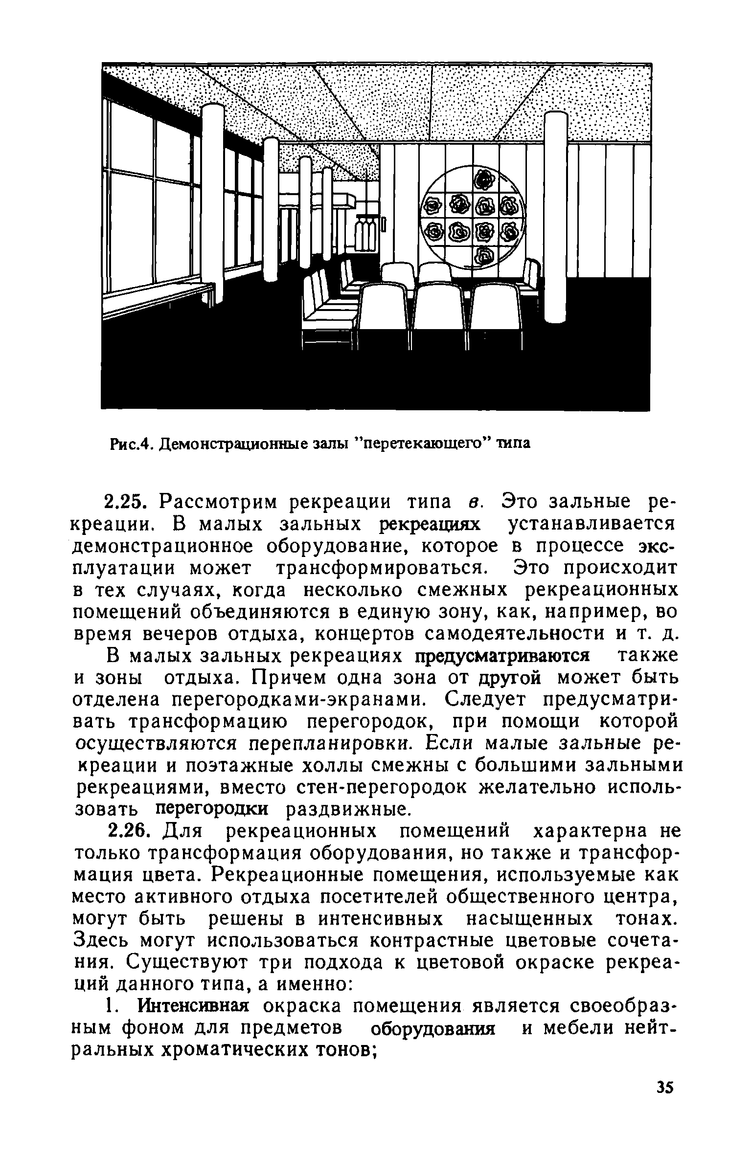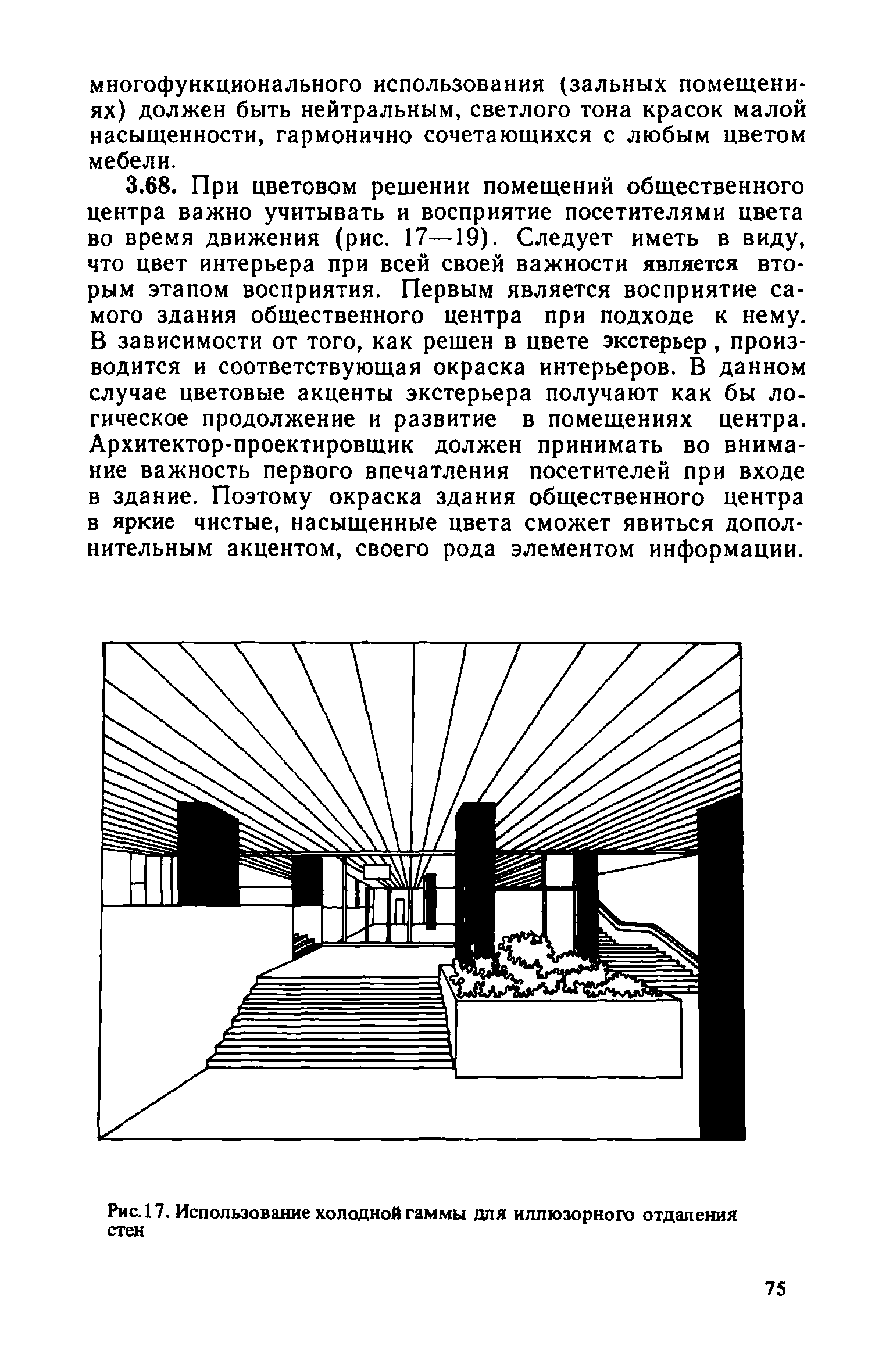 | Оглавление: | Предисловие 1. Общие принципы решения интерьеров Общие сведения о зданиях общественных центров микрорайонов Особенности эксплуатации помещений общественных зданий Общие принципы формирования пространственной среды Общие требования к проектированию интерьеров общественных зданий 2. Приемы решения интерьеров основных помещений общественных зданий Приемы решения вестибюлей Приемы решения рекреаций Приемы решения зальных помещений Приемы решения кружковых комнат Приемы решения лестничных маршей 3. Декоративно-художественные элементы интерьеров Номенклатура декоративно-художественных элементов интерьера и основные требования к ним Светоцветовое решение интерьеров Требования к проектированию, изготовлению и использованию осветительного оборудования Требования к элементам озеленения Цветовое решение интерьера помещений 4. Оборудование и мебель помещений многофункционального пользования Основные требования к проектированию оборудования и мебели Особенности проектирования оборудования и мебели для трансформации и многоцелевого использования помещений Рекомендации по вопросам многофункционального использования и способам размещения оборудования и мебели в помещениях Складирование мебели для работы на горизонтальных и наклонных поверхностях |