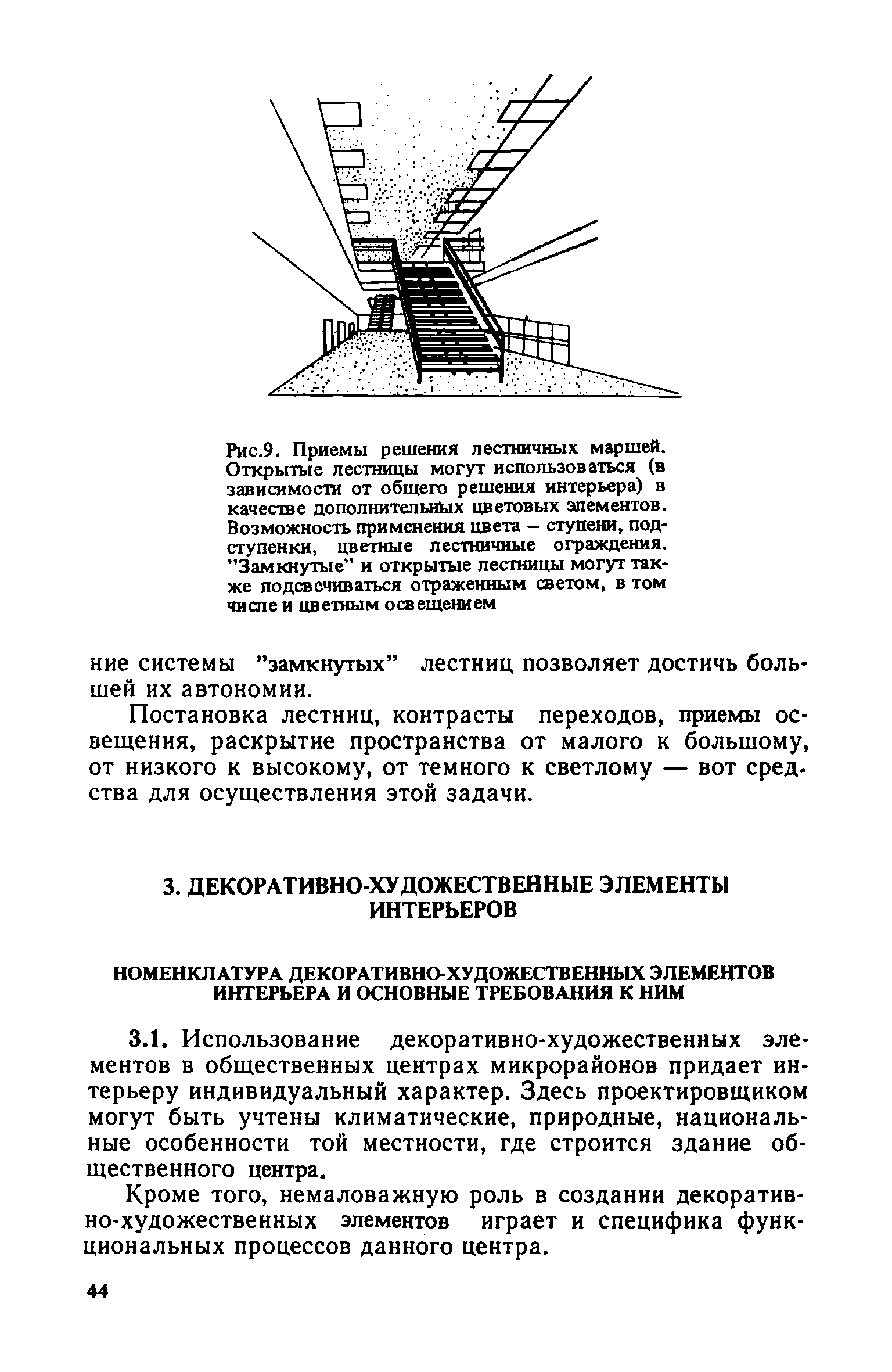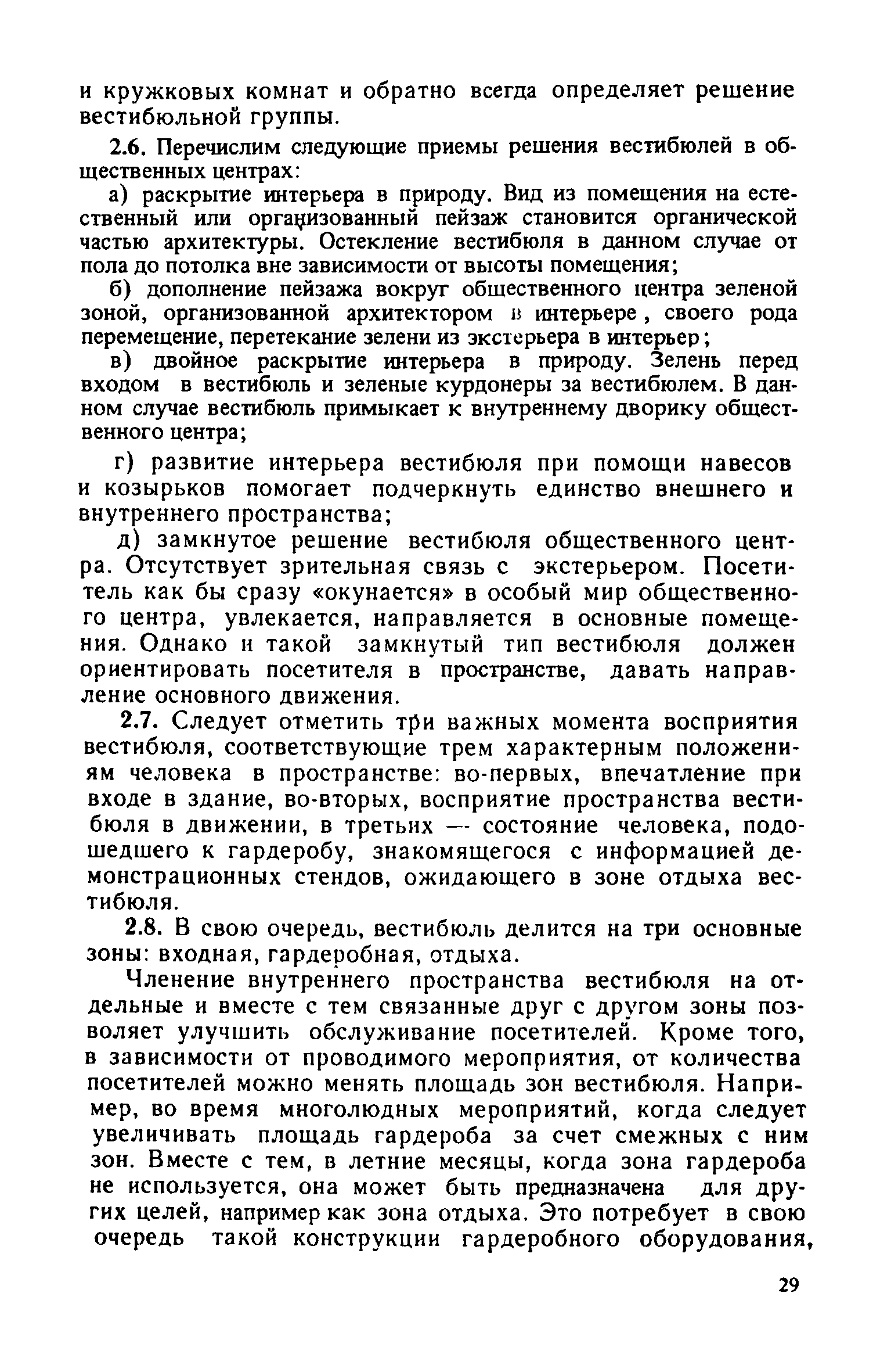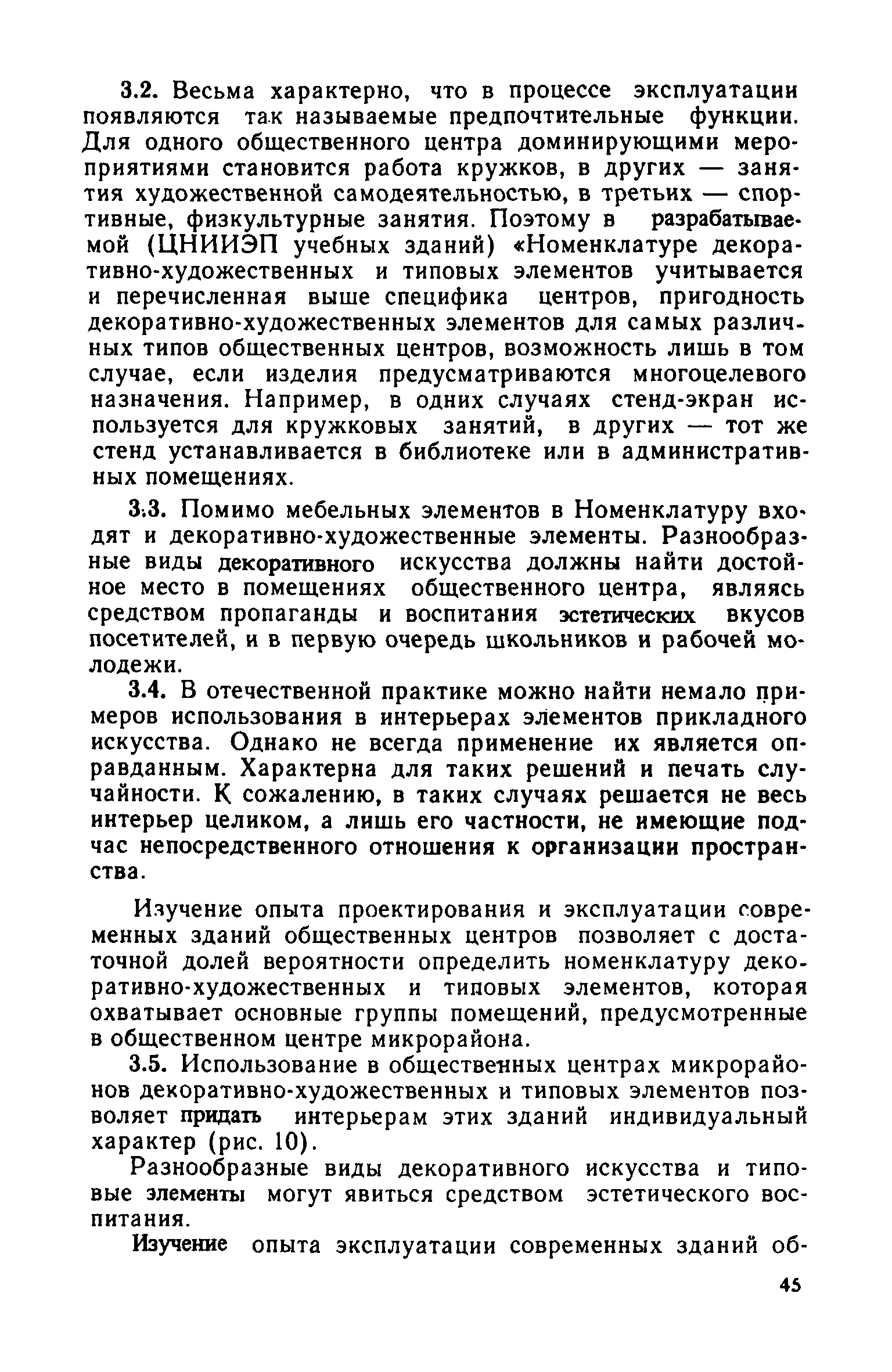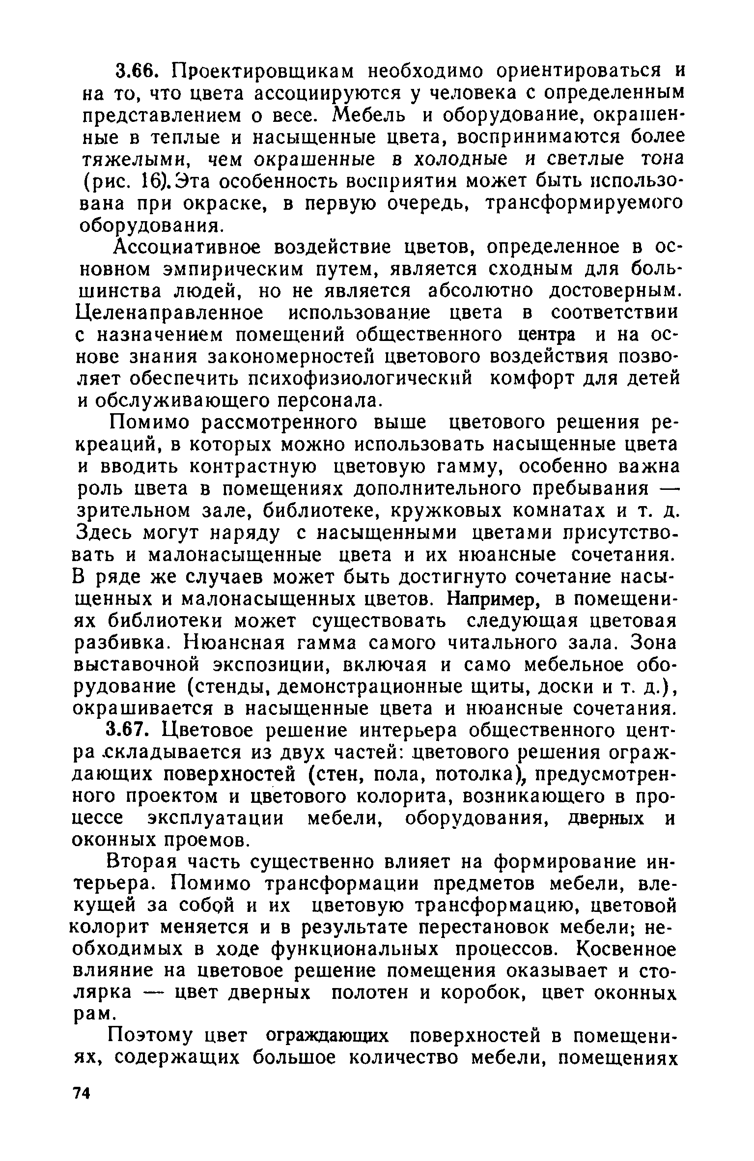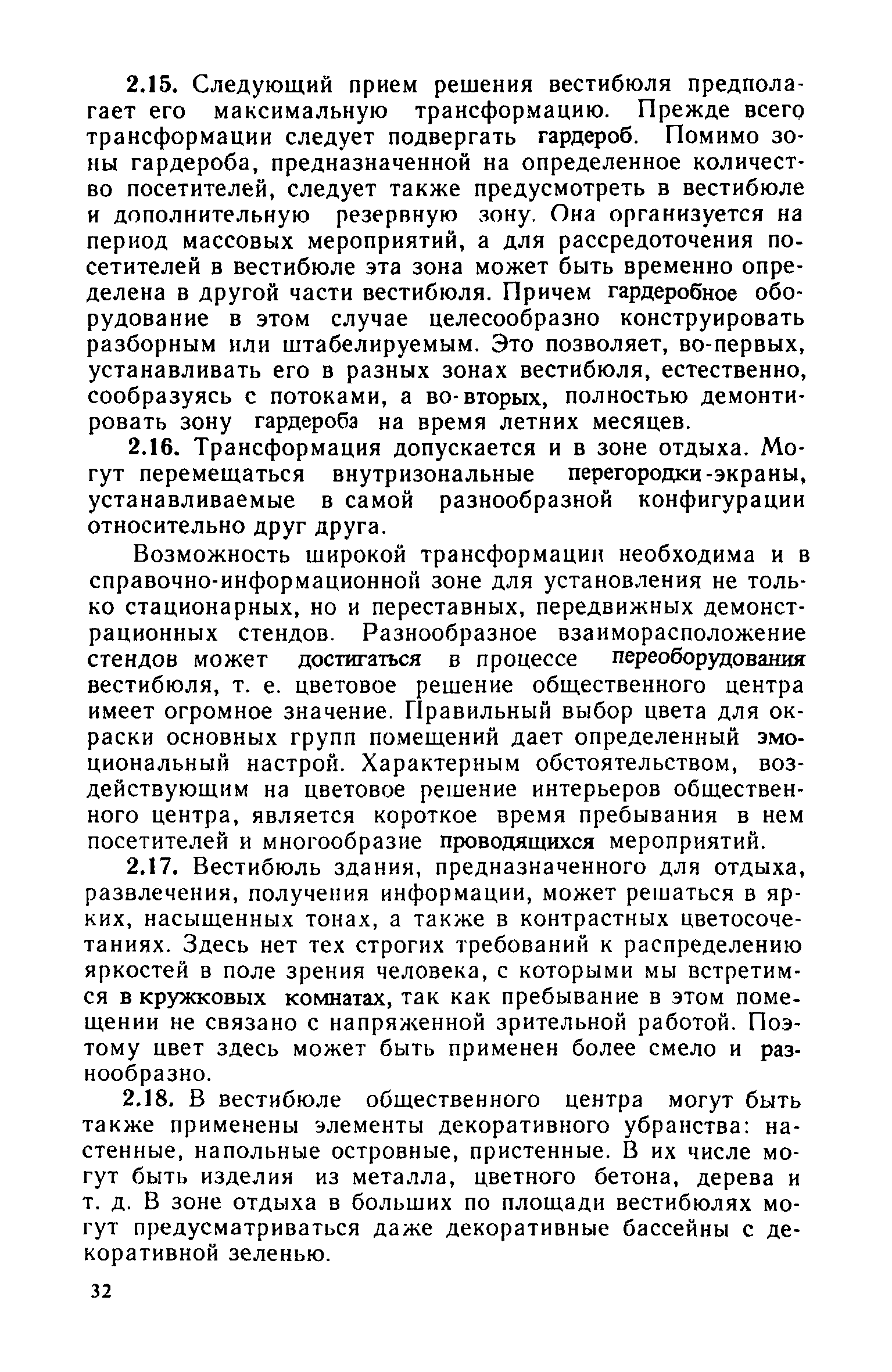 | Оглавление: | Предисловие 1. Общие принципы решения интерьеров Общие сведения о зданиях общественных центров микрорайонов Особенности эксплуатации помещений общественных зданий Общие принципы формирования пространственной среды Общие требования к проектированию интерьеров общественных зданий 2. Приемы решения интерьеров основных помещений общественных зданий Приемы решения вестибюлей Приемы решения рекреаций Приемы решения зальных помещений Приемы решения кружковых комнат Приемы решения лестничных маршей 3. Декоративно-художественные элементы интерьеров Номенклатура декоративно-художественных элементов интерьера и основные требования к ним Светоцветовое решение интерьеров Требования к проектированию, изготовлению и использованию осветительного оборудования Требования к элементам озеленения Цветовое решение интерьера помещений 4. Оборудование и мебель помещений многофункционального пользования Основные требования к проектированию оборудования и мебели Особенности проектирования оборудования и мебели для трансформации и многоцелевого использования помещений Рекомендации по вопросам многофункционального использования и способам размещения оборудования и мебели в помещениях Складирование мебели для работы на горизонтальных и наклонных поверхностях |