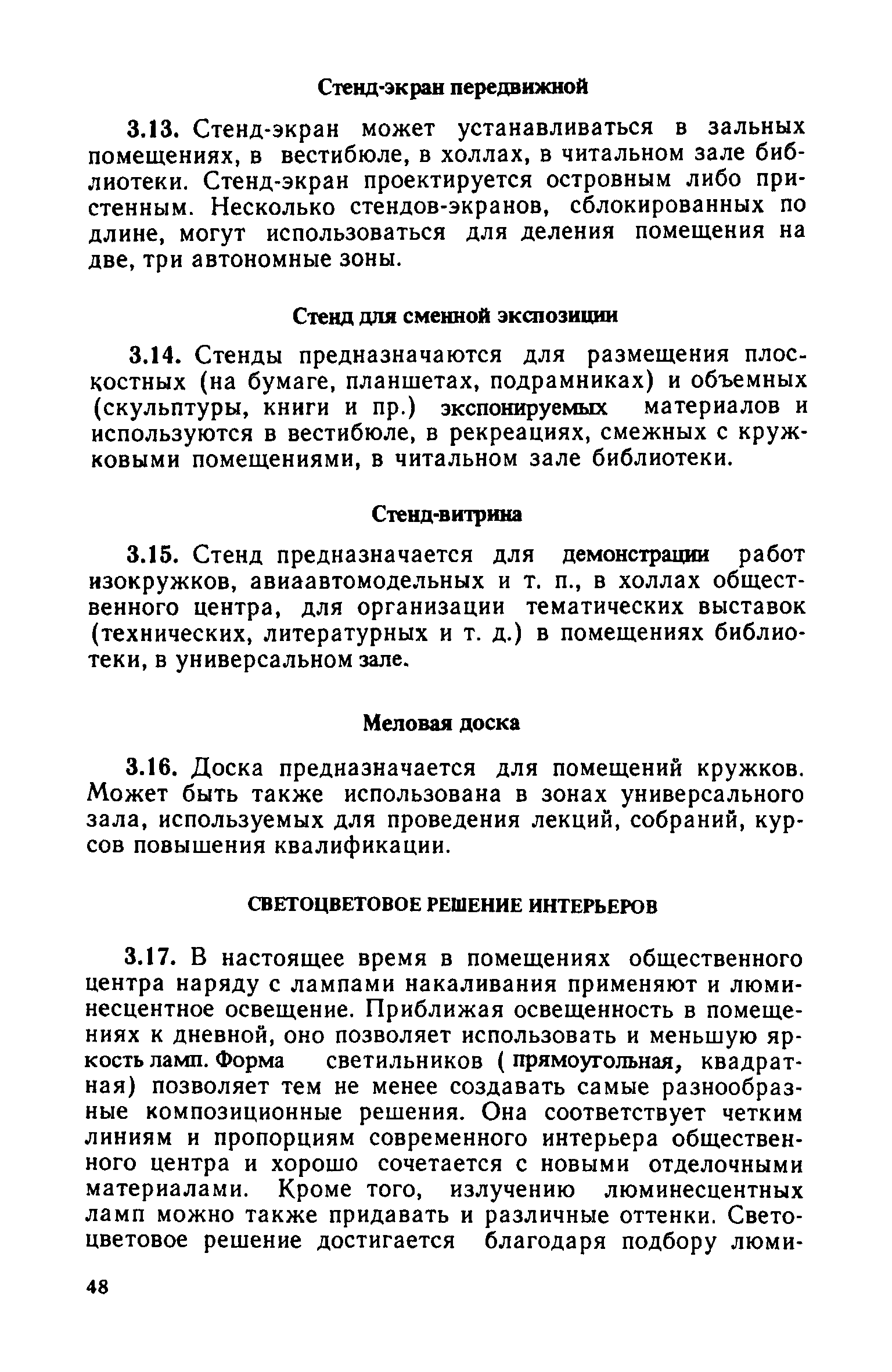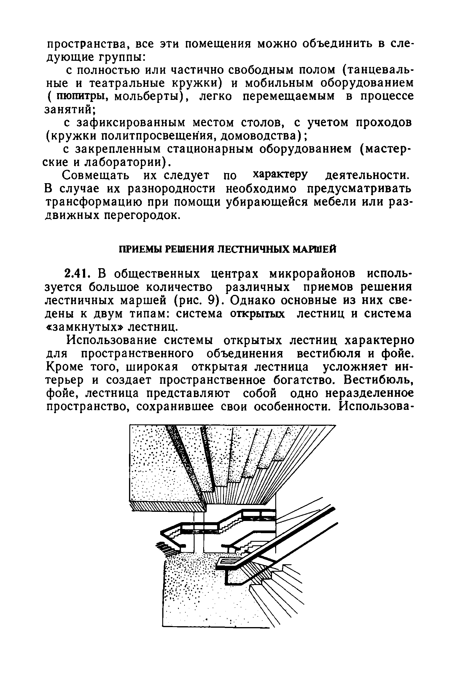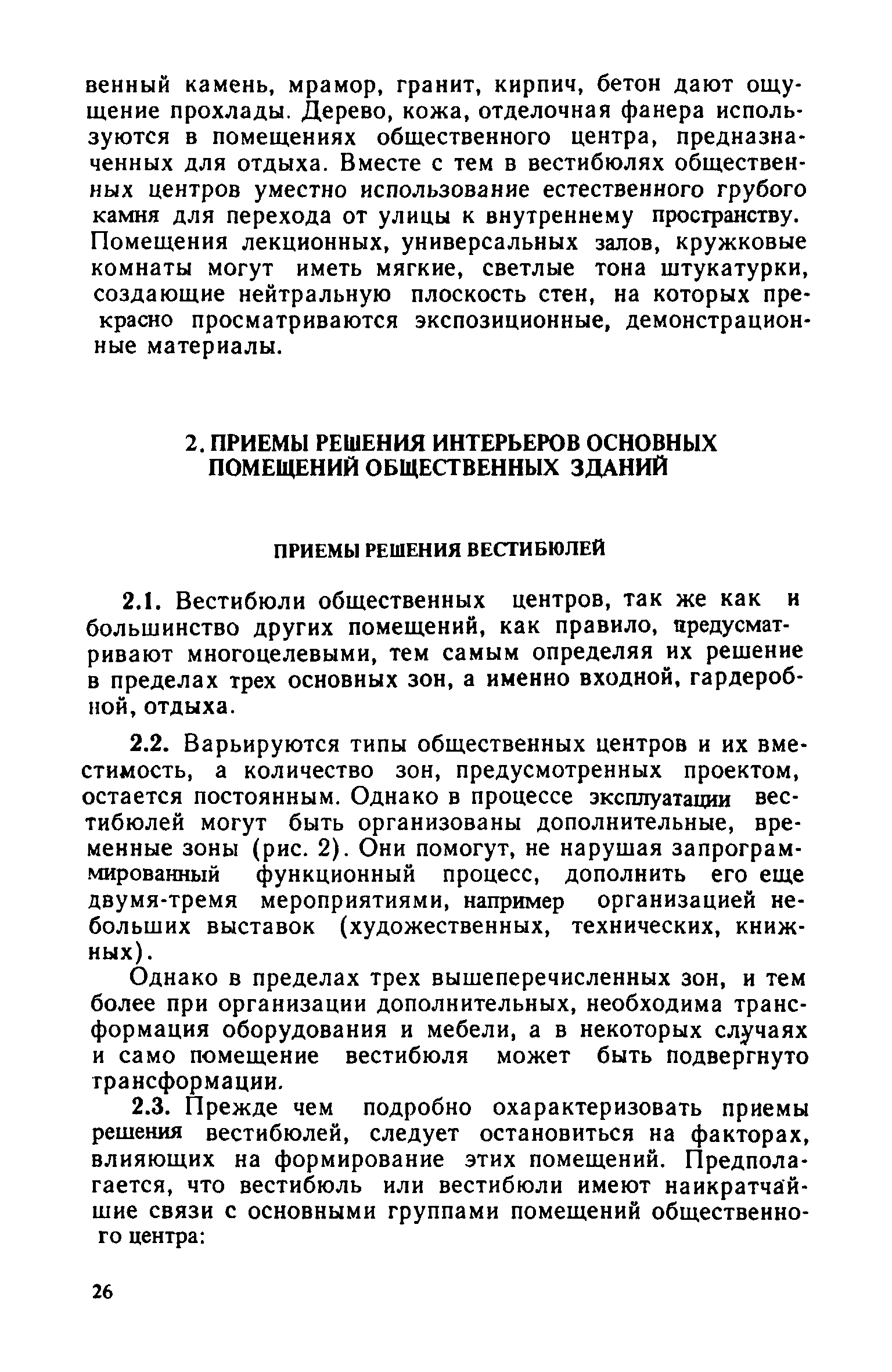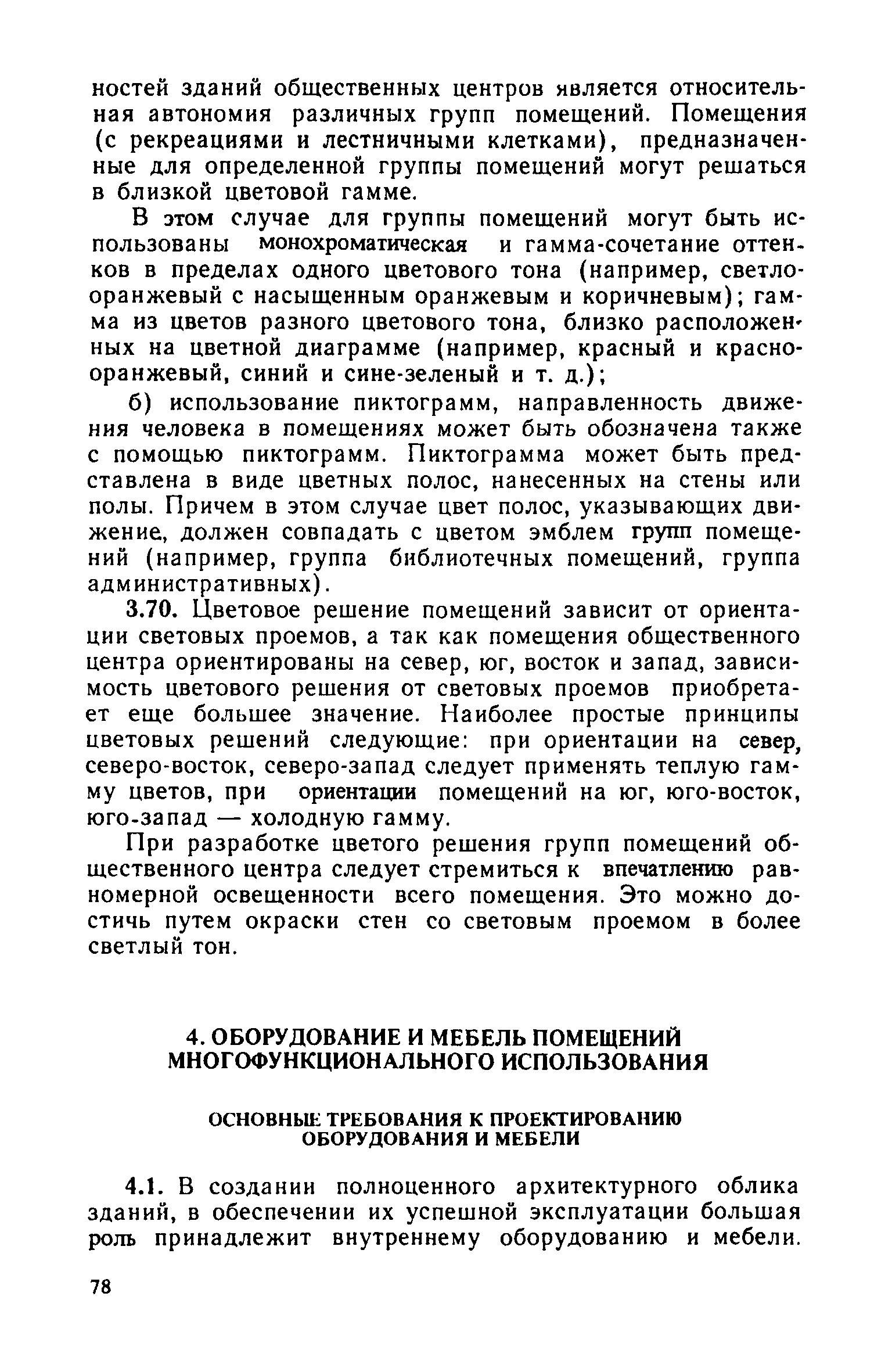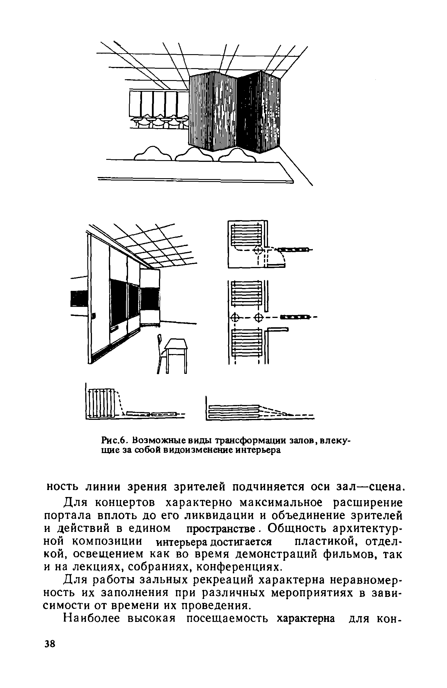 | Оглавление: | Предисловие 1. Общие принципы решения интерьеров Общие сведения о зданиях общественных центров микрорайонов Особенности эксплуатации помещений общественных зданий Общие принципы формирования пространственной среды Общие требования к проектированию интерьеров общественных зданий 2. Приемы решения интерьеров основных помещений общественных зданий Приемы решения вестибюлей Приемы решения рекреаций Приемы решения зальных помещений Приемы решения кружковых комнат Приемы решения лестничных маршей 3. Декоративно-художественные элементы интерьеров Номенклатура декоративно-художественных элементов интерьера и основные требования к ним Светоцветовое решение интерьеров Требования к проектированию, изготовлению и использованию осветительного оборудования Требования к элементам озеленения Цветовое решение интерьера помещений 4. Оборудование и мебель помещений многофункционального пользования Основные требования к проектированию оборудования и мебели Особенности проектирования оборудования и мебели для трансформации и многоцелевого использования помещений Рекомендации по вопросам многофункционального использования и способам размещения оборудования и мебели в помещениях Складирование мебели для работы на горизонтальных и наклонных поверхностях |
