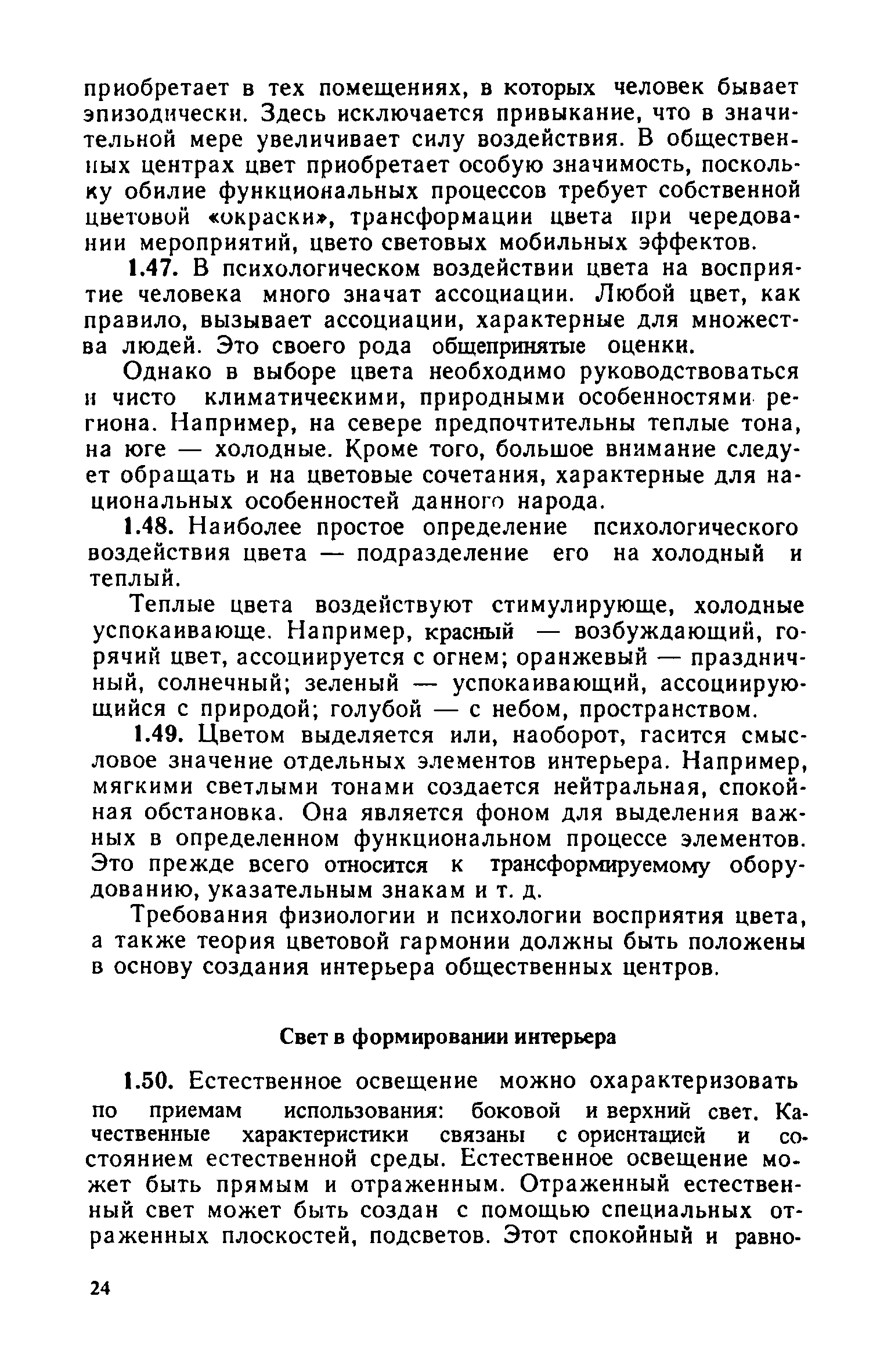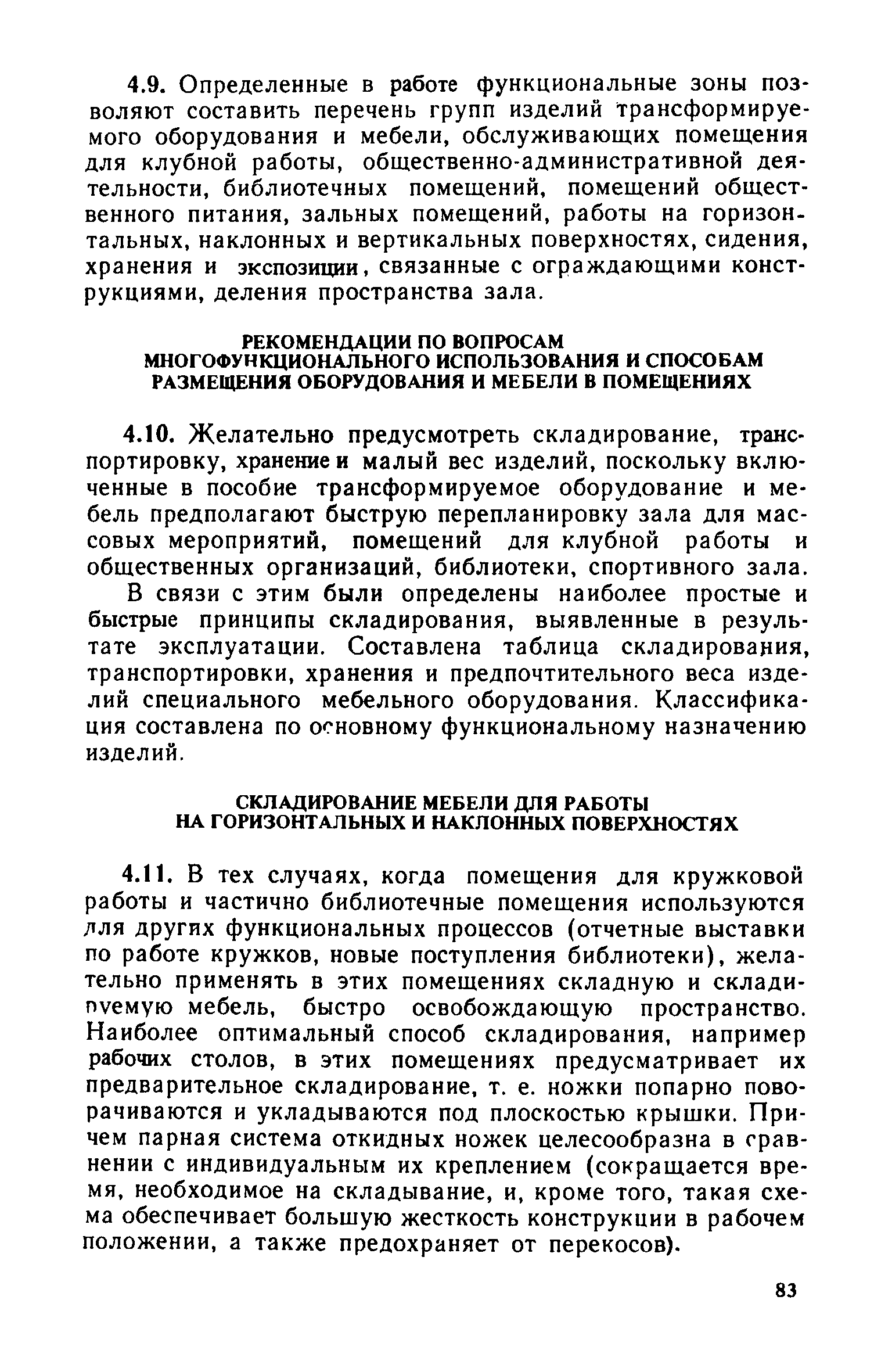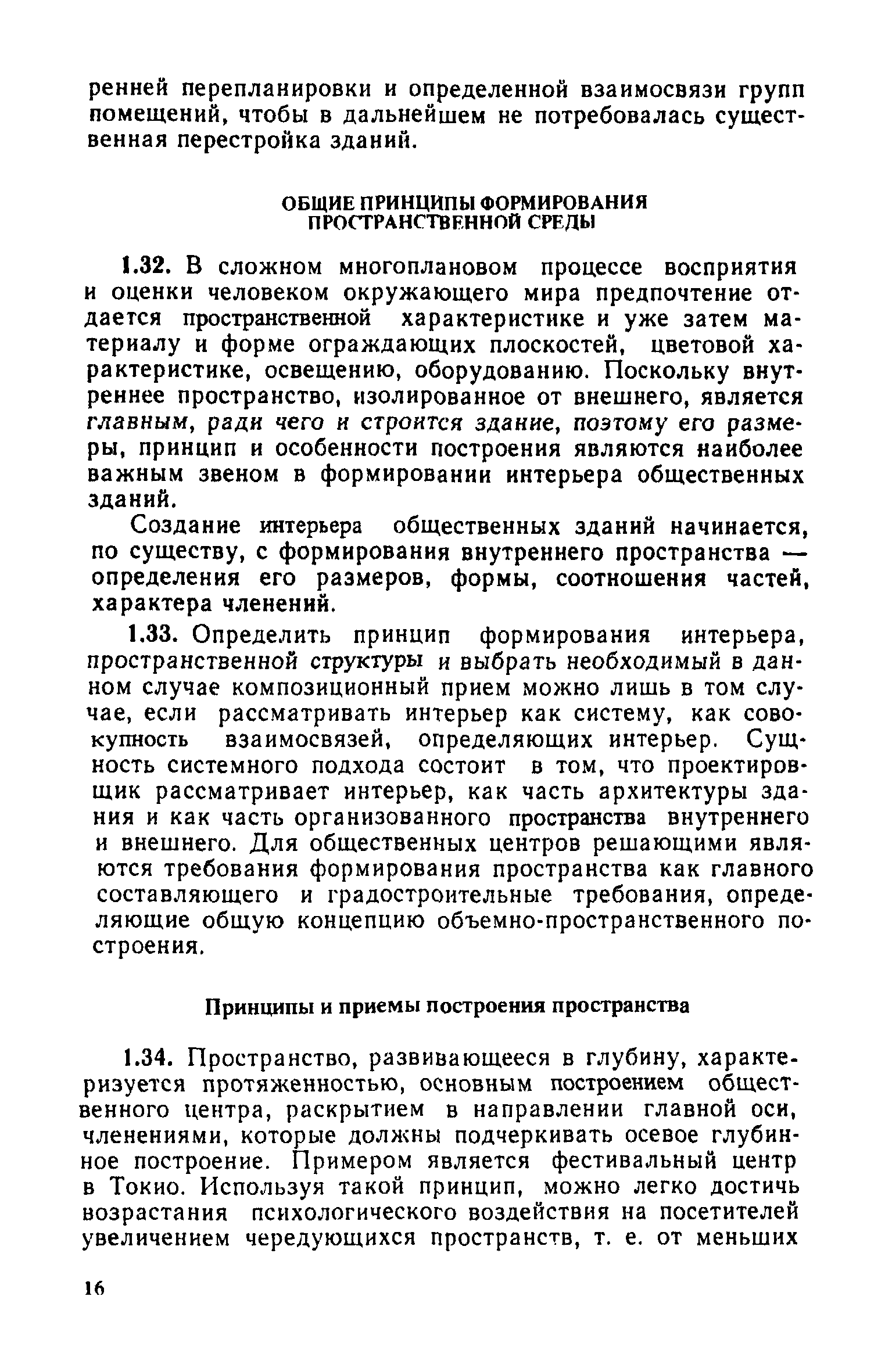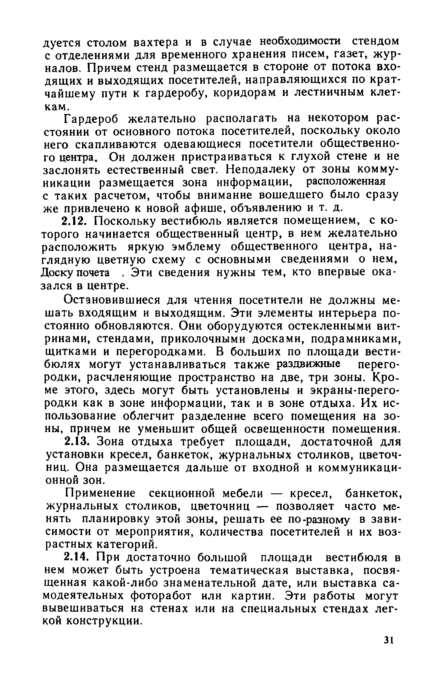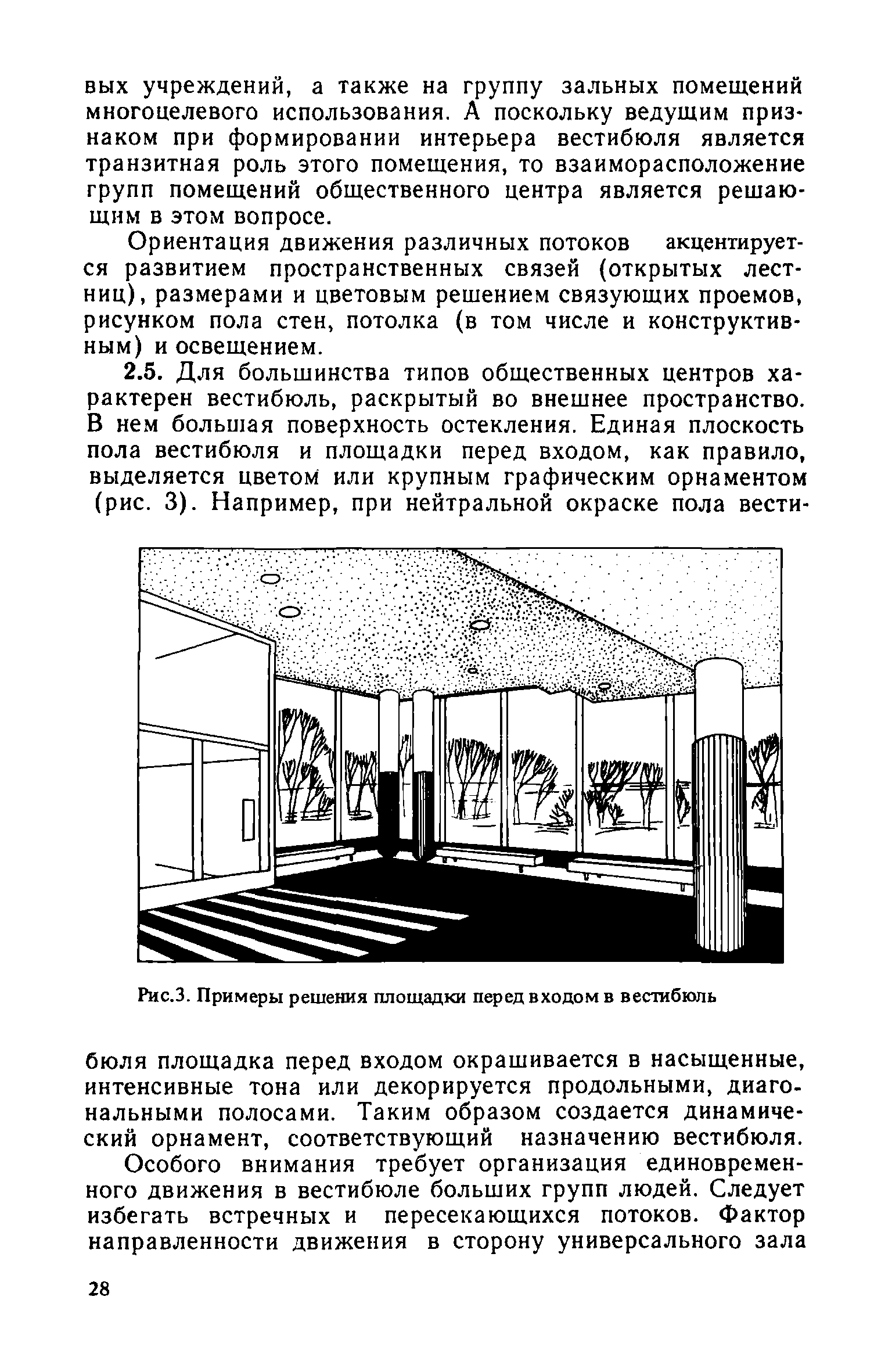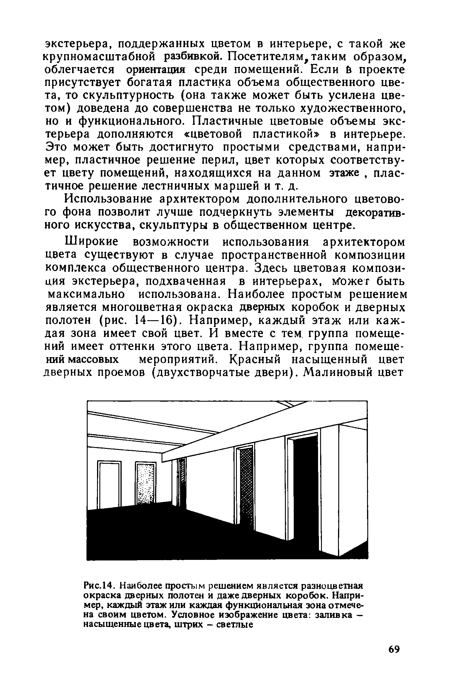 | Оглавление: | Предисловие 1. Общие принципы решения интерьеров Общие сведения о зданиях общественных центров микрорайонов Особенности эксплуатации помещений общественных зданий Общие принципы формирования пространственной среды Общие требования к проектированию интерьеров общественных зданий 2. Приемы решения интерьеров основных помещений общественных зданий Приемы решения вестибюлей Приемы решения рекреаций Приемы решения зальных помещений Приемы решения кружковых комнат Приемы решения лестничных маршей 3. Декоративно-художественные элементы интерьеров Номенклатура декоративно-художественных элементов интерьера и основные требования к ним Светоцветовое решение интерьеров Требования к проектированию, изготовлению и использованию осветительного оборудования Требования к элементам озеленения Цветовое решение интерьера помещений 4. Оборудование и мебель помещений многофункционального пользования Основные требования к проектированию оборудования и мебели Особенности проектирования оборудования и мебели для трансформации и многоцелевого использования помещений Рекомендации по вопросам многофункционального использования и способам размещения оборудования и мебели в помещениях Складирование мебели для работы на горизонтальных и наклонных поверхностях |