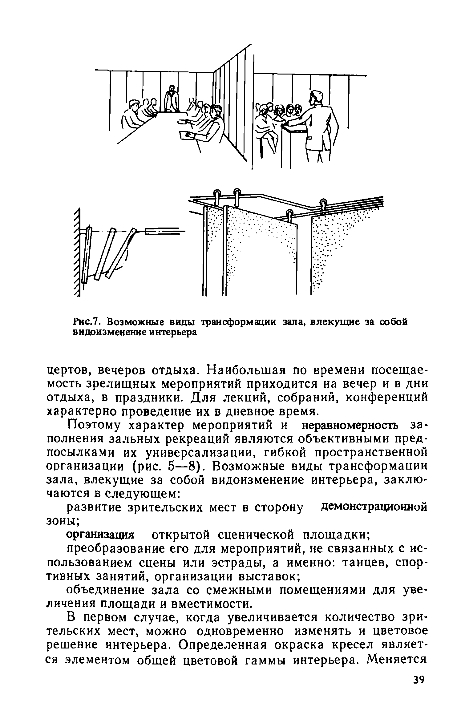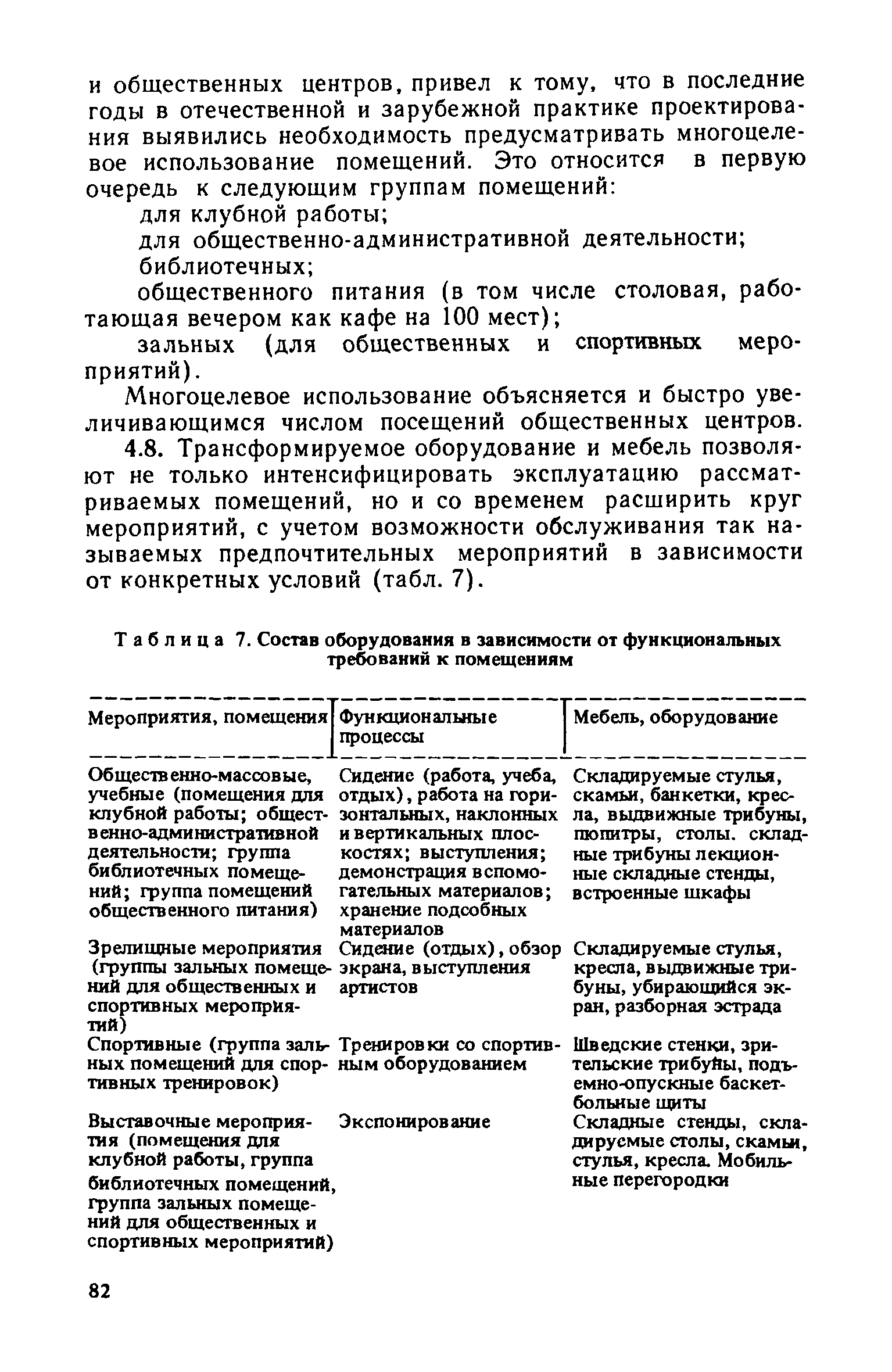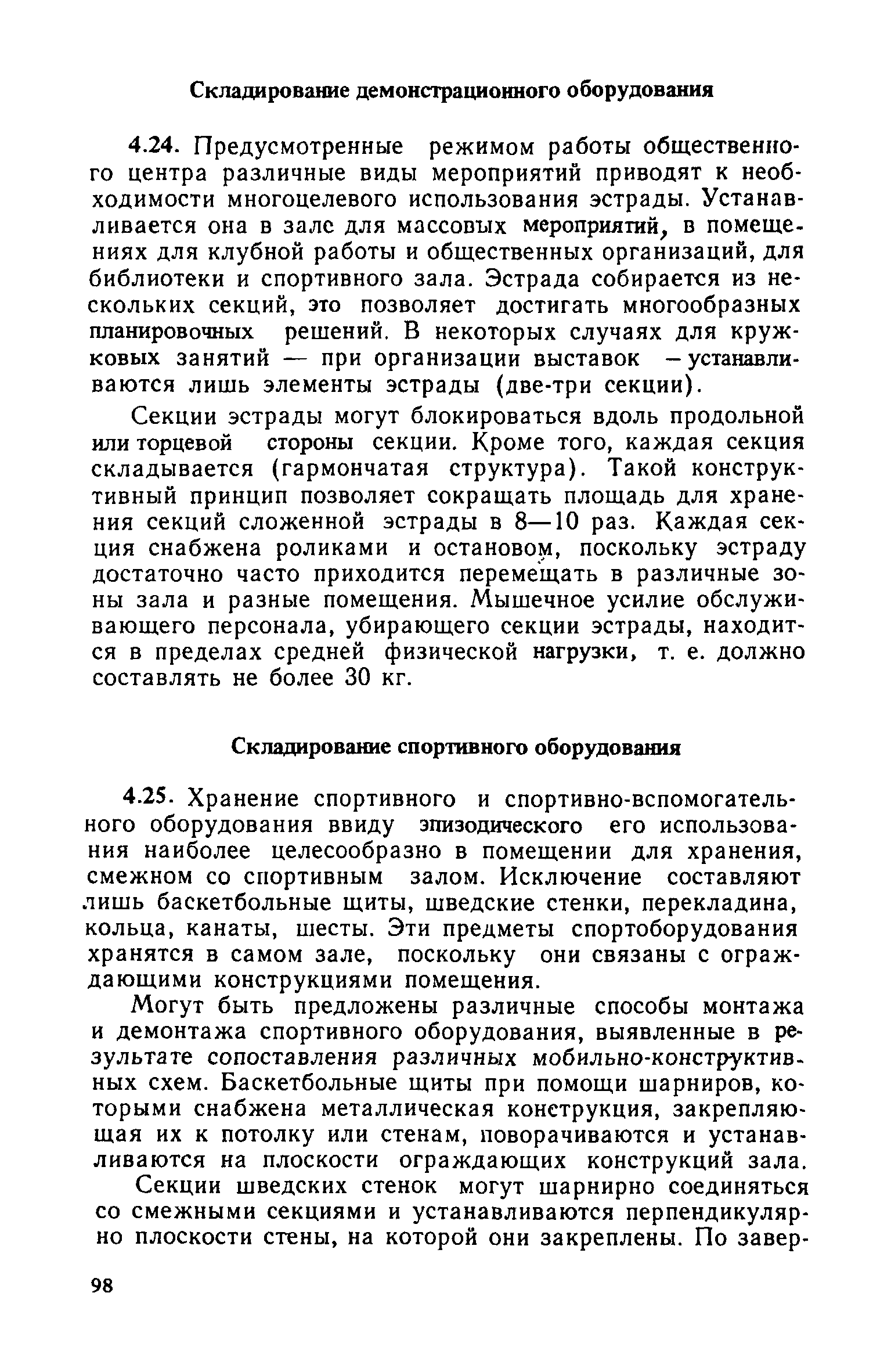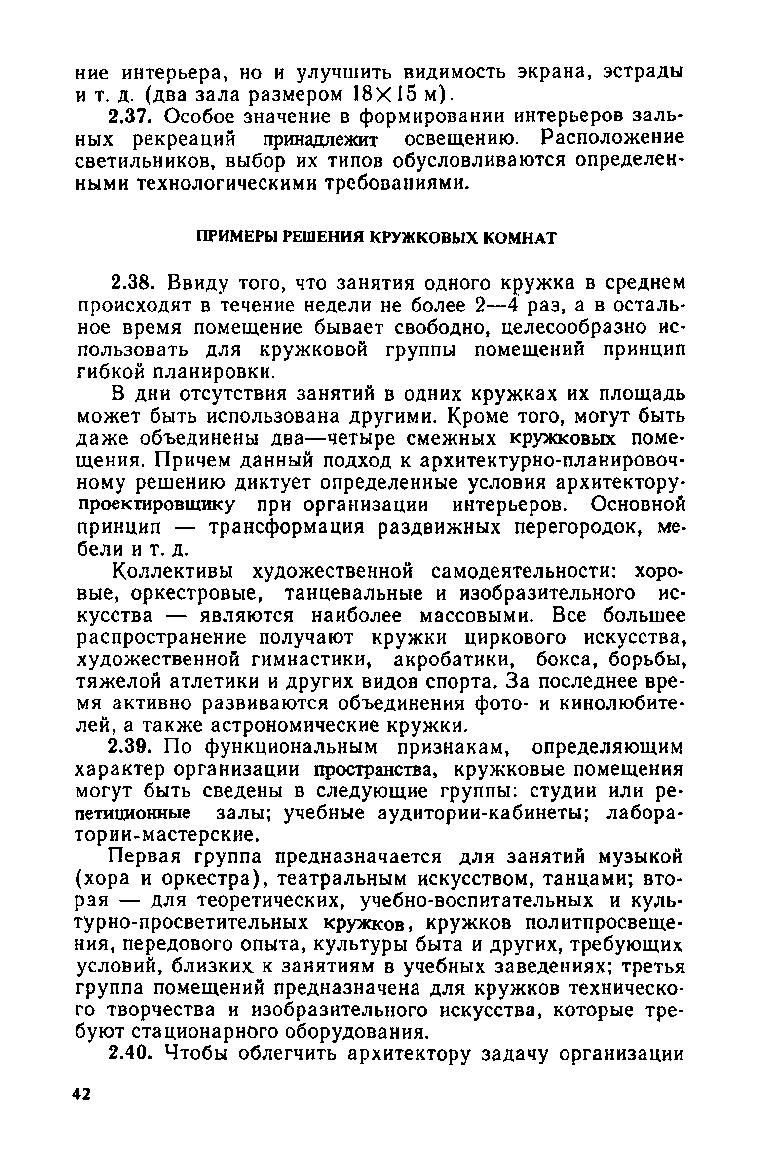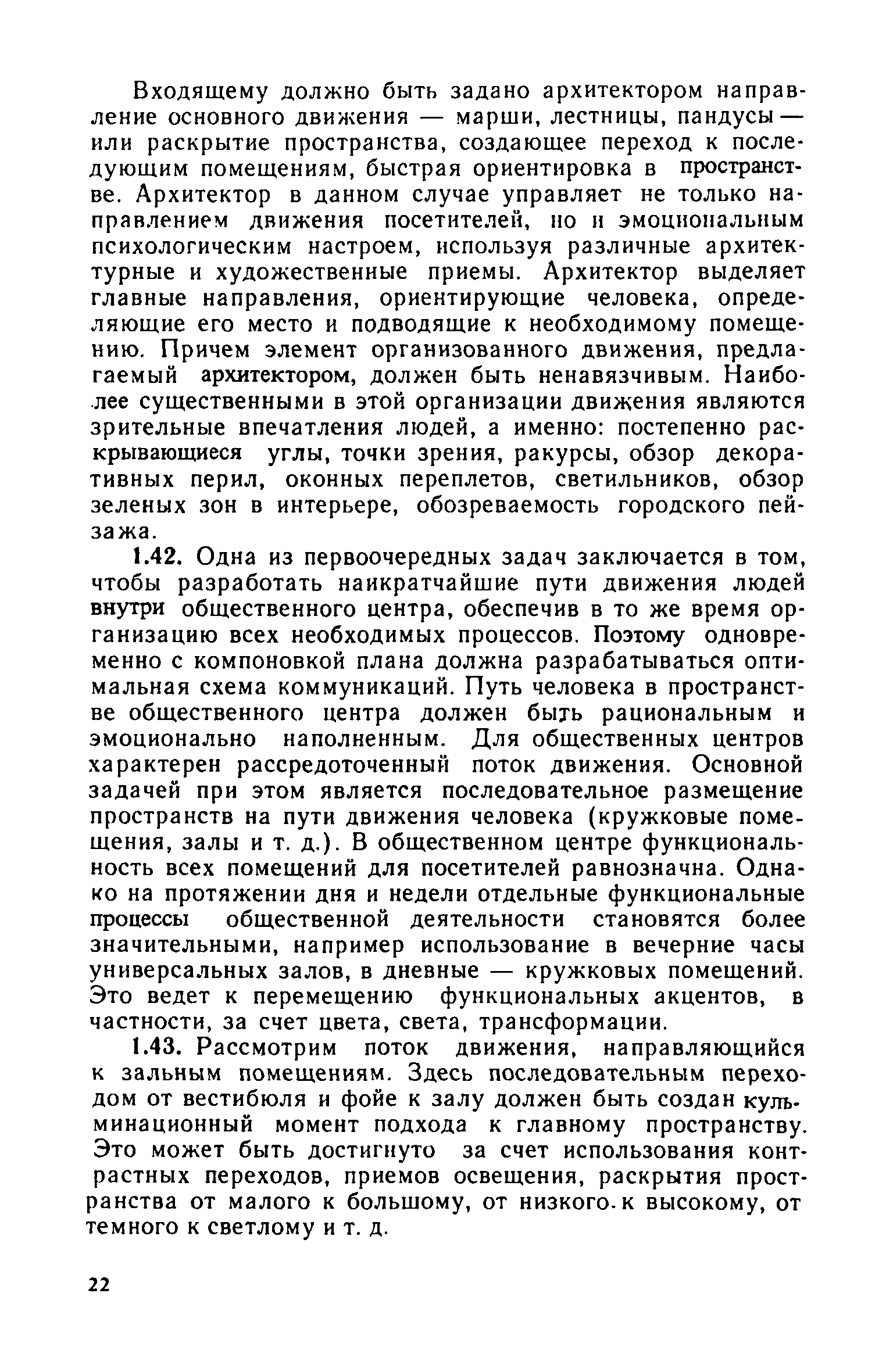 | Оглавление: | Предисловие 1. Общие принципы решения интерьеров Общие сведения о зданиях общественных центров микрорайонов Особенности эксплуатации помещений общественных зданий Общие принципы формирования пространственной среды Общие требования к проектированию интерьеров общественных зданий 2. Приемы решения интерьеров основных помещений общественных зданий Приемы решения вестибюлей Приемы решения рекреаций Приемы решения зальных помещений Приемы решения кружковых комнат Приемы решения лестничных маршей 3. Декоративно-художественные элементы интерьеров Номенклатура декоративно-художественных элементов интерьера и основные требования к ним Светоцветовое решение интерьеров Требования к проектированию, изготовлению и использованию осветительного оборудования Требования к элементам озеленения Цветовое решение интерьера помещений 4. Оборудование и мебель помещений многофункционального пользования Основные требования к проектированию оборудования и мебели Особенности проектирования оборудования и мебели для трансформации и многоцелевого использования помещений Рекомендации по вопросам многофункционального использования и способам размещения оборудования и мебели в помещениях Складирование мебели для работы на горизонтальных и наклонных поверхностях |