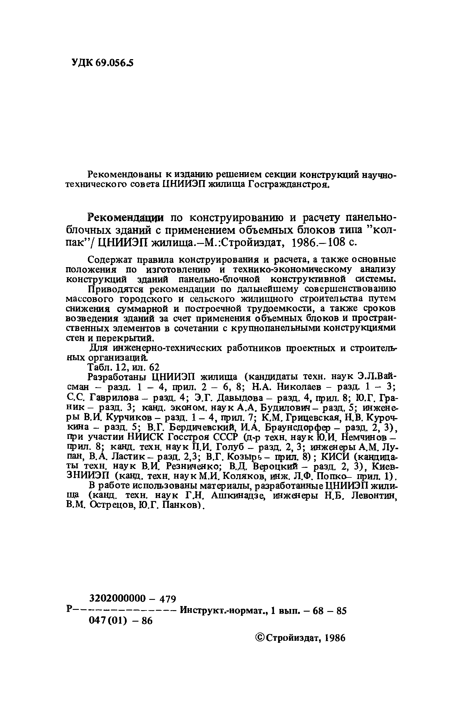 | Название рус.: | Рекомендации по конструированию и расчету панельно-блочных зданий с применением объемных блоков типа "колпак" |