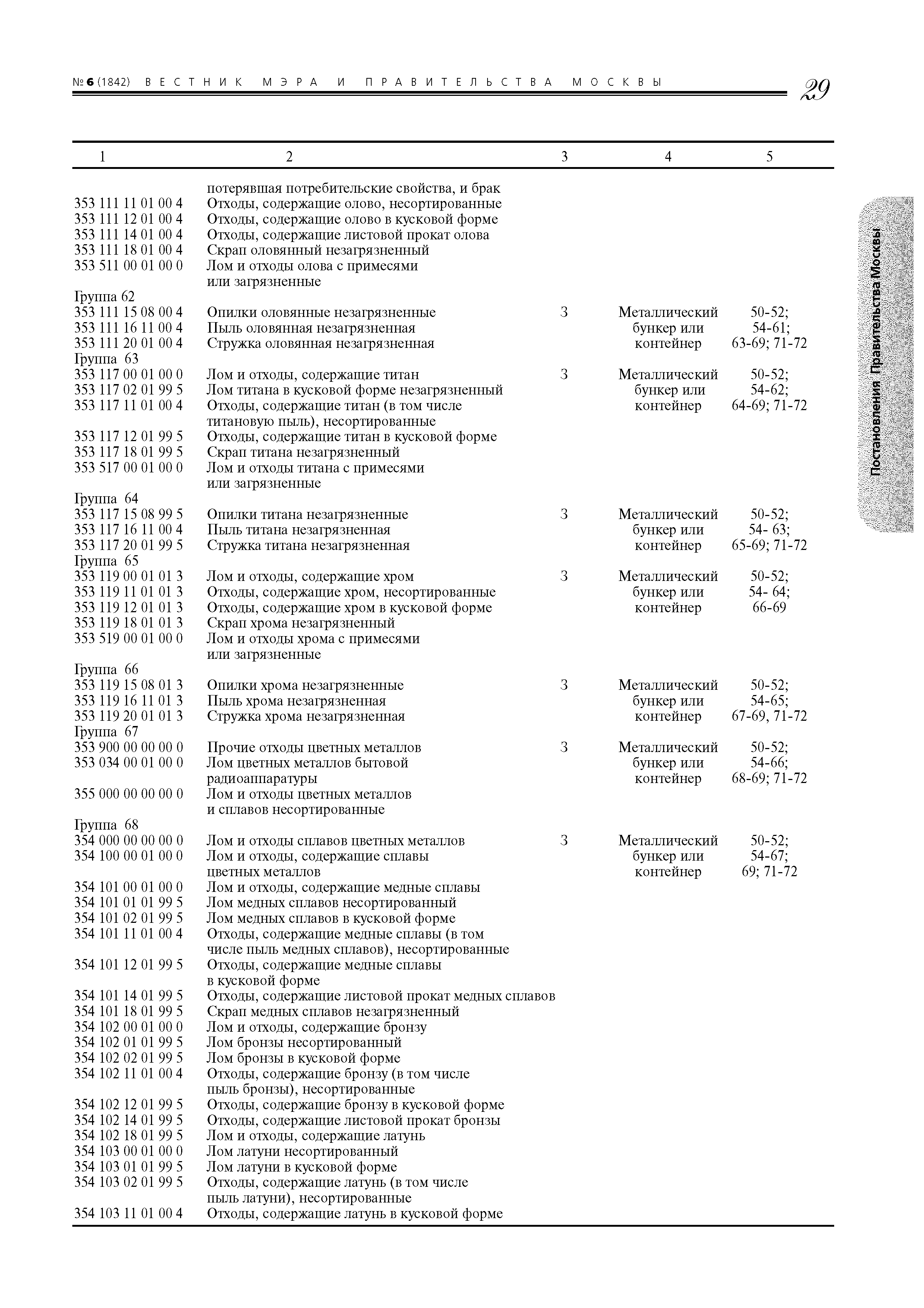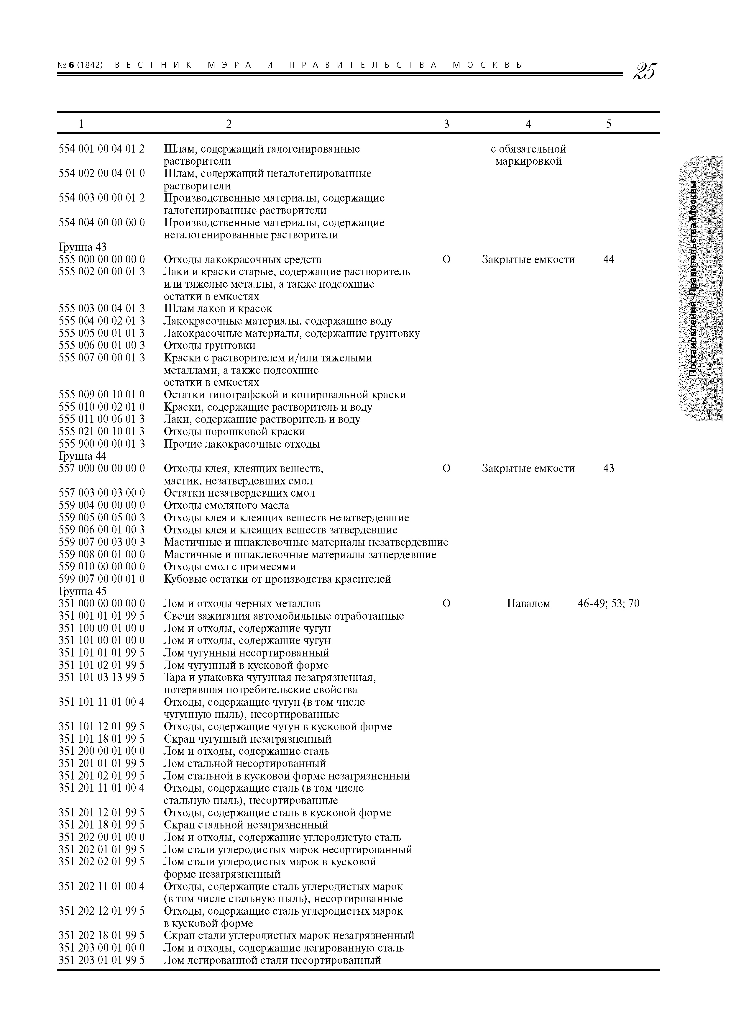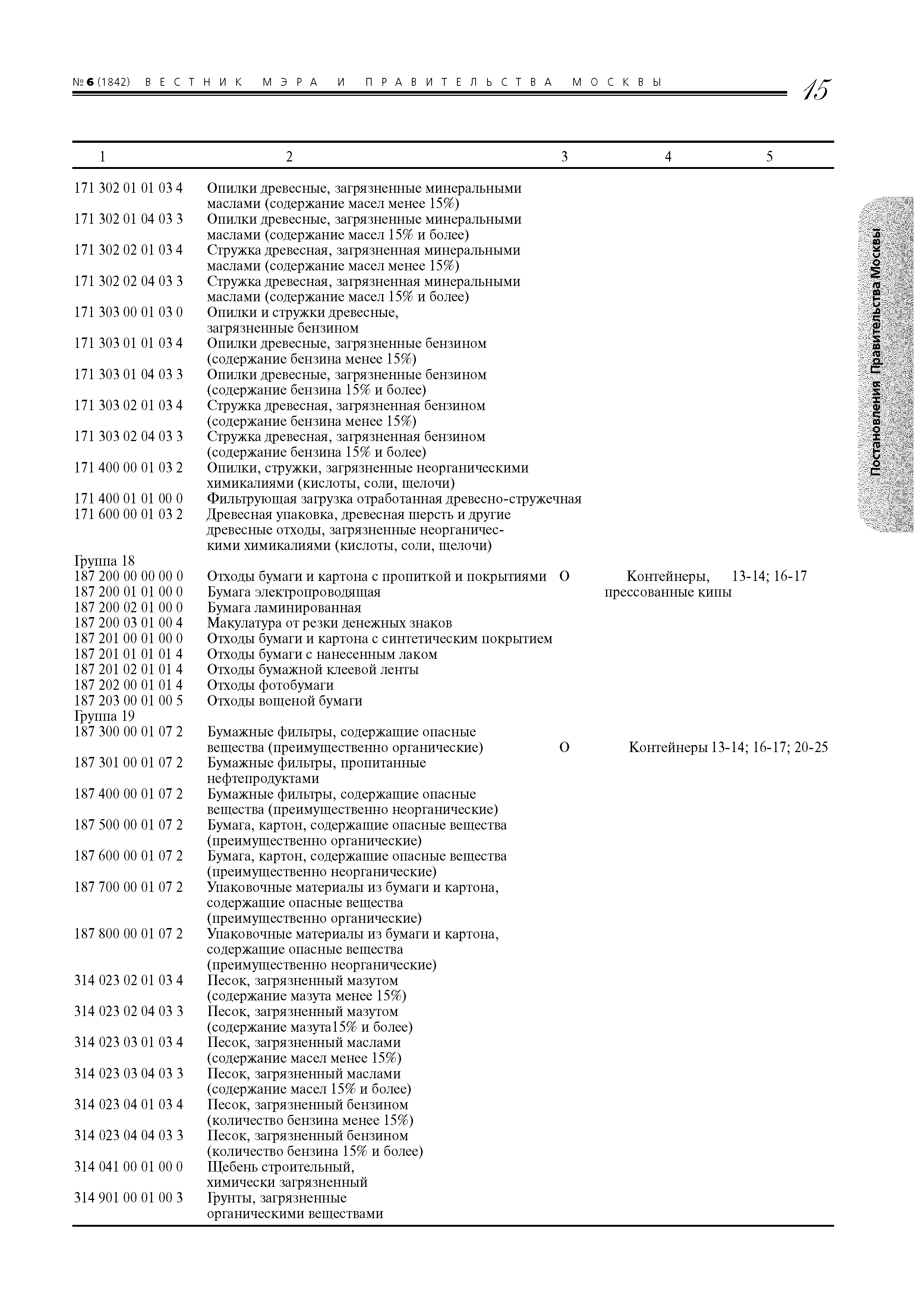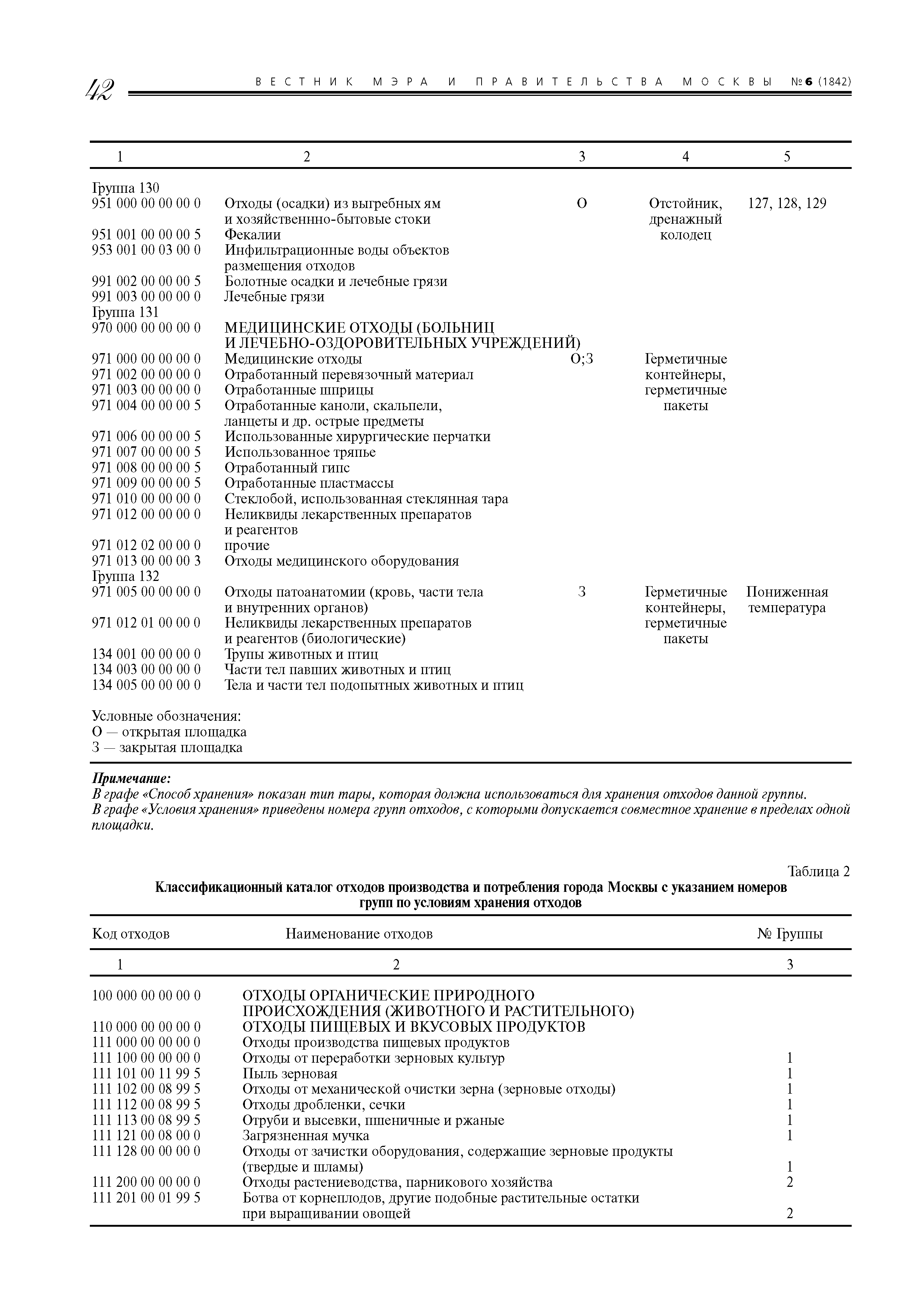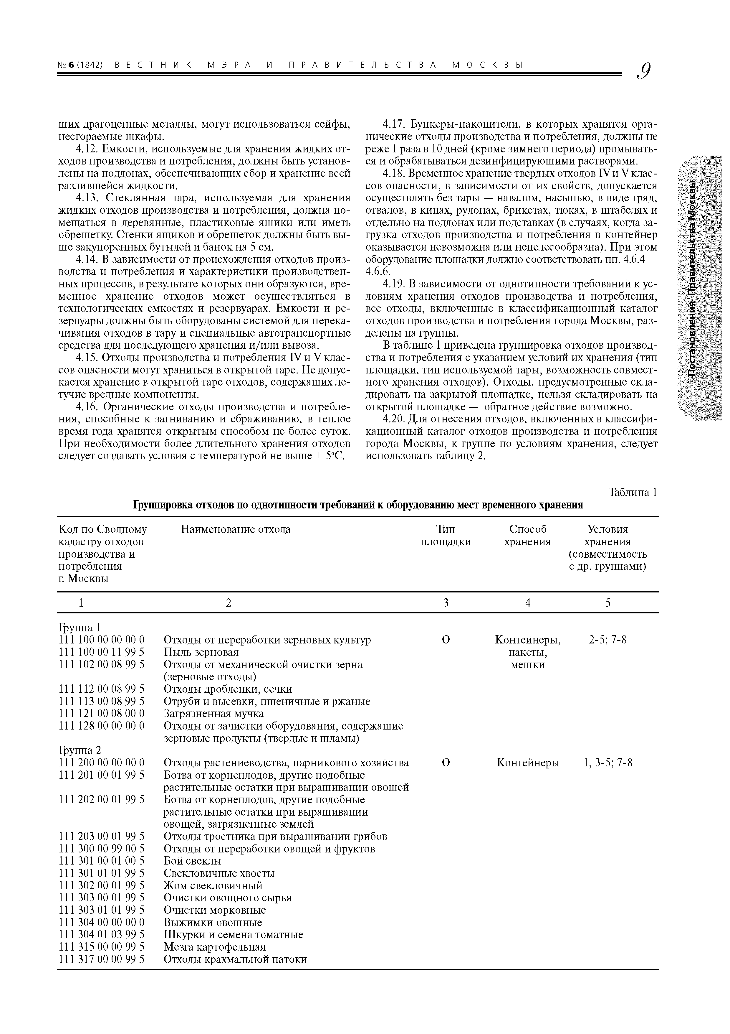 | Оглавление: | 1. Область применения 2. Основные понятия и определения (в соответствии с Межгосударственным стандартом ГОСТ 30772-2001), введенным в действие постановлением Госстандарта РФ от 28.12.2001 № 607-СТ 3. Общие требования к организации временного хранения отходов производства и потребления 4. Требования к организации площадок временного хранения отходов производства и потребления на территориях природопользователей Таблица 1. Группировка отходов по однотипности требований к оборудованию мест временного хранения Таблица 2. Классификационный каталог отходов производства и потребления города Москвы с указанием номеров групп по условиям хранения отходов |