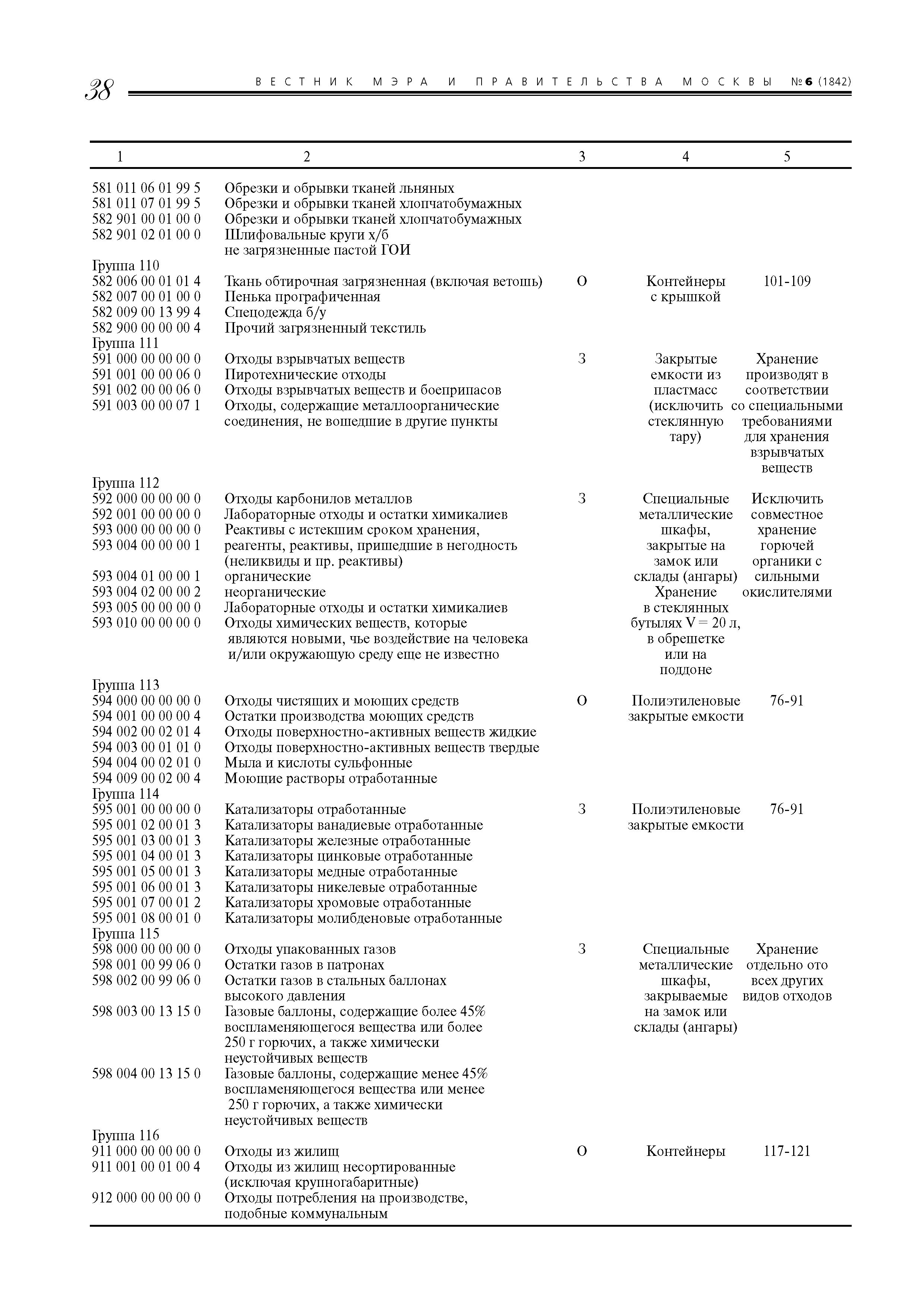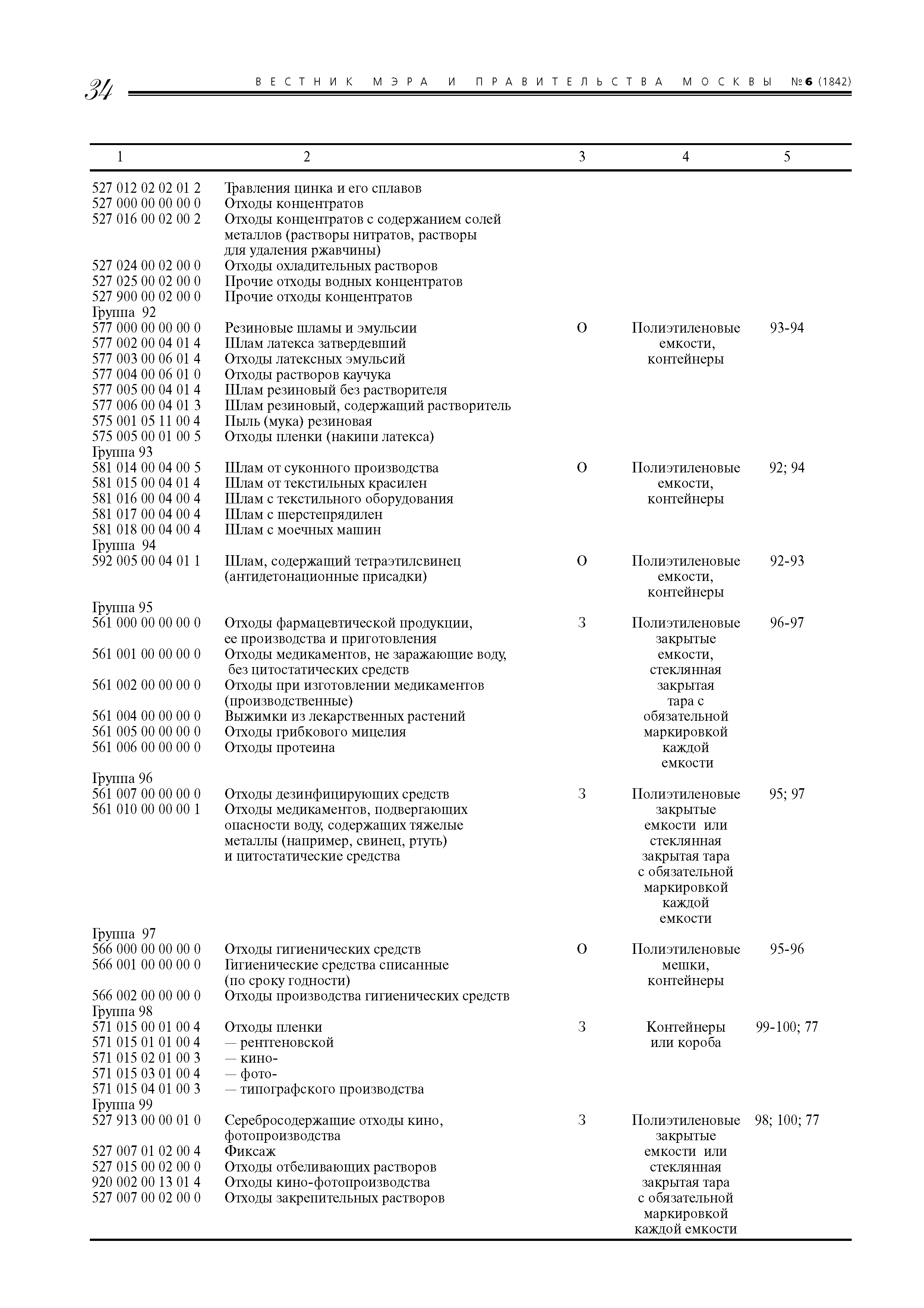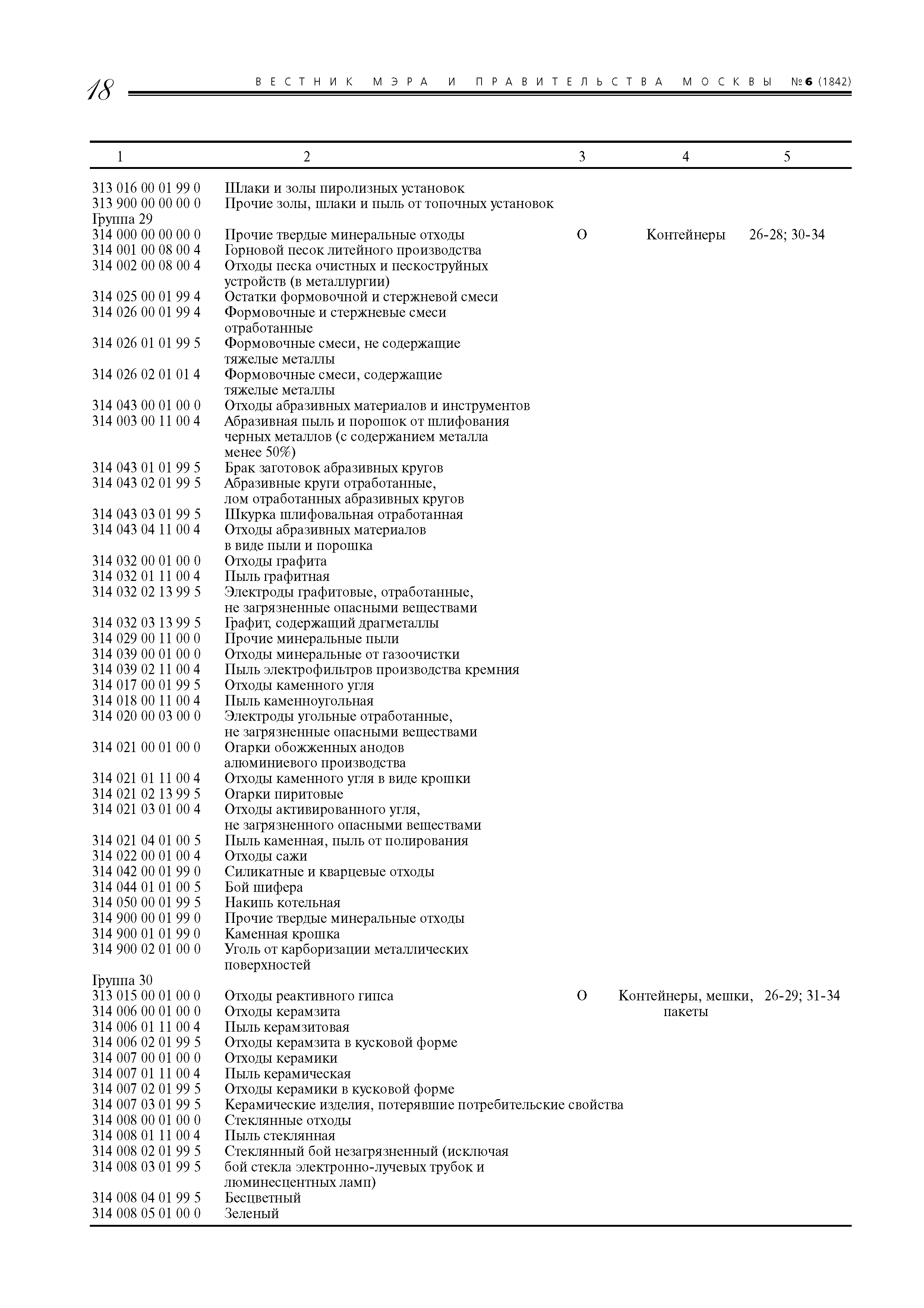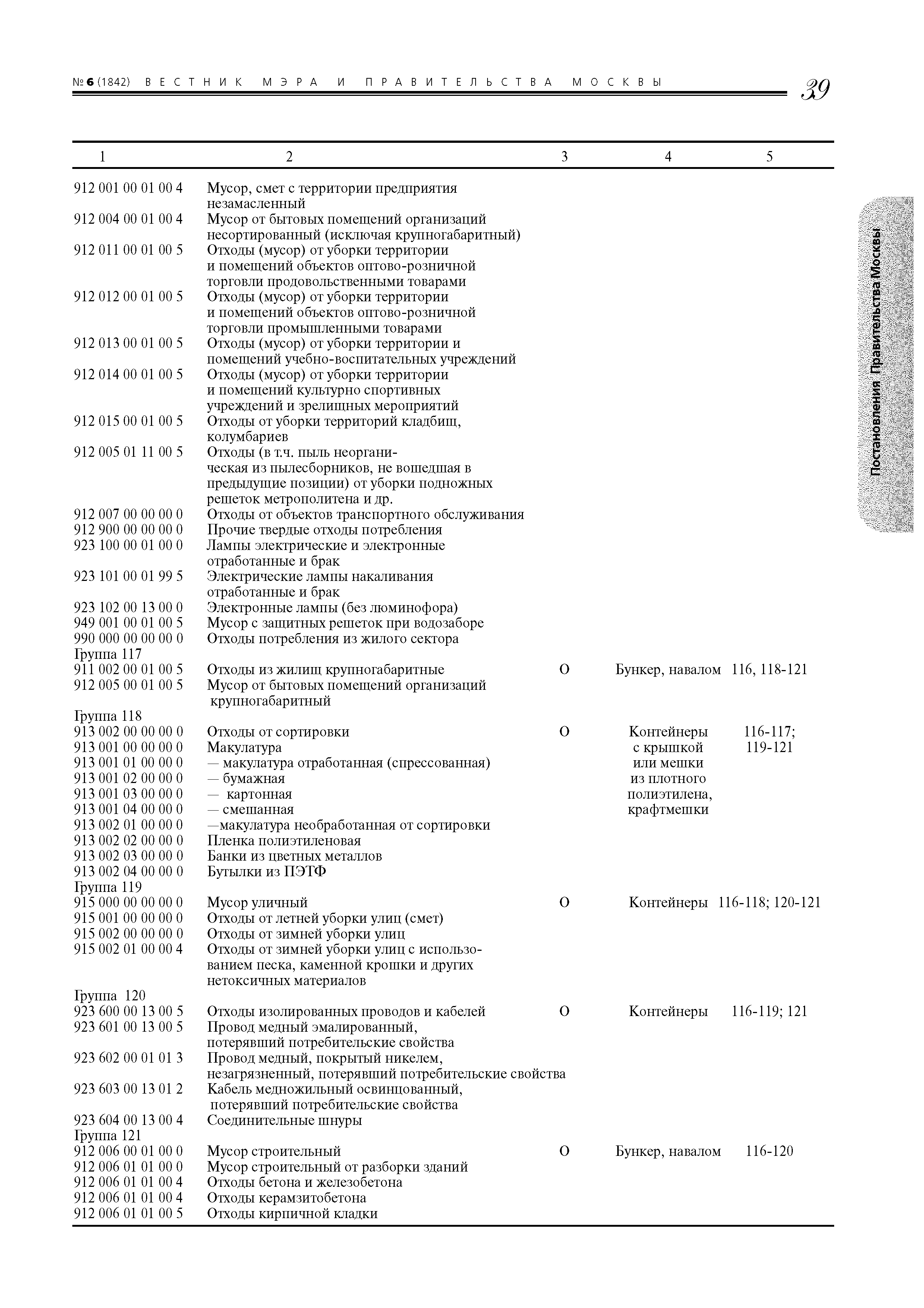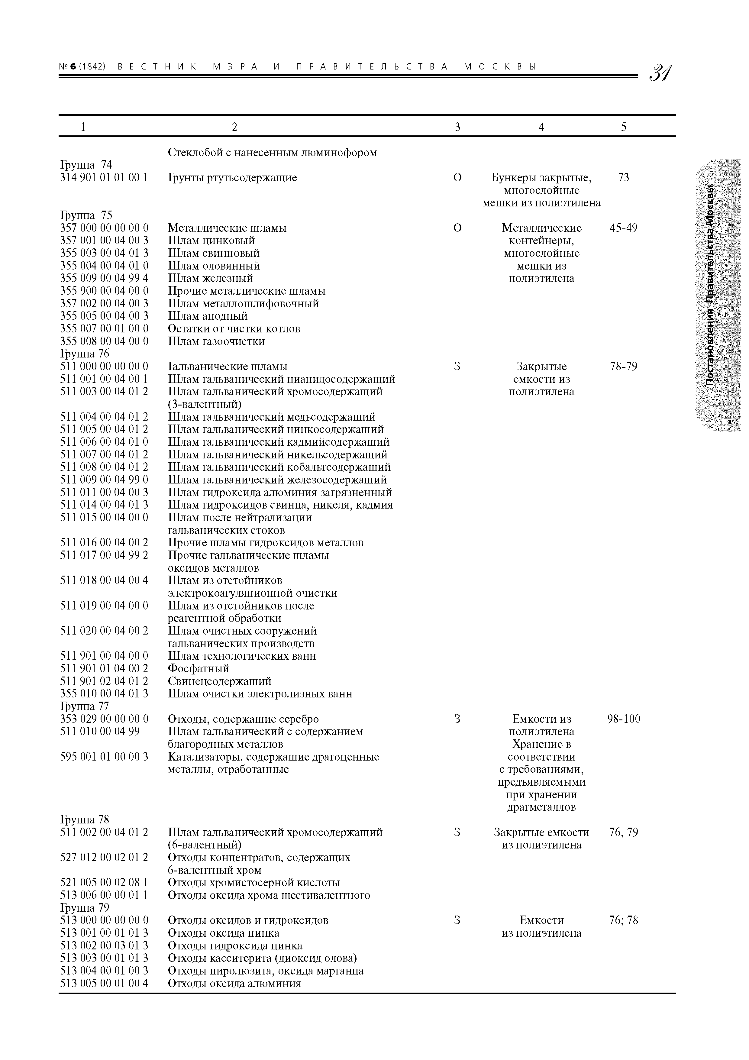 | Оглавление: | 1. Область применения 2. Основные понятия и определения (в соответствии с Межгосударственным стандартом ГОСТ 30772-2001), введенным в действие постановлением Госстандарта РФ от 28.12.2001 № 607-СТ 3. Общие требования к организации временного хранения отходов производства и потребления 4. Требования к организации площадок временного хранения отходов производства и потребления на территориях природопользователей Таблица 1. Группировка отходов по однотипности требований к оборудованию мест временного хранения Таблица 2. Классификационный каталог отходов производства и потребления города Москвы с указанием номеров групп по условиям хранения отходов |
