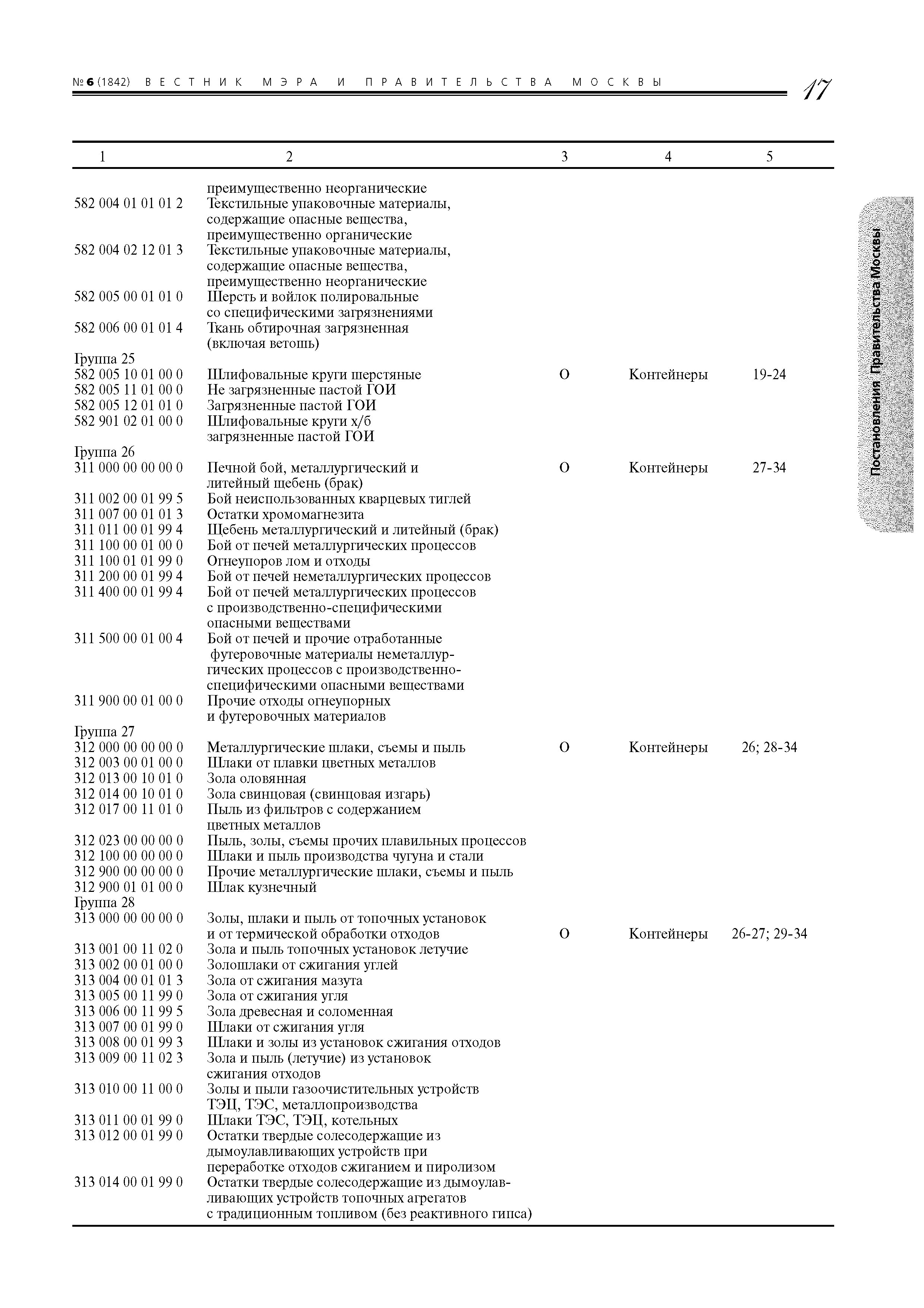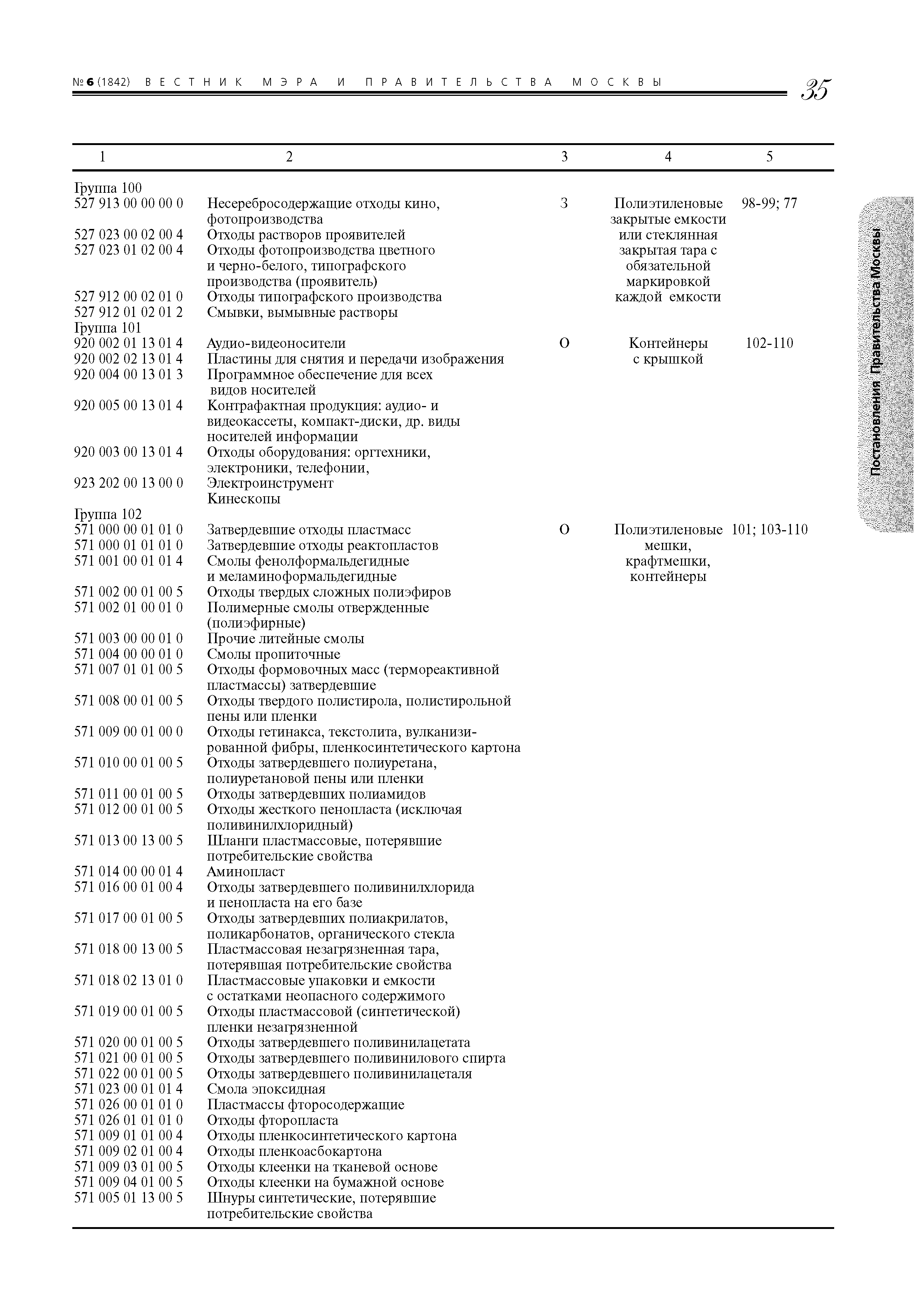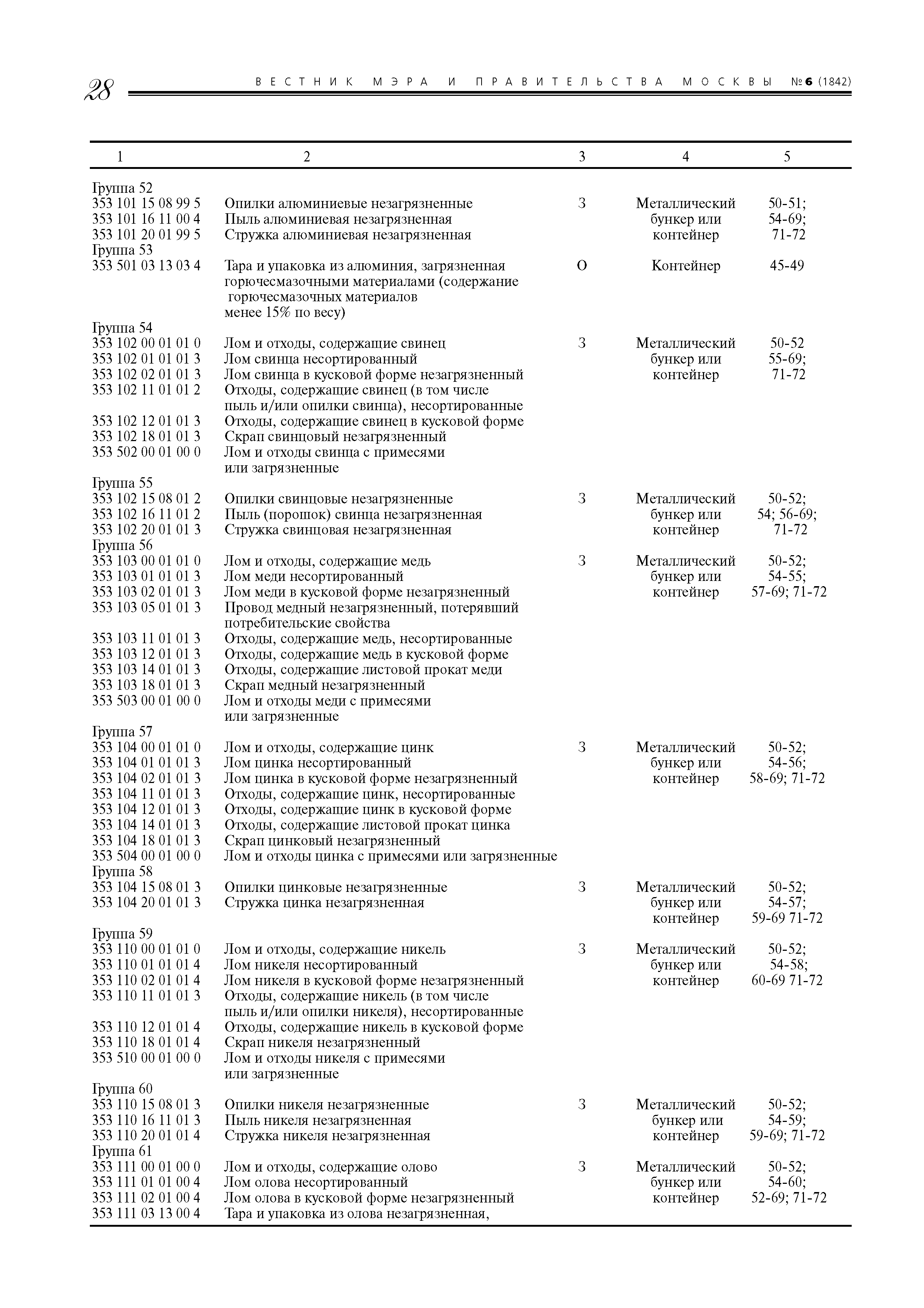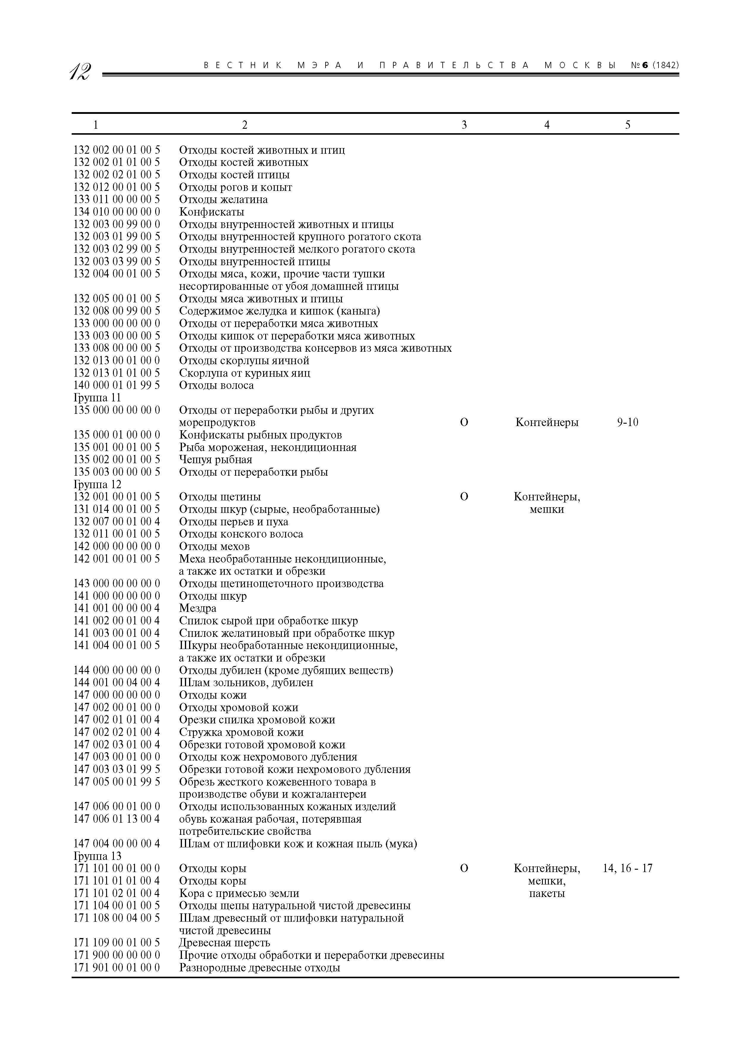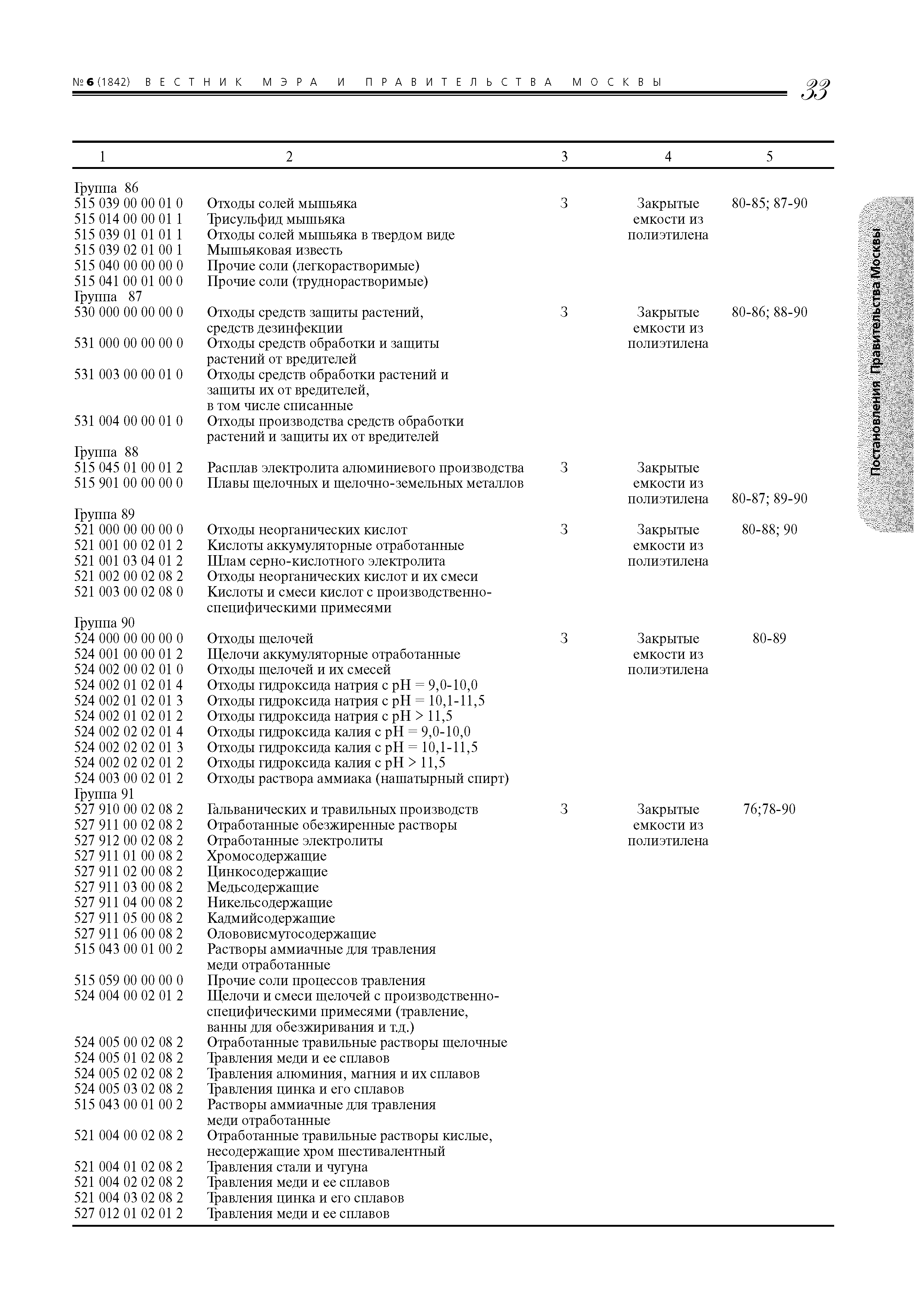 | Оглавление: | 1. Область применения 2. Основные понятия и определения (в соответствии с Межгосударственным стандартом ГОСТ 30772-2001), введенным в действие постановлением Госстандарта РФ от 28.12.2001 № 607-СТ 3. Общие требования к организации временного хранения отходов производства и потребления 4. Требования к организации площадок временного хранения отходов производства и потребления на территориях природопользователей Таблица 1. Группировка отходов по однотипности требований к оборудованию мест временного хранения Таблица 2. Классификационный каталог отходов производства и потребления города Москвы с указанием номеров групп по условиям хранения отходов |