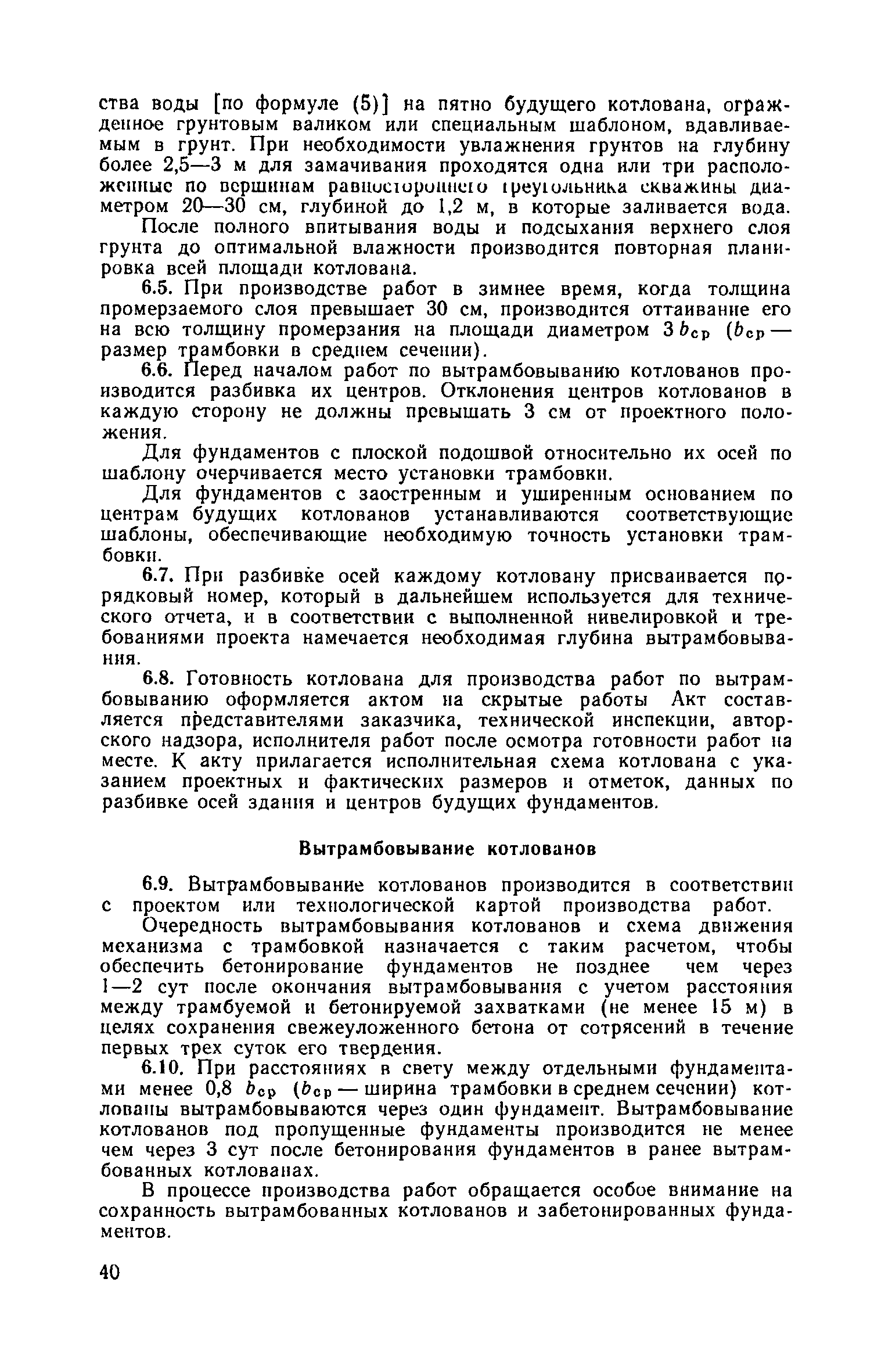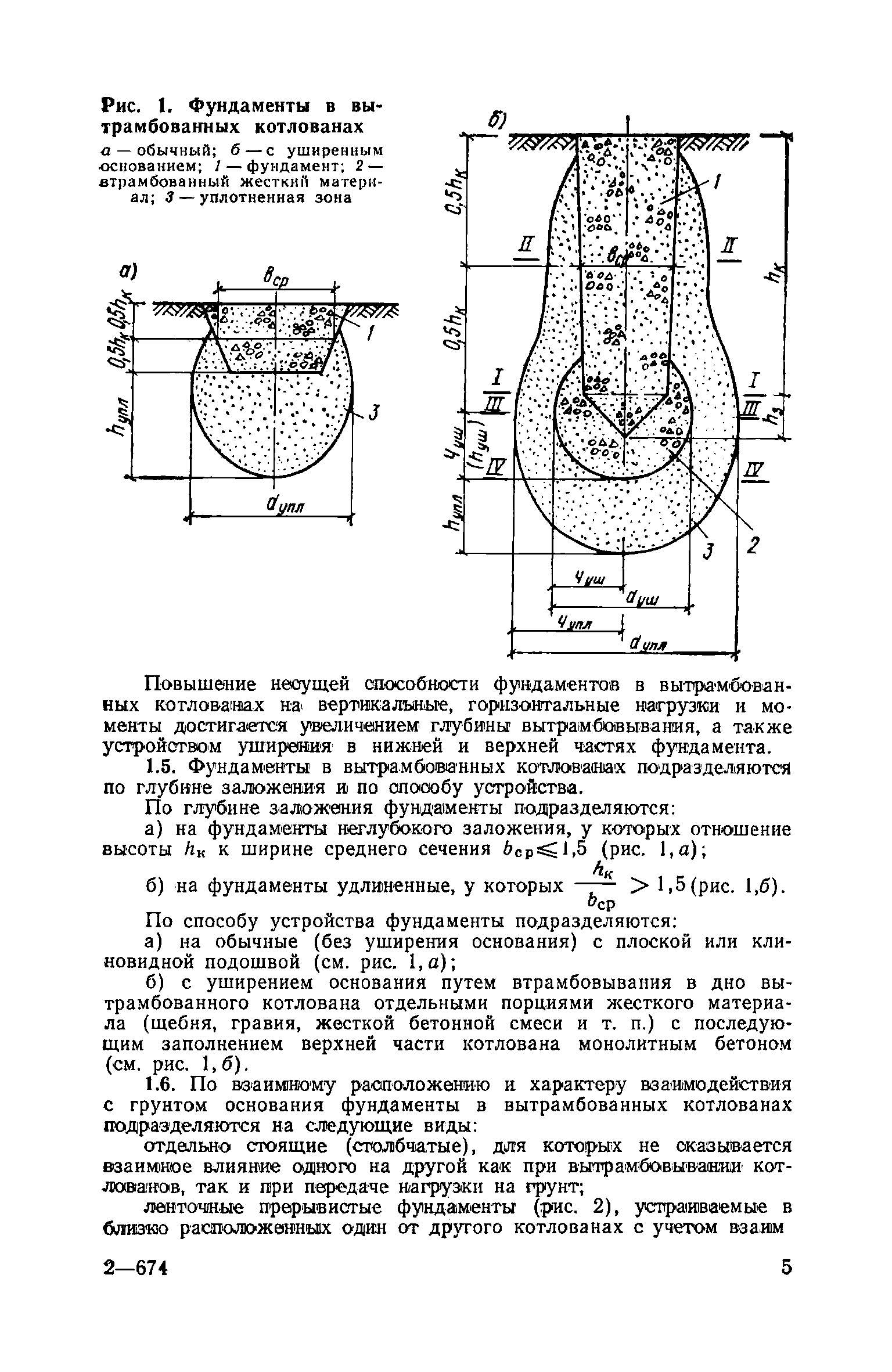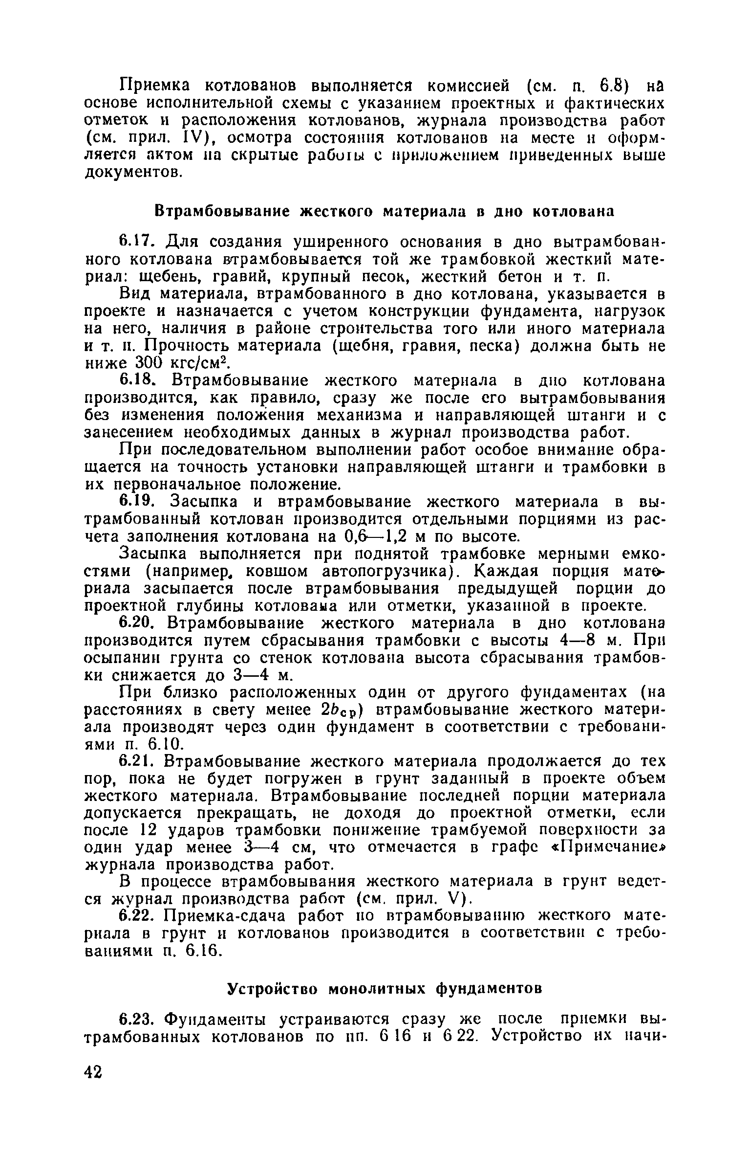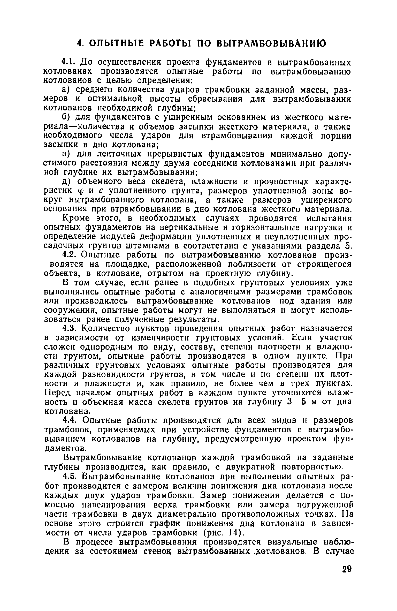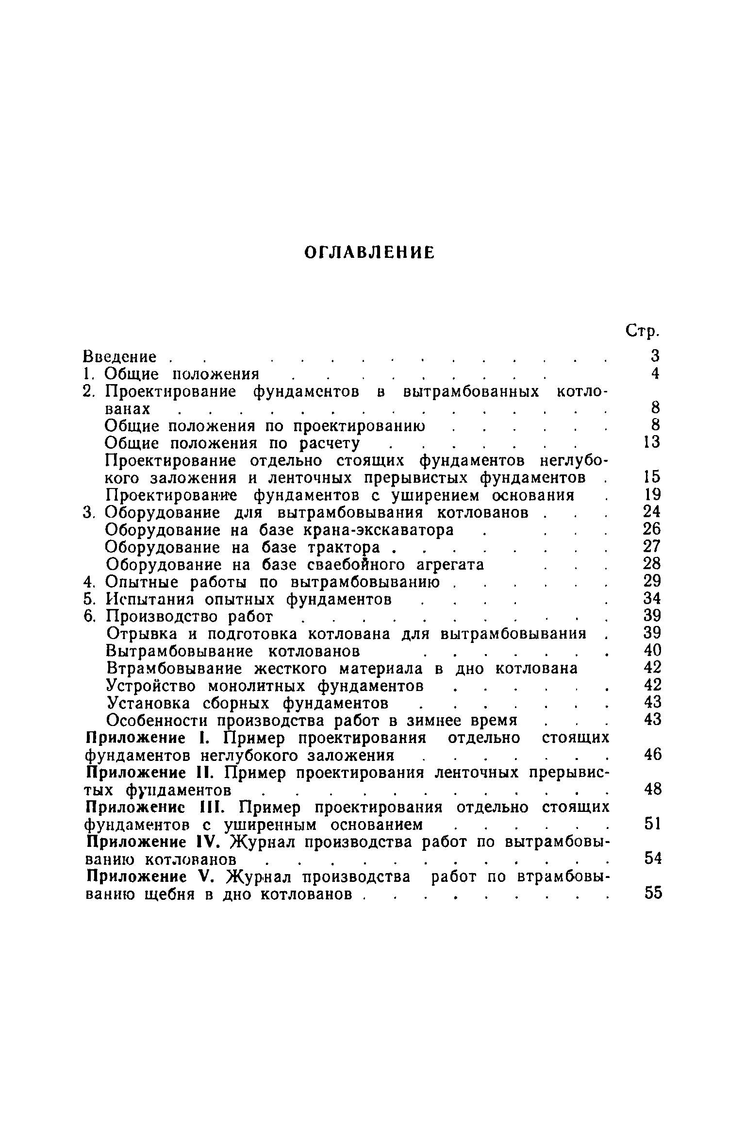 | Оглавление: | Введение 1. Общие положения 2. Проектирование фундаментов в вытрамбованных котлованах Общие положения по проектированию Общие положения по расчету Проектирование отдельно стоящих фундаментов неглубокого заложения и ленточных прерывистых фундаментов Проектирование фундаментов с уширением основания 3. Оборудование для вытрамбовывания котлованов Оборудование на базе крана-экскаватора Оборудование на базе трактора Оборудование на базе сваебойного агрегата 4. Опытные работы по вытрамбовыванию 5. Испытания опытных фундаментов 6. Производство работ Отрывка и подготовка котлована для вытрамбовывания Вытрамбовывание котлованов Втрамбовывание жесткого материала в дно котлована Устройство монолитных фундаментов Устройство сборных фундаментов Особенности производства работ в зимнее время Приложение 1. Пример проектирования отдельно стоящих фундаментов неглубокого заложения Приложение 2. Пример проектирования ленточных прерывистых фундаментов Приложение 3. Пример проектирования отдельно стоящих фундаментов с уширенным основанием Приложение 4. Журнал производства работ по вытрамбовыванию котлованов Приложение 5. Журнал производства работ по втрамбовыванию щебня в дно котлованов |