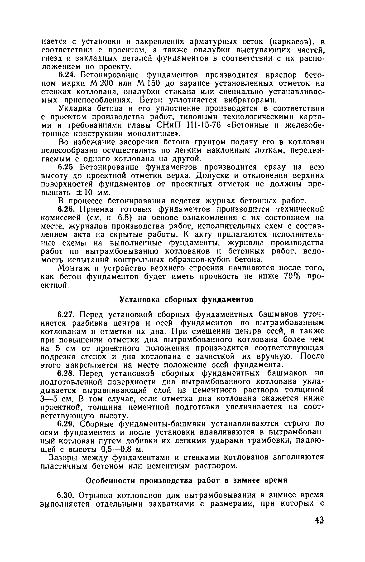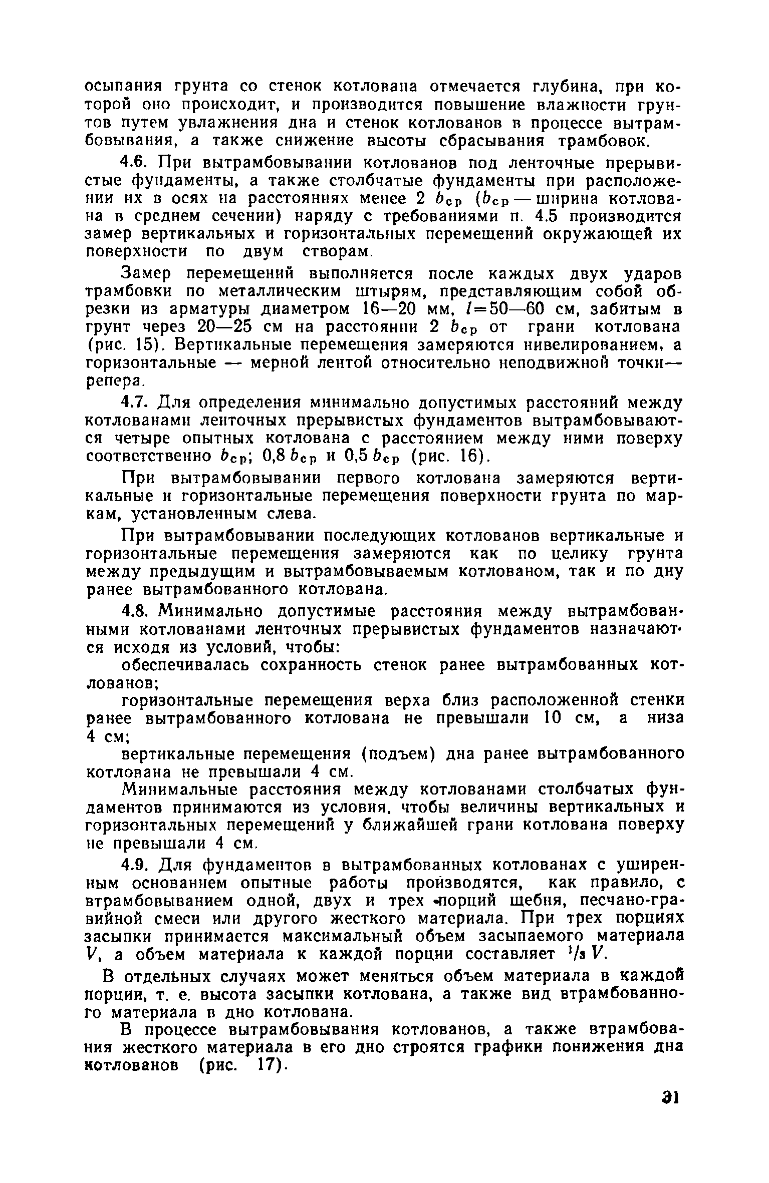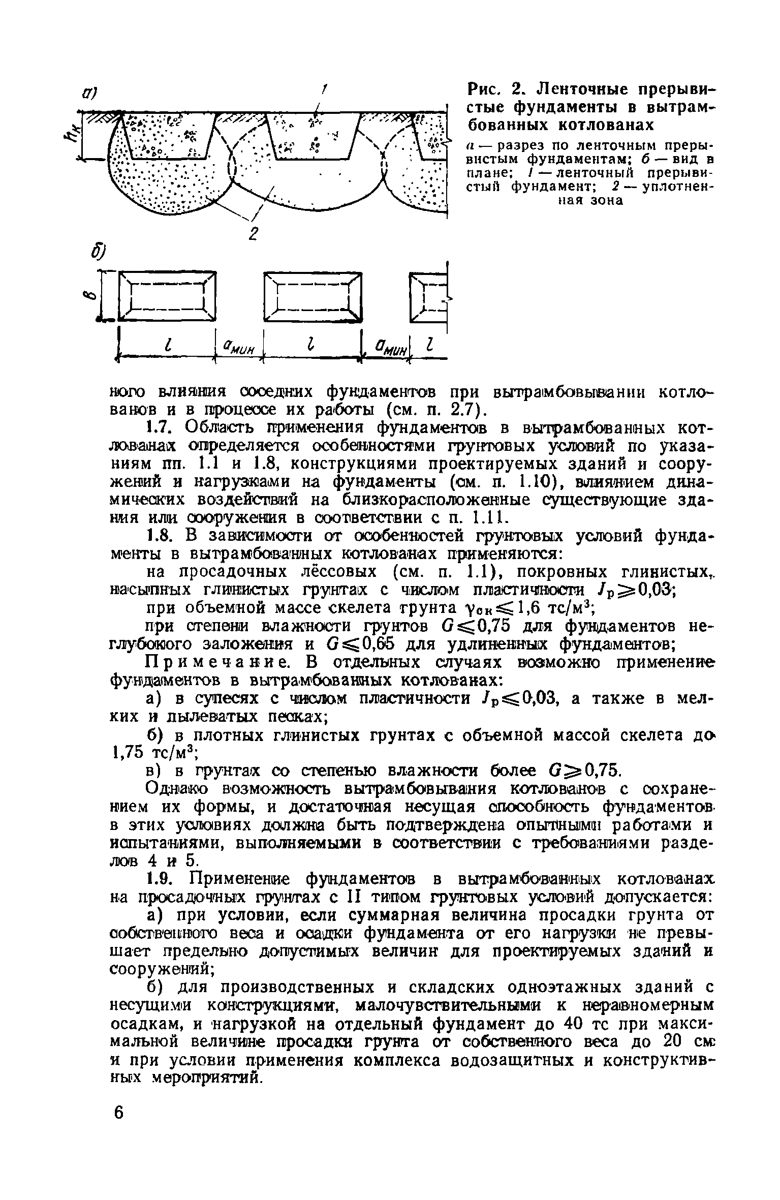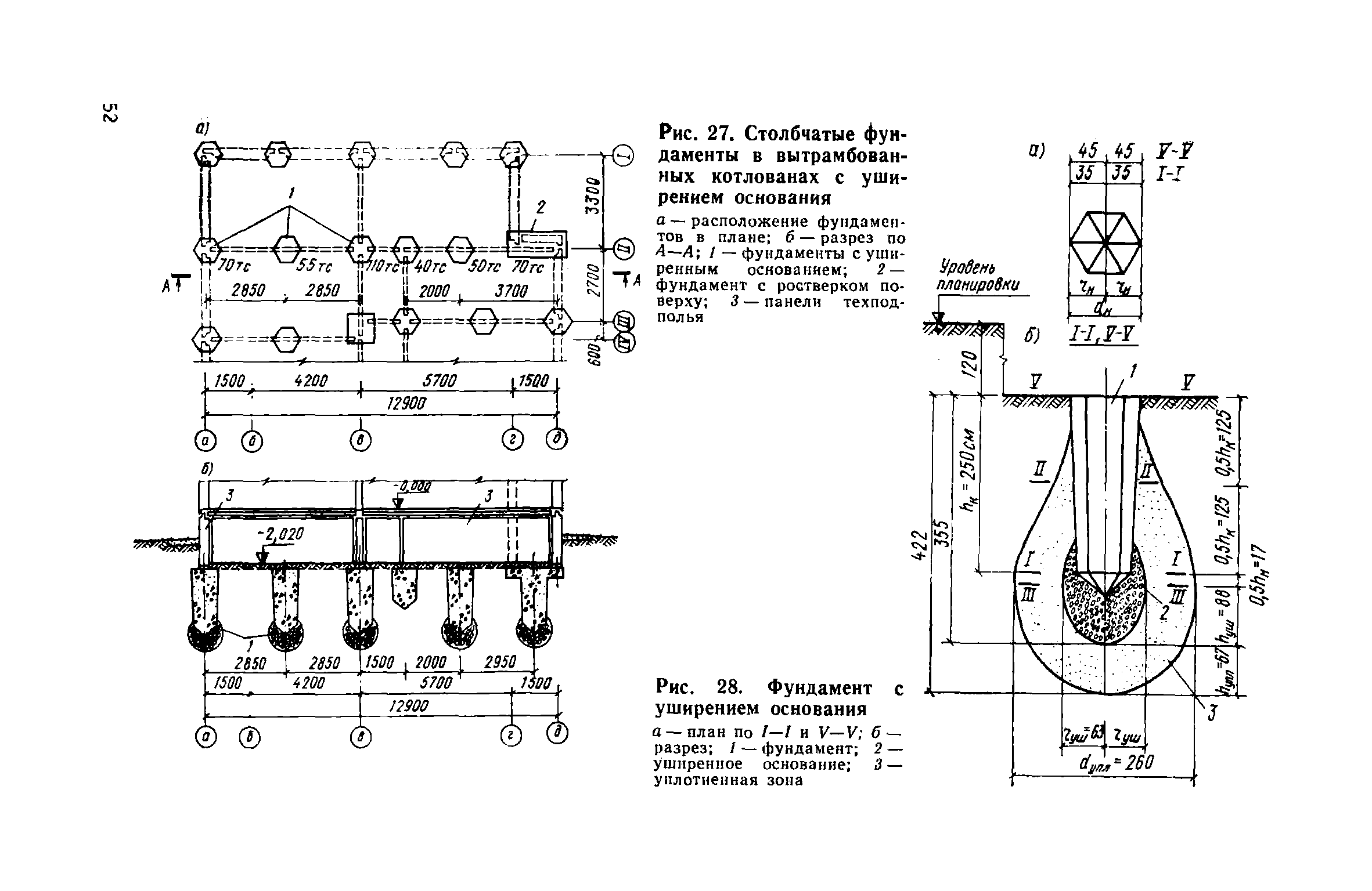 | Оглавление: | Введение 1. Общие положения 2. Проектирование фундаментов в вытрамбованных котлованах Общие положения по проектированию Общие положения по расчету Проектирование отдельно стоящих фундаментов неглубокого заложения и ленточных прерывистых фундаментов Проектирование фундаментов с уширением основания 3. Оборудование для вытрамбовывания котлованов Оборудование на базе крана-экскаватора Оборудование на базе трактора Оборудование на базе сваебойного агрегата 4. Опытные работы по вытрамбовыванию 5. Испытания опытных фундаментов 6. Производство работ Отрывка и подготовка котлована для вытрамбовывания Вытрамбовывание котлованов Втрамбовывание жесткого материала в дно котлована Устройство монолитных фундаментов Устройство сборных фундаментов Особенности производства работ в зимнее время Приложение 1. Пример проектирования отдельно стоящих фундаментов неглубокого заложения Приложение 2. Пример проектирования ленточных прерывистых фундаментов Приложение 3. Пример проектирования отдельно стоящих фундаментов с уширенным основанием Приложение 4. Журнал производства работ по вытрамбовыванию котлованов Приложение 5. Журнал производства работ по втрамбовыванию щебня в дно котлованов |