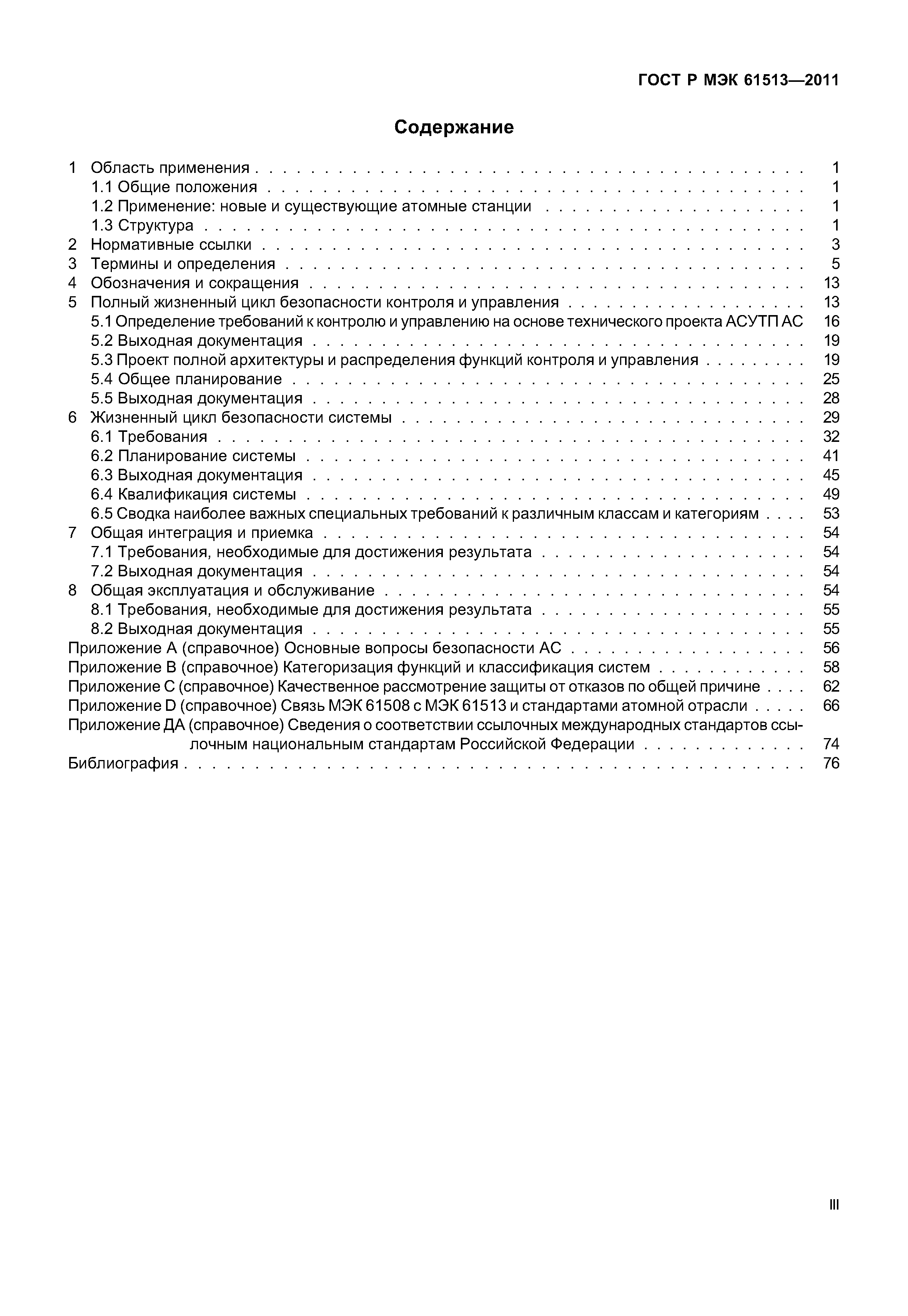 | Оглавление: | 1 Область применения 1.1 Общие положения 1.2 Применение: новые и существующие атомные станции 1.3 Структура 2 Нормативные ссылки 3 Термины и определения 4 Обозначения и сокращения 5 Полный жизненный цикл безопасности контроля и управления 5.1 Определение требований к контролю и управлению на основе технического проекта АСУТП АС 5.2 Выходная документация 5.3 Проект полной архитектуры и распределения функций контроля и управления 5.4 Общее планирование 5.5 Выходная документация 6 Жизненный цикл безопасности системы 6.1 Требования 6.2 Планирование системы 6.3 Выходная документация 6.4 Квалификация системы 6.5 Сводка наиболее важных специальных требований к различным классам и категориям 7 Общая интеграция и приемка 7.1 Требования, необходимые для достижения результата 7.2 Выходная документация 8 Общая эксплуатация и обслуживание 8.1 Требования, необходимые для достижения результата 8.2 Выходная документация Приложение А (справочное) Основные вопросы безопасности АС Приложение В (справочное) Категоризация функций и классификация систем Приложение С (справочное) Качественное рассмотрение защиты от отказов по общей причине . . . Приложение D (справочное) Связь МЭК 61508 с МЭК 61513 и стандартами атомной отрасли Приложение ДА (справочное) Сведения о соответствии ссылочных международных стандартов ссылочным национальным стандартам Российской Федерации Библиография |