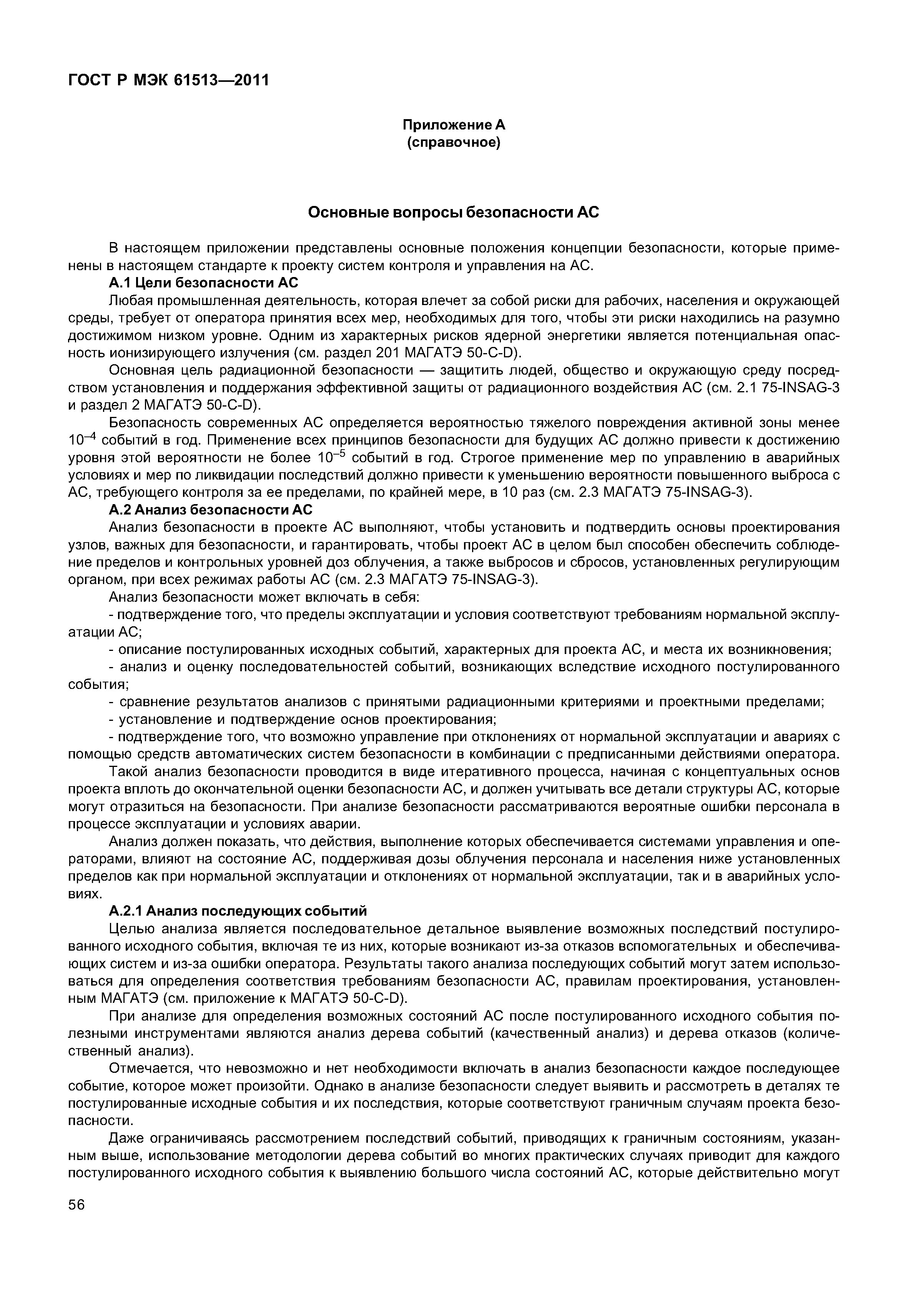 | Область применения: | Системы контроля и управления (СКУ), важные для безопасности атомных станций, могут быть построены на традиционном оборудовании с жесткими связями, оборудовании, основанном на применении компьютерной технологии или с использованием комбинации оборудования обоих типов. Стандарт устанавливает требования и рекомендации для общей архитектуры системы контроля и управления, которая может быть построена с использованием указанных технологий. В стандарте придается большое значение полноте и точности требований, вытекающих из целей, связанных с безопасностью атомной станции, как к исходным данным для выработки всесторонних требований к полной архитектуре системы контроля и управления в целом, так и к отдельным системам контроля и управления, важным для безопасности. В стандарте вводится понятие «концепция жизненного цикла безопасности» для всей архитектуры системы контроля и управления в целом и каждой системы в отдельности. Жизненные циклы безопасности, представленные и рассмотренные в стандарте, не являются единственно возможными; могут применяться и другие жизненные циклы, если будут достигнуты цели, заявленные в настоящем стандарте. Требования стандарта применимы как к системам контроля и управления на новых атомных станциях, так и к реконструируемым и модернизируемым системам на действующих АС. Для действующих станций используется частичный набор требований, объем которых устанавливают перед началом разработки любого проекта. |