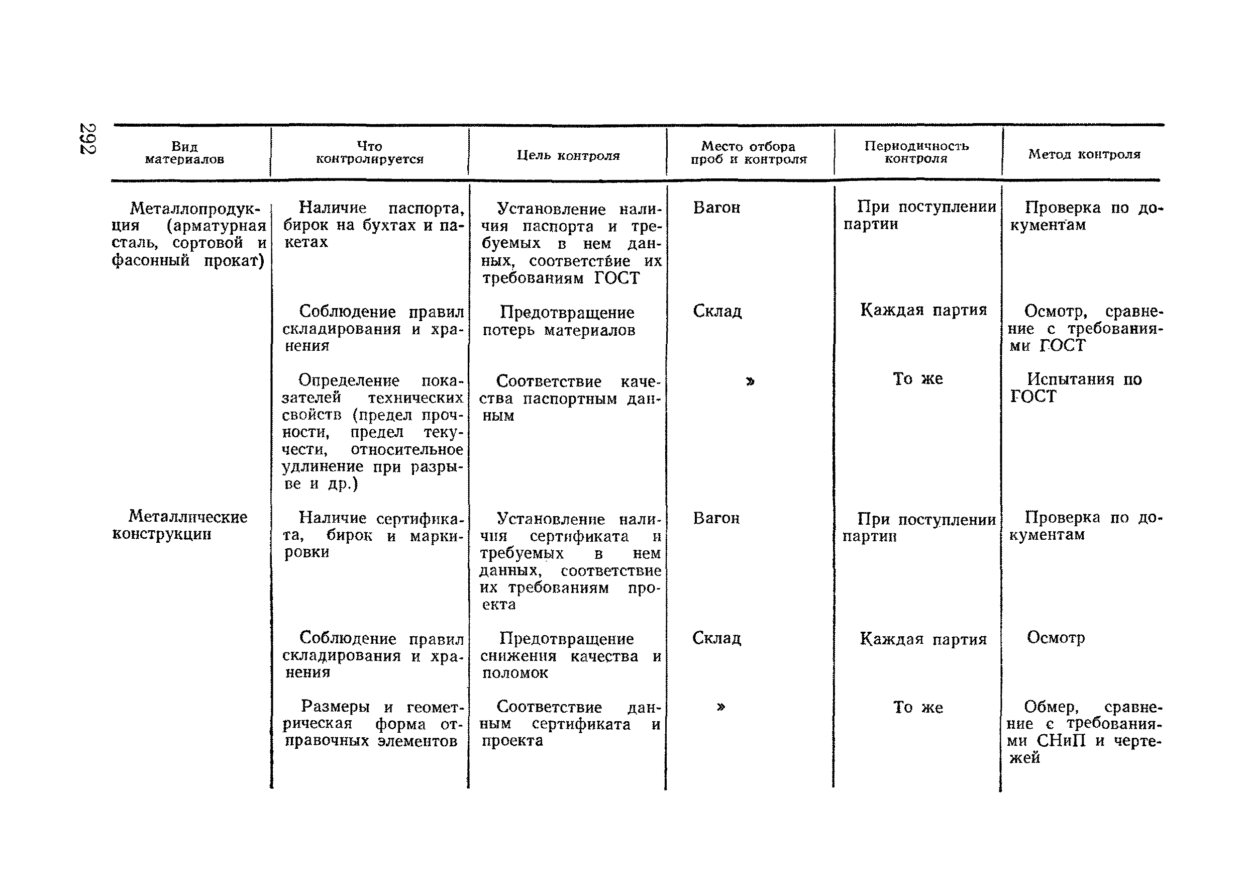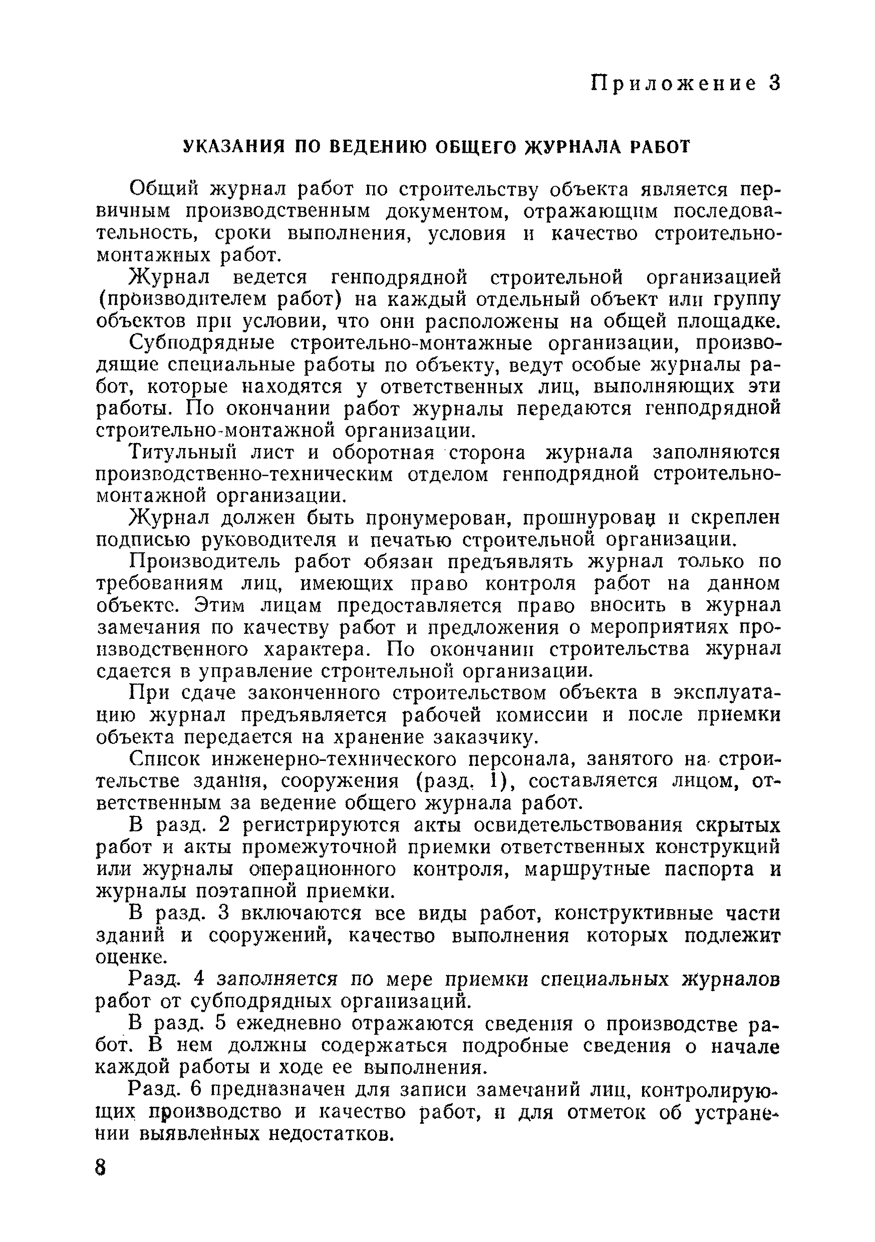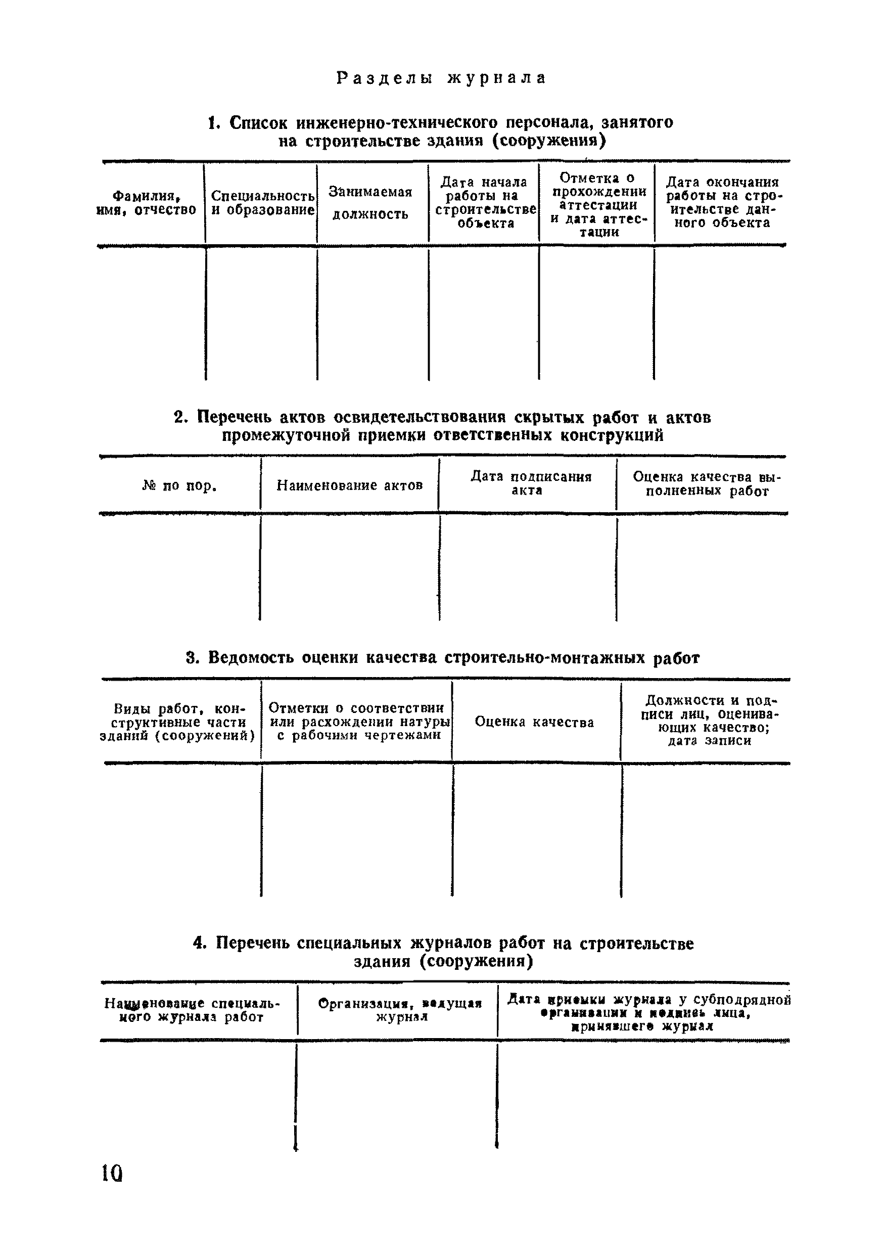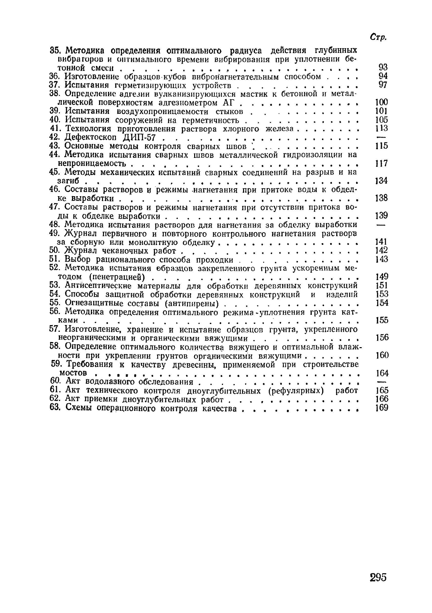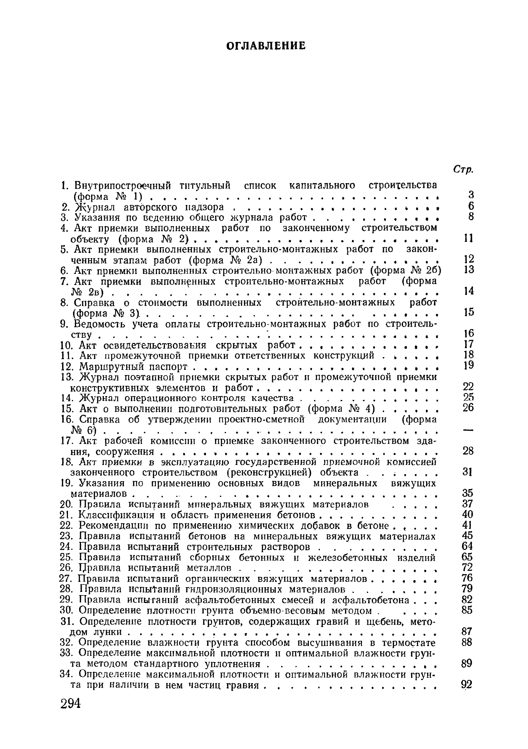 | Оглавление: | 1. Внутрипостроечный титульный список капитального строительства (форма № 1) 2. Журнал авторского надзора 3. Указания по ведению общего журнала работ 4. Акт приемки выполненных работ по законченному строительством объекту (форма № 2) 5. Акт приемки выполненных строительно-монтажных работ по законченным этапам работ (форма № 2а) 6. Акт приемки выполненных строительно- монтажных работ (форма № 2б) 7. Акт приемки выполненных строительно-монтажных работ (форма № 2в) 8. Справка о стоимости выполненных строительно-монтажных работ (форма № 3) 9. Ведомость учета оплаты строительно-монтажных работ по строительству 10. Акт освидетельствования скрытых работ 11. Акт промежуточной приемки ответственных конструкций 12. Маршрутный паспорт 13. Журнал поэтапной приемки скрытых работ и промежуточной приемки конструктивных элементов и работ 14. Журнал операционного контроля качества 15. Акт о выполнении подготовительных работ (форма № 4) 16. Справка об утверждении проектно-сметной документации (форма № 6) 17. Акт рабочей комиссии о приемке законченного строительством здания, сооружения 18. Акт приемки в эксплуатацию государственной приемочной комиссией законченного строительством (реконструкцией) объекта 19. Указания по применению основных видов минеральных вяжущих материалов 20. Правила испытаний минеральных вяжущих материалов 21. Классификация и область применения бетонов 22. Рекомендации по применению химических добавок в бетоне 23. Правила испытаний бетонов на минеральных вяжущих материалах 24. Правила испытаний строительных растворов 25. Правила испытаний сборных бетонных и железобетонных изделий 26. Правила испытаний металлов 27. Правила испытаний органических вяжущих материалов 28. Правила испытаний гидроизоляционных материалов 29. Правила испытаний асфальтобетонных смесей и асфальтобетона 30. Определение плотности грунта о6ъемновесовым методом 31. Определение плотности грунтов, содержащих гравий и щебень, методом лунки 32. Определение влажности грунта способом высушивания в термостате 33. Определение максимальной плотности и оптимальной влажности грунта методом стандартного уплотнения 34. Определение максимальной плотности и оптимальной влажности грунта при наличии в нем частиц гравия 35. Методика определения оптимального радиуса действия глубинных вибраторов и оптимального времени вибрирования при уплотнении бетонной смеси 36, Изготовление образцов кубов вибронагнетательным способом 37. Испытания герметизирующих устройств 38. Определение адгезии вулканизирующихся мастик к бетонной и металлической поверхностям адгезнометром АГ 39. Испытания воздухопроницаемости стыков 40. Испытания сооружений на герметичность 41. Технология приготовления раствора хлорного железа 42. Дефектоскоп ДИП-57 43. Основные методы контроля сварных швов 44. Методика испытания сварных швов металлической гидроизоляции на непроницаемость 45. Методы механических испытаний сварных соединений на разрыв и на загиб 46. Составы растворов и режимы нагнетания при притоке воды к обделке выработки 47. Составы растворов и режимы нагнетания при отсутствии притока воды к обделке выработки 48, Методика испытания растворов для нагнетания за обделку выработки 49, Журнал первичного и повторного контрольного нагнетания раствора за сборную или монолитную обделку 50. Журнал чек