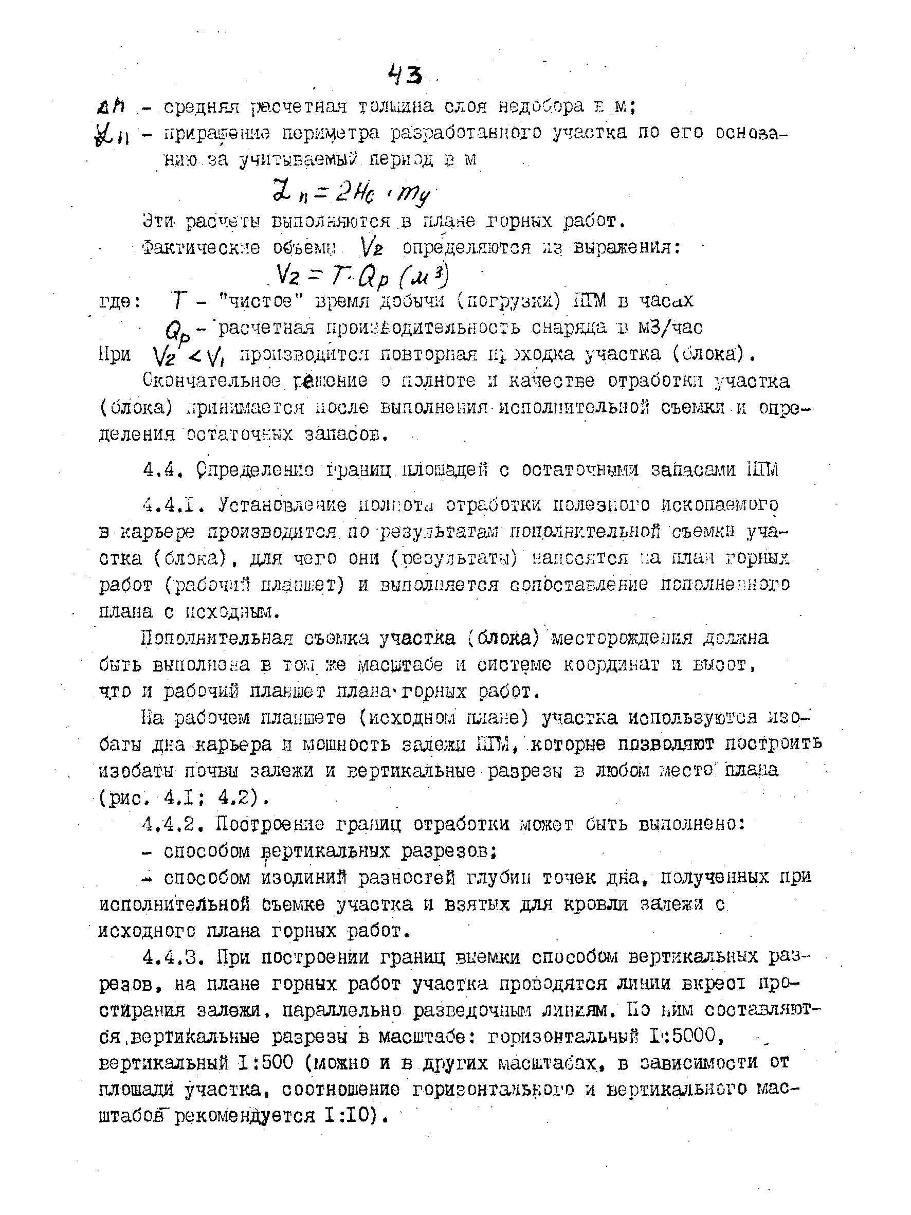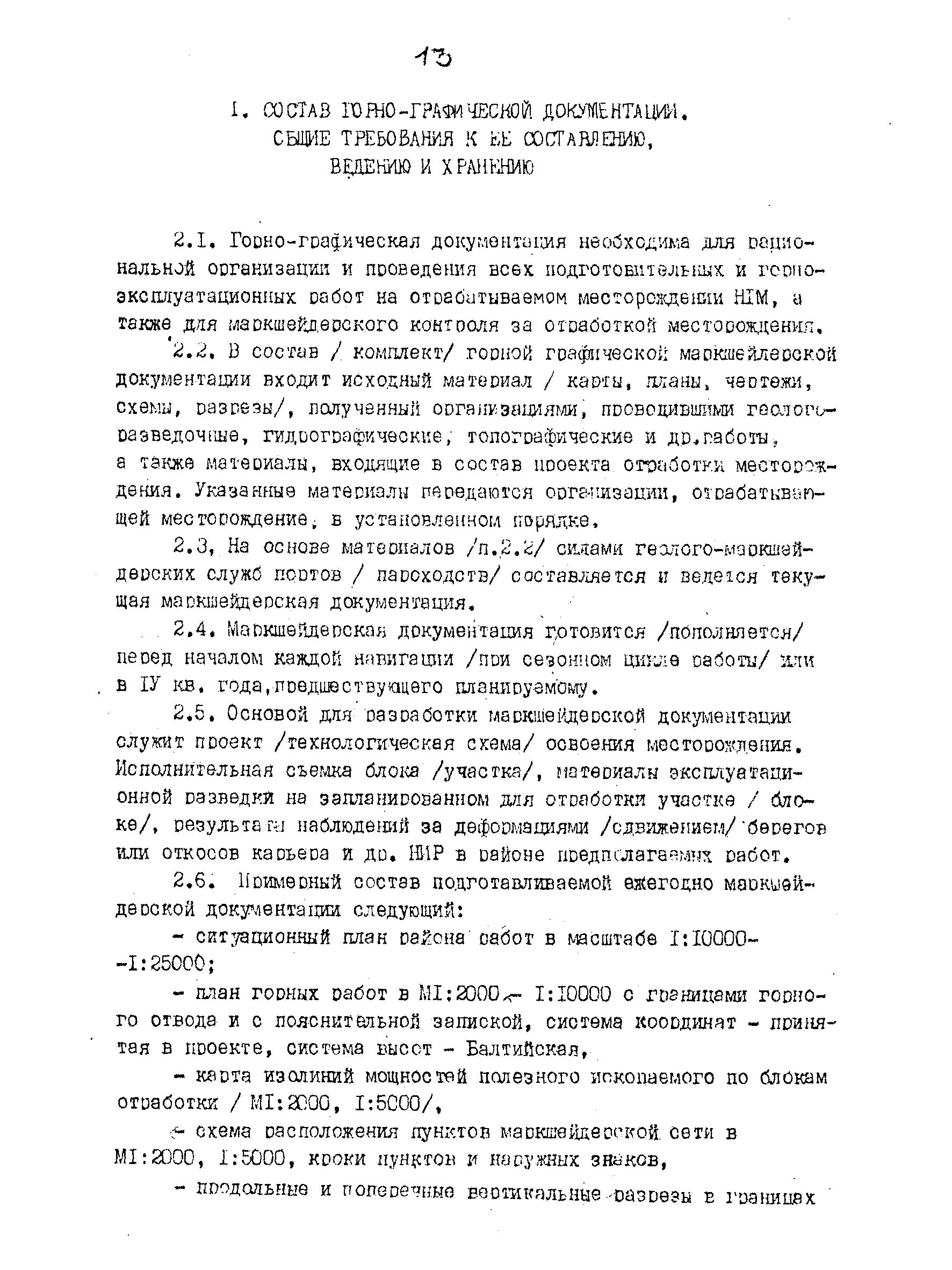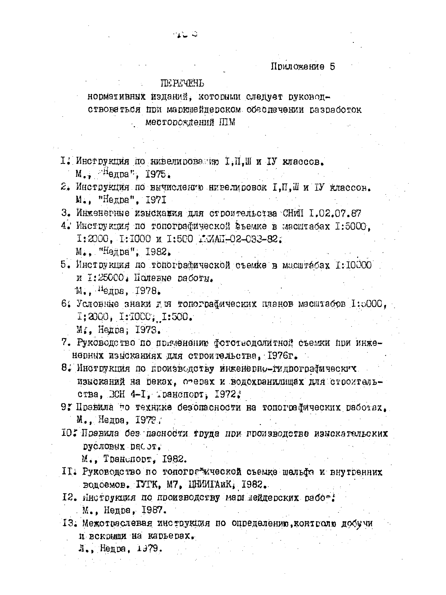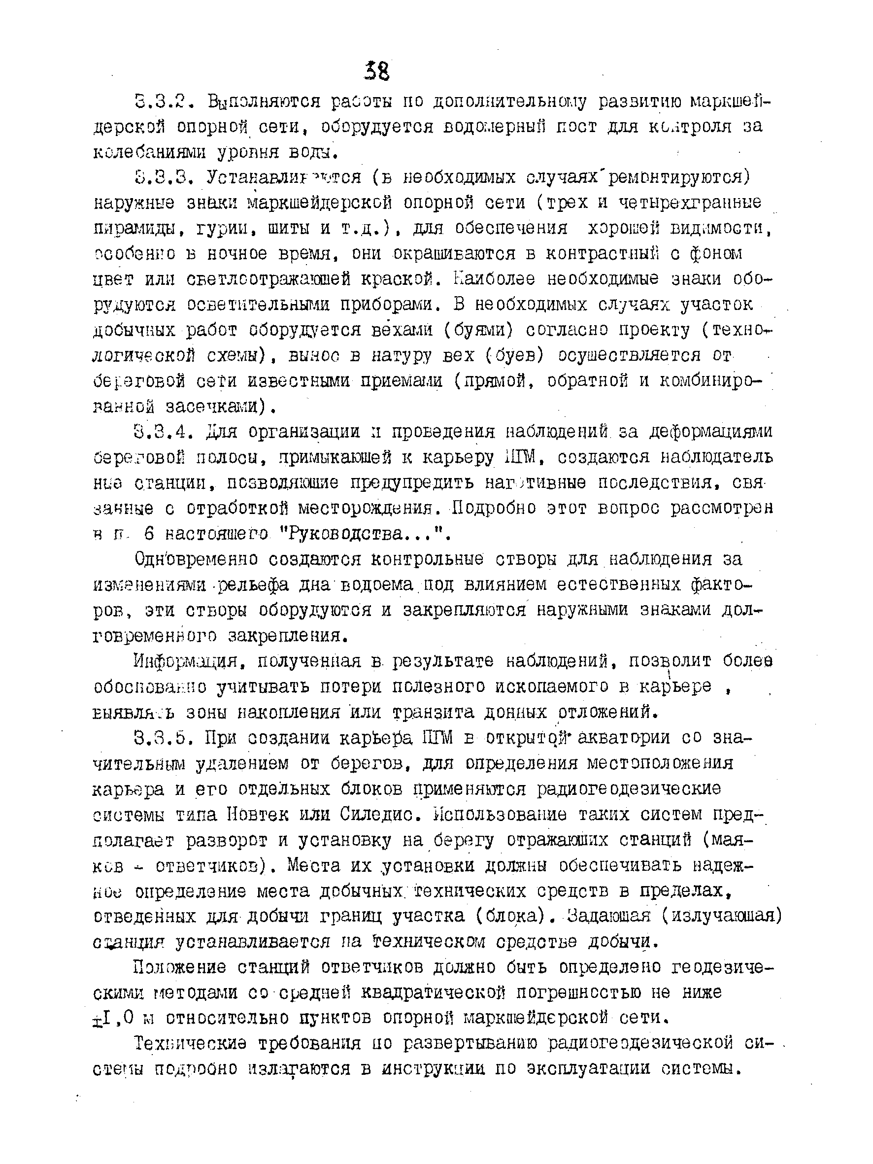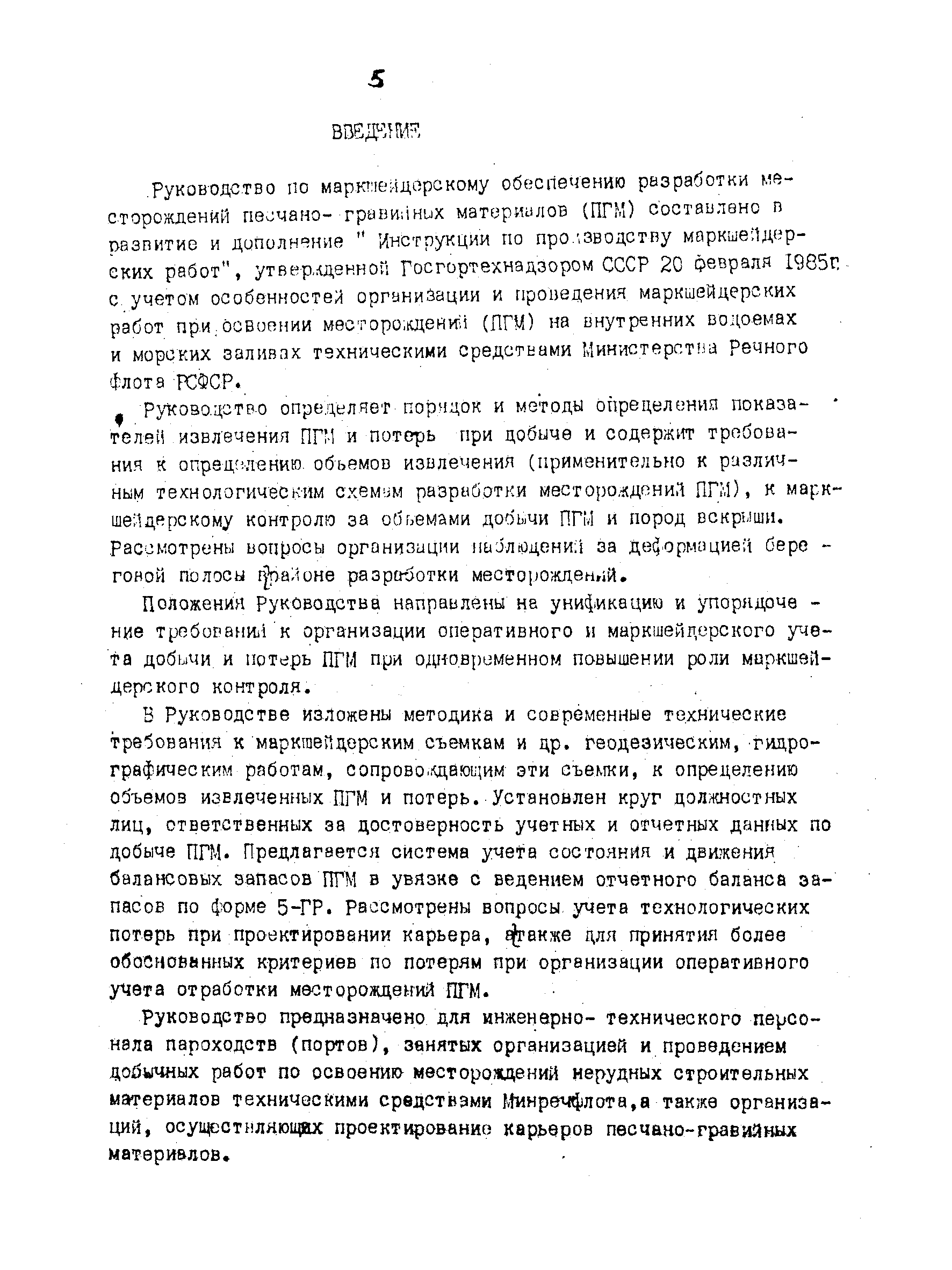 Руководство по маркшейдерскому обеспечению разработки месторождений песчано-гравийных материалов на водоемах| Статус: | действует | | Название рус.: | Руководство по маркшейдерскому обеспечению разработки месторождений песчано-гравийных материалов на водоемах | | Дата добавления в базу: | 01.09.2013 | | Дата актуализации: | 01.01.2021 | | Область применения: | Руководство определяет порядок и методы определения показателей извлечения ПГМ и потерь при добыче и содержит требования к определению объемов извлечения, к маркшейдерскому контролю за объемами добычи ПГМ и пород вскрыши. | | Оглавление: | Введение 1. Общие положения 2. Состав горно-графической маркшейдерской документации. Общие требования к ее составлению, ведению и хранению 3. Маркшейдерские работы, связанные с подготовкой месторождений ПГМ к отработке 3.1. Создание планово-высотной сети. Технические требования 3.2. Предварительная съемка участка месторождения. Технические требования. Промеры глубин. Береговые работы. Зимние работы со льда 3.3. Подготовка территории карьера ПГМ к отработке 4. Маркшейдерский контроль за отработкой месторождений ПГМ 4.1. Общие положения 4.2. Исполнительные съемки, особенность их проведения, периодичность. Технические требования 4.3. Оперативный контроль за полнотой и качеством отработки месторождений ПГМ 4.4. Определение границ площадей с остаточными запасами ПГМ 4.5. Маркшейдерские работы, сопровождающие эксплуатационную разведку на отрабатываемом месторождении 4.6. Организация контроля за изменением рельефа дна карьера под влиянием естественных факторов 5. Организация учета добычи и полноты извлечения полезного ископаемого 5.1. Оперативный учет 5.2. Маркшейдерский учет 5.3. Определение объемов извлечения ПГМ 6. Организация наблюдений за деформацией береговой полосы в районе разработки месторождений ПГМ Приложения: 1. Пример на определение объёма добытой горной массы на участке большой площади 2. Пример на определение объемов добытой горной массы на участке небольшой площади 3. Технологические потери 4. Способ определения смещенного положения сетки квадратов 5. Перечень нормативных изданий, которыми следует руководствоваться при маркшейдерском обеспечении разработок месторождений ПГМ 6. Состав и порядок составления паспорта блока (участка) 7. Паспорт блока (участка) 9. Инвентарная книга геолого-маркшейдерских документов порта 9. Ведомость учета эксплуатации песчано-гравийных месторождений в бассейне речного пароходства 10. Типы знаков долговременно закрепления съемочных сетей 11. Примерные схемы проложения съемочных сетей 12 .Журнал маркшейдерских указаний Список использованной литературы | | Разработан: | Ленгипроречтранс