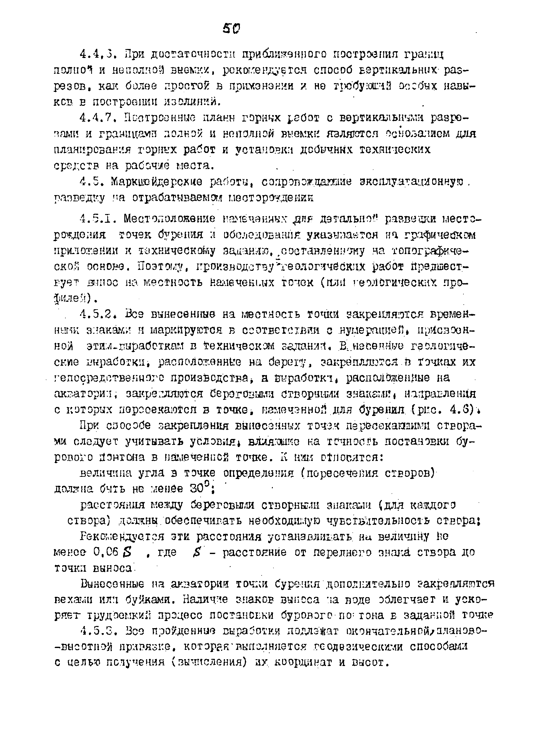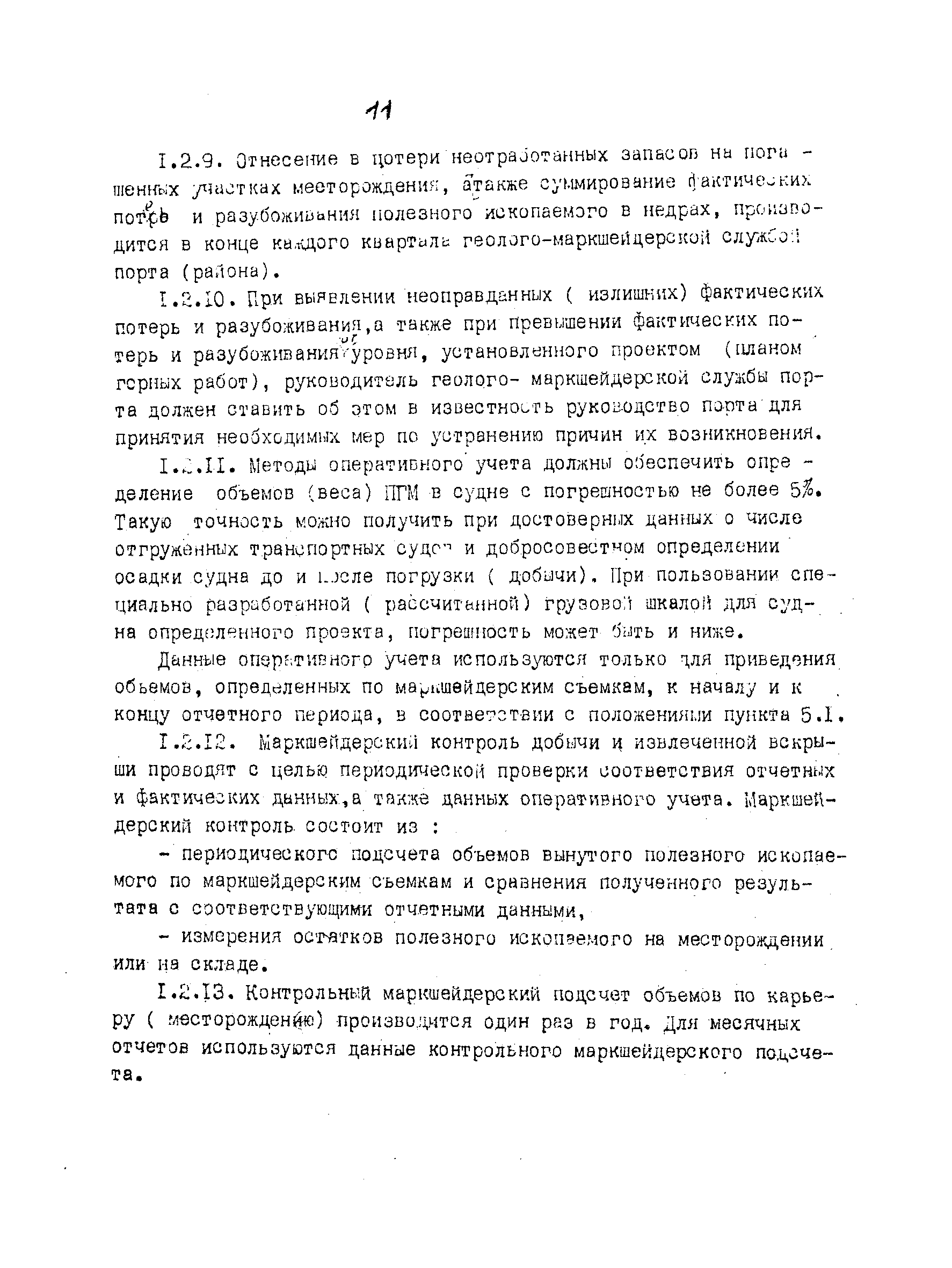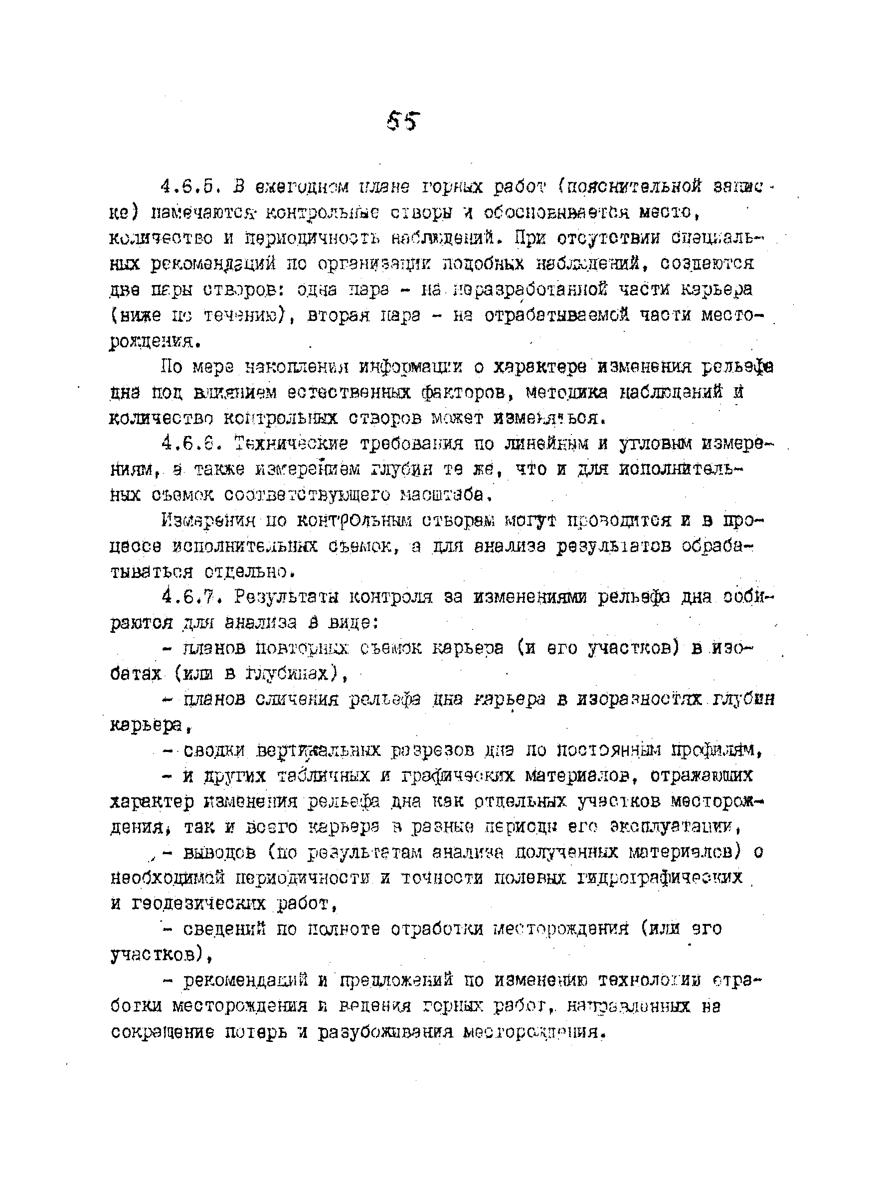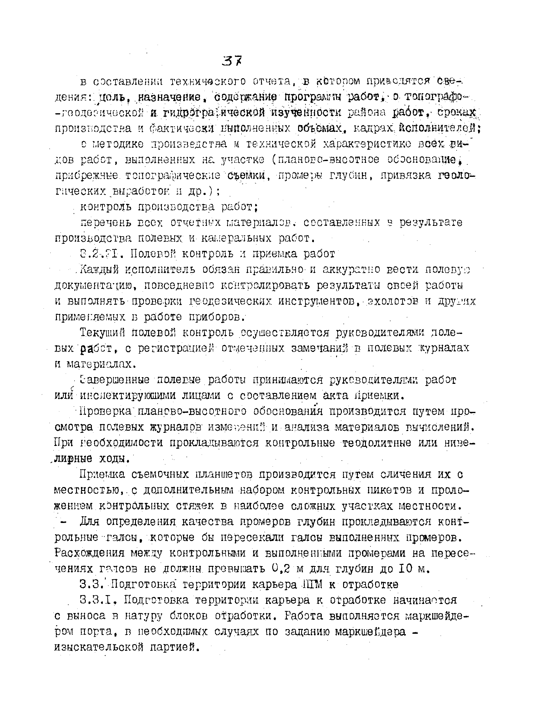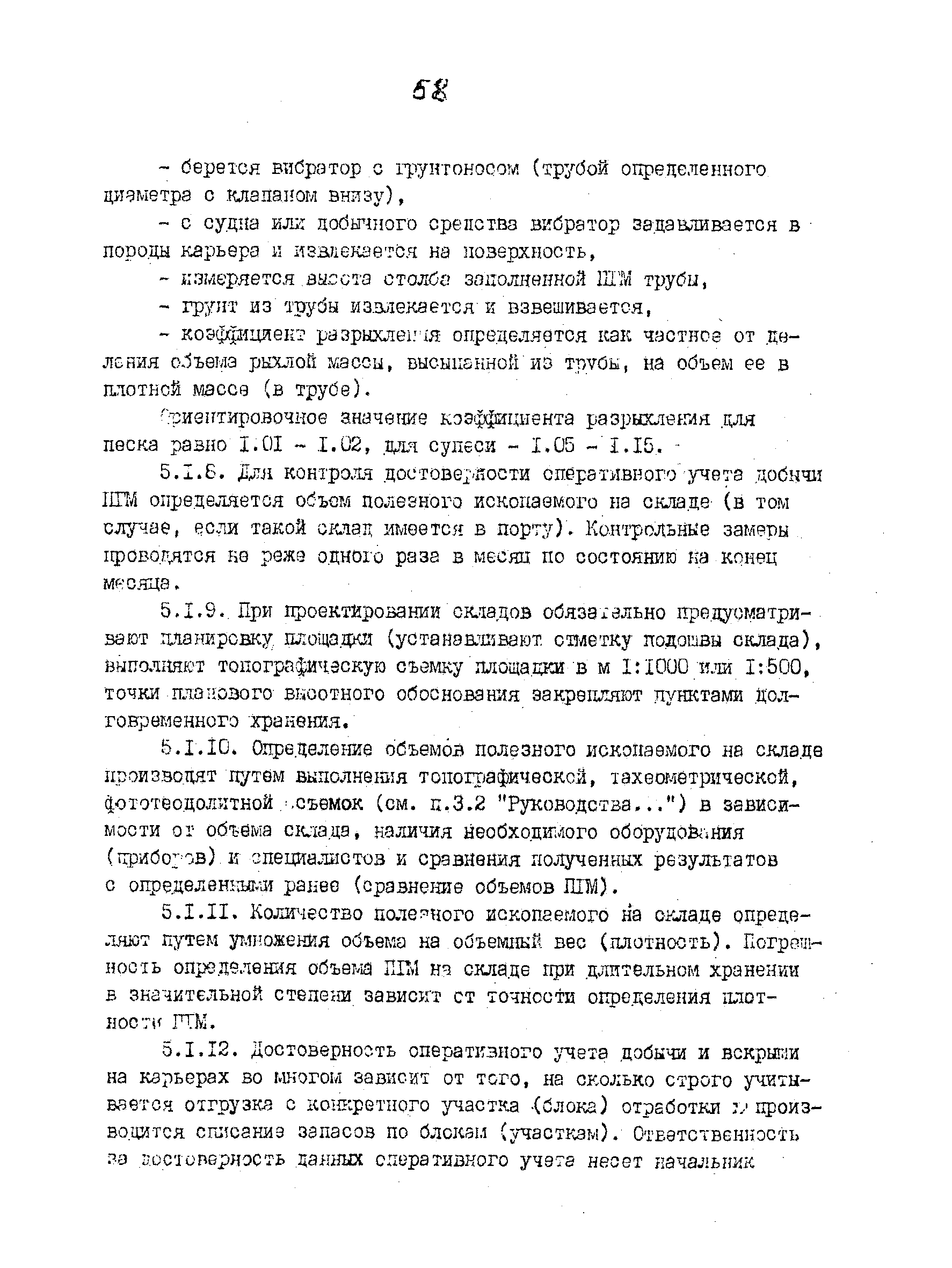 Руководство по маркшейдерскому обеспечению разработки месторождений песчано-гравийных материалов на водоемах| Статус: | действует | | Название рус.: | Руководство по маркшейдерскому обеспечению разработки месторождений песчано-гравийных материалов на водоемах | | Дата добавления в базу: | 01.09.2013 | | Дата актуализации: | 01.01.2021 | | Область применения: | Руководство определяет порядок и методы определения показателей извлечения ПГМ и потерь при добыче и содержит требования к определению объемов извлечения, к маркшейдерскому контролю за объемами добычи ПГМ и пород вскрыши. | | Оглавление: | Введение 1. Общие положения 2. Состав горно-графической маркшейдерской документации. Общие требования к ее составлению, ведению и хранению 3. Маркшейдерские работы, связанные с подготовкой месторождений ПГМ к отработке 3.1. Создание планово-высотной сети. Технические требования 3.2. Предварительная съемка участка месторождения. Технические требования. Промеры глубин. Береговые работы. Зимние работы со льда 3.3. Подготовка территории карьера ПГМ к отработке 4. Маркшейдерский контроль за отработкой месторождений ПГМ 4.1. Общие положения 4.2. Исполнительные съемки, особенность их проведения, периодичность. Технические требования 4.3. Оперативный контроль за полнотой и качеством отработки месторождений ПГМ 4.4. Определение границ площадей с остаточными запасами ПГМ 4.5. Маркшейдерские работы, сопровождающие эксплуатационную разведку на отрабатываемом месторождении 4.6. Организация контроля за изменением рельефа дна карьера под влиянием естественных факторов 5. Организация учета добычи и полноты извлечения полезного ископаемого 5.1. Оперативный учет 5.2. Маркшейдерский учет 5.3. Определение объемов извлечения ПГМ 6. Организация наблюдений за деформацией береговой полосы в районе разработки месторождений ПГМ Приложения: 1. Пример на определение объёма добытой горной массы на участке большой площади 2. Пример на определение объемов добытой горной массы на участке небольшой площади 3. Технологические потери 4. Способ определения смещенного положения сетки квадратов 5. Перечень нормативных изданий, которыми следует руководствоваться при маркшейдерском обеспечении разработок месторождений ПГМ 6. Состав и порядок составления паспорта блока (участка) 7. Паспорт блока (участка) 9. Инвентарная книга геолого-маркшейдерских документов порта 9. Ведомость учета эксплуатации песчано-гравийных месторождений в бассейне речного пароходства 10. Типы знаков долговременно закрепления съемочных сетей 11. Примерные схемы проложения съемочных сетей 12 .Журнал маркшейдерских указаний Список использованной литературы | | Разработан: | Ленгипроречтранс
