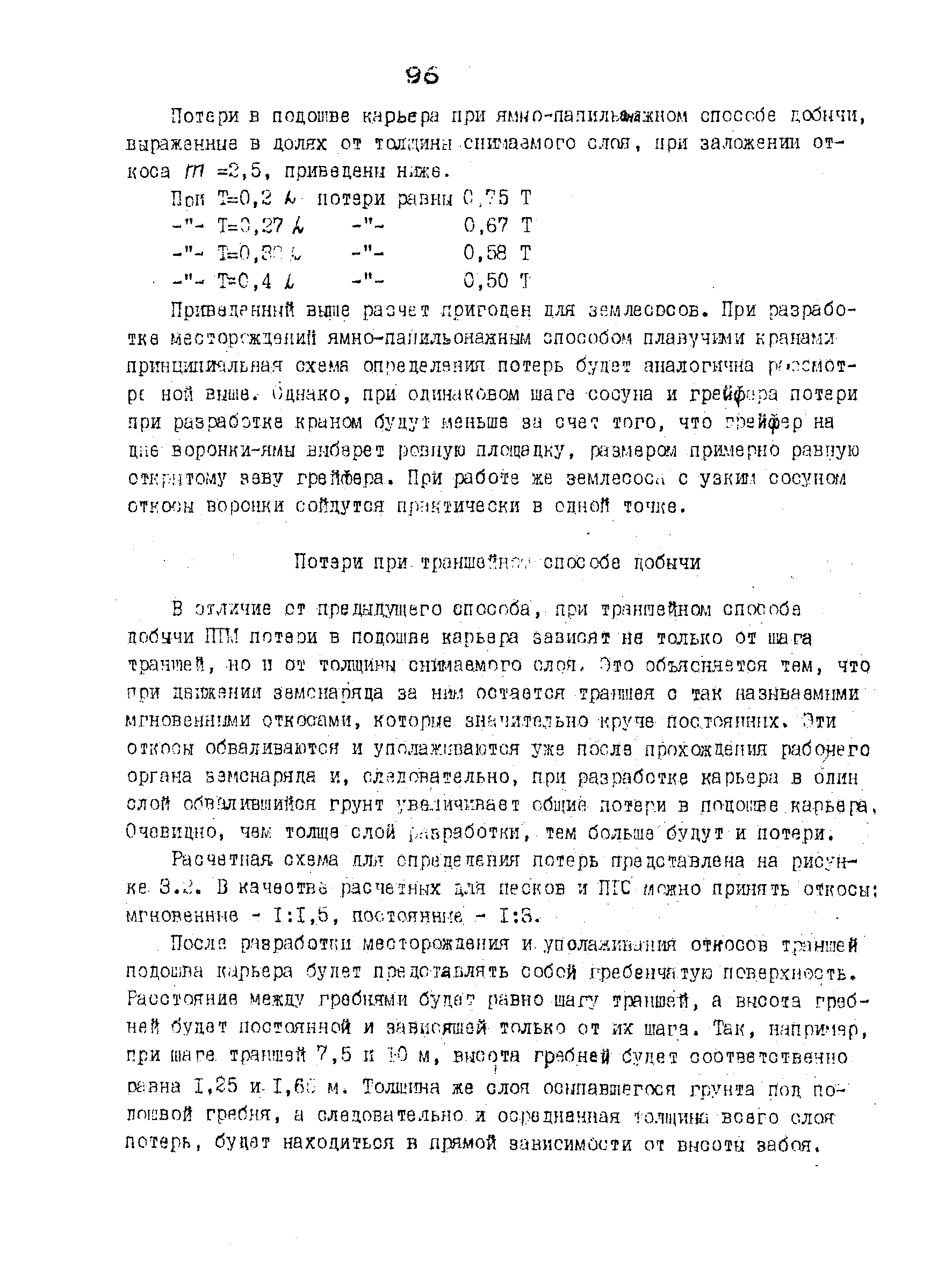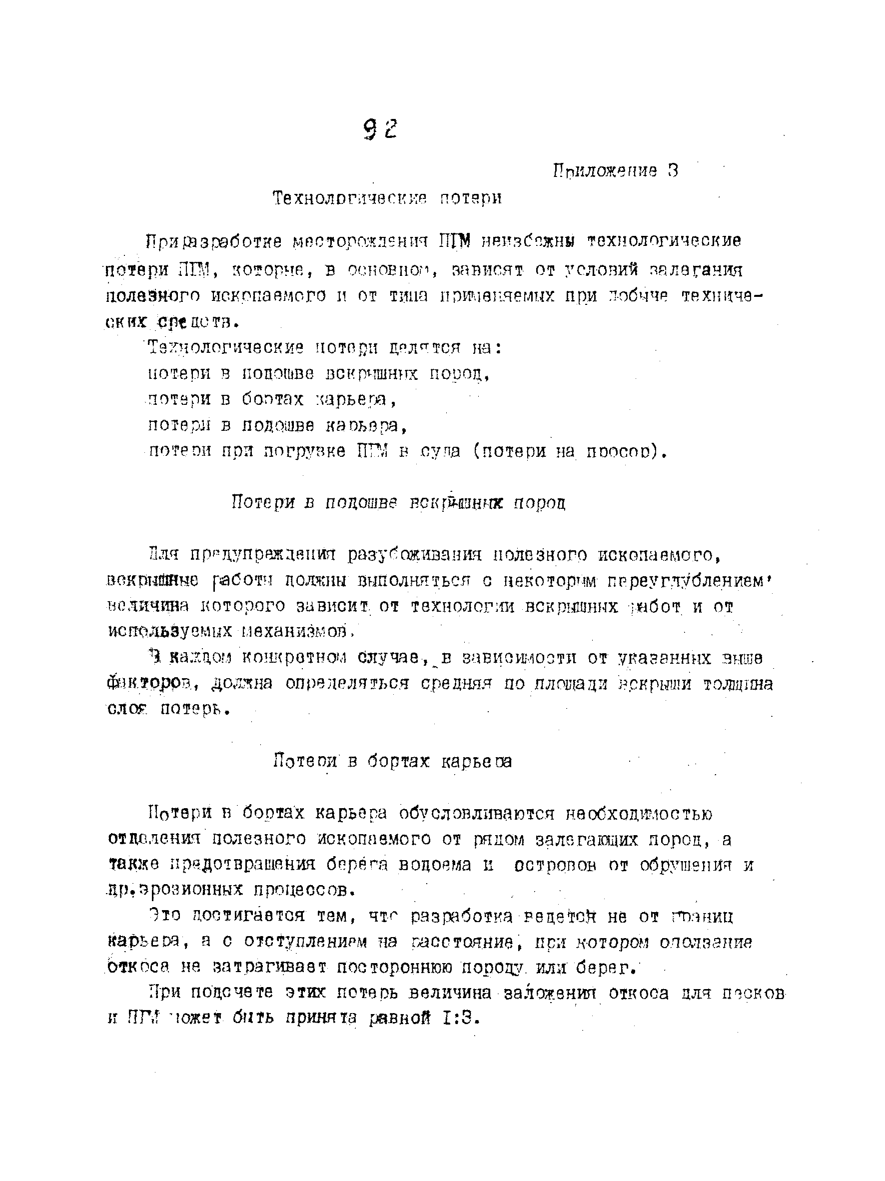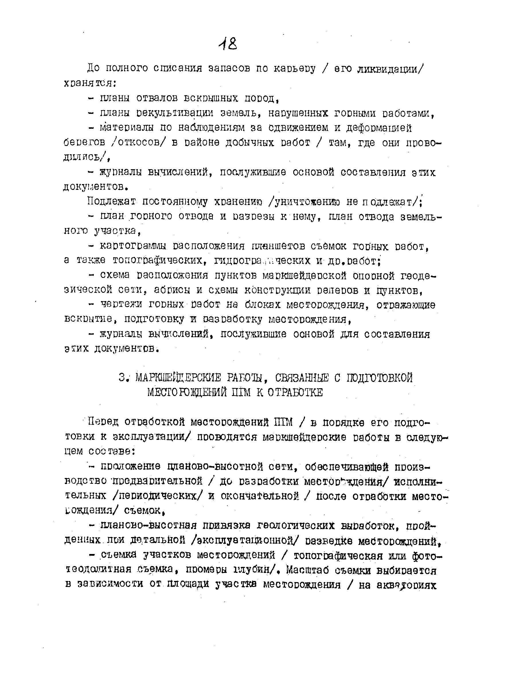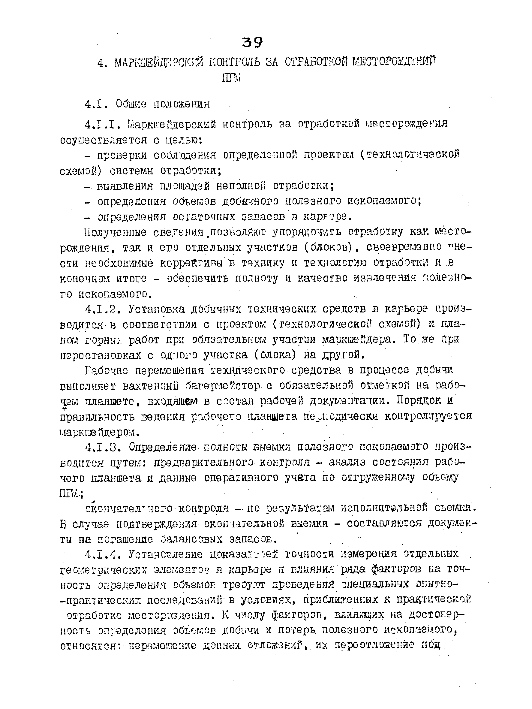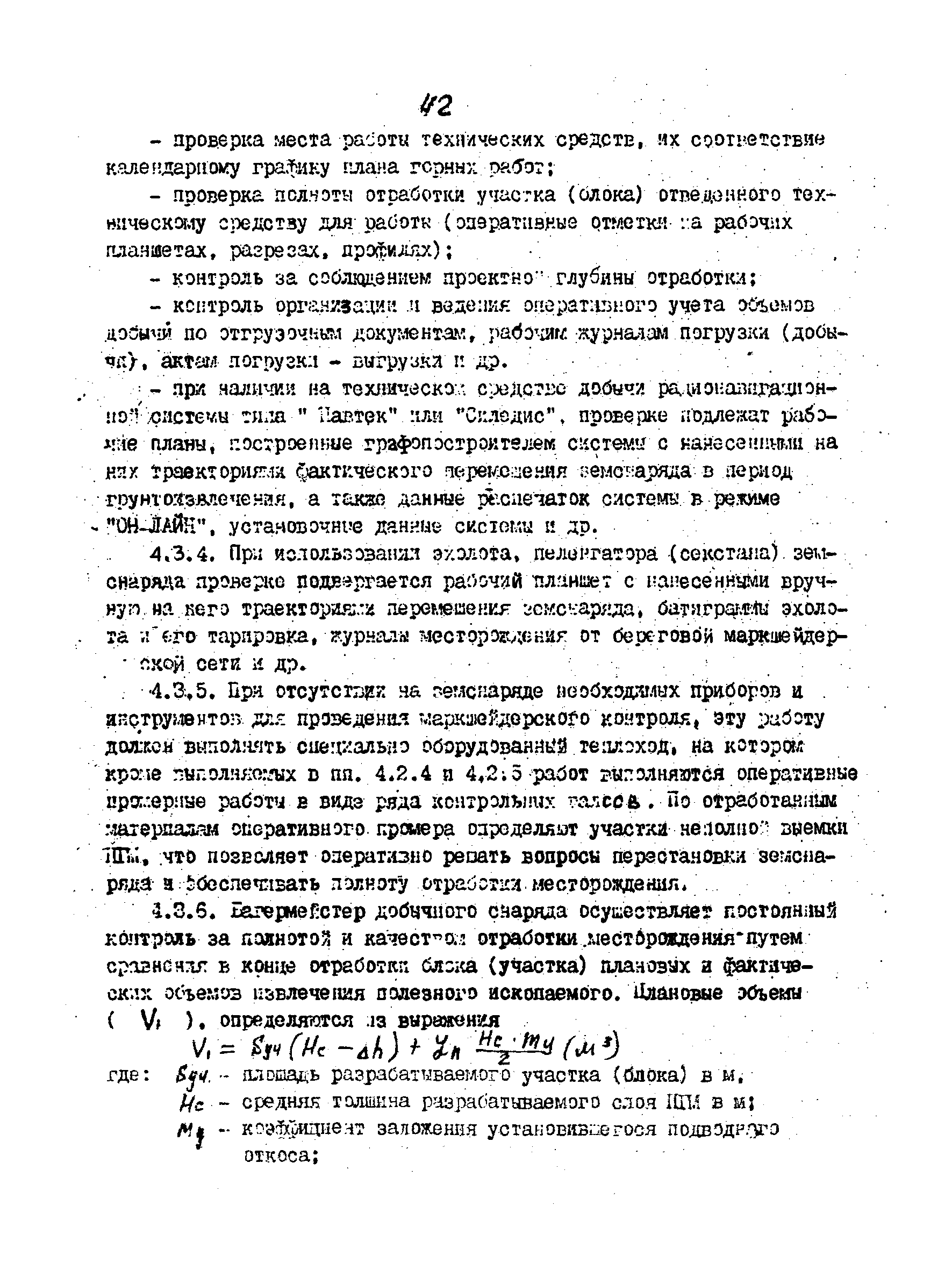 Руководство по маркшейдерскому обеспечению разработки месторождений песчано-гравийных материалов на водоемах| Статус: | действует | | Название рус.: | Руководство по маркшейдерскому обеспечению разработки месторождений песчано-гравийных материалов на водоемах | | Дата добавления в базу: | 01.09.2013 | | Дата актуализации: | 01.01.2021 | | Область применения: | Руководство определяет порядок и методы определения показателей извлечения ПГМ и потерь при добыче и содержит требования к определению объемов извлечения, к маркшейдерскому контролю за объемами добычи ПГМ и пород вскрыши. | | Оглавление: | Введение 1. Общие положения 2. Состав горно-графической маркшейдерской документации. Общие требования к ее составлению, ведению и хранению 3. Маркшейдерские работы, связанные с подготовкой месторождений ПГМ к отработке 3.1. Создание планово-высотной сети. Технические требования 3.2. Предварительная съемка участка месторождения. Технические требования. Промеры глубин. Береговые работы. Зимние работы со льда 3.3. Подготовка территории карьера ПГМ к отработке 4. Маркшейдерский контроль за отработкой месторождений ПГМ 4.1. Общие положения 4.2. Исполнительные съемки, особенность их проведения, периодичность. Технические требования 4.3. Оперативный контроль за полнотой и качеством отработки месторождений ПГМ 4.4. Определение границ площадей с остаточными запасами ПГМ 4.5. Маркшейдерские работы, сопровождающие эксплуатационную разведку на отрабатываемом месторождении 4.6. Организация контроля за изменением рельефа дна карьера под влиянием естественных факторов 5. Организация учета добычи и полноты извлечения полезного ископаемого 5.1. Оперативный учет 5.2. Маркшейдерский учет 5.3. Определение объемов извлечения ПГМ 6. Организация наблюдений за деформацией береговой полосы в районе разработки месторождений ПГМ Приложения: 1. Пример на определение объёма добытой горной массы на участке большой площади 2. Пример на определение объемов добытой горной массы на участке небольшой площади 3. Технологические потери 4. Способ определения смещенного положения сетки квадратов 5. Перечень нормативных изданий, которыми следует руководствоваться при маркшейдерском обеспечении разработок месторождений ПГМ 6. Состав и порядок составления паспорта блока (участка) 7. Паспорт блока (участка) 9. Инвентарная книга геолого-маркшейдерских документов порта 9. Ведомость учета эксплуатации песчано-гравийных месторождений в бассейне речного пароходства 10. Типы знаков долговременно закрепления съемочных сетей 11. Примерные схемы проложения съемочных сетей 12 .Журнал маркшейдерских указаний Список использованной литературы | | Разработан: | Ленгипроречтранс