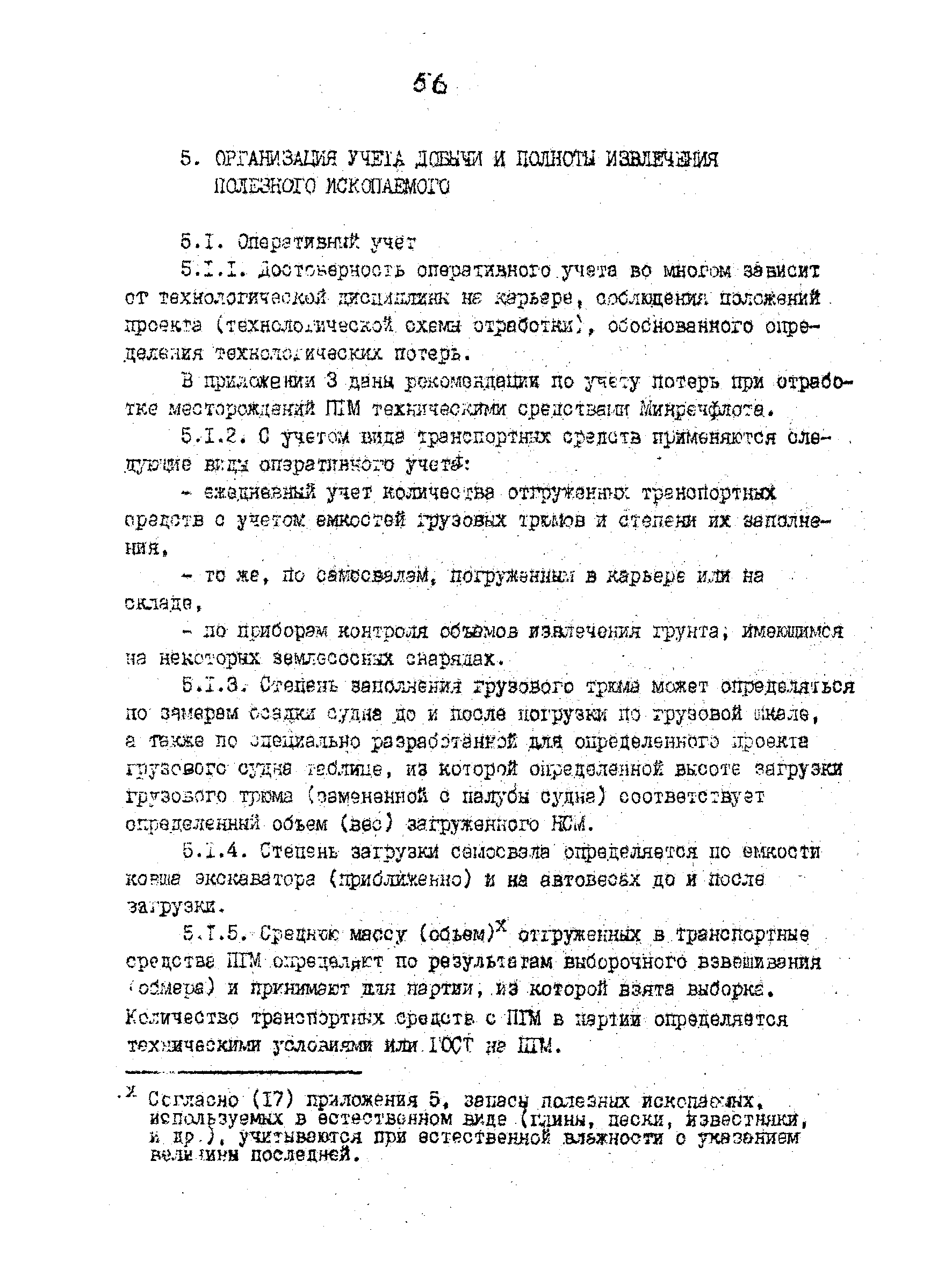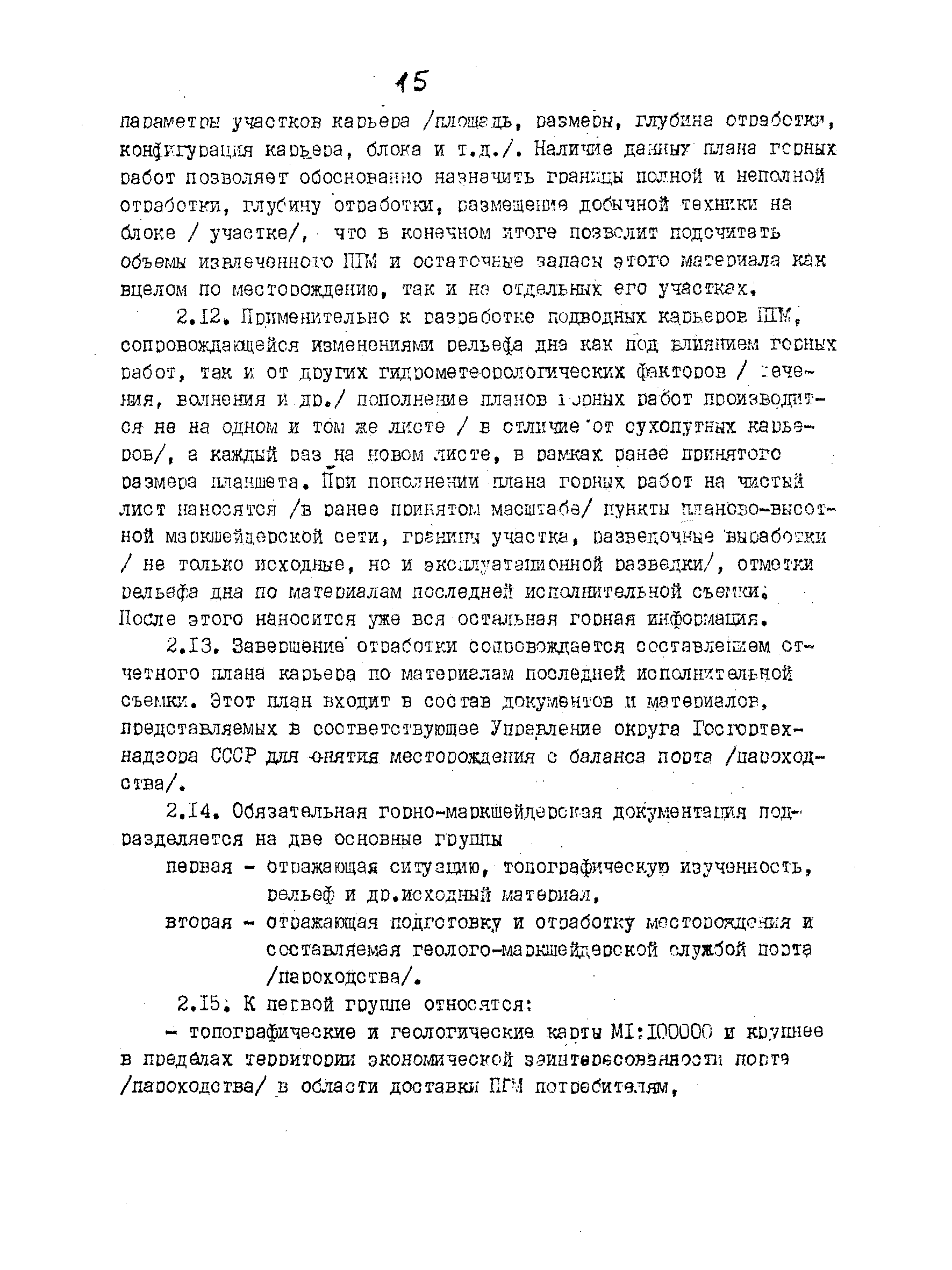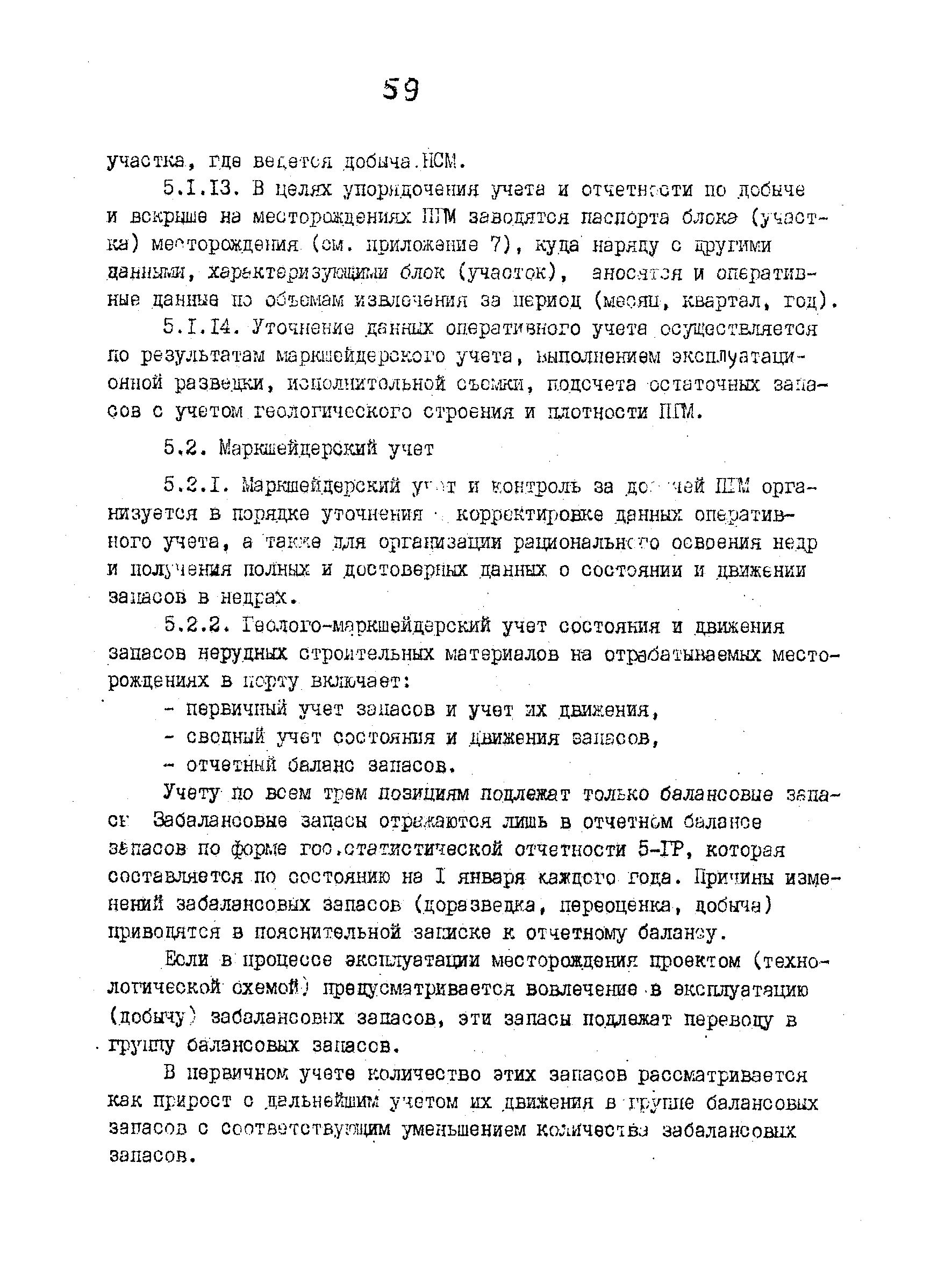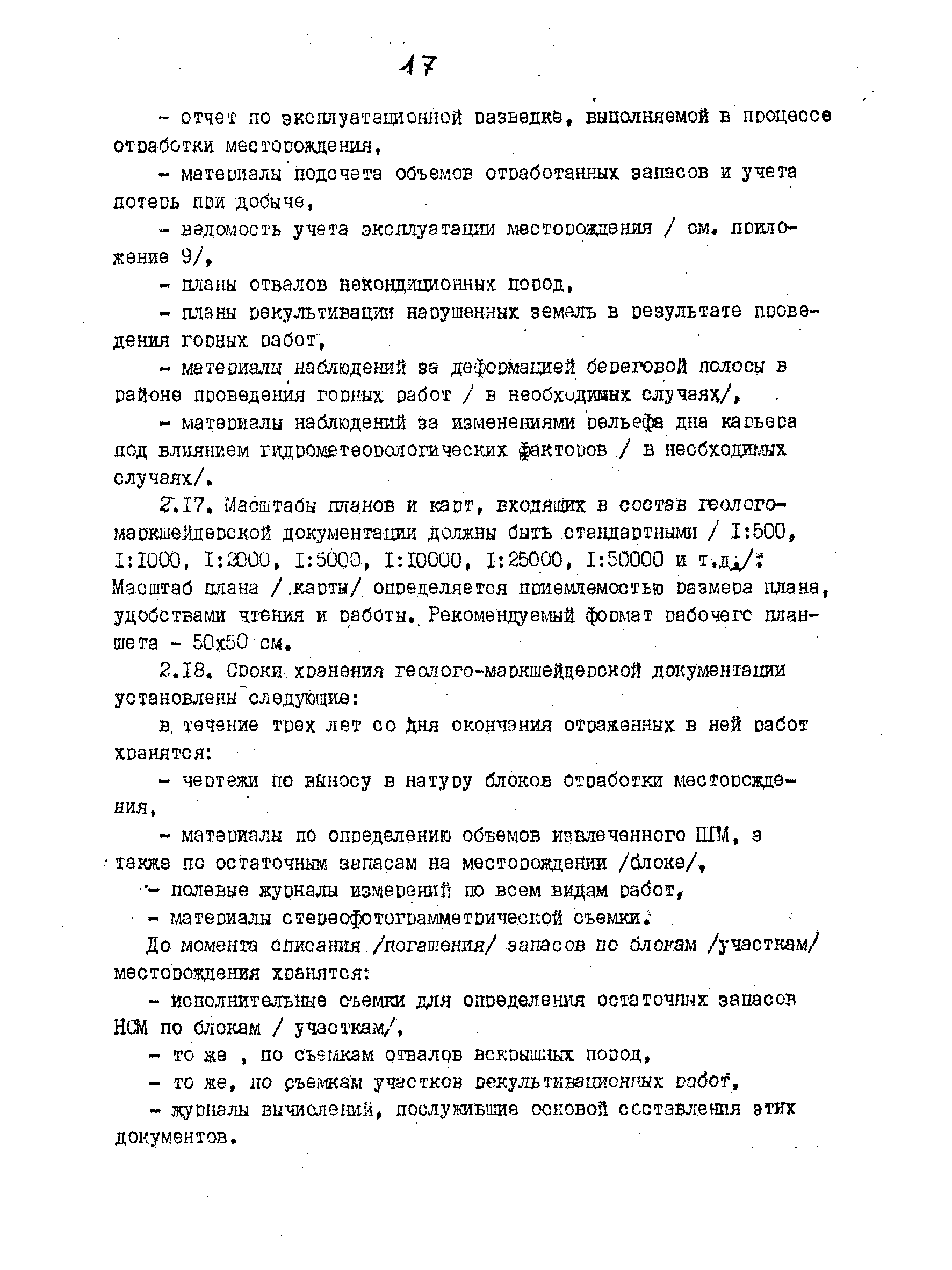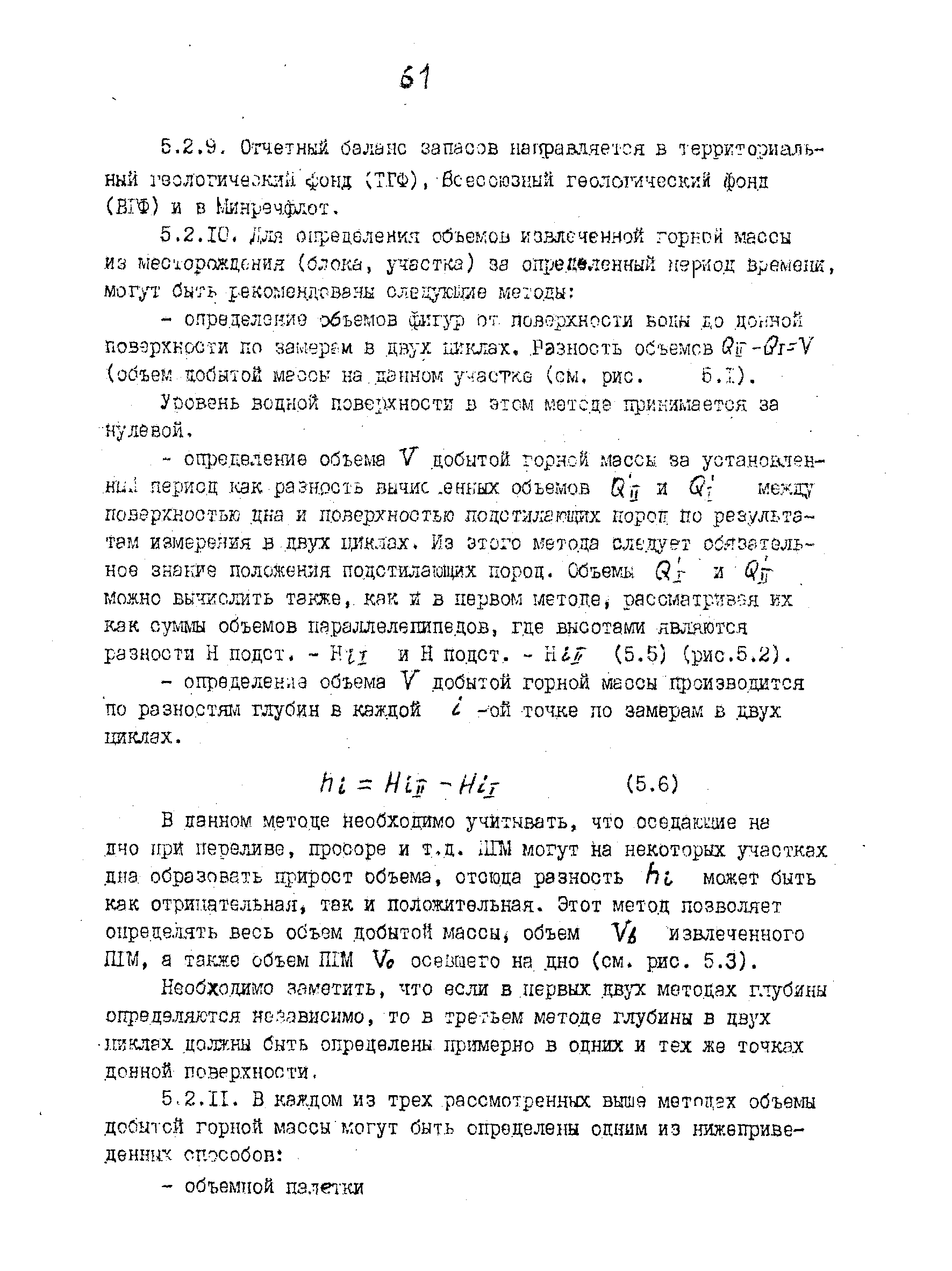 Руководство по маркшейдерскому обеспечению разработки месторождений песчано-гравийных материалов на водоемах| Статус: | действует | | Название рус.: | Руководство по маркшейдерскому обеспечению разработки месторождений песчано-гравийных материалов на водоемах | | Дата добавления в базу: | 01.09.2013 | | Дата актуализации: | 01.01.2021 | | Область применения: | Руководство определяет порядок и методы определения показателей извлечения ПГМ и потерь при добыче и содержит требования к определению объемов извлечения, к маркшейдерскому контролю за объемами добычи ПГМ и пород вскрыши. | | Оглавление: | Введение 1. Общие положения 2. Состав горно-графической маркшейдерской документации. Общие требования к ее составлению, ведению и хранению 3. Маркшейдерские работы, связанные с подготовкой месторождений ПГМ к отработке 3.1. Создание планово-высотной сети. Технические требования 3.2. Предварительная съемка участка месторождения. Технические требования. Промеры глубин. Береговые работы. Зимние работы со льда 3.3. Подготовка территории карьера ПГМ к отработке 4. Маркшейдерский контроль за отработкой месторождений ПГМ 4.1. Общие положения 4.2. Исполнительные съемки, особенность их проведения, периодичность. Технические требования 4.3. Оперативный контроль за полнотой и качеством отработки месторождений ПГМ 4.4. Определение границ площадей с остаточными запасами ПГМ 4.5. Маркшейдерские работы, сопровождающие эксплуатационную разведку на отрабатываемом месторождении 4.6. Организация контроля за изменением рельефа дна карьера под влиянием естественных факторов 5. Организация учета добычи и полноты извлечения полезного ископаемого 5.1. Оперативный учет 5.2. Маркшейдерский учет 5.3. Определение объемов извлечения ПГМ 6. Организация наблюдений за деформацией береговой полосы в районе разработки месторождений ПГМ Приложения: 1. Пример на определение объёма добытой горной массы на участке большой площади 2. Пример на определение объемов добытой горной массы на участке небольшой площади 3. Технологические потери 4. Способ определения смещенного положения сетки квадратов 5. Перечень нормативных изданий, которыми следует руководствоваться при маркшейдерском обеспечении разработок месторождений ПГМ 6. Состав и порядок составления паспорта блока (участка) 7. Паспорт блока (участка) 9. Инвентарная книга геолого-маркшейдерских документов порта 9. Ведомость учета эксплуатации песчано-гравийных месторождений в бассейне речного пароходства 10. Типы знаков долговременно закрепления съемочных сетей 11. Примерные схемы проложения съемочных сетей 12 .Журнал маркшейдерских указаний Список использованной литературы | | Разработан: | Ленгипроречтранс