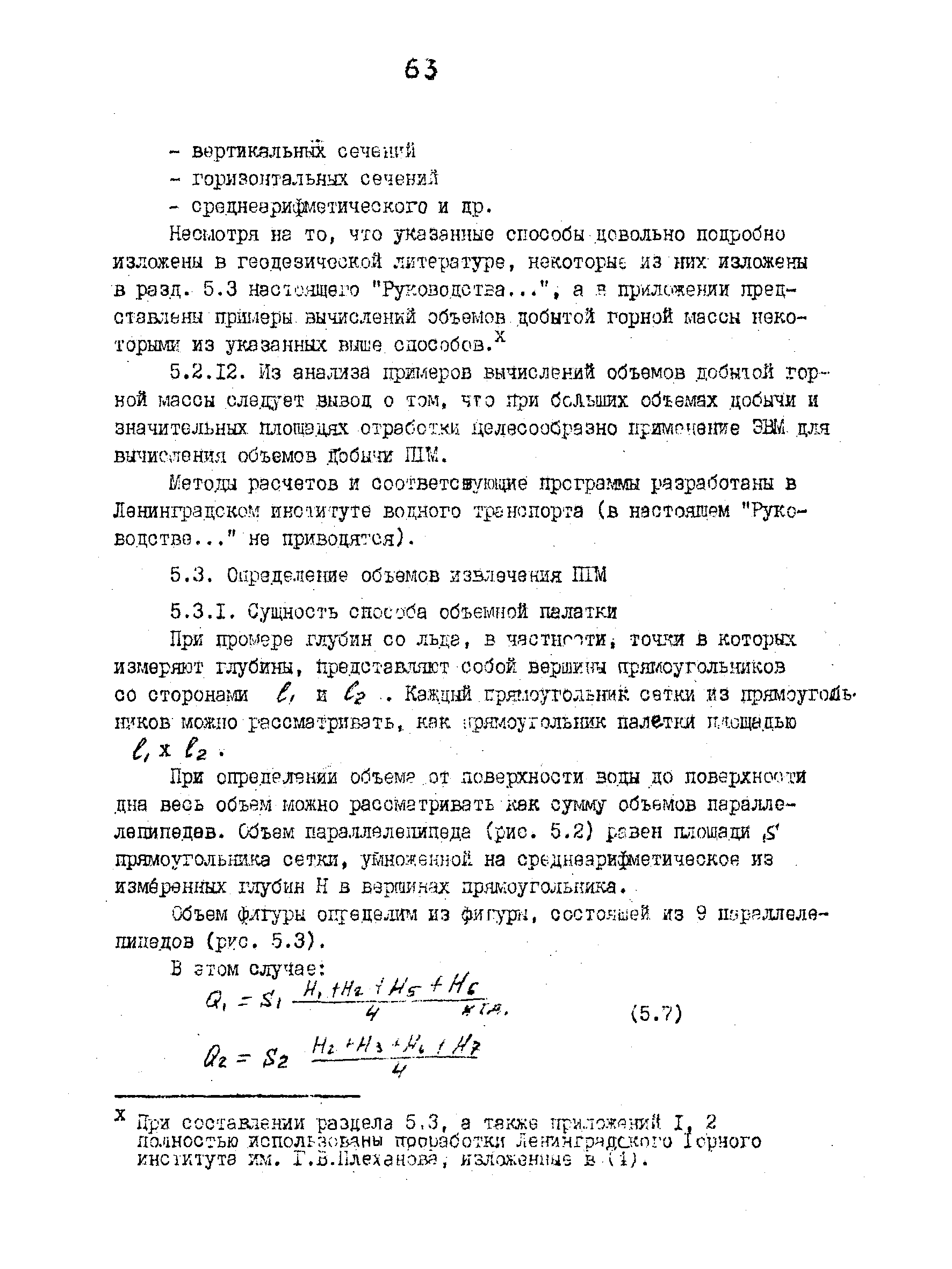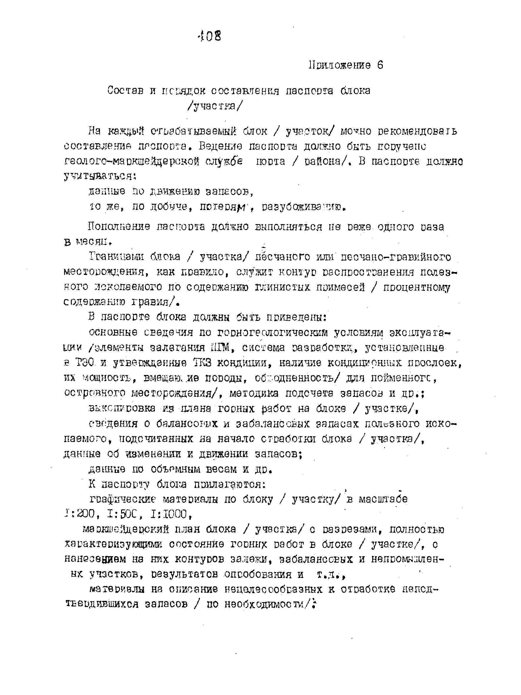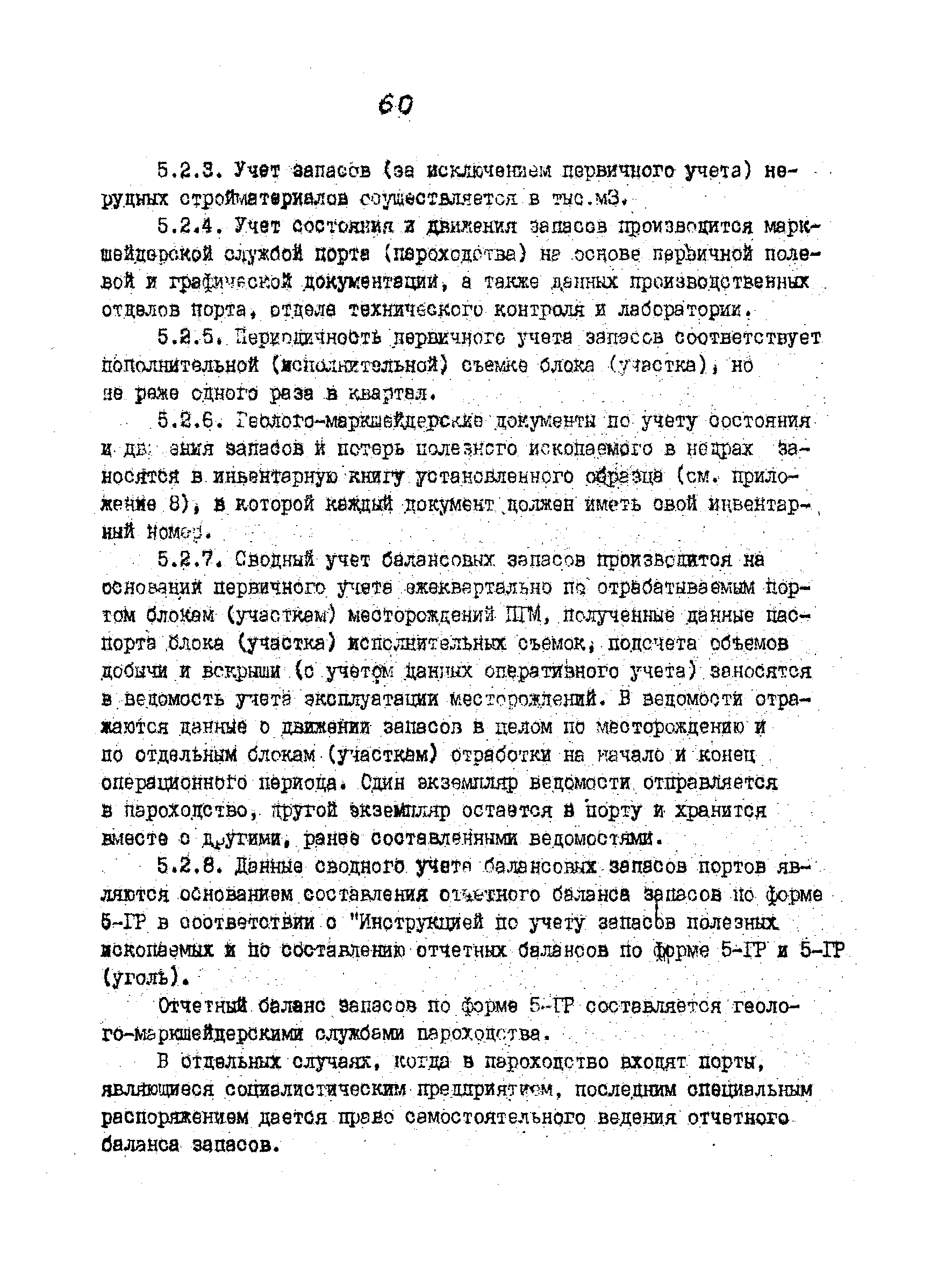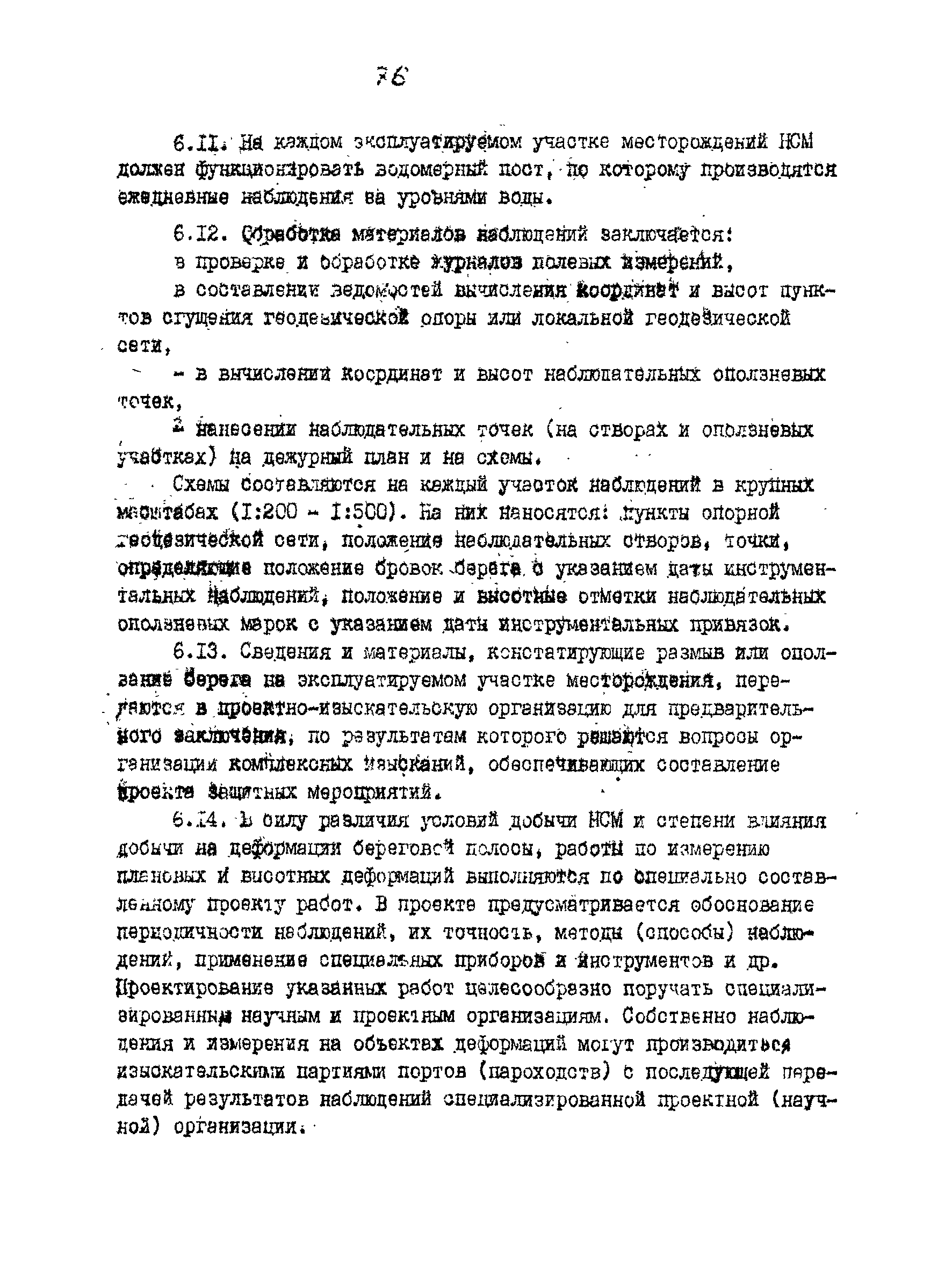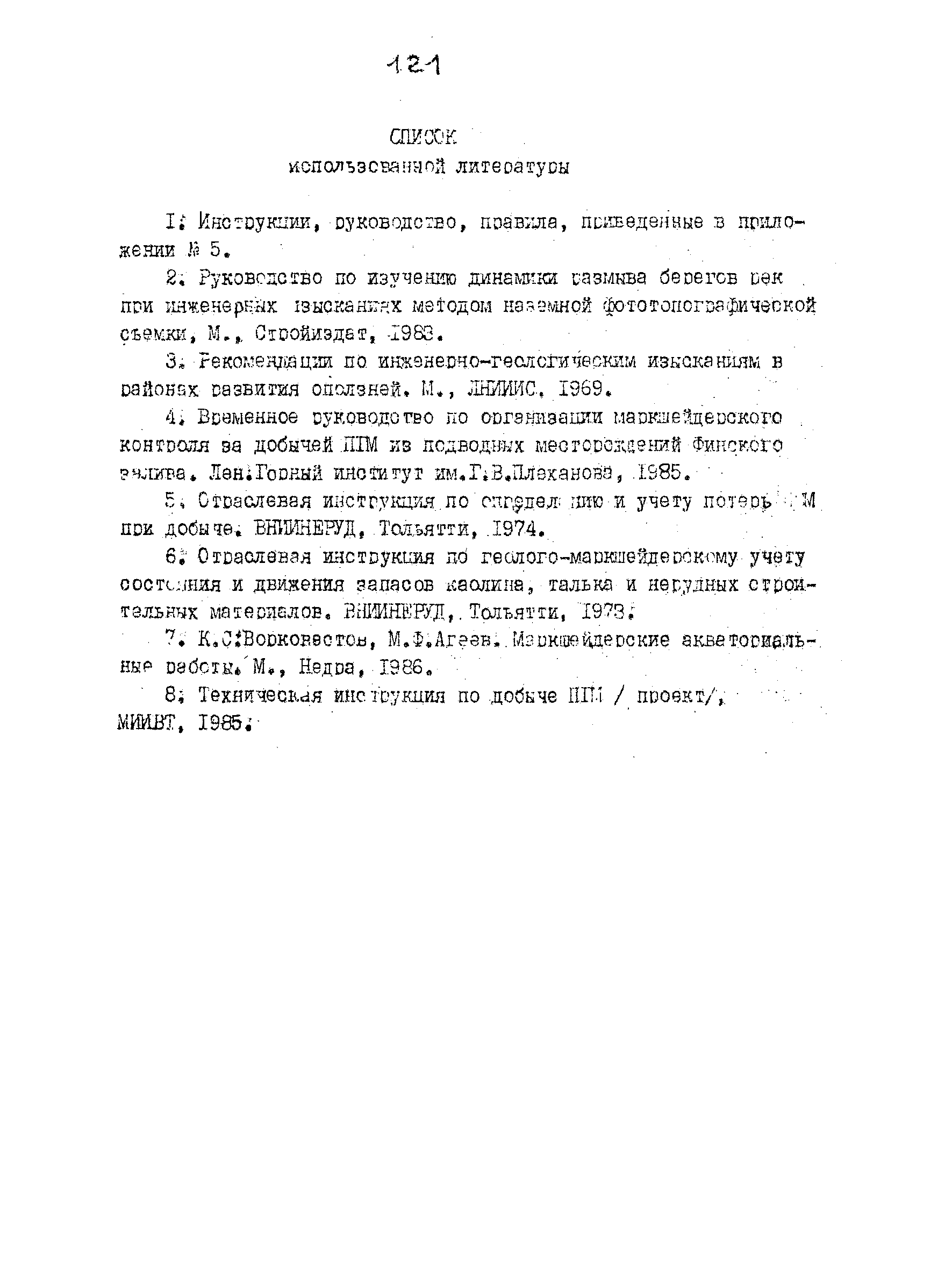 Руководство по маркшейдерскому обеспечению разработки месторождений песчано-гравийных материалов на водоемах| Статус: | действует | | Название рус.: | Руководство по маркшейдерскому обеспечению разработки месторождений песчано-гравийных материалов на водоемах | | Дата добавления в базу: | 01.09.2013 | | Дата актуализации: | 01.01.2021 | | Область применения: | Руководство определяет порядок и методы определения показателей извлечения ПГМ и потерь при добыче и содержит требования к определению объемов извлечения, к маркшейдерскому контролю за объемами добычи ПГМ и пород вскрыши. | | Оглавление: | Введение 1. Общие положения 2. Состав горно-графической маркшейдерской документации. Общие требования к ее составлению, ведению и хранению 3. Маркшейдерские работы, связанные с подготовкой месторождений ПГМ к отработке 3.1. Создание планово-высотной сети. Технические требования 3.2. Предварительная съемка участка месторождения. Технические требования. Промеры глубин. Береговые работы. Зимние работы со льда 3.3. Подготовка территории карьера ПГМ к отработке 4. Маркшейдерский контроль за отработкой месторождений ПГМ 4.1. Общие положения 4.2. Исполнительные съемки, особенность их проведения, периодичность. Технические требования 4.3. Оперативный контроль за полнотой и качеством отработки месторождений ПГМ 4.4. Определение границ площадей с остаточными запасами ПГМ 4.5. Маркшейдерские работы, сопровождающие эксплуатационную разведку на отрабатываемом месторождении 4.6. Организация контроля за изменением рельефа дна карьера под влиянием естественных факторов 5. Организация учета добычи и полноты извлечения полезного ископаемого 5.1. Оперативный учет 5.2. Маркшейдерский учет 5.3. Определение объемов извлечения ПГМ 6. Организация наблюдений за деформацией береговой полосы в районе разработки месторождений ПГМ Приложения: 1. Пример на определение объёма добытой горной массы на участке большой площади 2. Пример на определение объемов добытой горной массы на участке небольшой площади 3. Технологические потери 4. Способ определения смещенного положения сетки квадратов 5. Перечень нормативных изданий, которыми следует руководствоваться при маркшейдерском обеспечении разработок месторождений ПГМ 6. Состав и порядок составления паспорта блока (участка) 7. Паспорт блока (участка) 9. Инвентарная книга геолого-маркшейдерских документов порта 9. Ведомость учета эксплуатации песчано-гравийных месторождений в бассейне речного пароходства 10. Типы знаков долговременно закрепления съемочных сетей 11. Примерные схемы проложения съемочных сетей 12 .Журнал маркшейдерских указаний Список использованной литературы | | Разработан: | Ленгипроречтранс