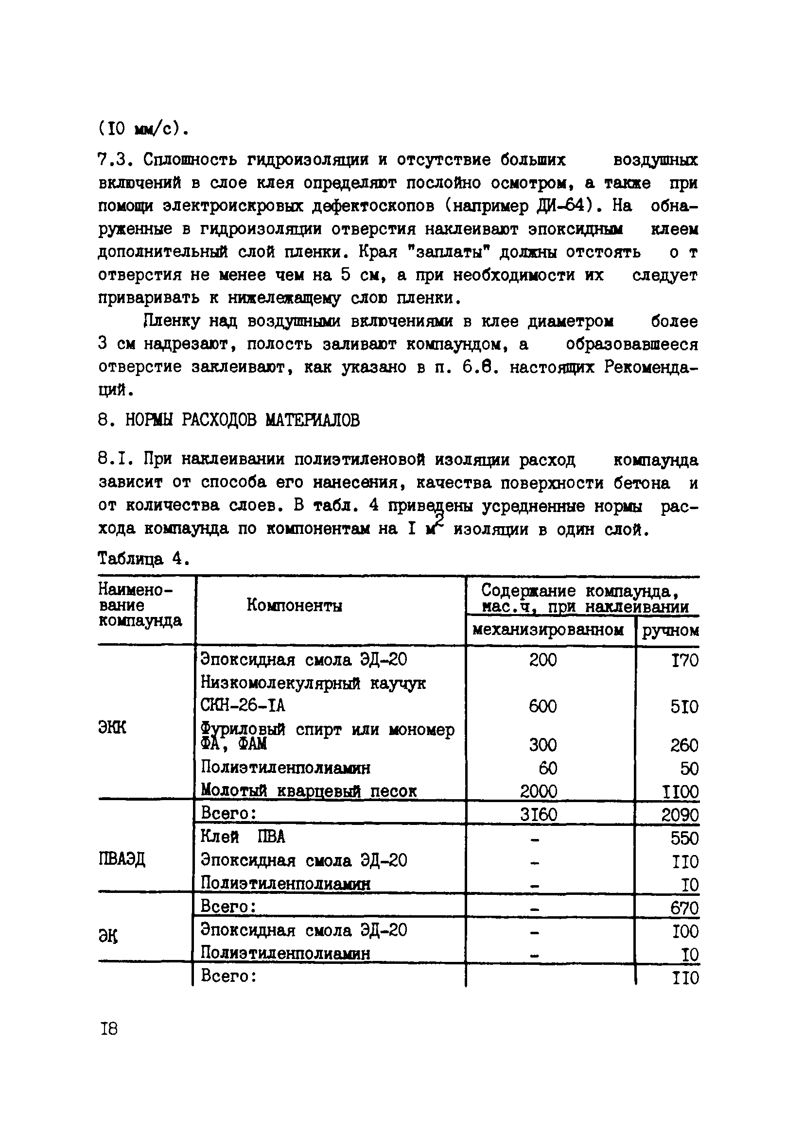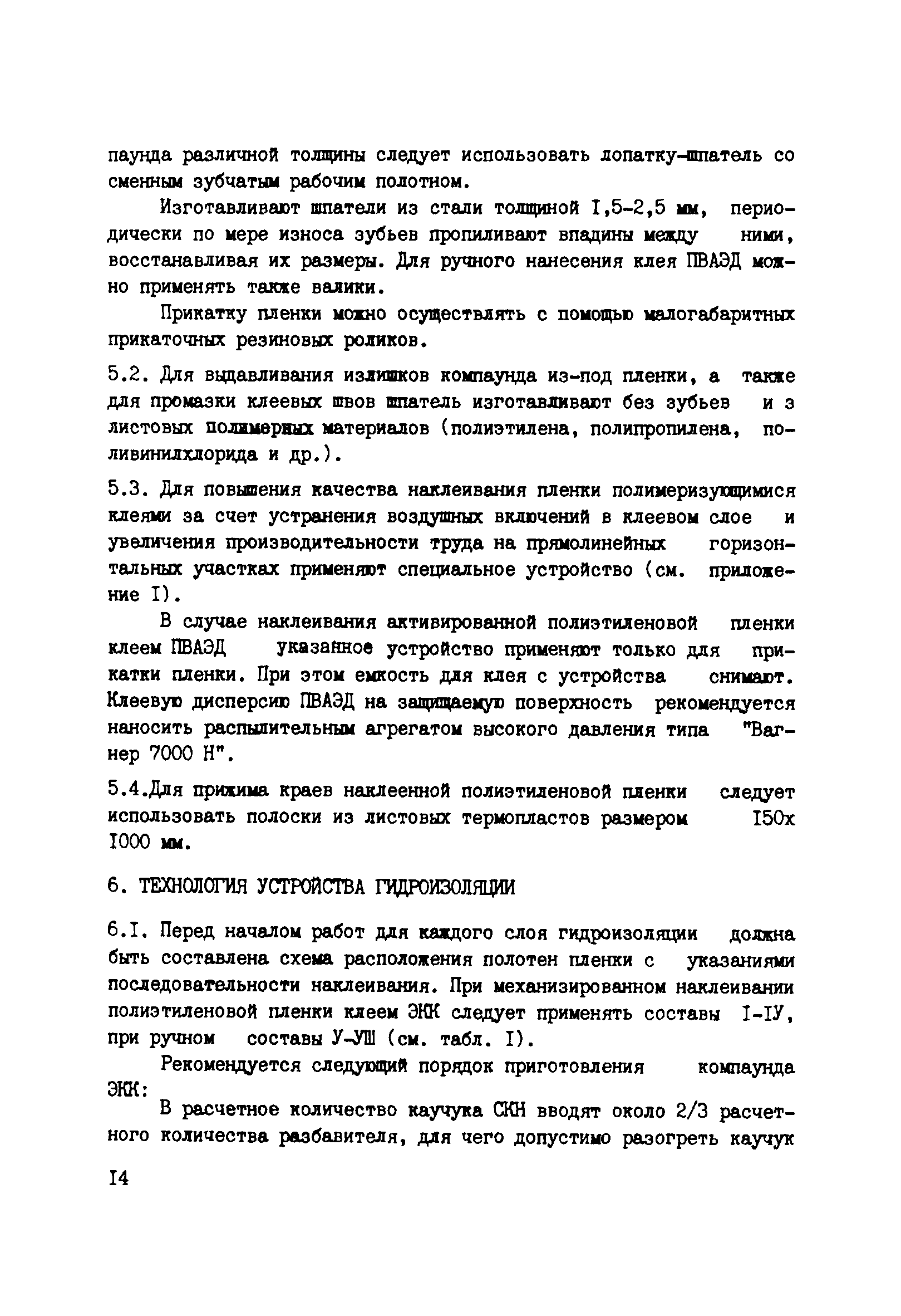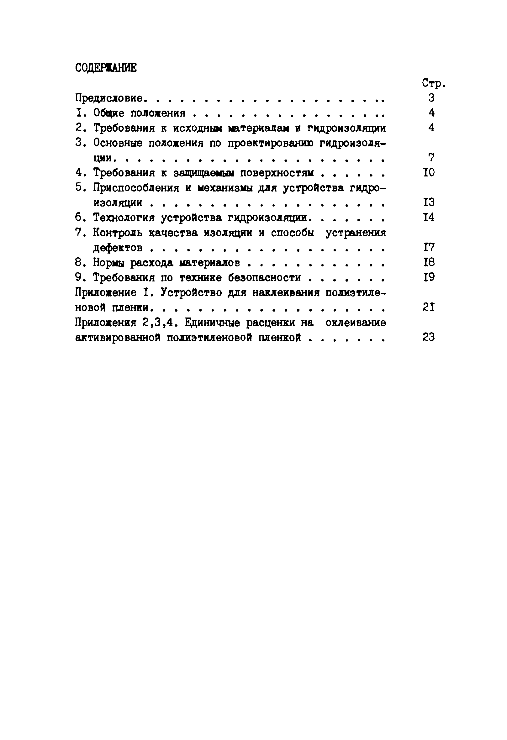 | Оглавление: | Предисловие 1. Общие положения 2. Требования к исходным материалам и гидроизоляции 3. Основные положения по проектированию гидроизоляции 4. Требования к защищаемым поверхностям 5. Приспособления и механизмы для устройства гидроизоляции 6. Технология устройства гидроизоляции 7. Контроль качества изоляции и способы устранения дефектов 8. Нормы расхода материалов 9. Требования по технике безопасности Приложение 1. Устройство для наклеивания полиэтиленовой пленки Приложения 2, 3, 4. Единичные расценки на оклеивание активированной полиэтиленовой пленкой |