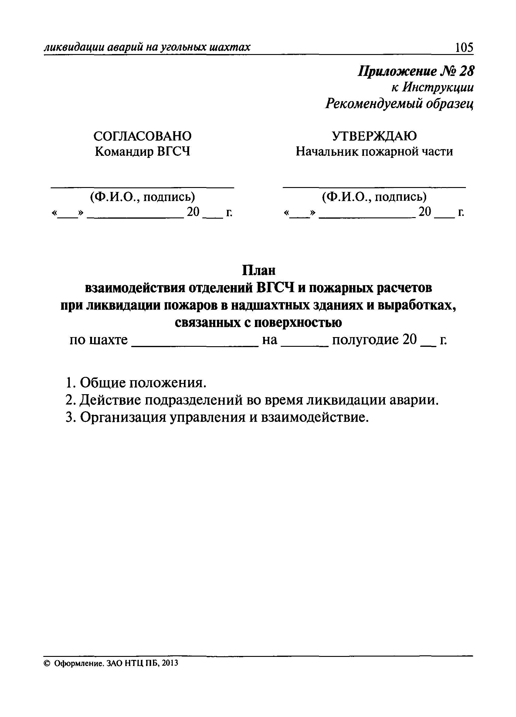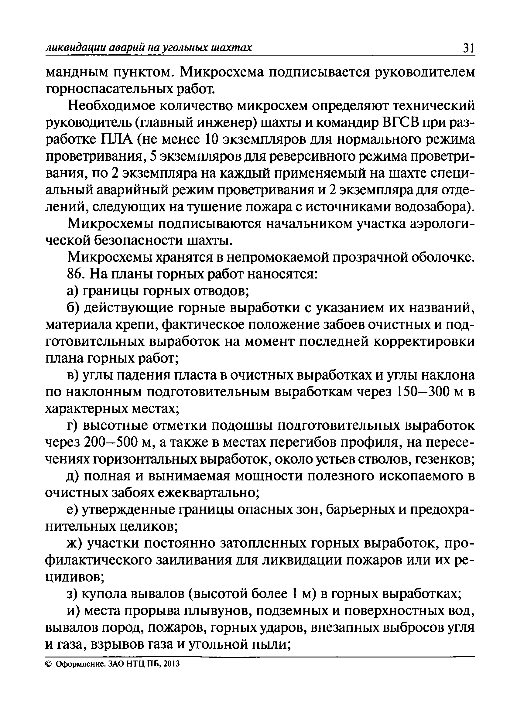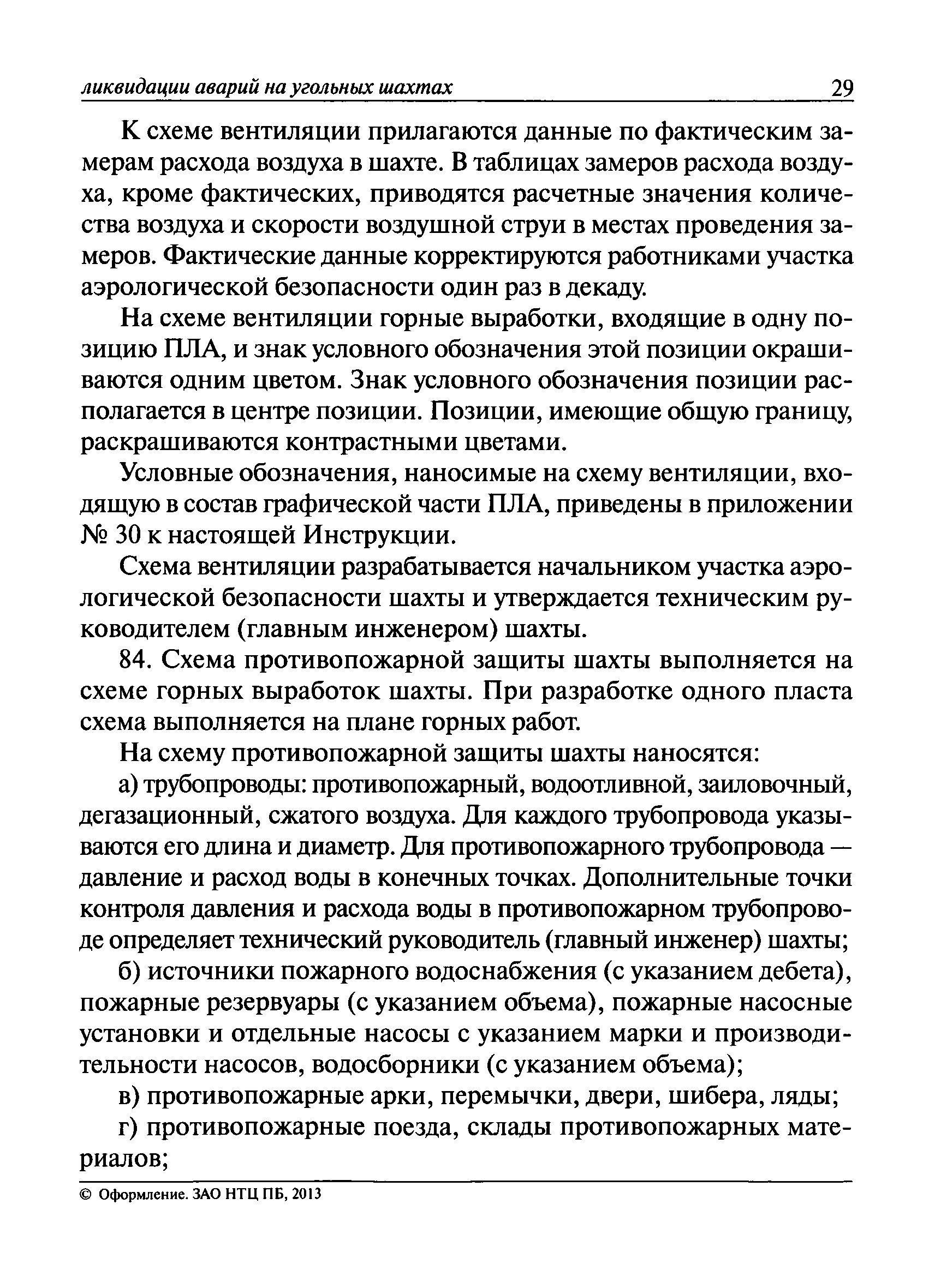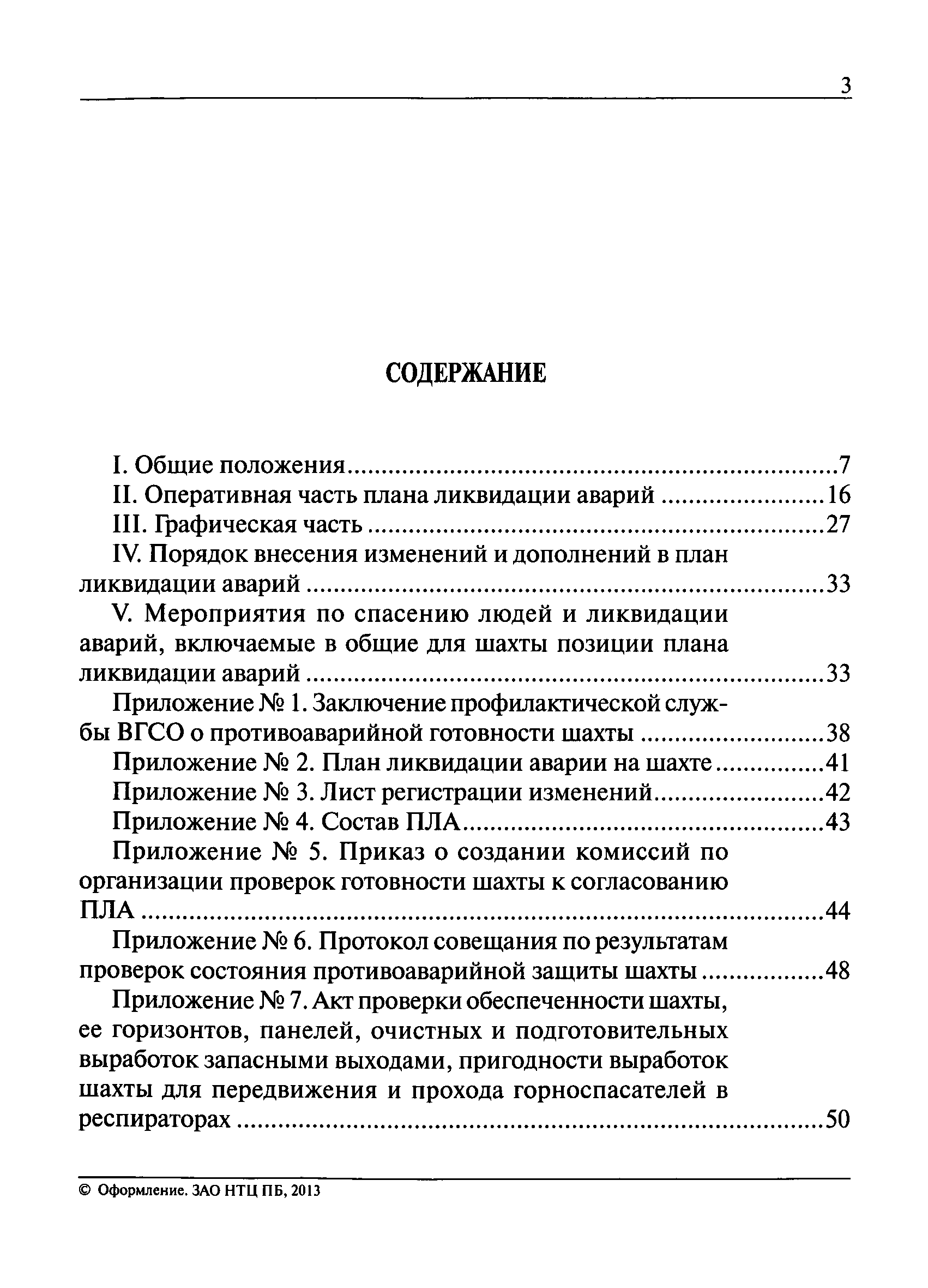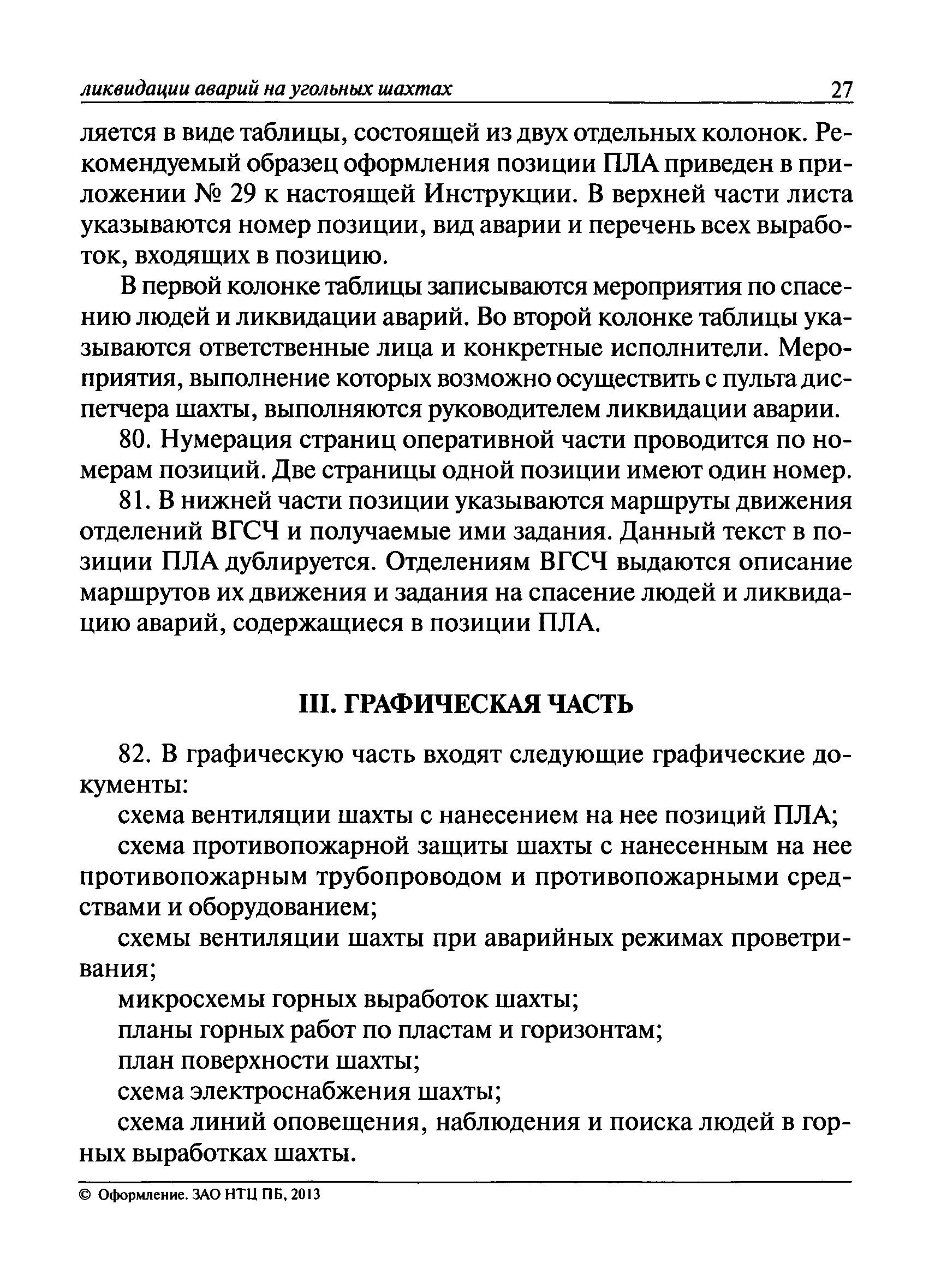 | Оглавление: | I. Общие положения II. Оперативная часть плана ликвидации аварий III. Графическая часть IV. Порядок внесения изменений и дополнений в план ликвидации аварий V. Мероприятия по спасению людей и ликвидации аварий, включаемые в общие для шахты позиции плана ликвидации аварий Приложение № 1. Заключение профилактической службы ВГСО о противоаварийной готовности шахты Приложение № 2. План ликвидации аварии на шахте Приложение № 3. Лист регистрации изменений Приложение № 4. Состав ПЛА Приложение № 5. Приказ о создании комиссий по организации проверок готовности шахты к согласованию ПЛА Приложение № 6. Протокол совещания по результатам проверок состояния противоаварийной защиты шахты Приложение № 7. Акт проверки обеспеченности шахты, ее горизонтов, панелей, очистных и подготовительных выработок запасными выходами, пригодности выработок шахты для передвижения и прохода горноспасателей в респираторах Приложение № 8. Акт проверки соответствия времени выхода людей на свежую струю воздуха сроку защитного действия самоспасателей, подготовленности работников к их использованию, возможности выполнения задач ПЛА отделениями ВГСЧ за время защитного действия штатных респираторов Приложение № 9. Акт определения времени загазирования тупиковых забоев в случае остановки вентиляторов местного проветривания Приложение № 10. Акт оценки газовой обстановки на выемочных участках с комбинированной схемой проветривания при возможных аварийных остановках ГОУ и их совместной работе с ВГП, работающими в аварийных режимах Приложение № 11. Акт проверки устойчивости вентиляционных режимов в горных выработках шахты и эффективности принятых мер по предотвращению самопроизвольного опрокидывания вентиляционной струи при пожаре Приложение № 12. Акт проверки состояния вентиляционных устройств и вентиляторных установок, а также возможности выполнения намечаемых вентиляционных режимов Приложение № 13. Акт проверки состояния средств связи, систем оповещения об аварии и средств поиска людей, застигнутых аварией Приложение № 14. Акт проверки ВГС Приложение № 15. Акт проверки обеспеченности шахты средствами пожаротушения и их состояния, оценки технической возможности реализации режимов водоснабжения шахты, предусматриваемых в позициях ПЛА, для организации подачи воды на цели пожаротушения Приложение № 16. Акт проверки аварийных вентиляционных режимов, предусмотренных ПЛА Приложение № 17. Протокол рассмотрения плана ликвидации аварии шахты Приложение № 18. Оперативный журнал Приложение № 19. Список членов ВГС шахты Приложение № 20. Положение о командном пункте по ликвидации аварии Приложение № 21. Приказ о размещении в административно-бытовом комбинате специальных служб при авариях Приложение № 22. Действия должностных лиц и специалистов, участвующих в ликвидации аварий Приложение № 23. Действия работников, застигнутых аварией в шахте Приложение № 24. Критерий разработки позиций ПЛА в зависимости от вида аварии Приложение № 25. Список № 1 должностных лиц и учреждений, извещаемых об аварии Приложение № 26. Мероприятия по аварийной подаче воды на тушение пожара Приложение № 27. Очередность направления отделений ВГСЧ и выдаваемые им задания для спасения людей и ликвидации аварии Приложение № 28. План взаимодействия отделений ВГСЧ и пожа